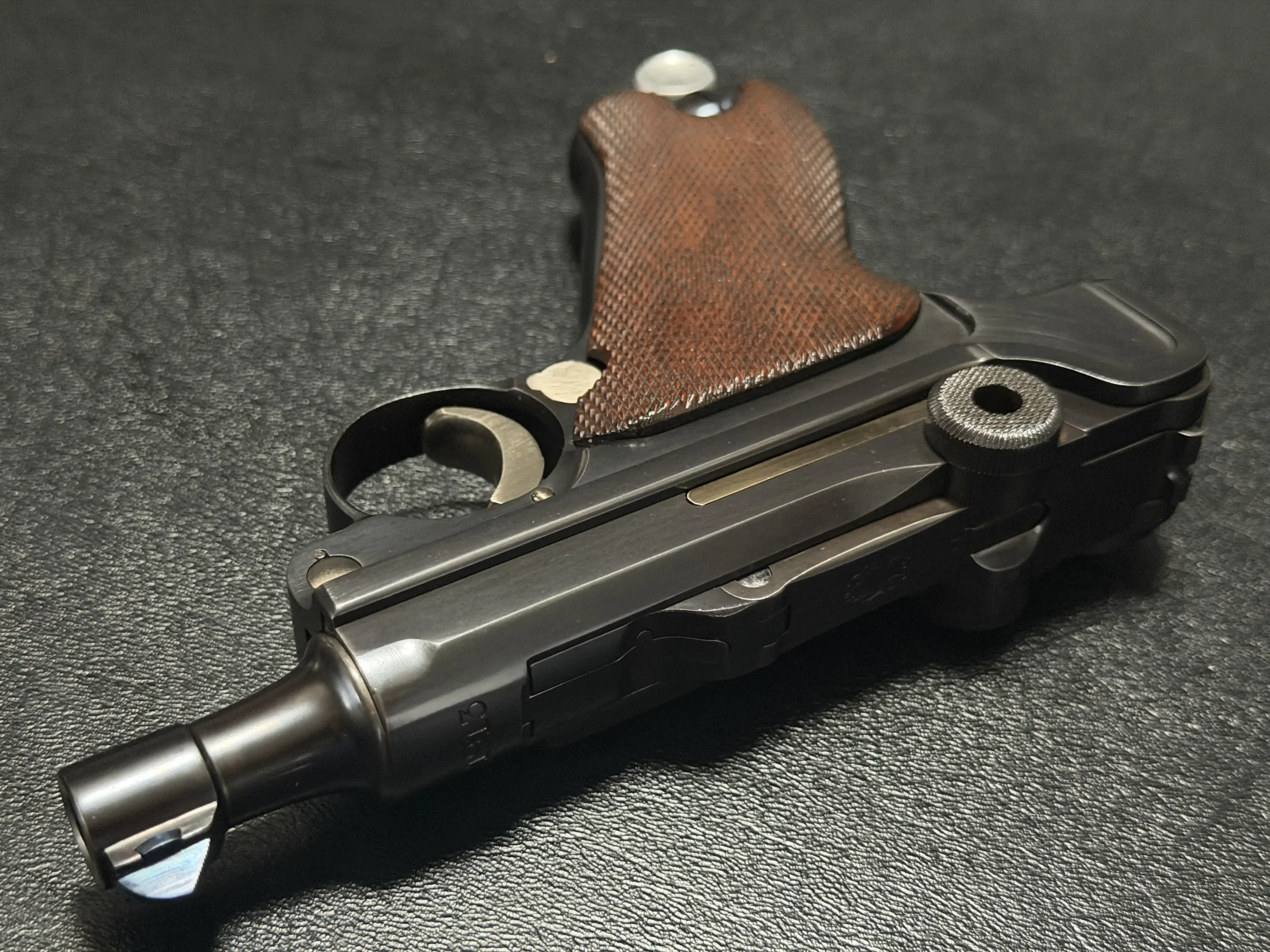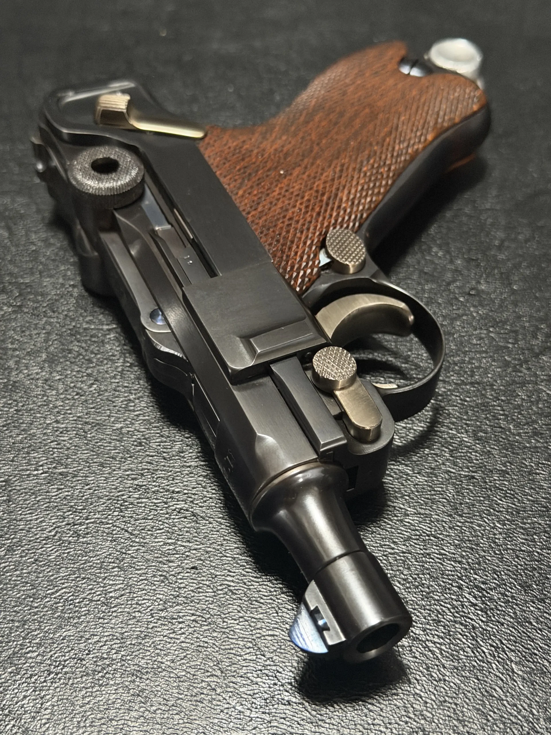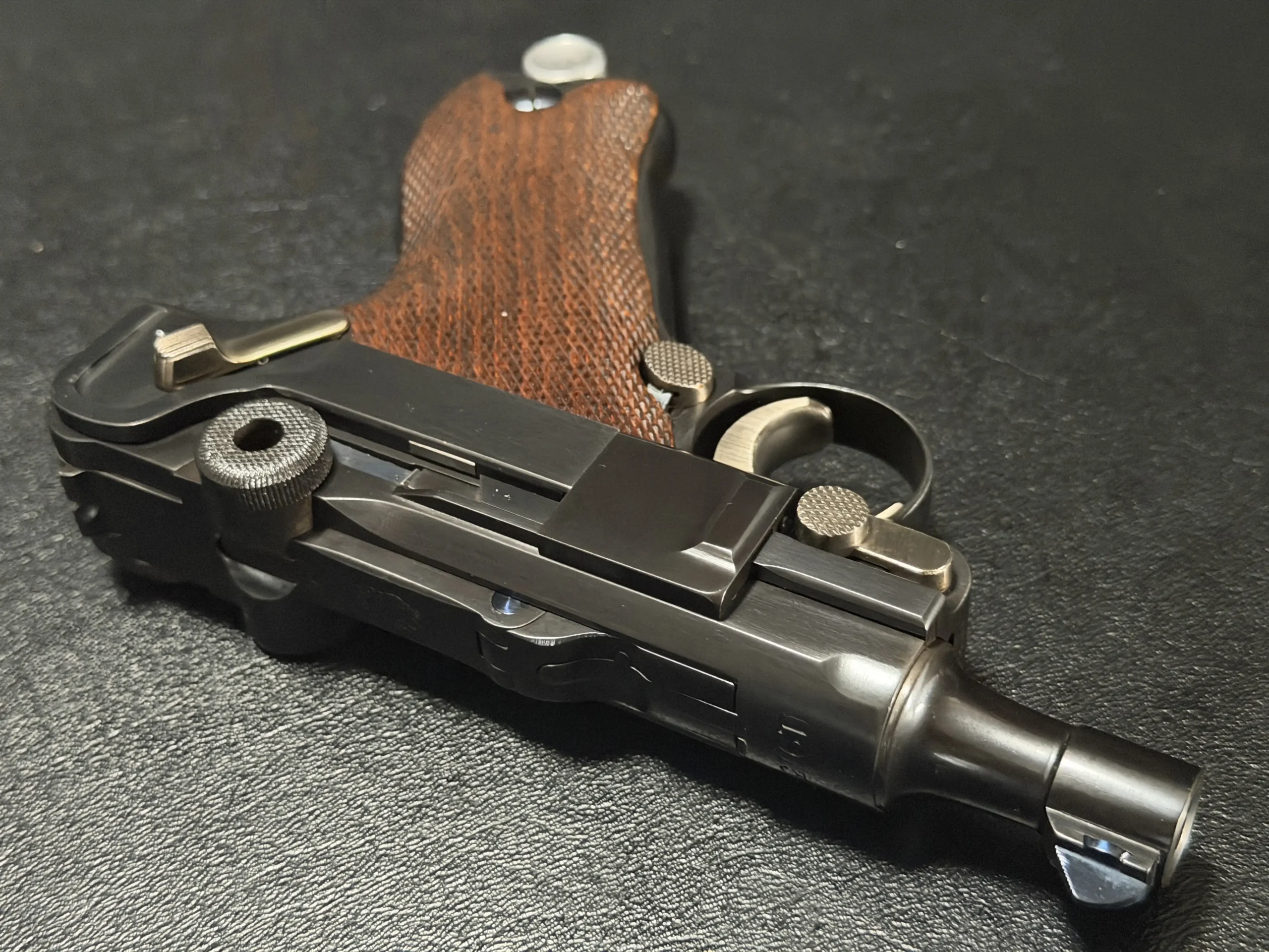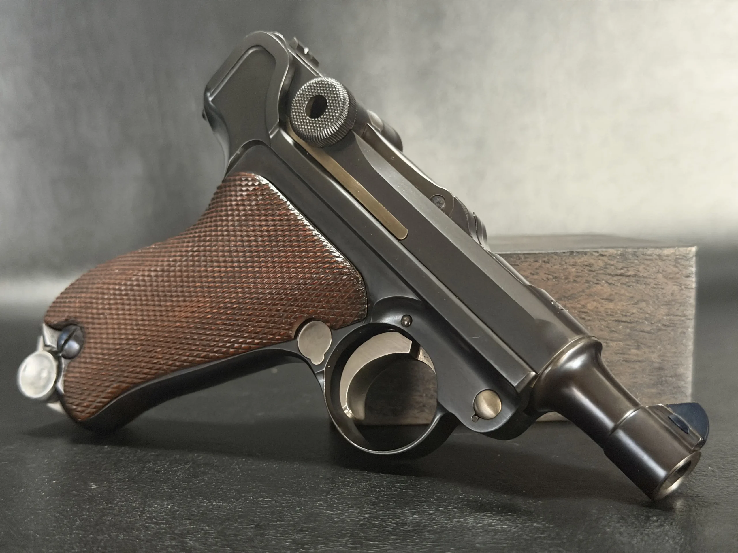 The pistol features a deep satin rust-blue finish with straw-colored accents on the controls, creating a refined contrast true to the character of early Lugers. Finely checkered walnut grip panels are carefully fitted to the frame, adding warmth and visual balance to the blued steel construction.