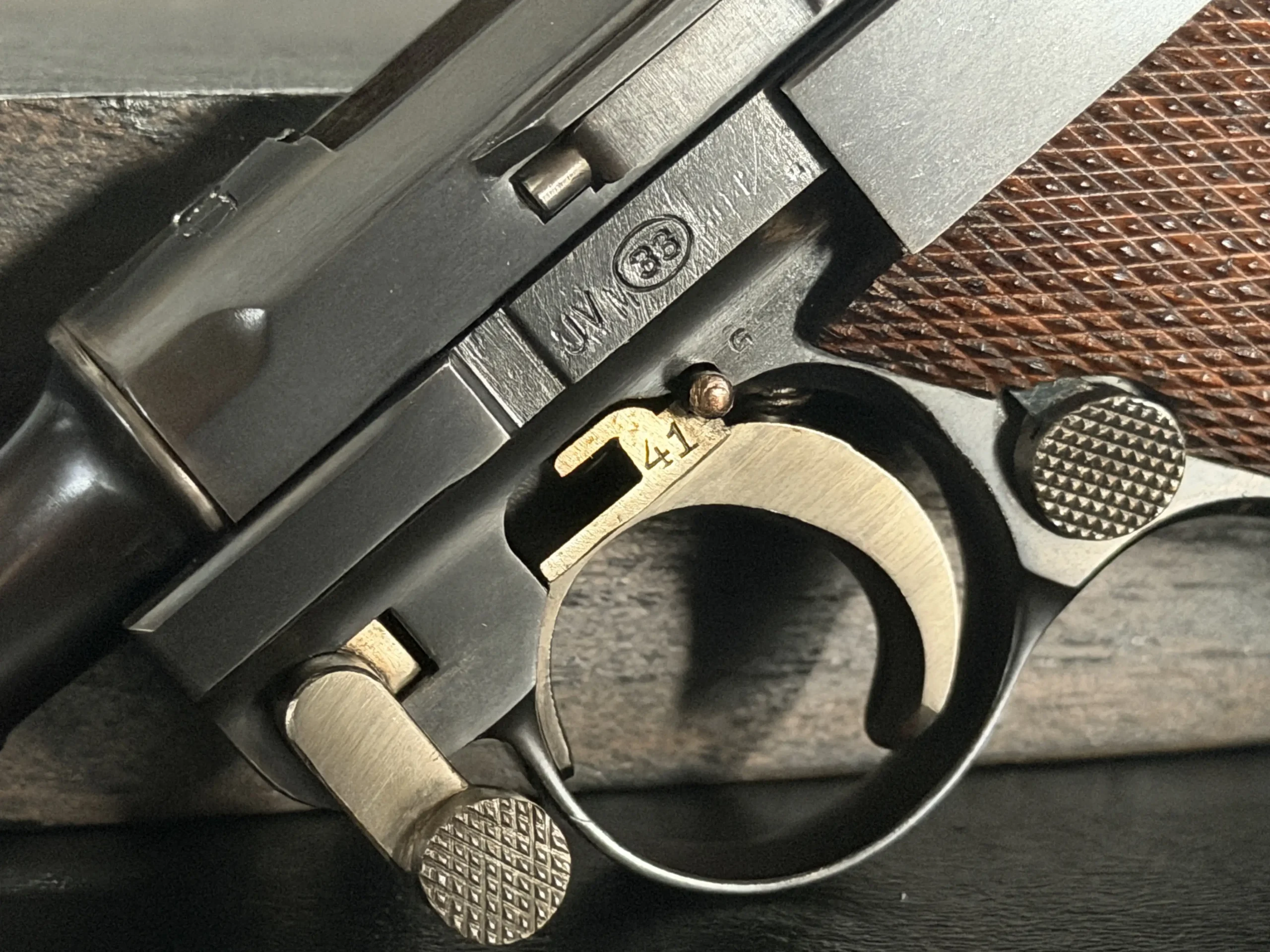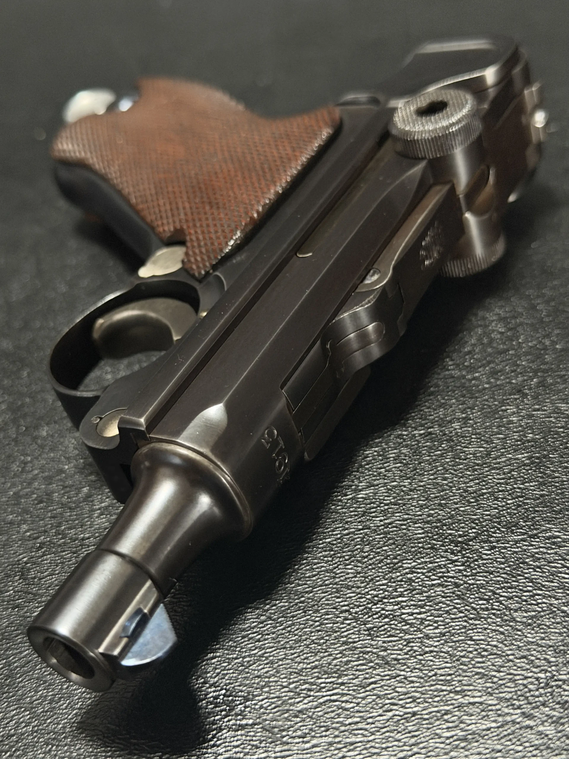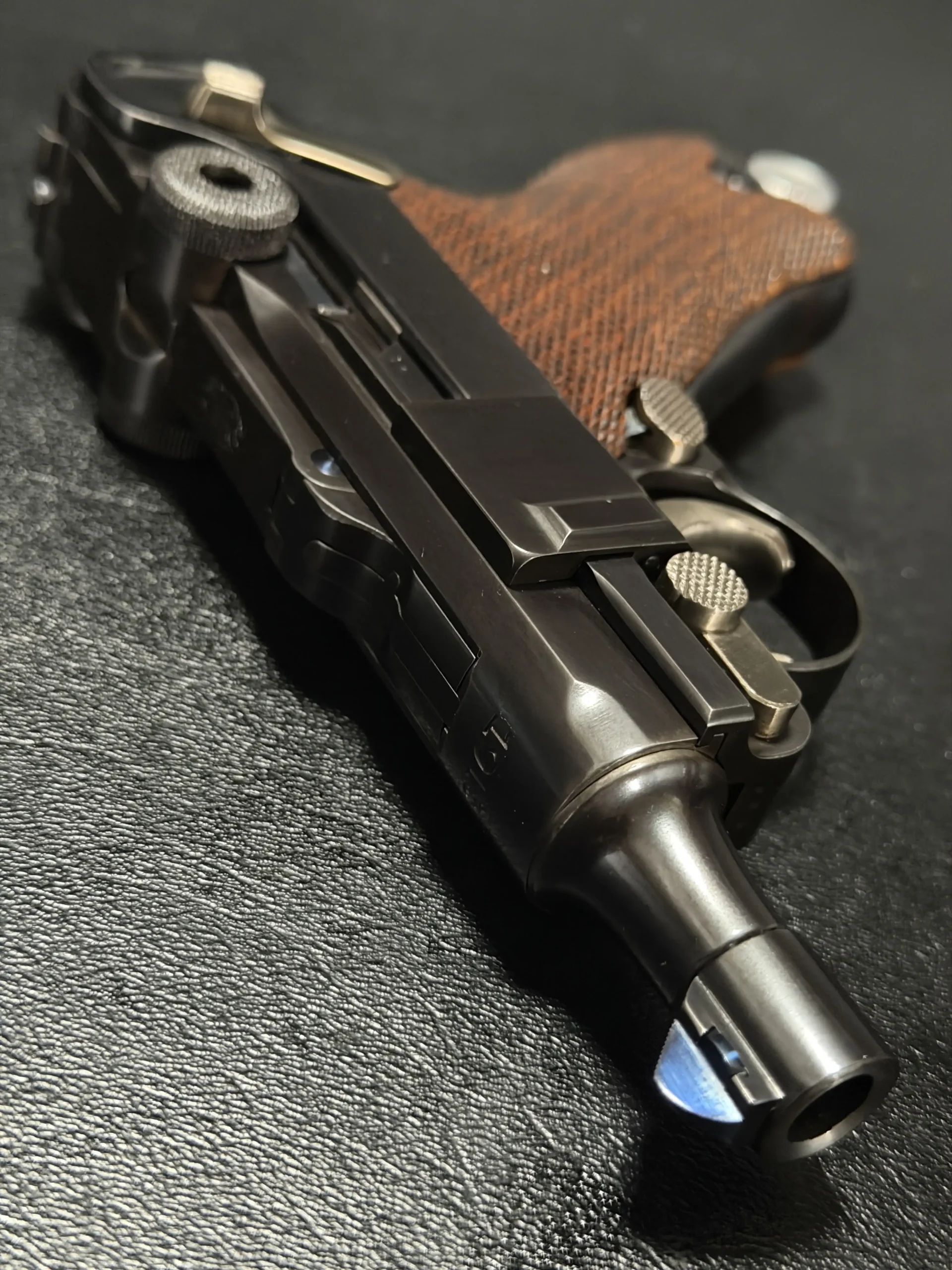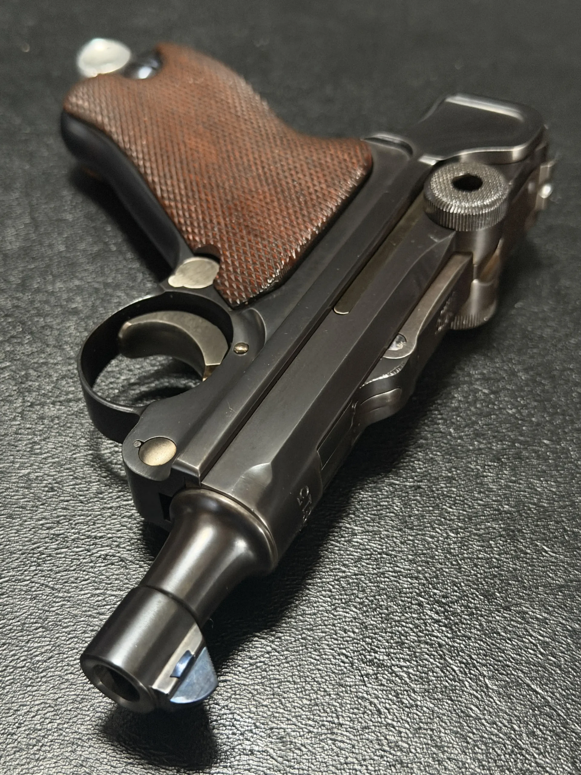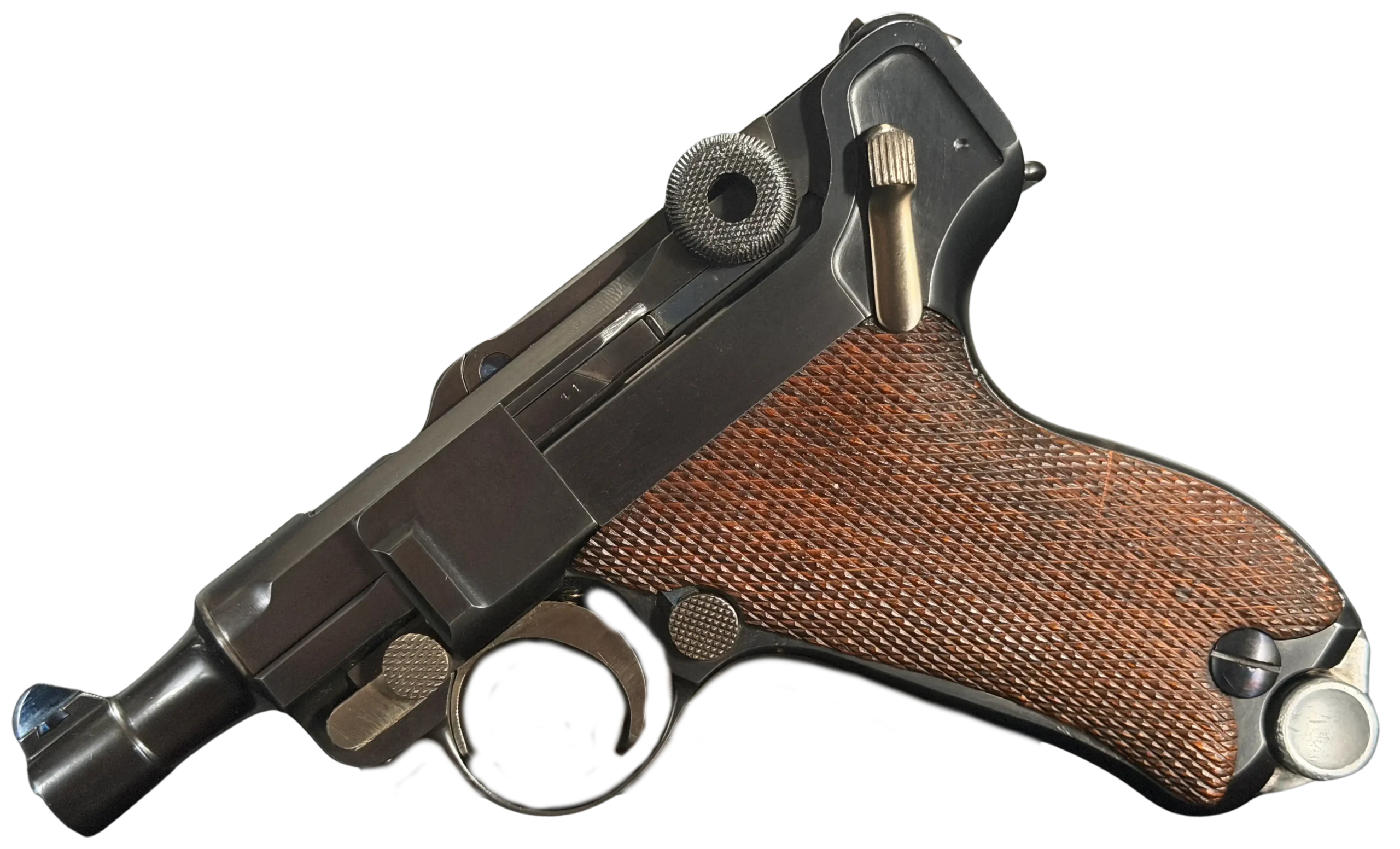 The pistol features a deep satin rust-blue finish with straw-colored accents on the controls, creating a refined contrast true to the character of early Lugers. Finely checkered walnut grip panels are carefully fitted to the frame, adding warmth and visual balance to the blued steel construction.