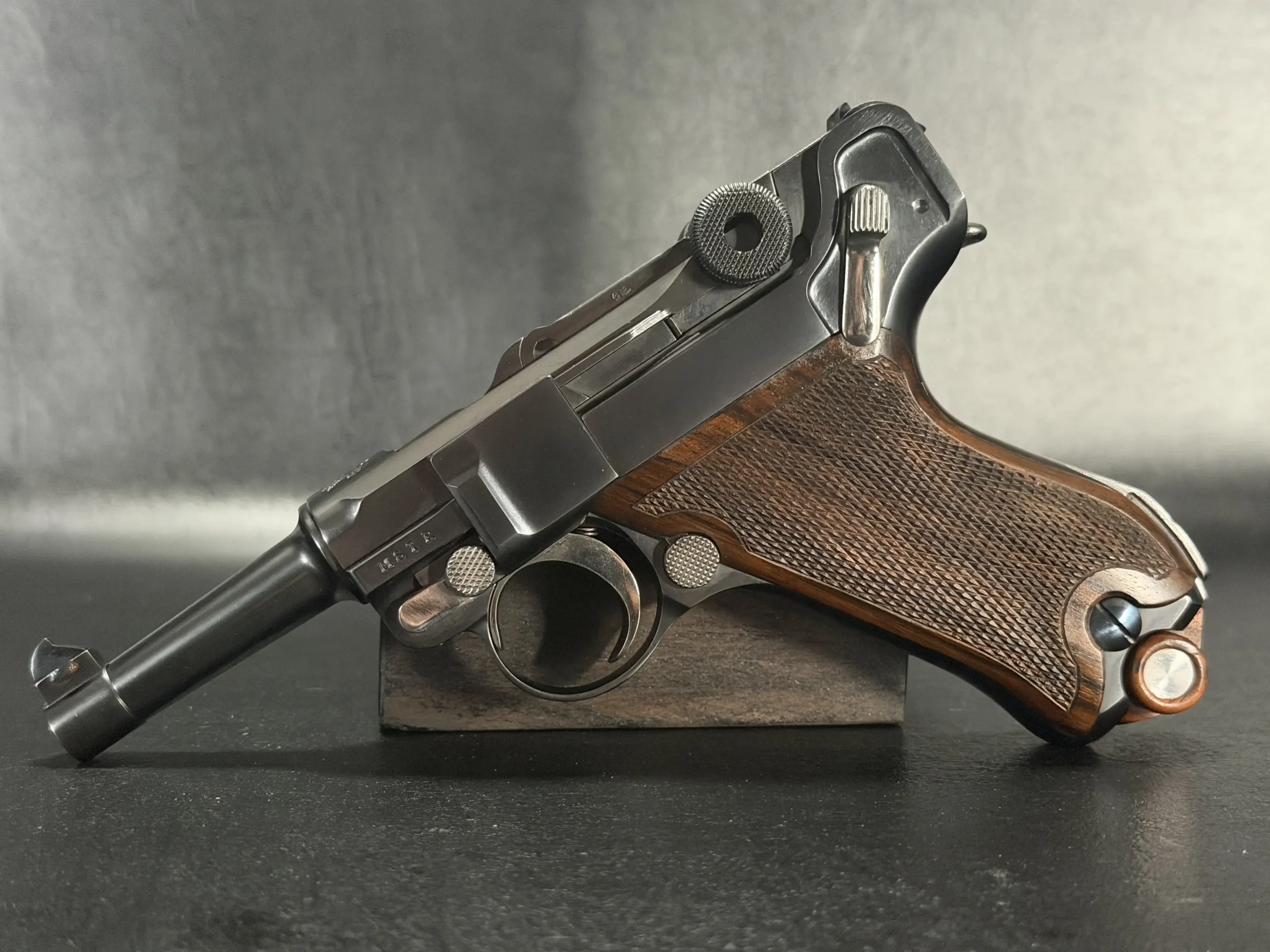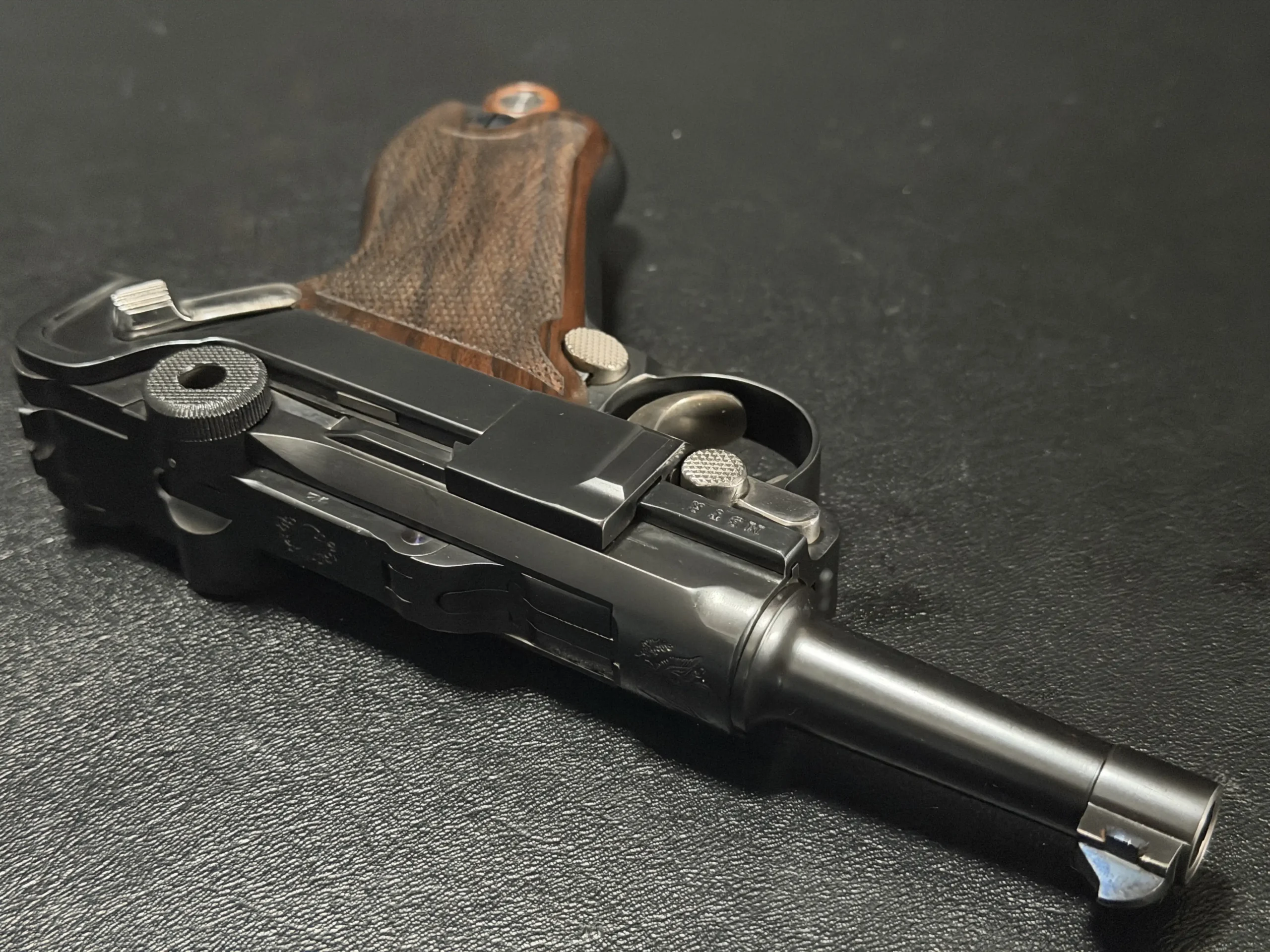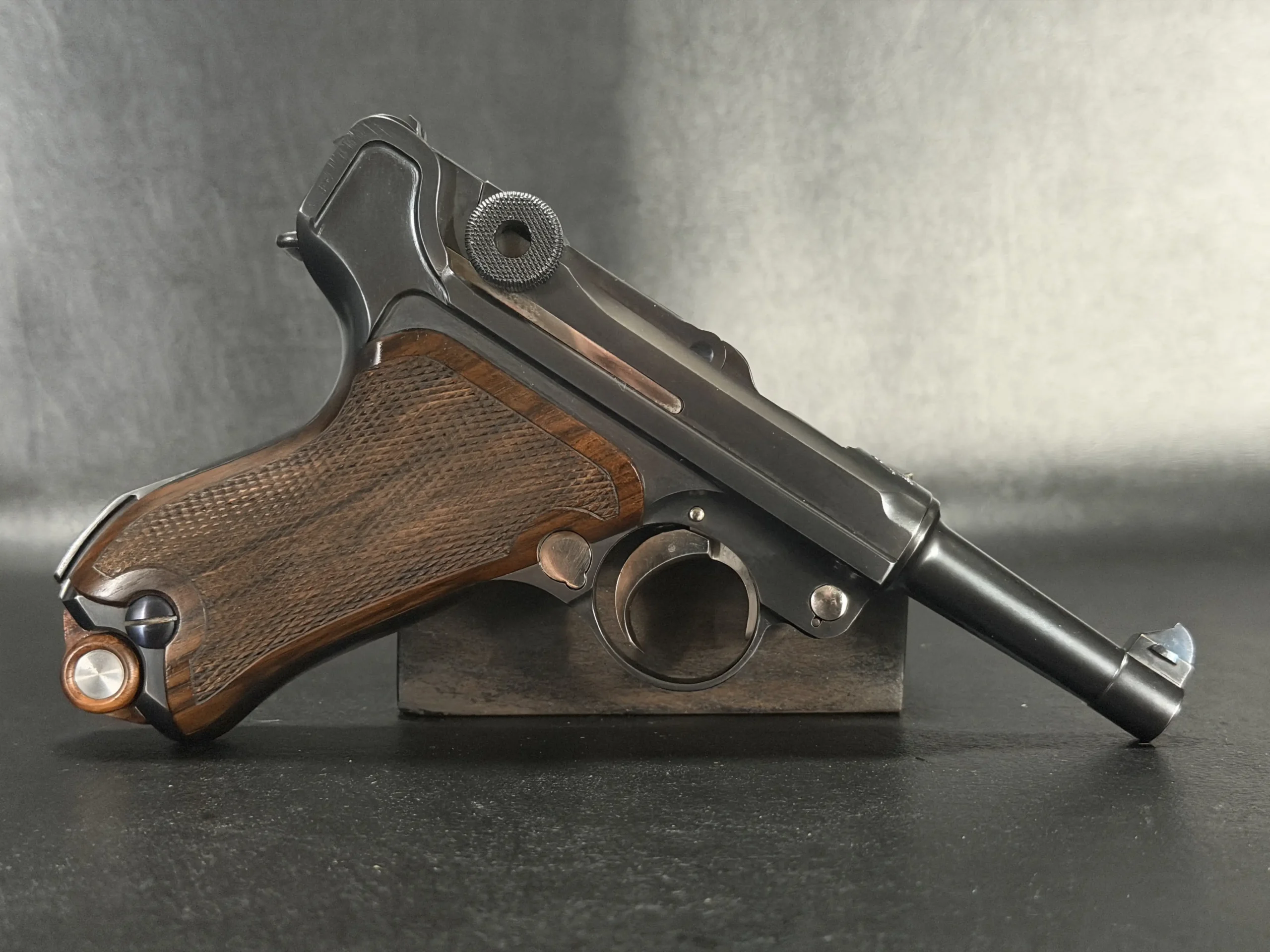 Chambered in 9mm, this example reflects the thoughtful adaptation of the Luger platform to a compact custom configuration. From the chamber marking to the toggle assembly and grip treatment, the overall presentation is cohesive, distinctive, and true to the model’s appeal.