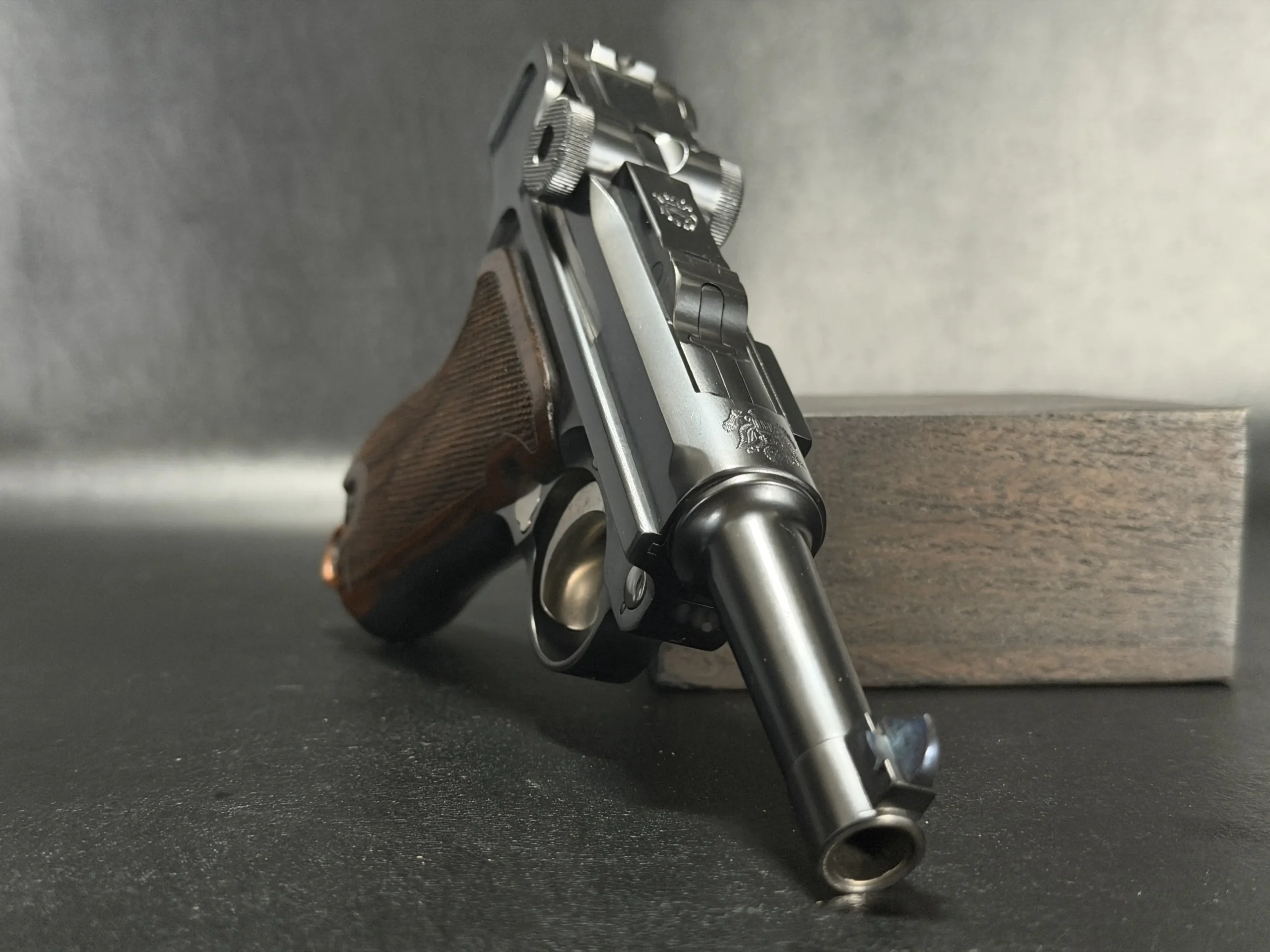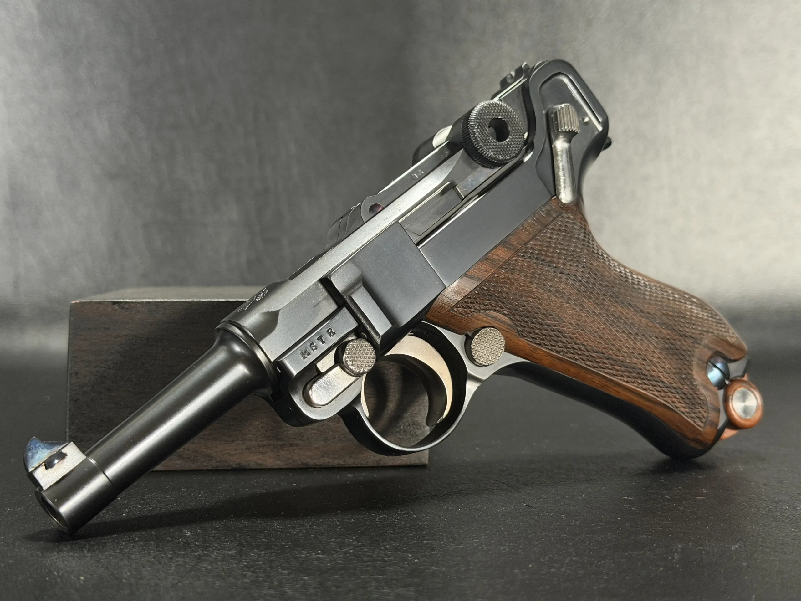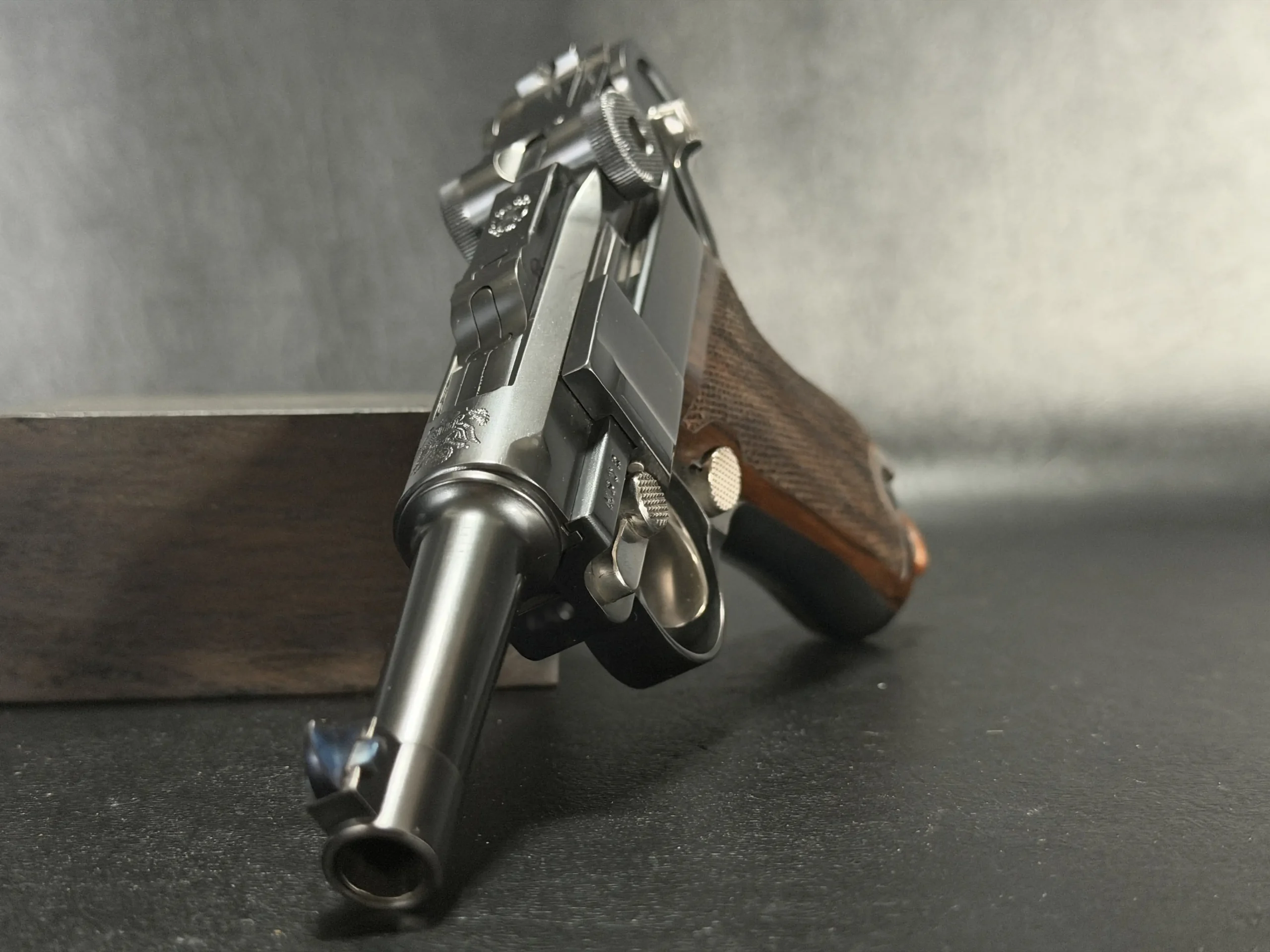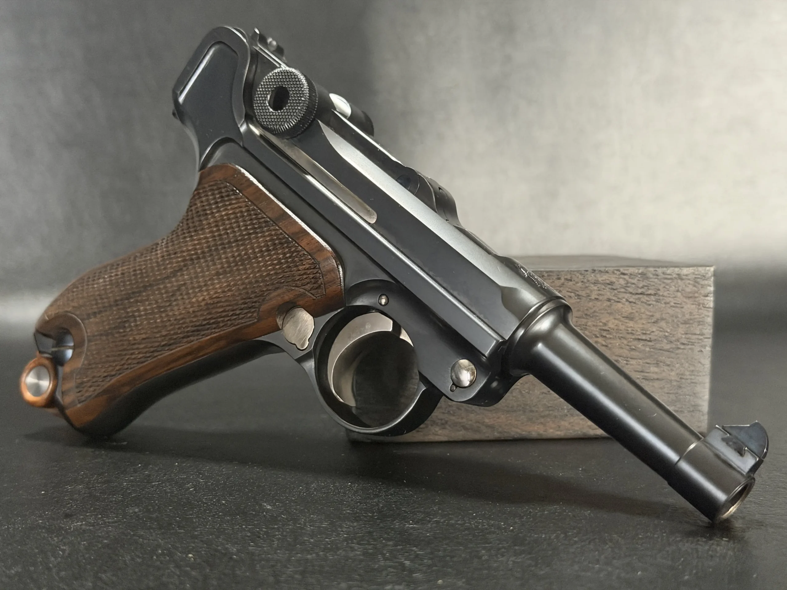 Chambered in 9mm, this example reflects the thoughtful adaptation of the Luger platform to a compact custom configuration. From the chamber marking to the toggle assembly and grip treatment, the overall presentation is cohesive, distinctive, and true to the model’s appeal.