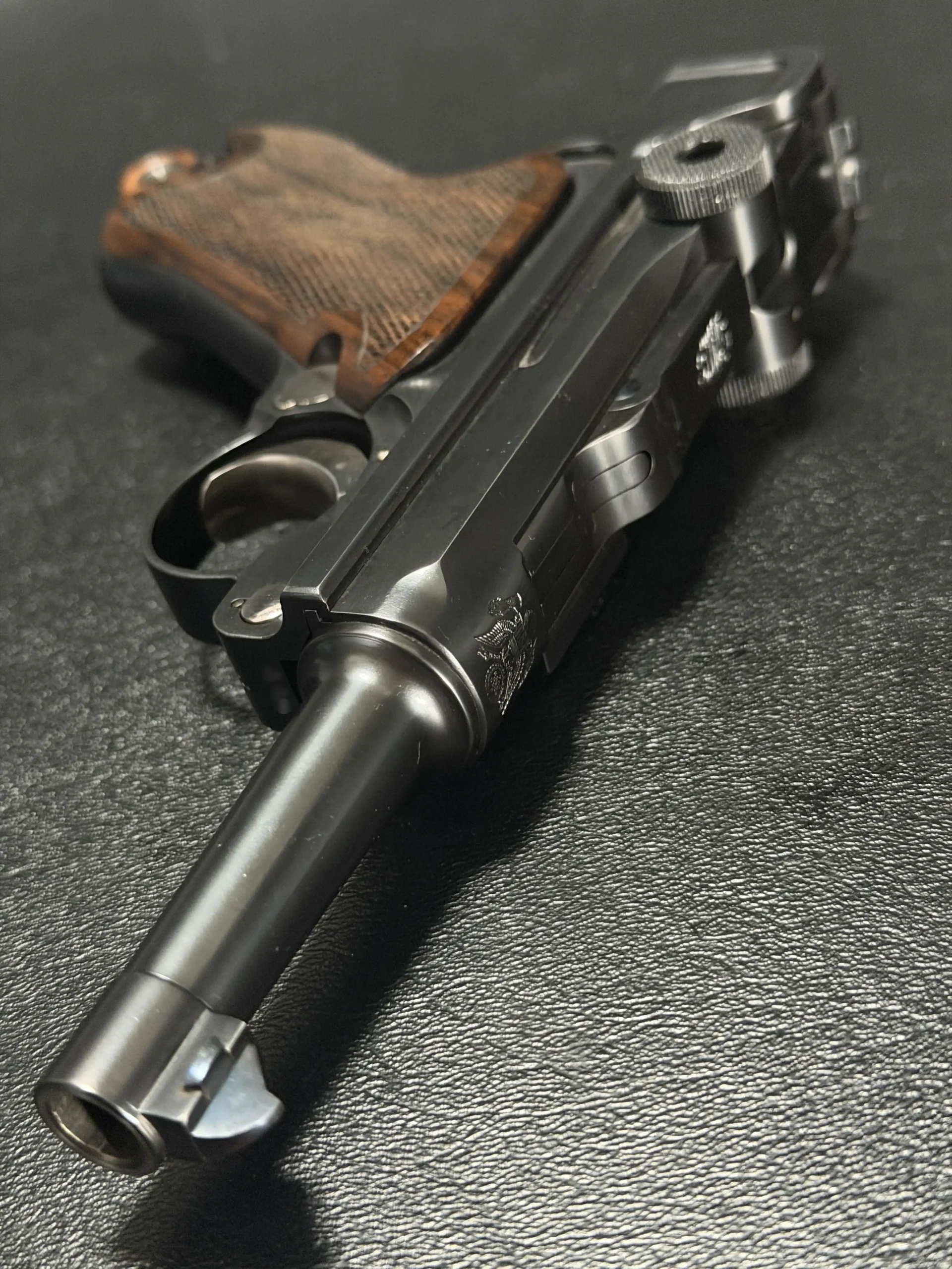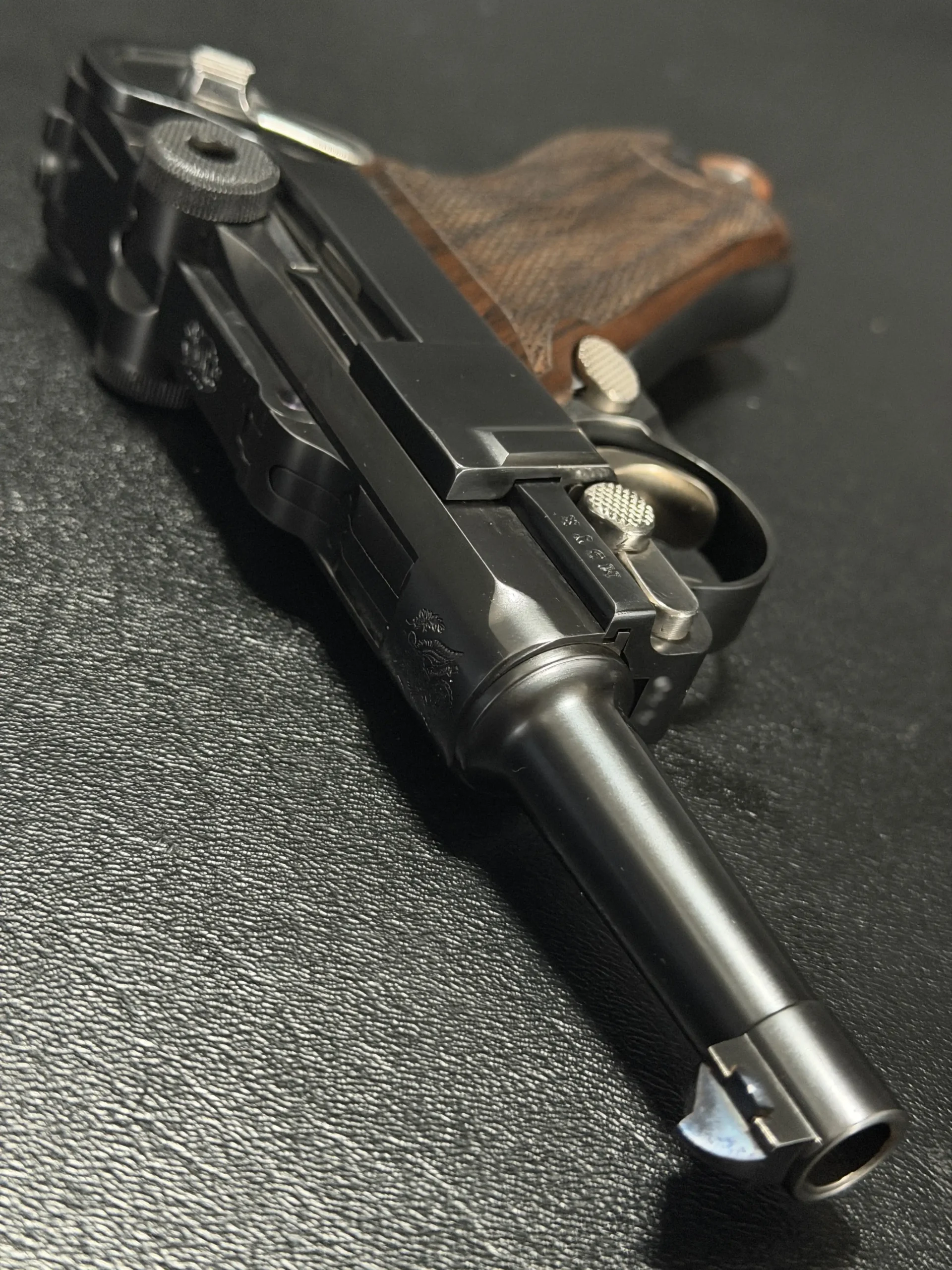 This “Baby” configuration features a compact profile, a re-contoured barrel, and carefully refined proportions that give the pistol a balanced, purposeful look. The shortened format highlights the sculptural lines of the frame while preserving the unmistakable silhouette of the classic toggle-lock design.
