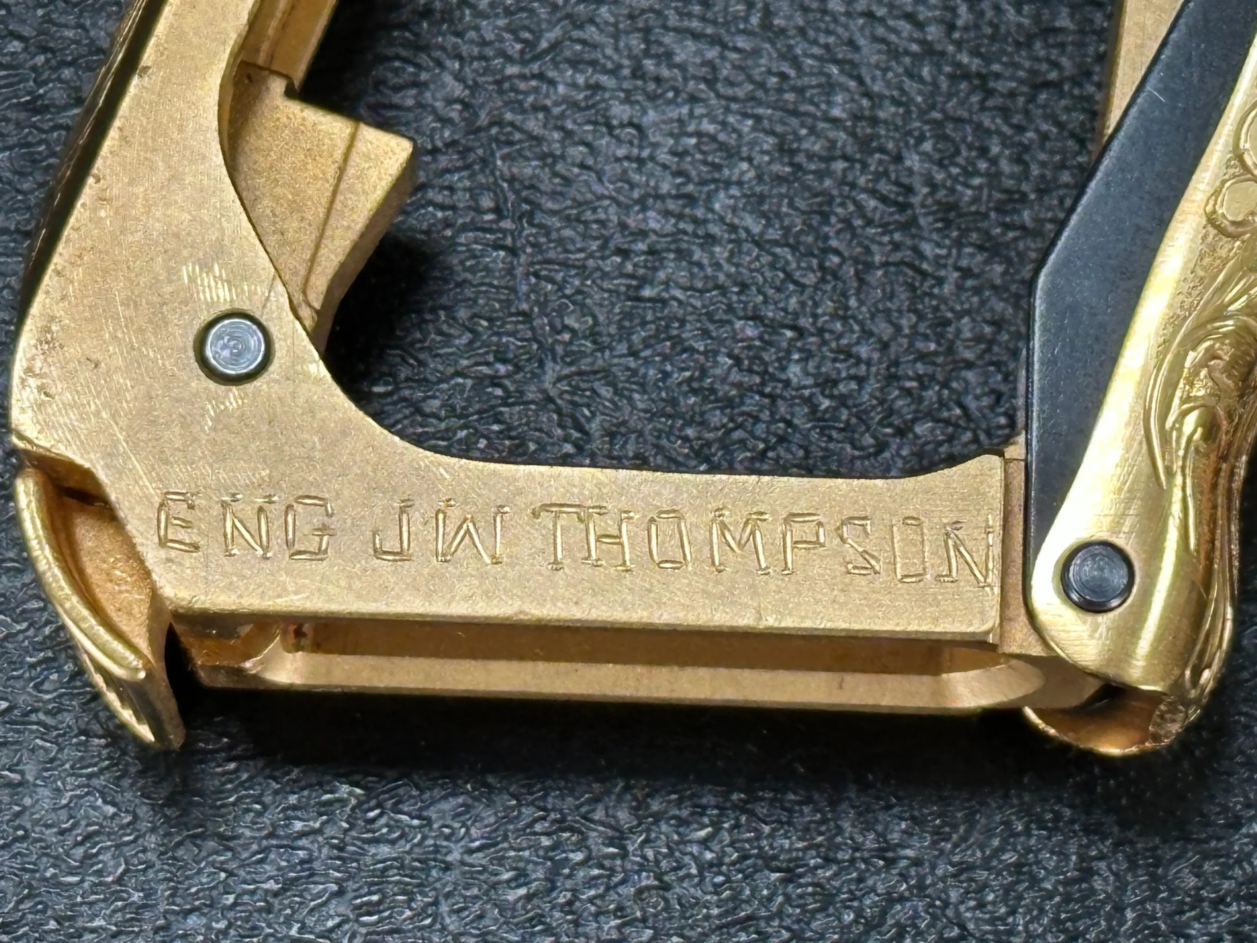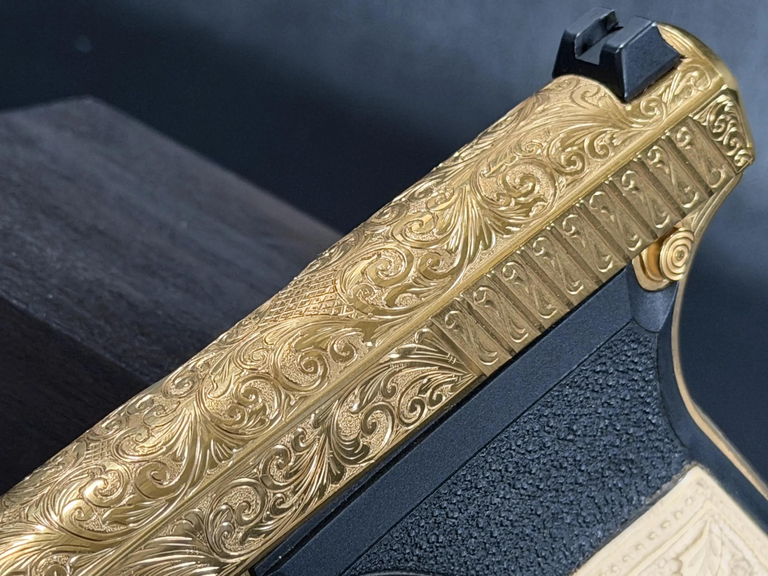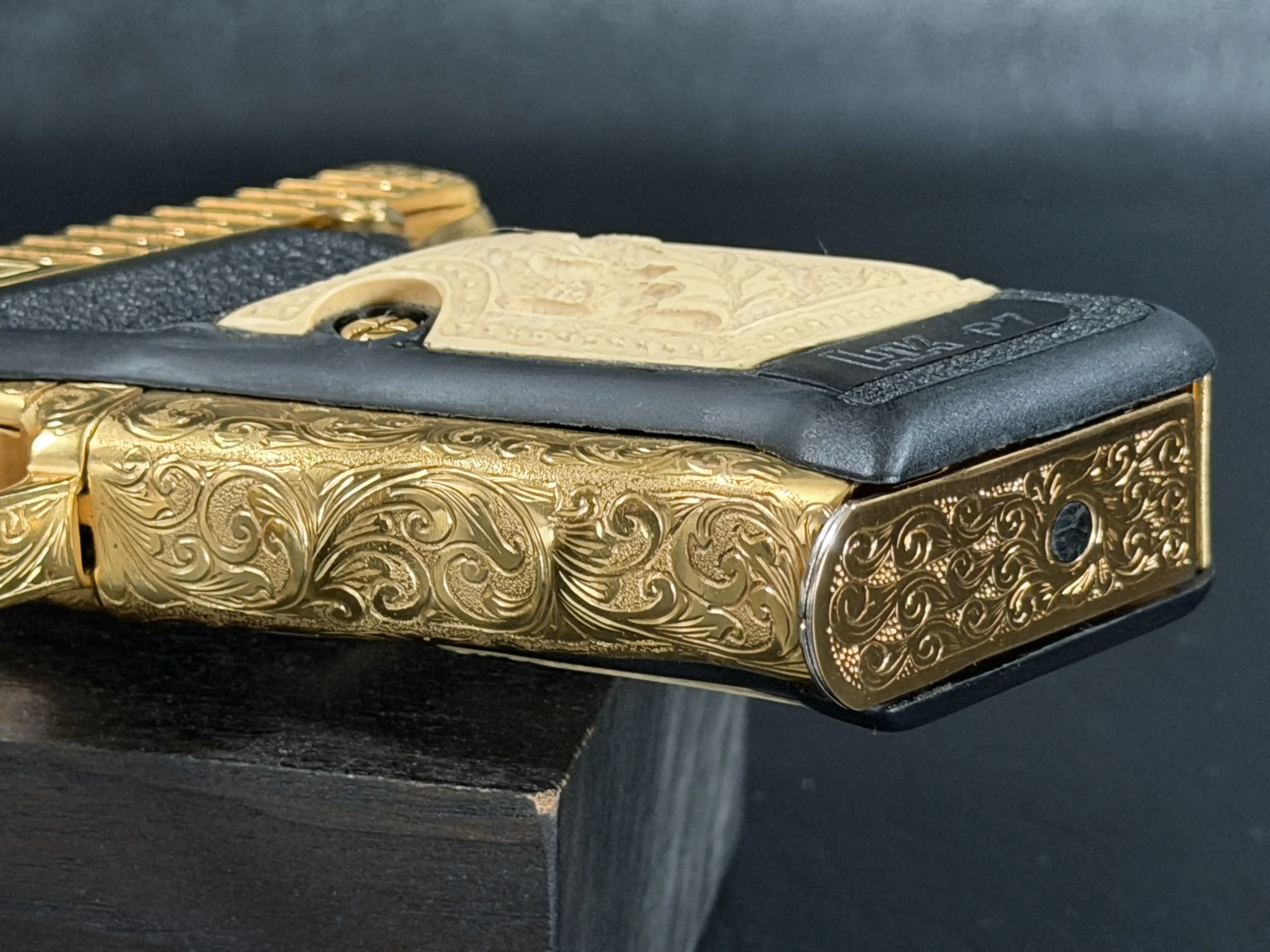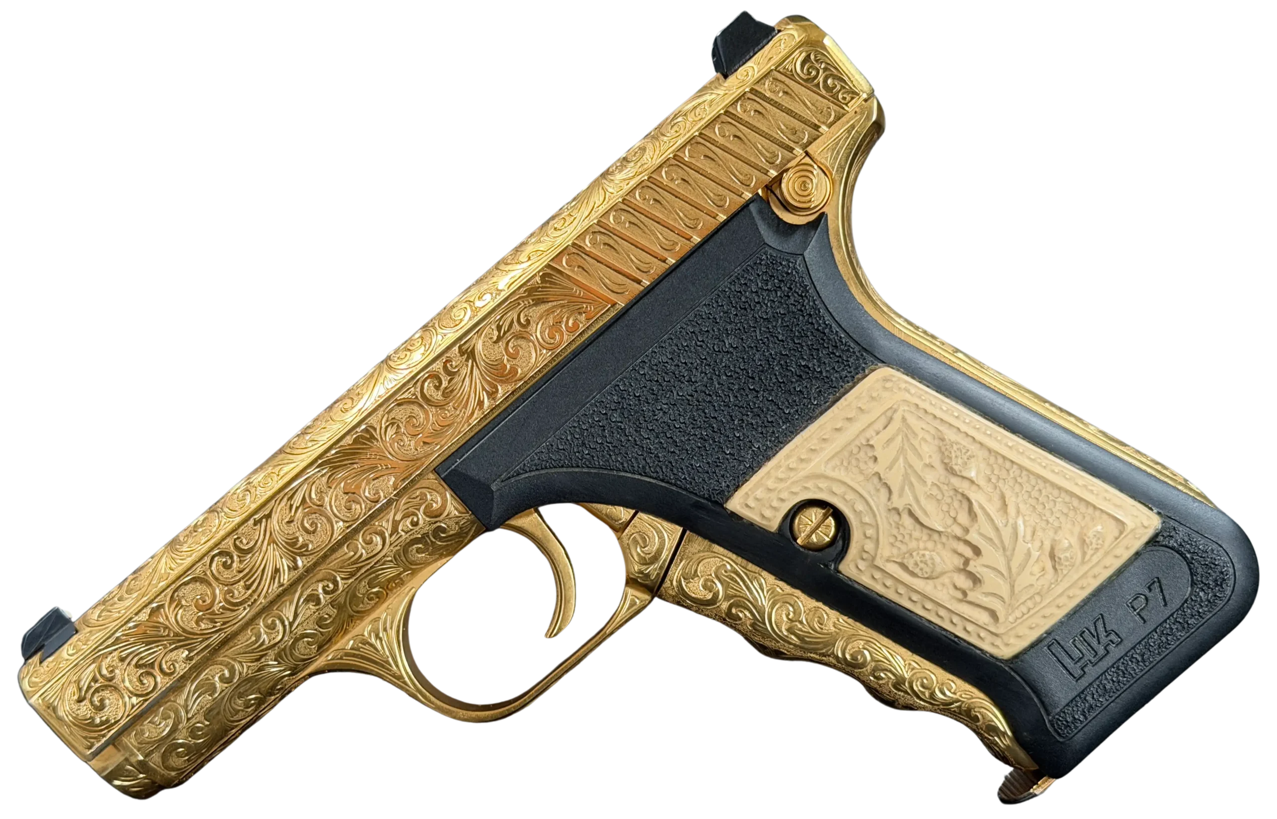 This JW Thompson Engraved Gold HK P7 brings together the distinctive HK P7 platform with extensive ornamental engraving and a bright gold finish. Built on the well-known Heckler & Koch design, this 9mm pistol features full-coverage scrollwork across the slide, frame, trigger guard, and small parts for a cohesive, highly decorative presentation.