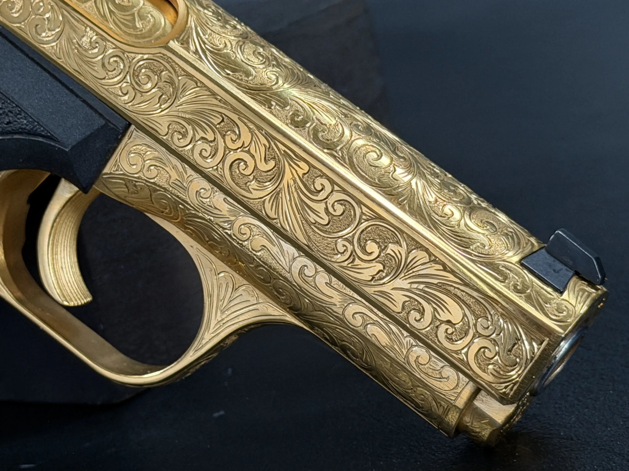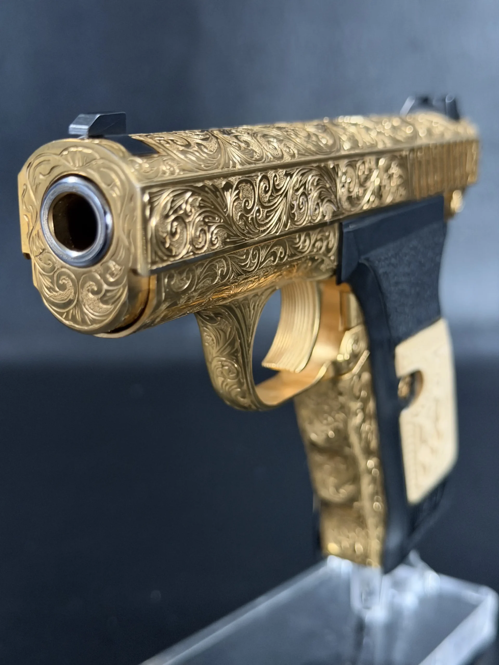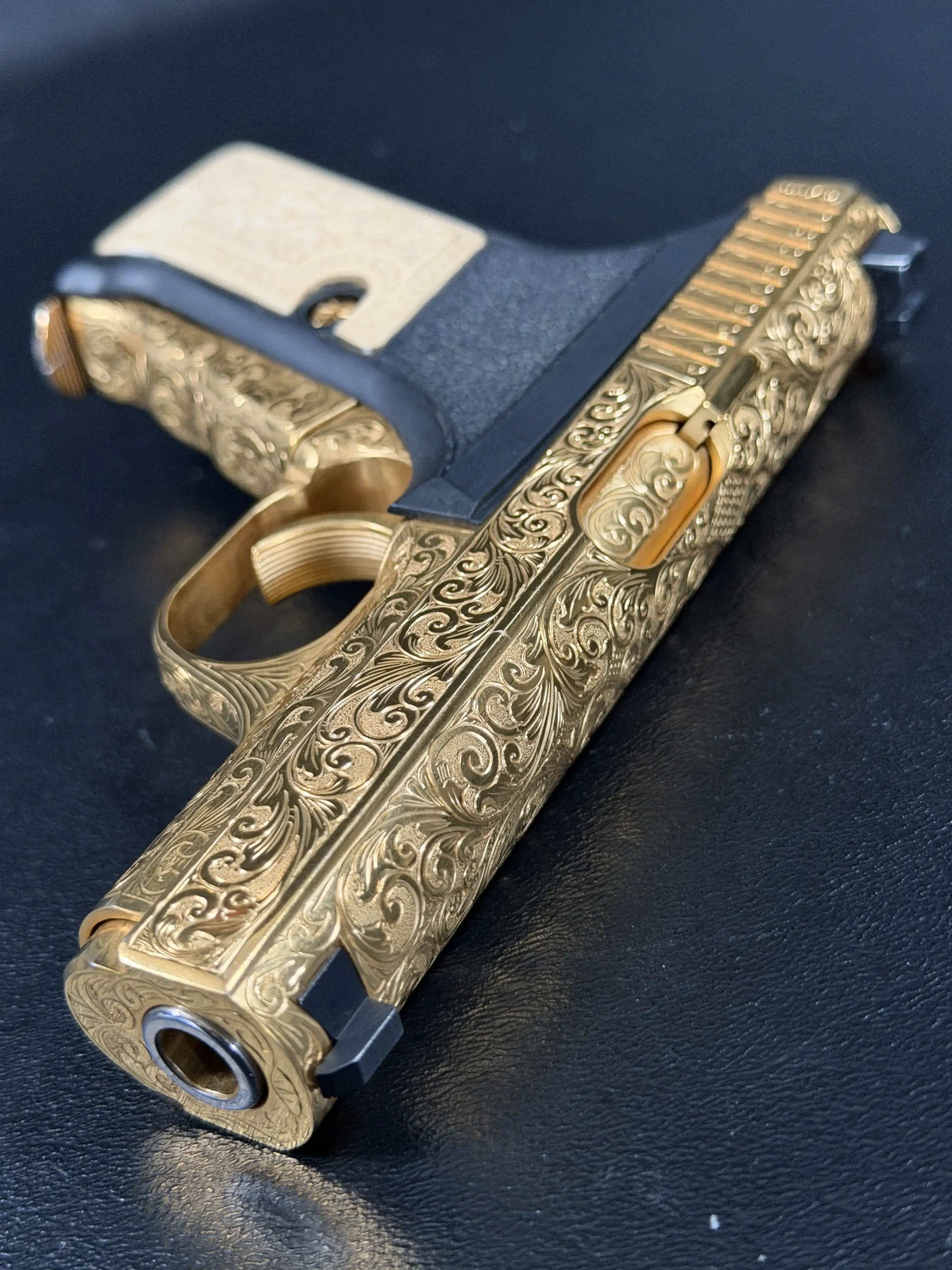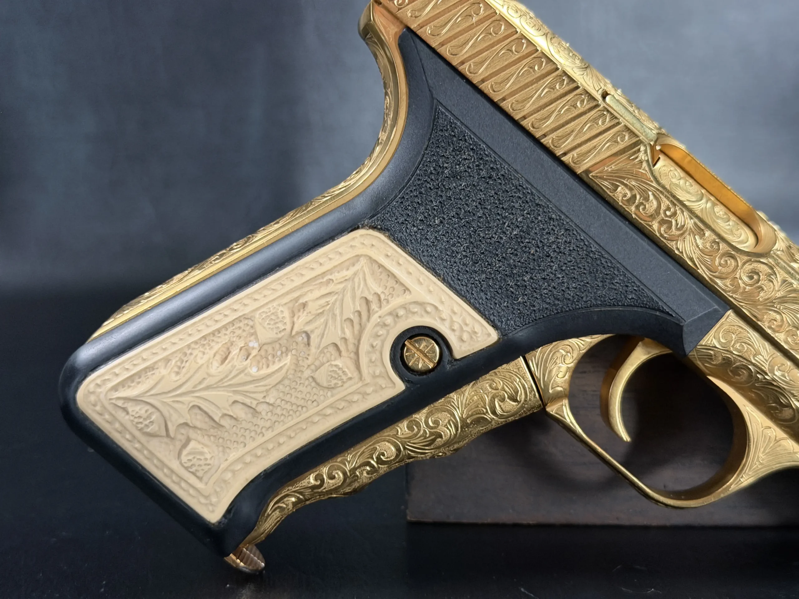 The engraved treatment continues into the finer details, including the front strap and trigger guard, with matching embellishment on the gold-finished magazine. A black grip frame provides visual contrast to the gold-toned metalwork, while the grip panels add carved relief detail that complements the overall design.