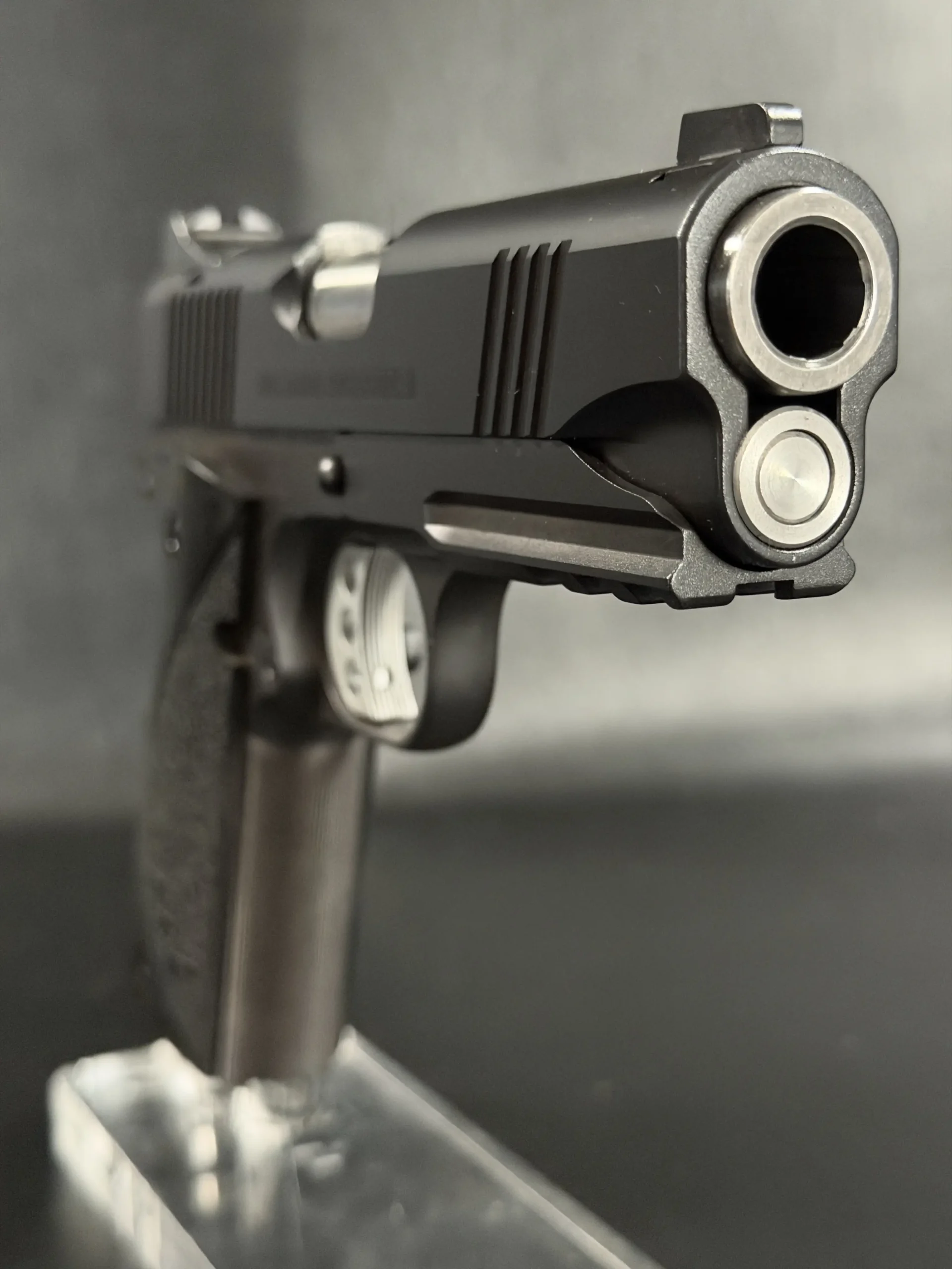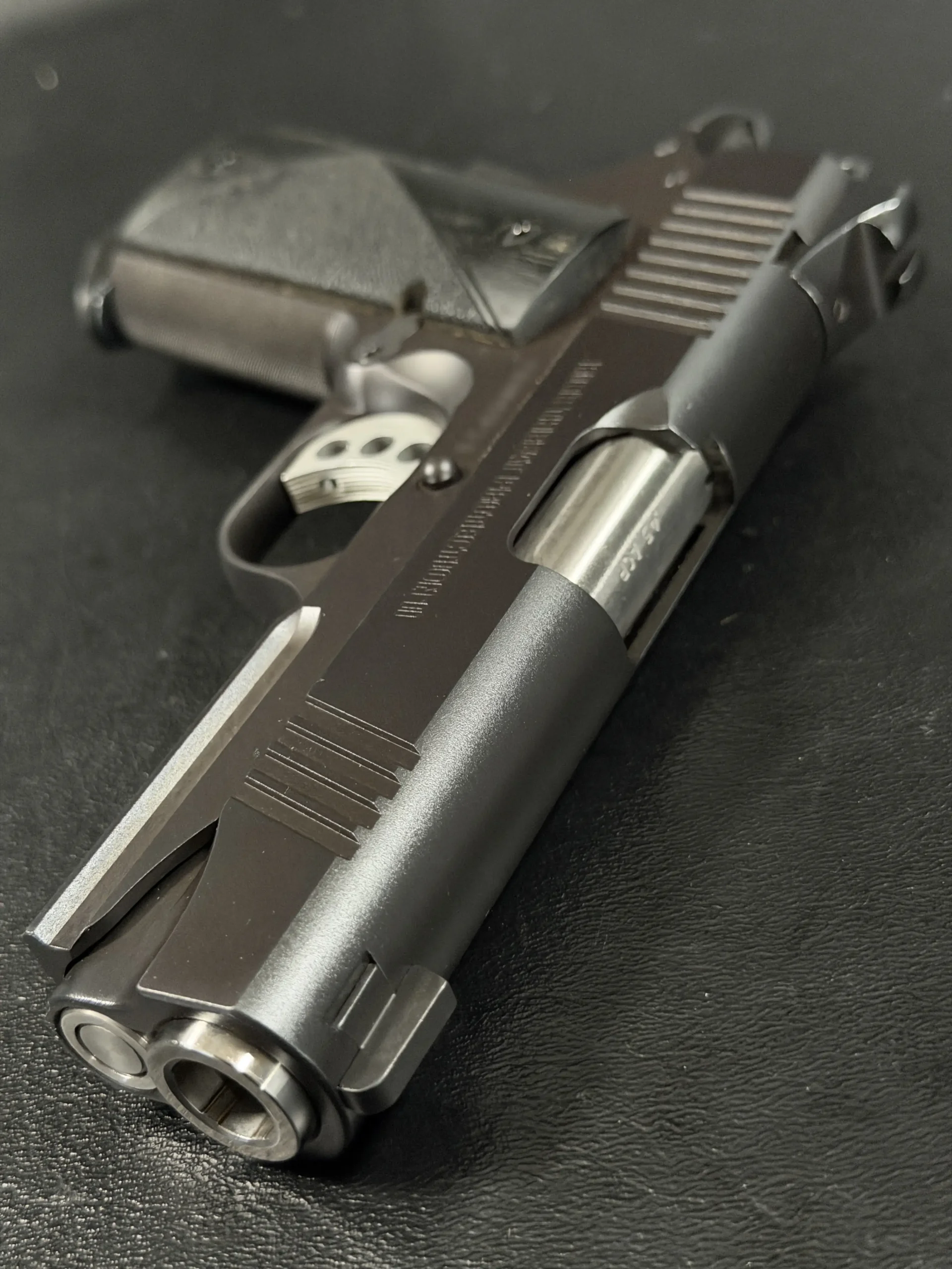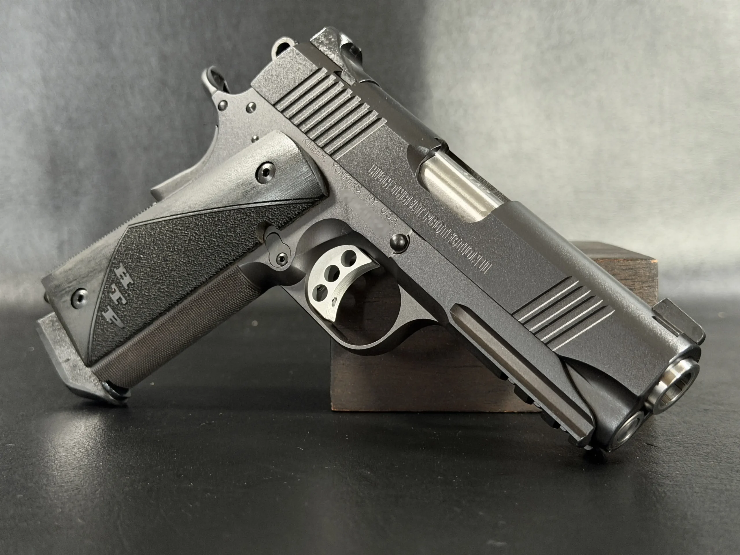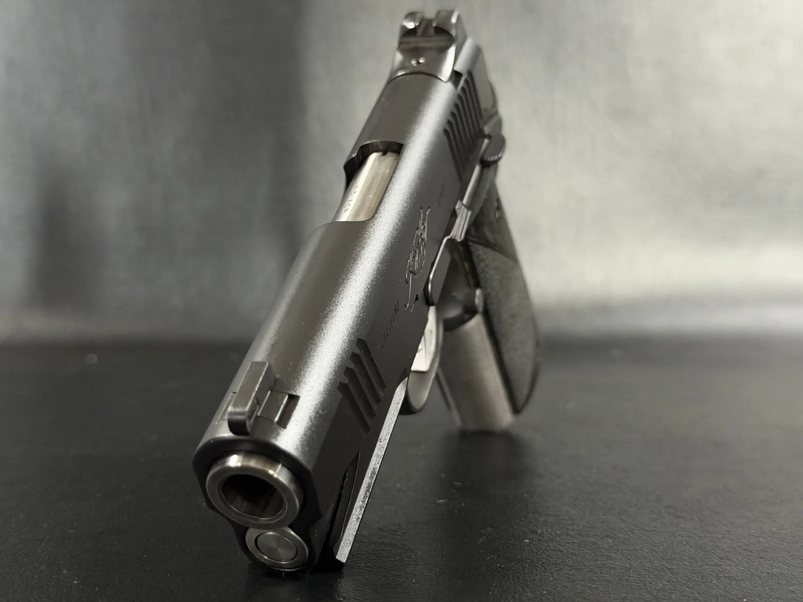 A matte tactical finish gives the pistol a subdued appearance, while the stainless barrel offers subtle contrast at the ejection port. Front and rear slide serrations provide added purchase, and the integral accessory rail brings extra utility without straying far from the traditional 1911 form.