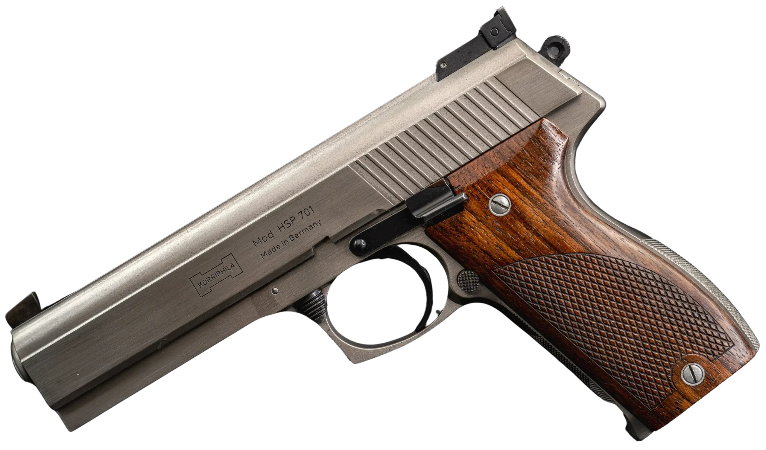 The Korriphila HSP 701 offered here is configured with a full dust cover and chambered in 9mm. The extended dust cover gives the pistol a continuous, distinctive profile that sets this example apart within the HSP 701 line.