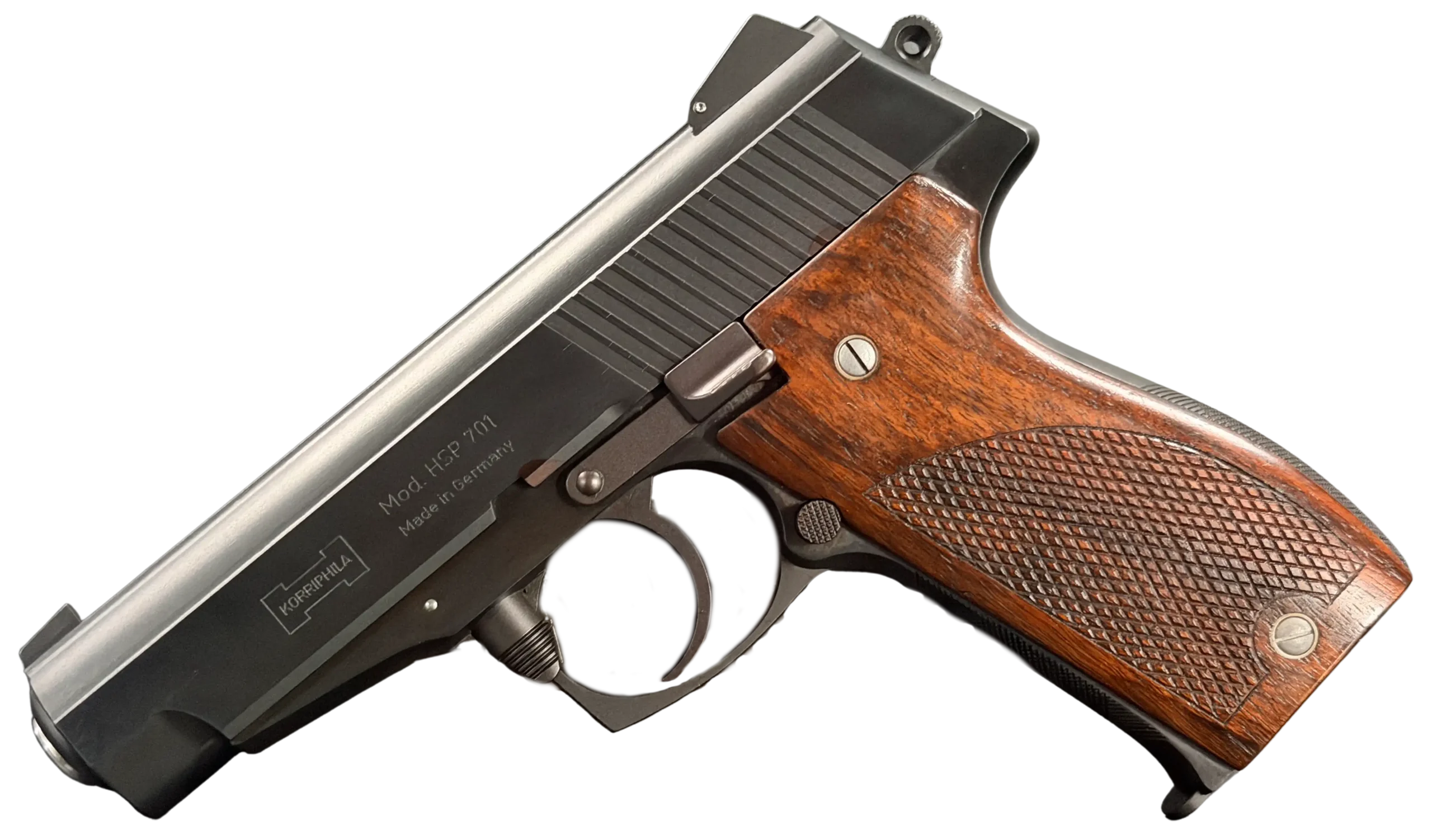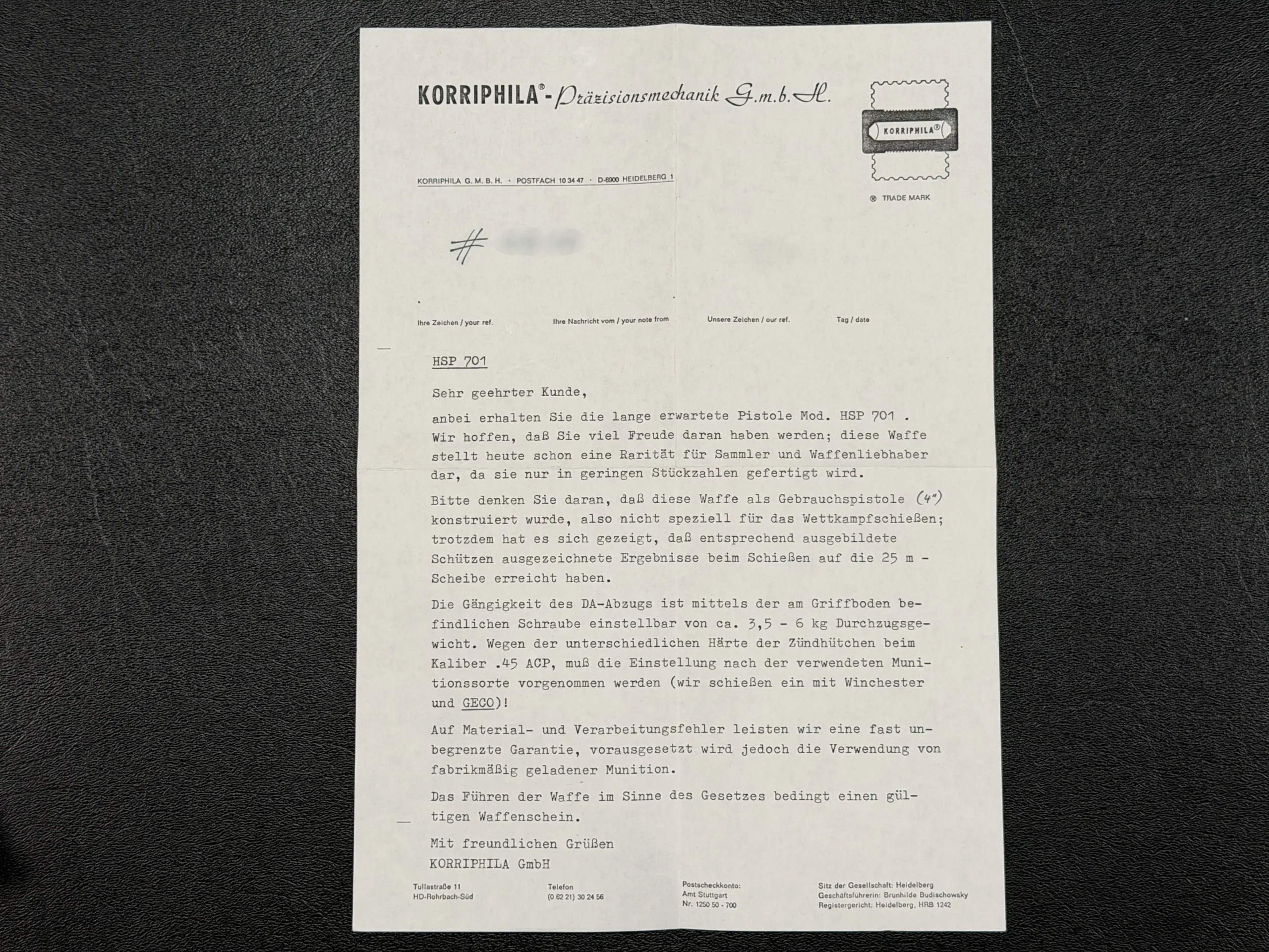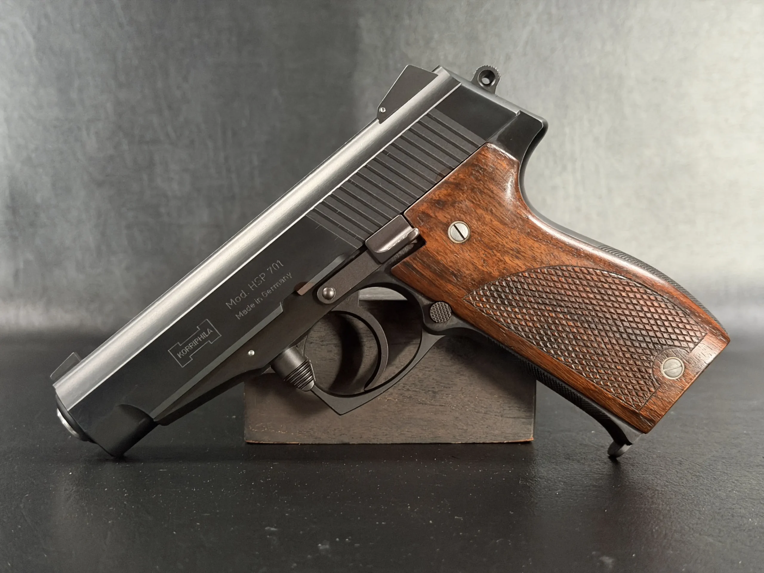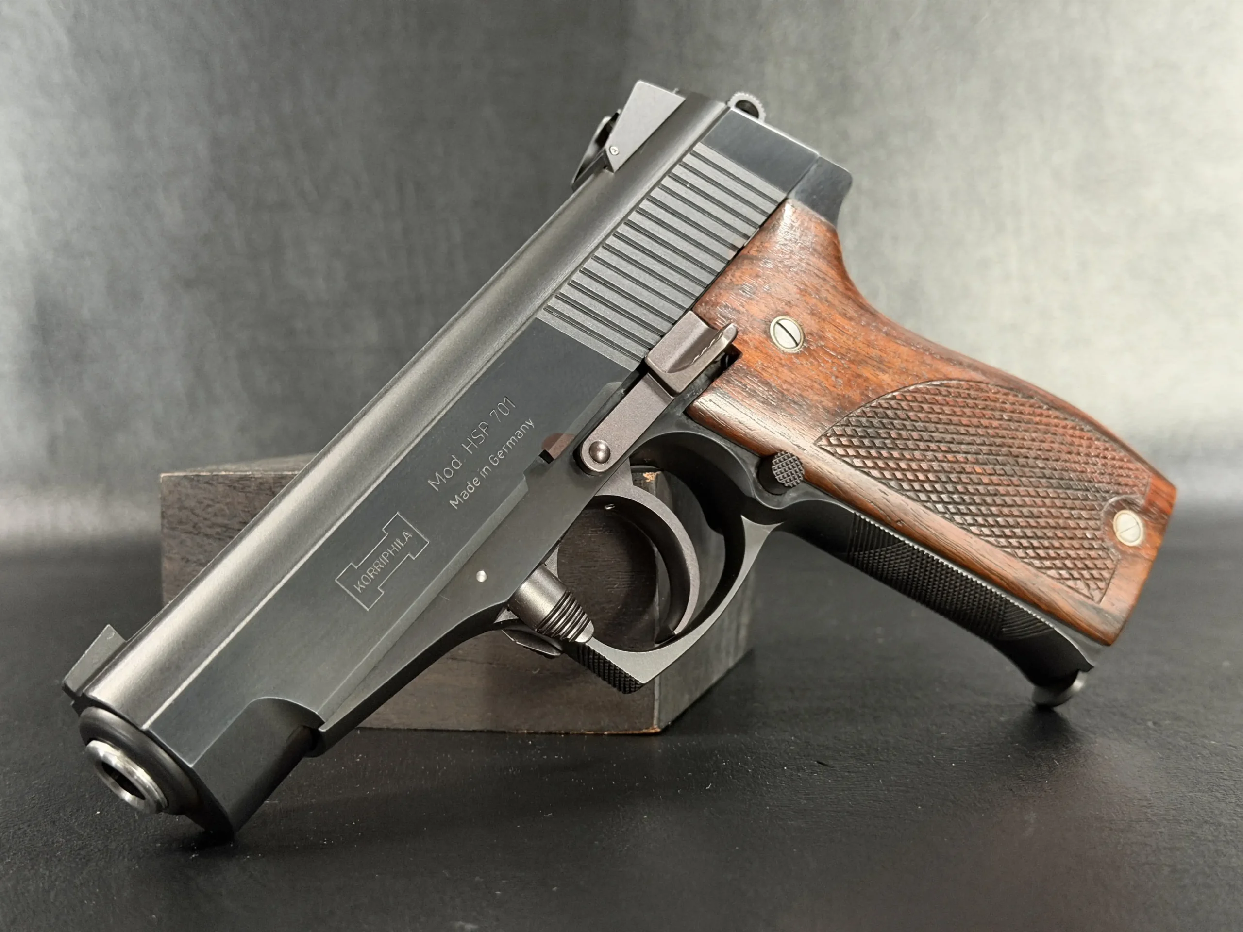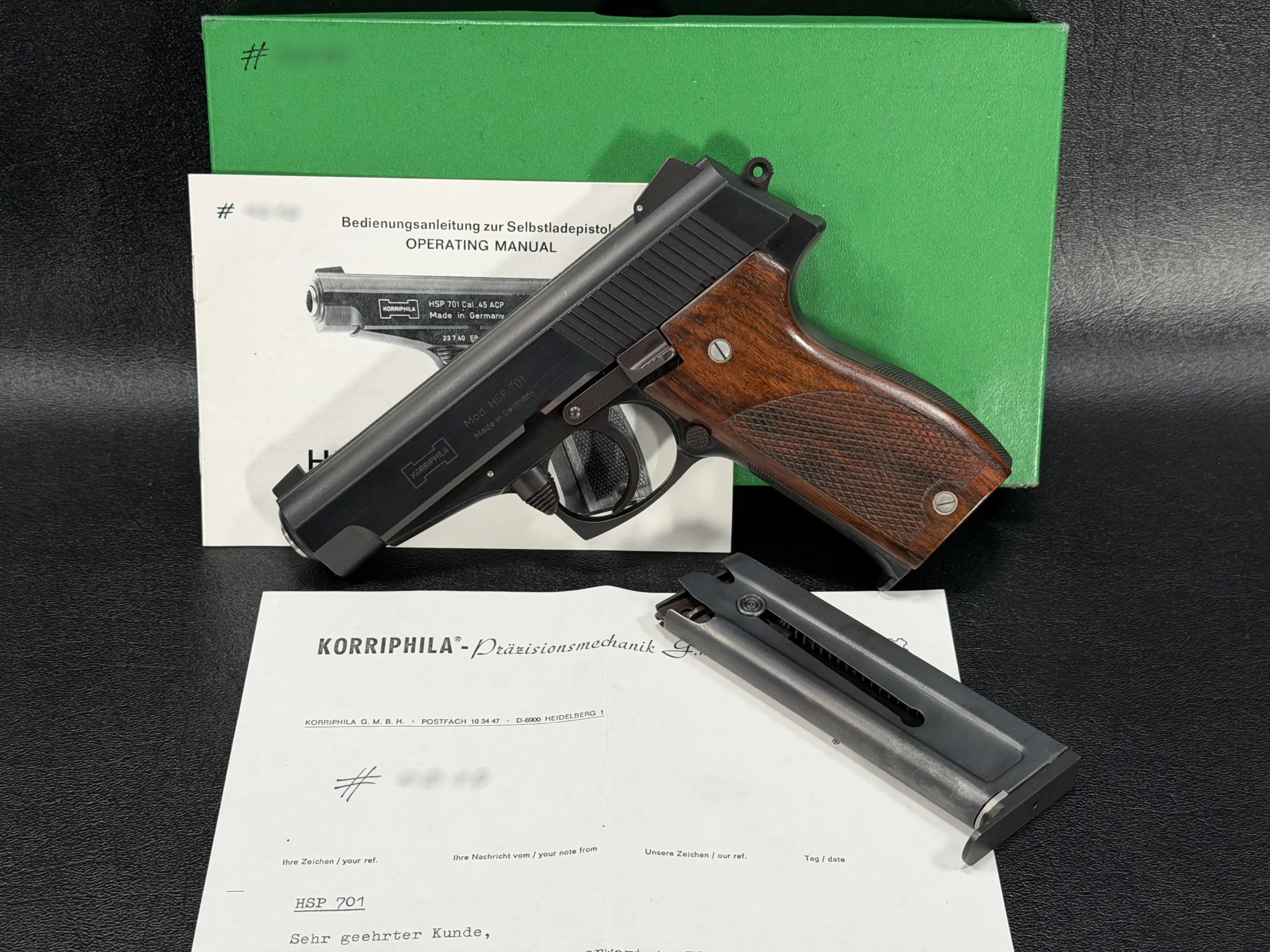 Included with the pistol are its original factory documentation and period materials. For collectors and enthusiasts of distinctive European handguns, this HSP 701 presents a notably unusual configuration within the Korriphila line.
