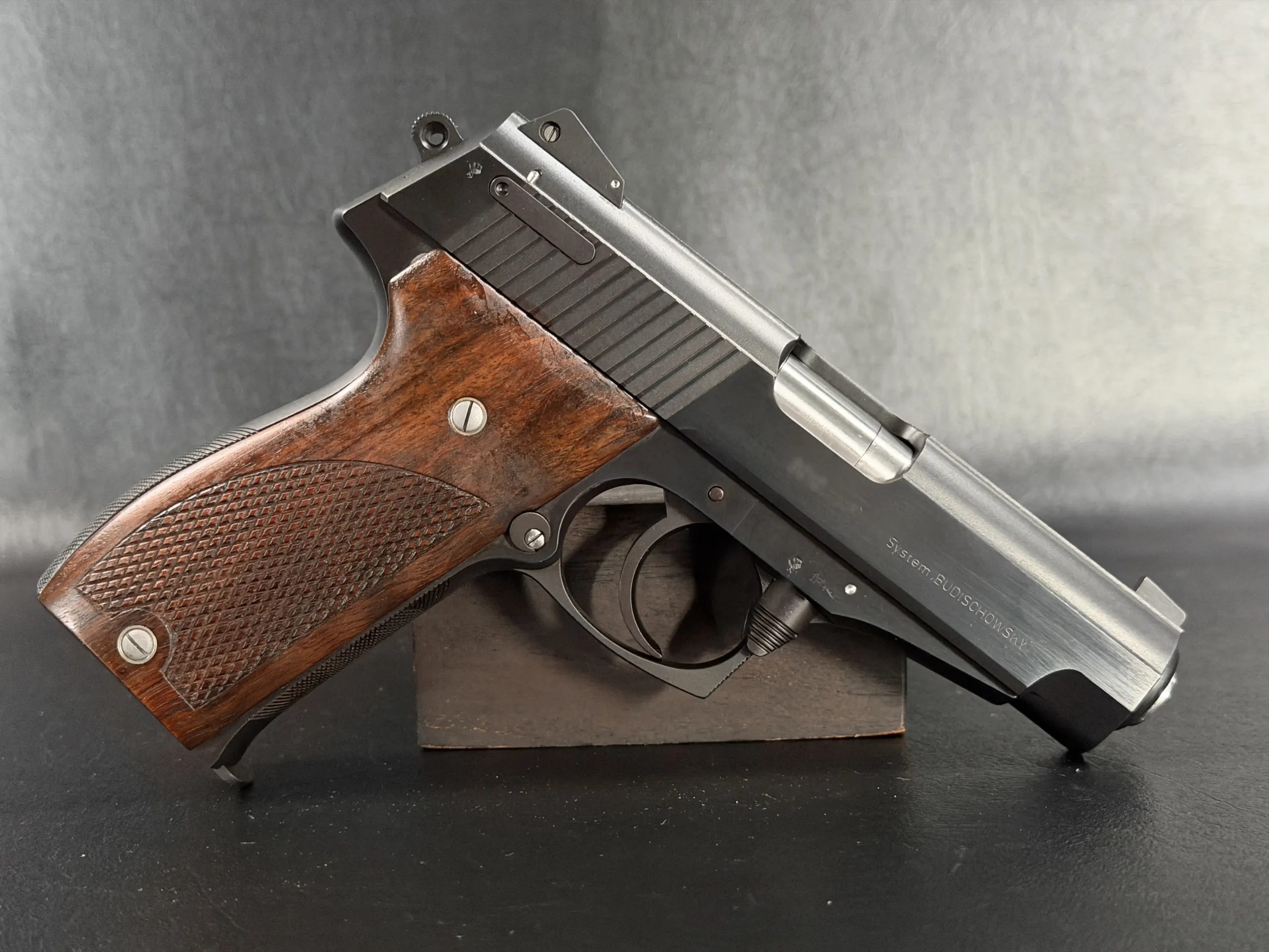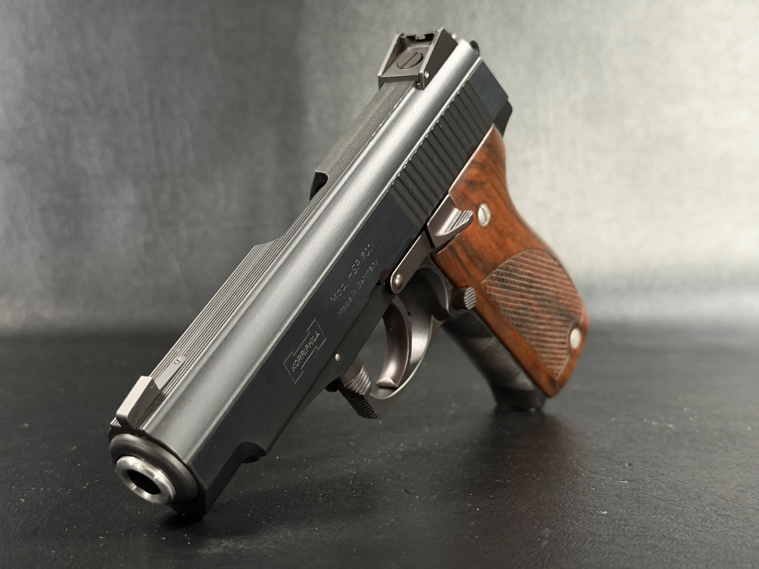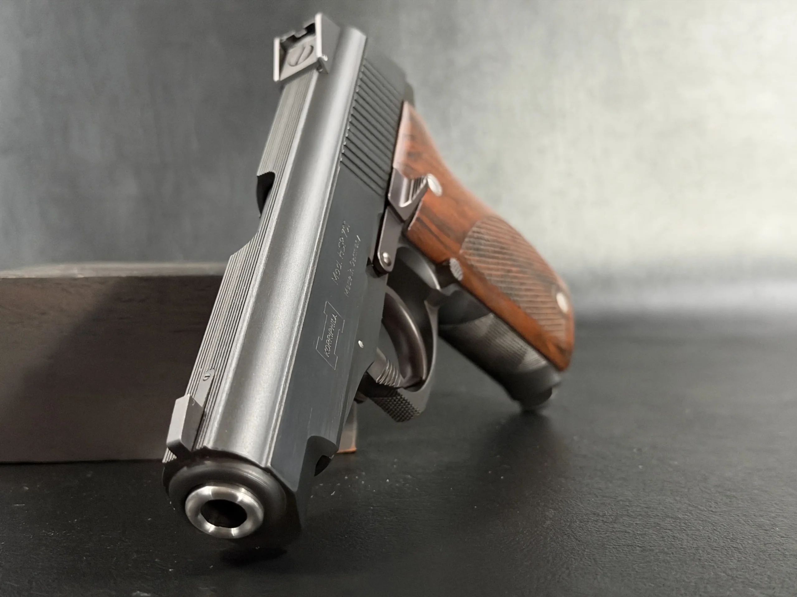This Korriphila HSP 701 is configured in .38 Wadcutter, an uncommon chambering for the model. The pistol reflects the precise fit and machining associated with the HSP 701 platform, with satin-finished steel components and a cohesive visual balance across the slide, frame, barrel, and controls.