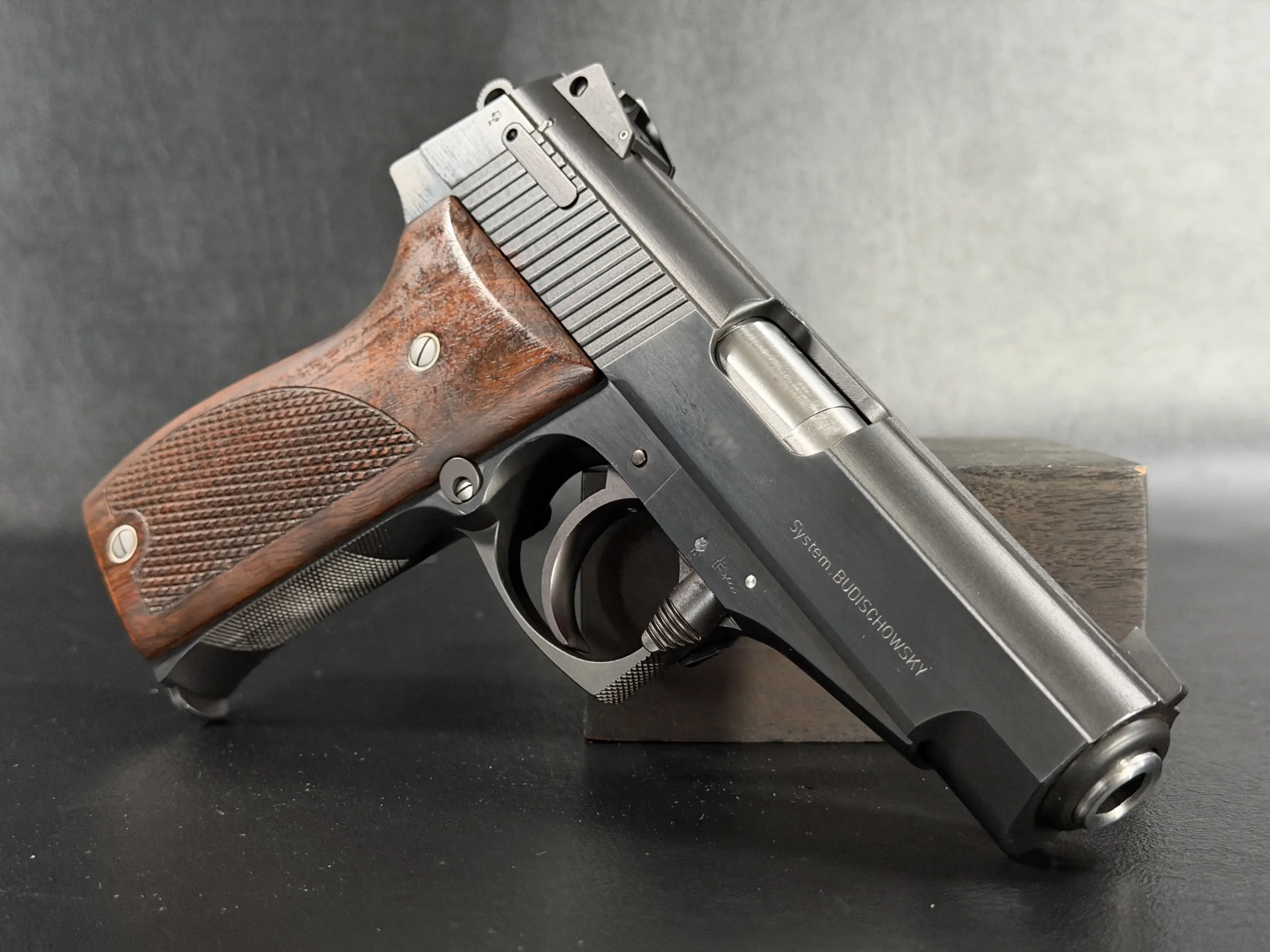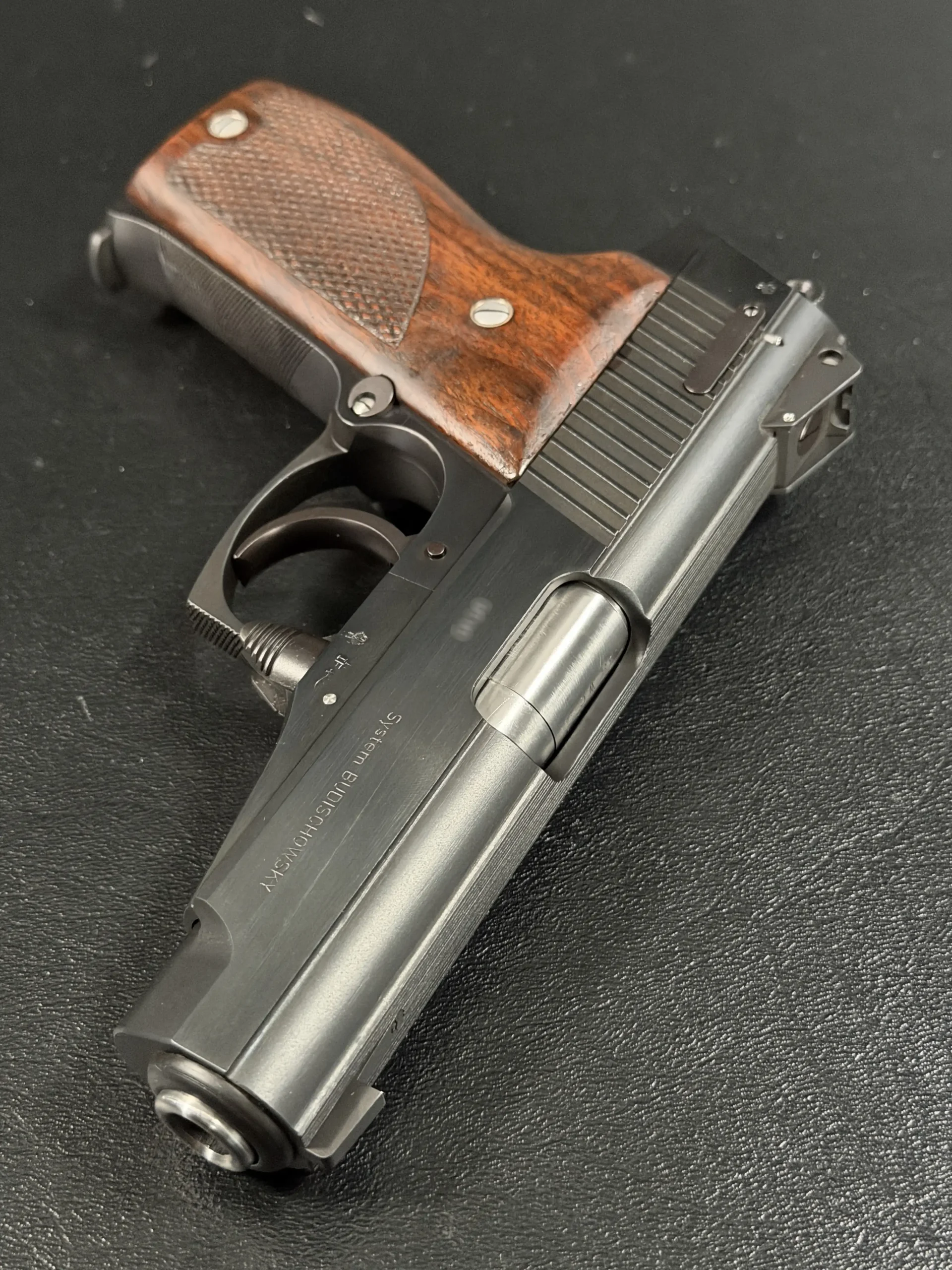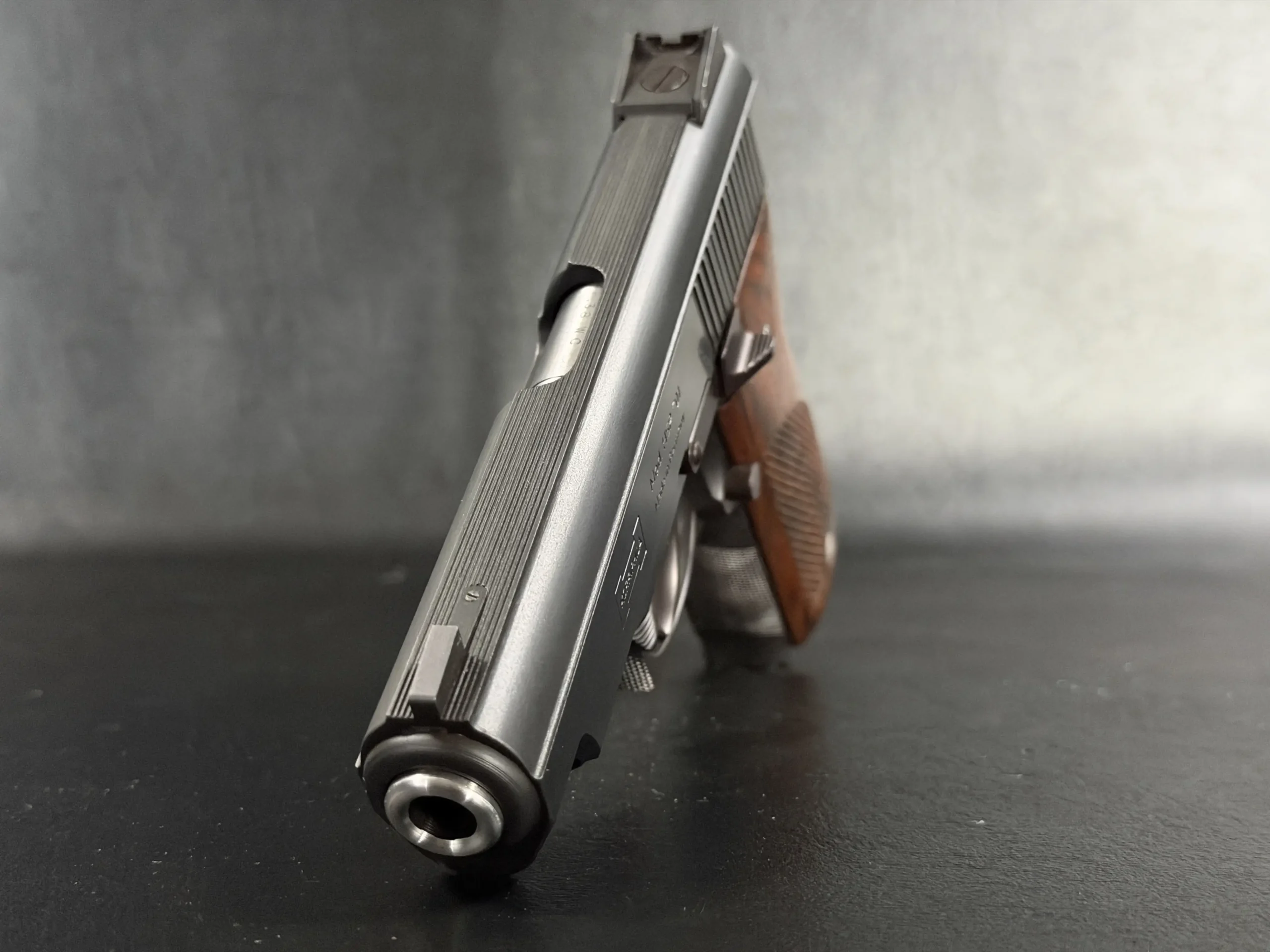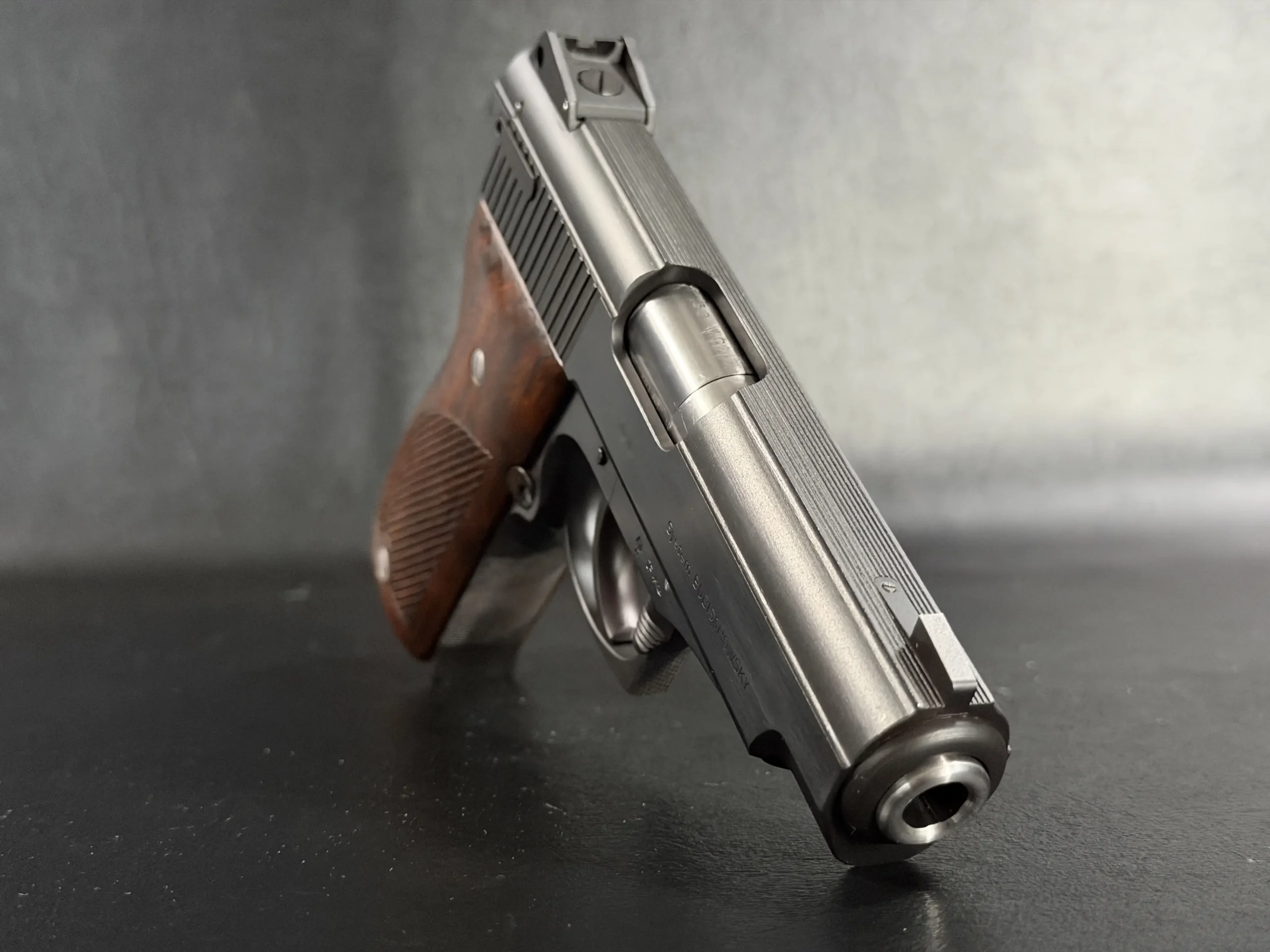 Finely checkered wood grips add warmth and contrast to the steel construction, while the close fit between metal and wood reinforces the pistol’s carefully executed presentation. The overall design combines clean industrial lines with a refined, purposeful appearance.