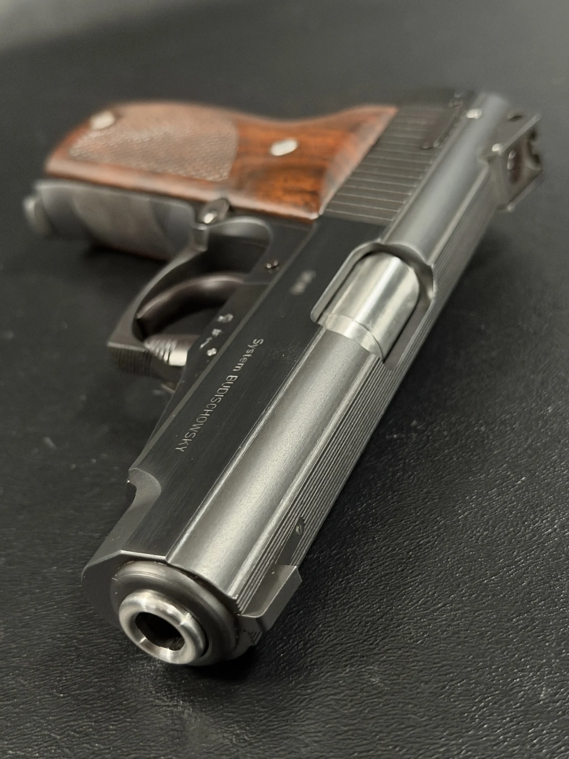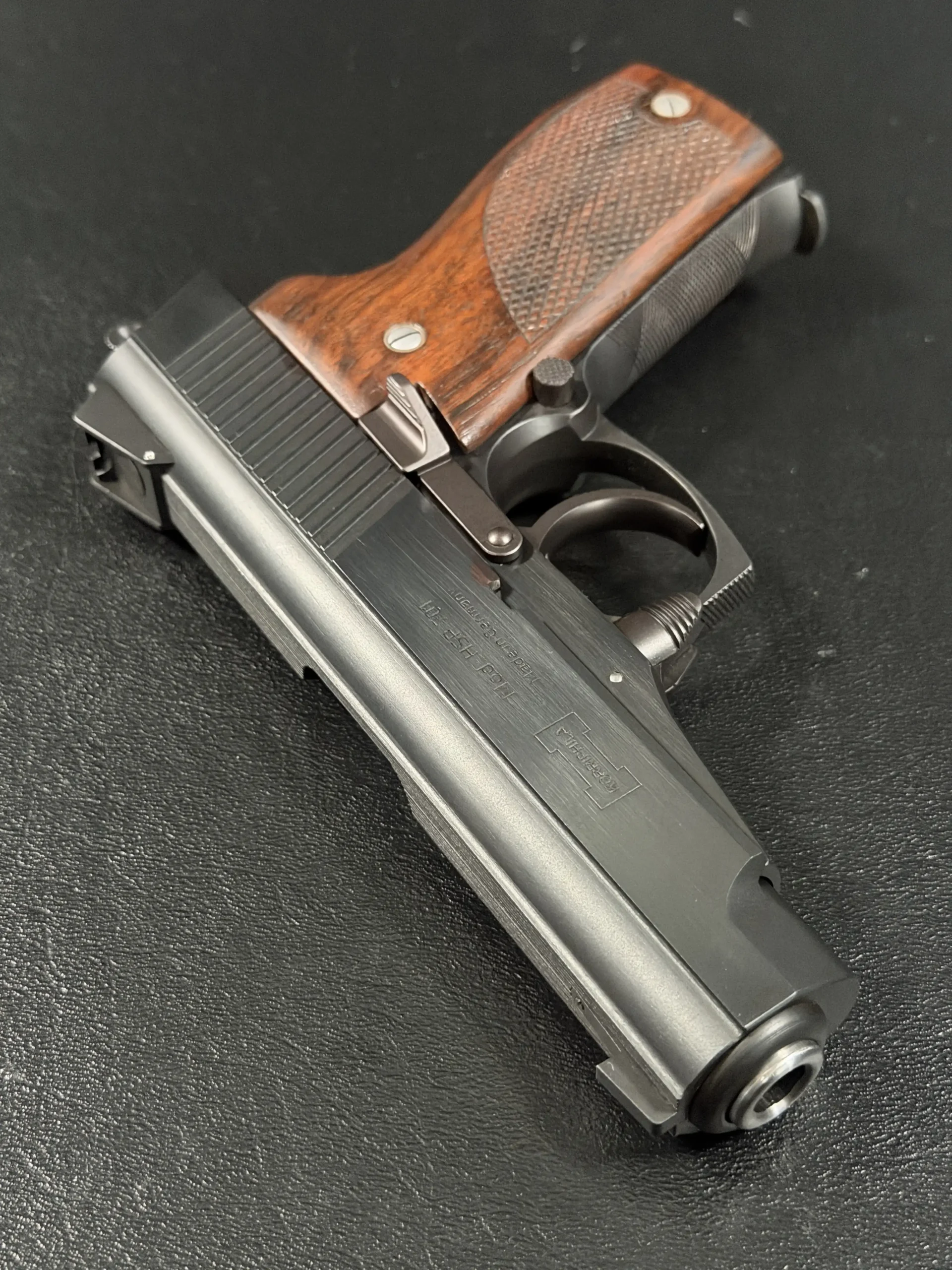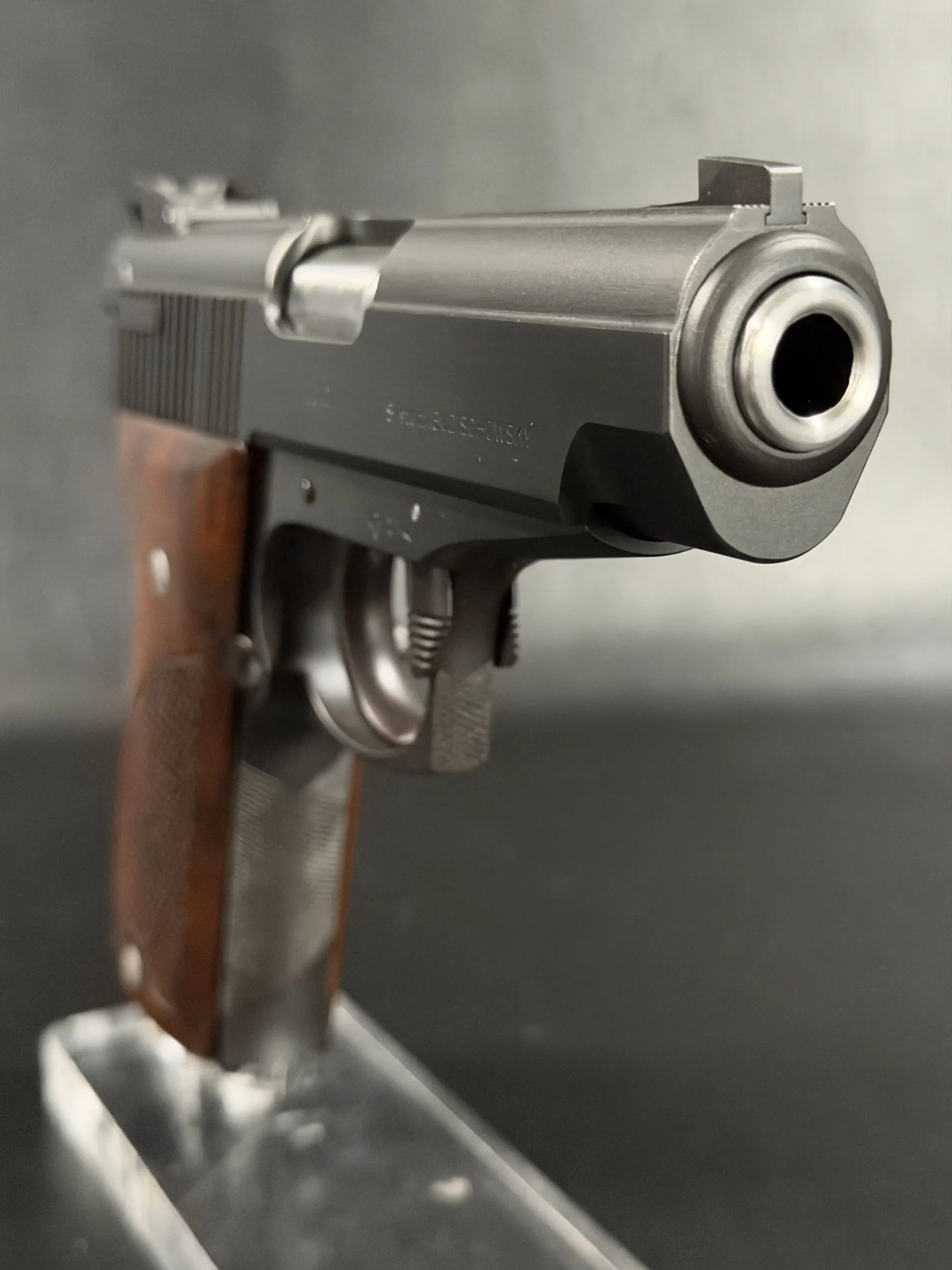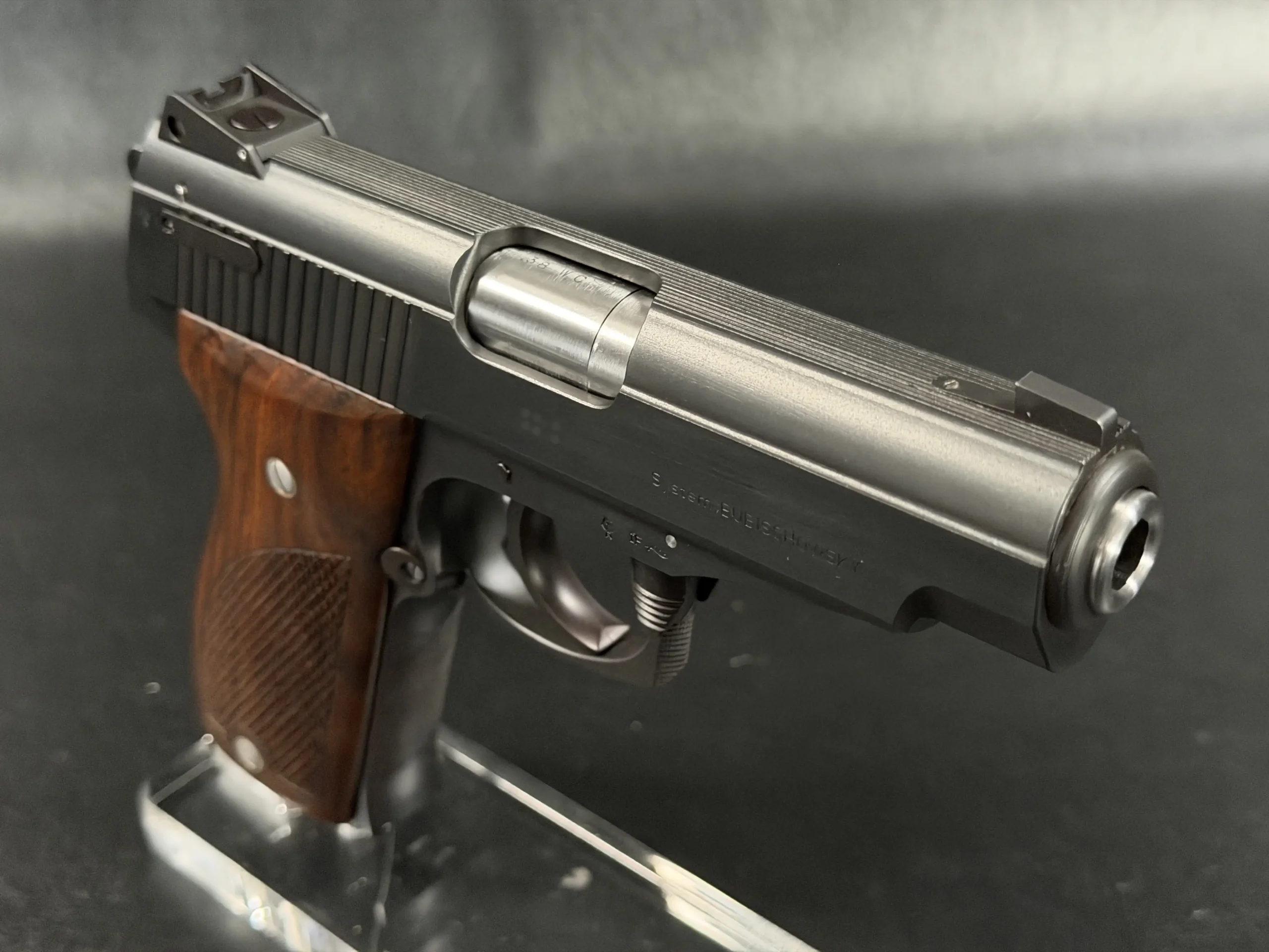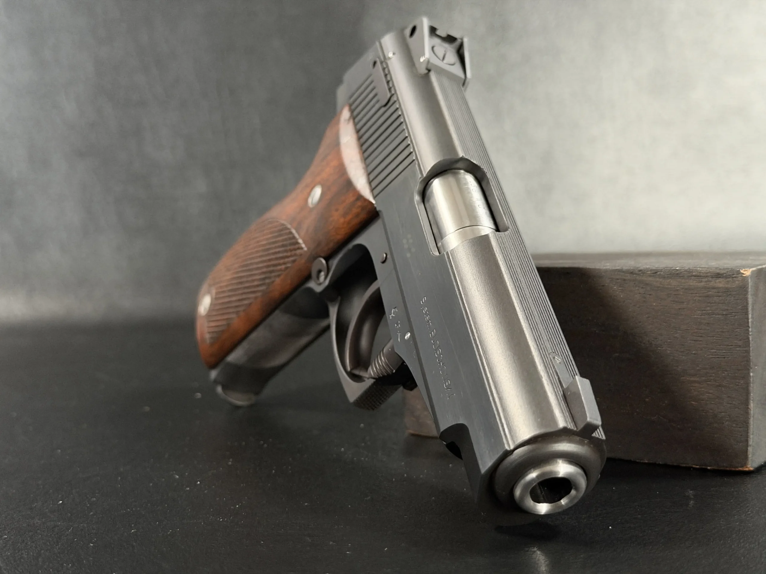 Finely checkered wood grips add warmth and contrast to the steel construction, while the close fit between metal and wood reinforces the pistol’s carefully executed presentation. The overall design combines clean industrial lines with a refined, purposeful appearance.