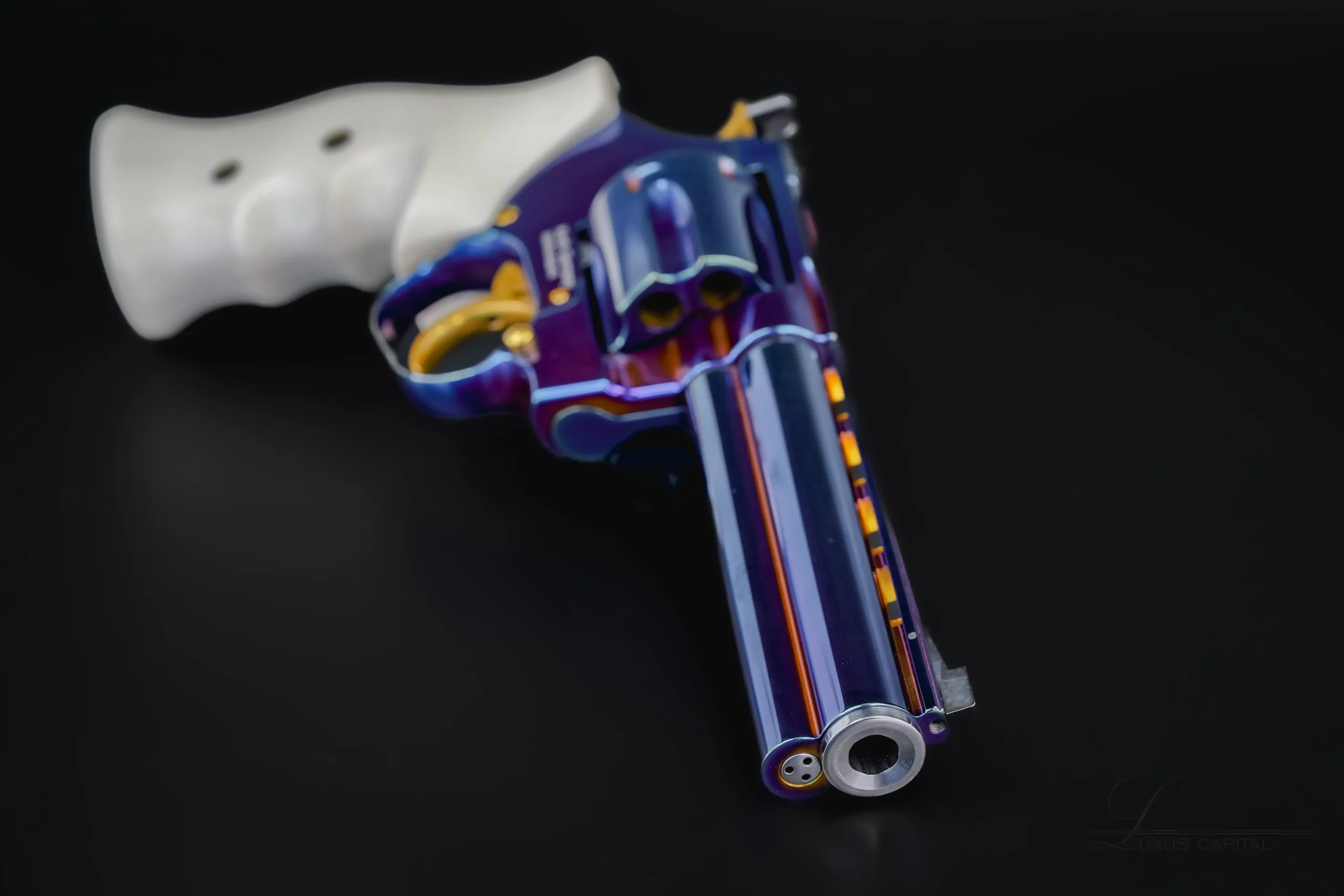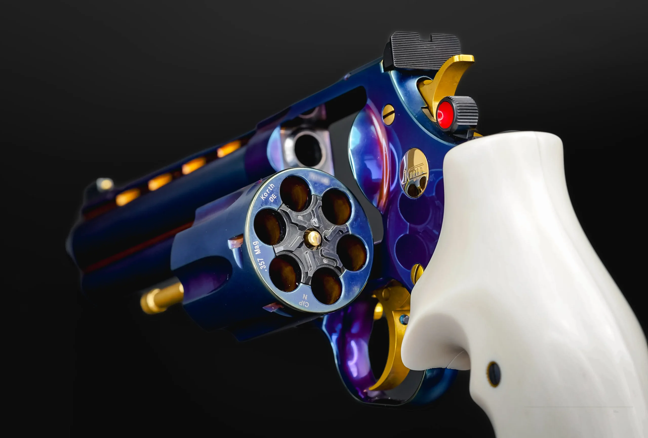 The standout feature is the Blue Plasma finish, which shifts in tone under changing light from deep blue to violet and indigo-like hues. Applied across the frame, barrel, and cylinder, the finish highlights the revolver’s sculpted lines and ventilated rib profile while creating a dramatic visual contrast with the gold-colored accents on the trigger, hammer, and controls.