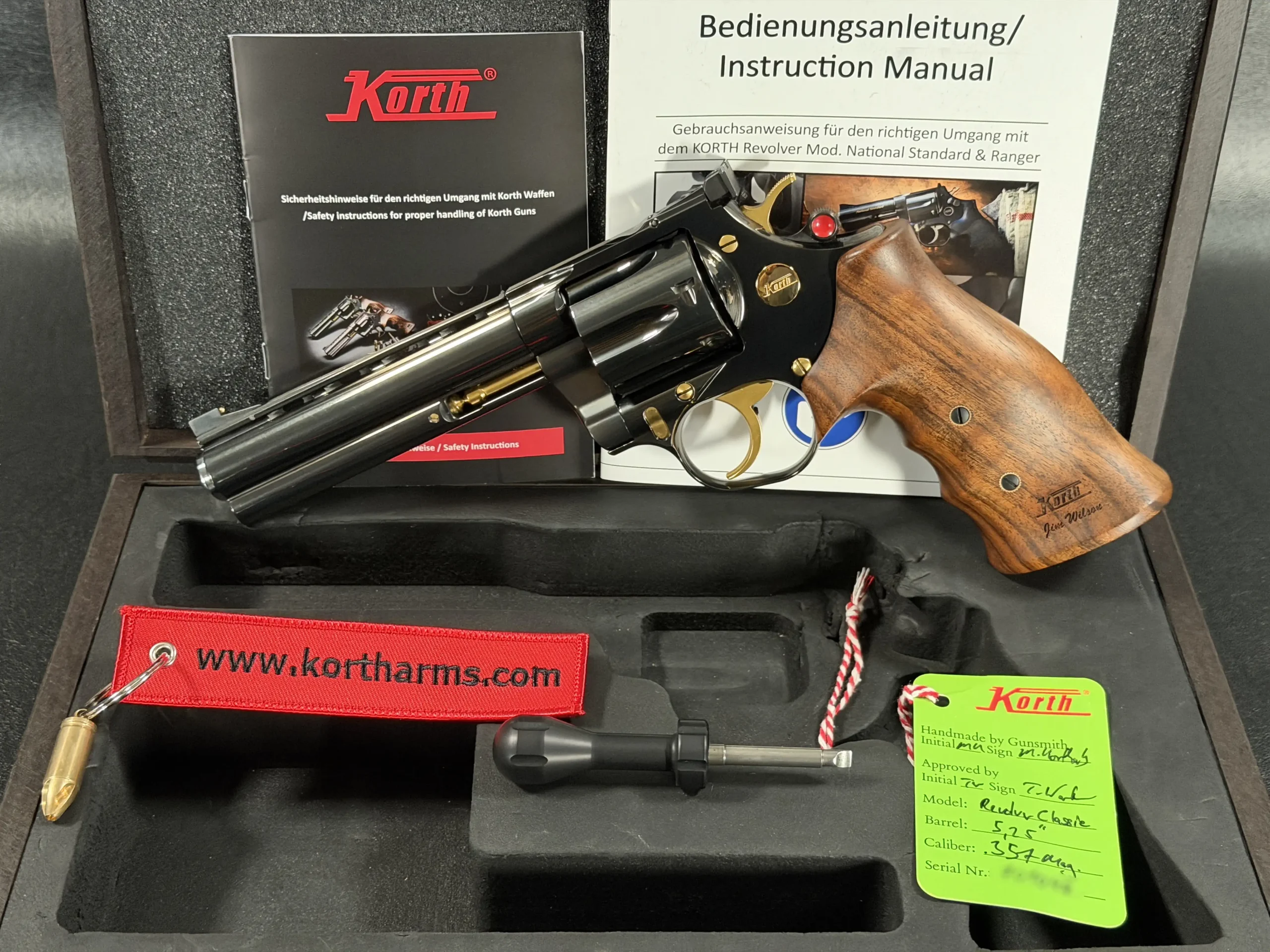 This example is accompanied by factory documentation and original accessories, making it a strong presentation of the Korth Classic configuration in a polished black finish.