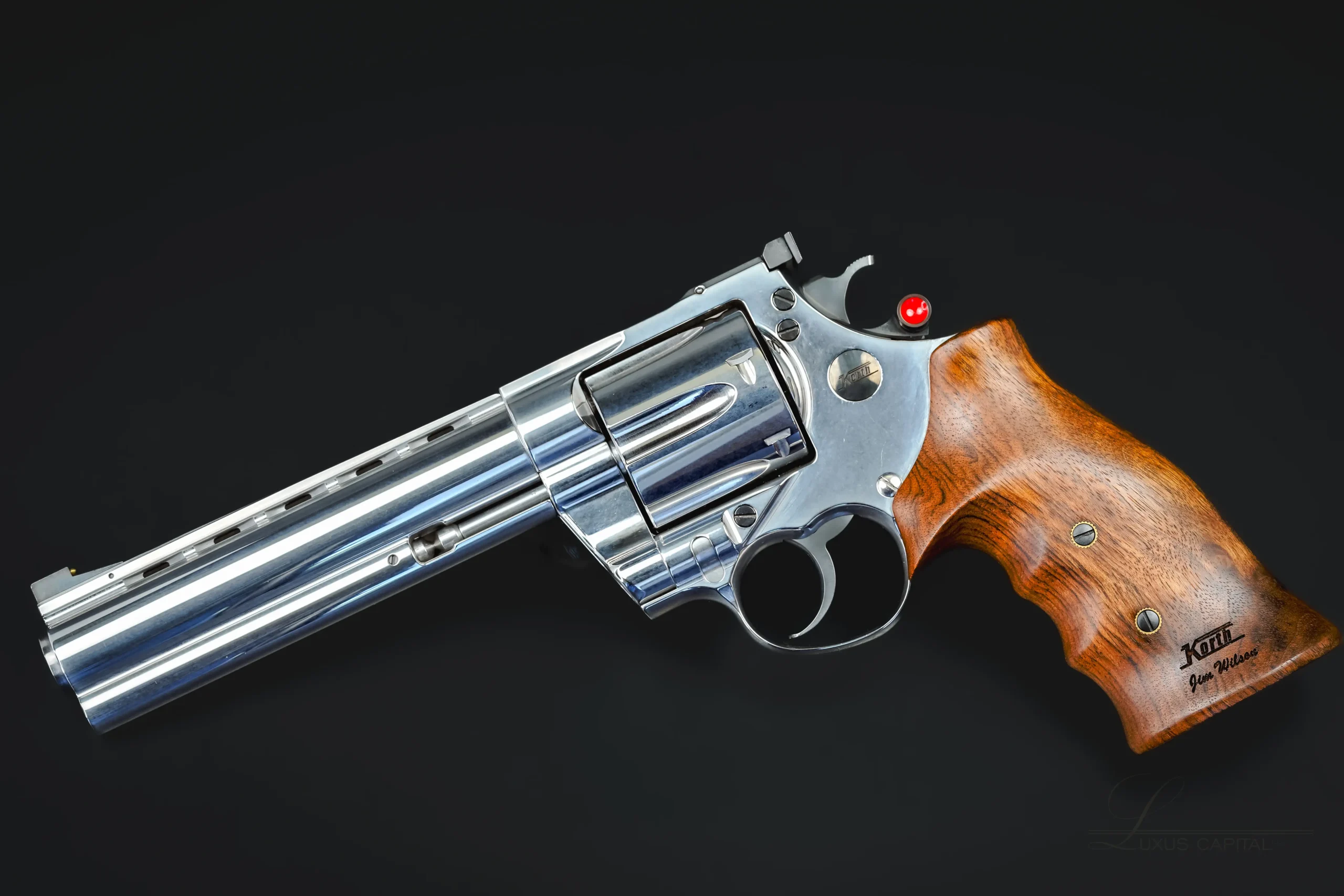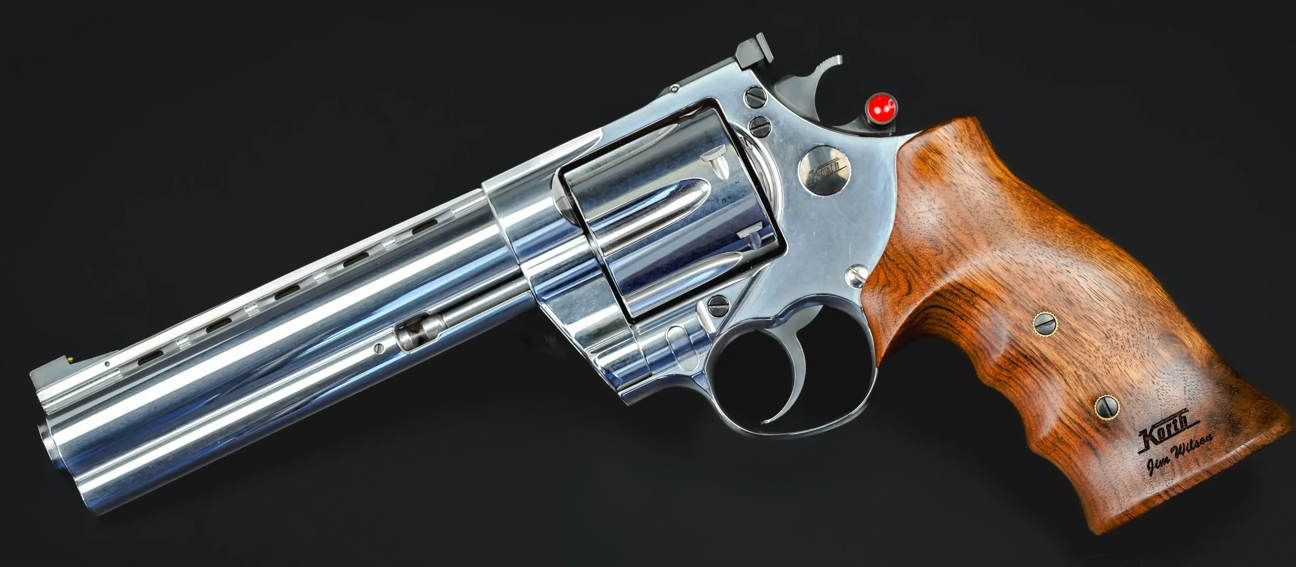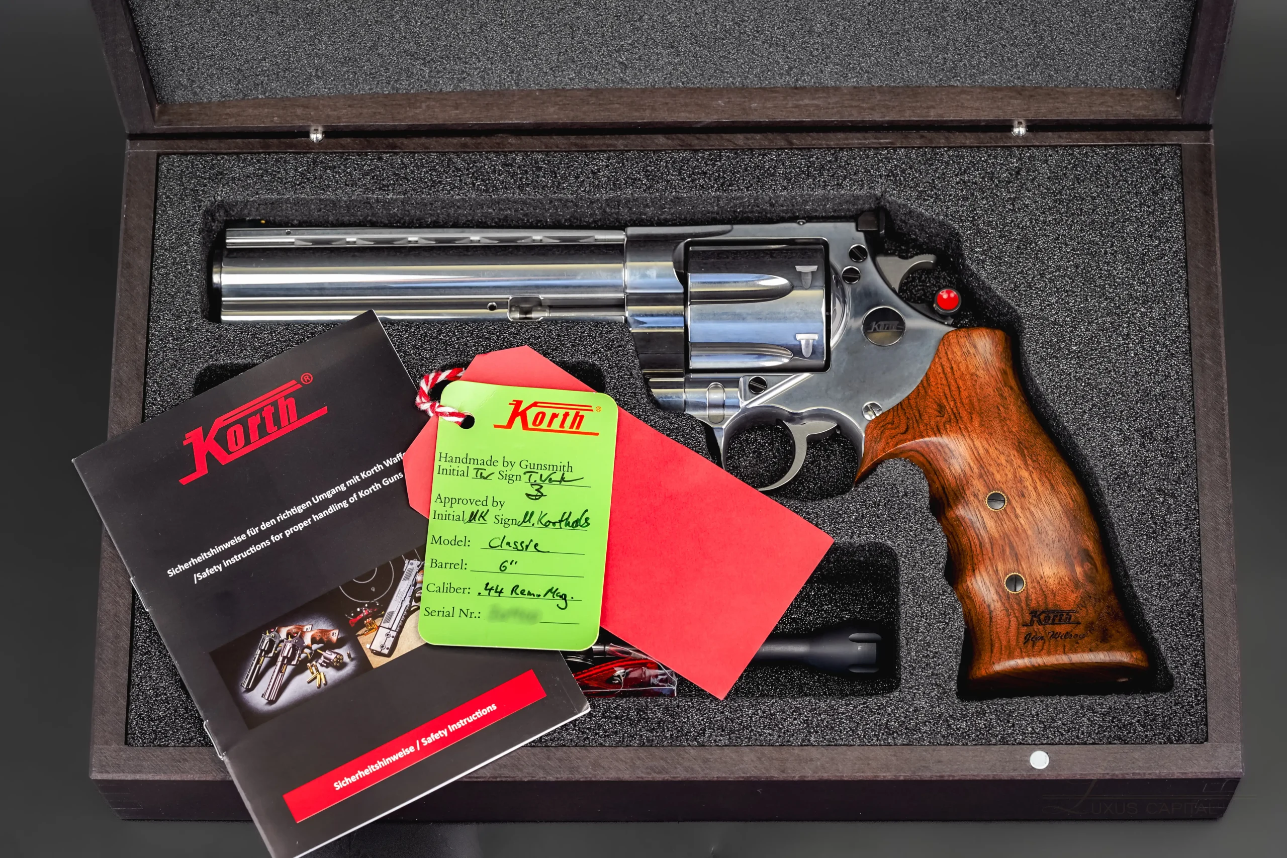 Korth Classic High Gloss Stainless revolver chambered in .357 Magnum with a mirror-like stainless finish, full-length barrel rib, ventilated underlug, and figured walnut grips. Includes its factory presentation case and documentation.