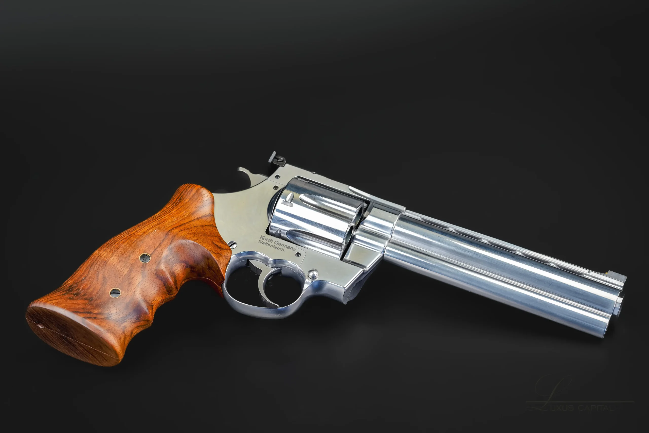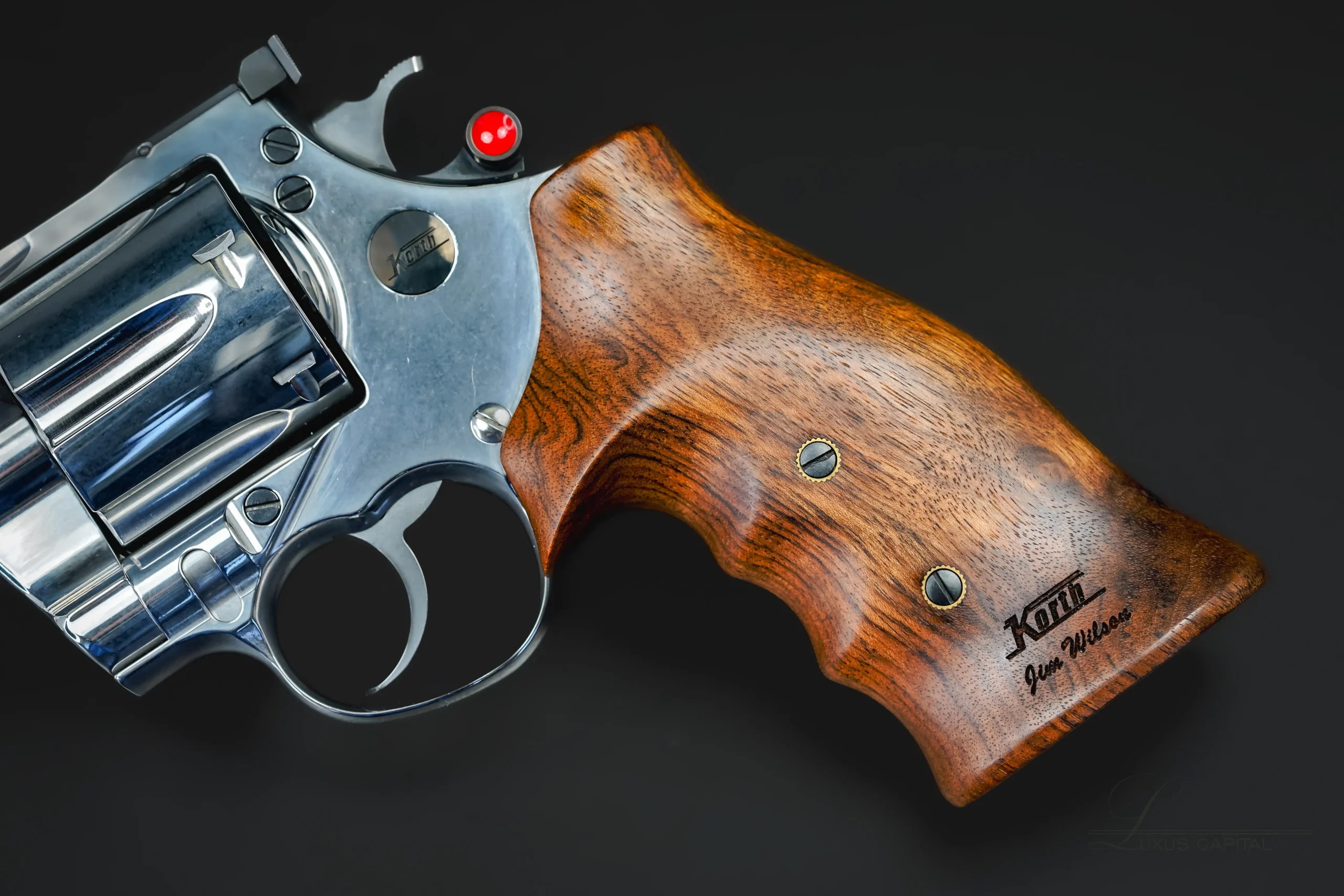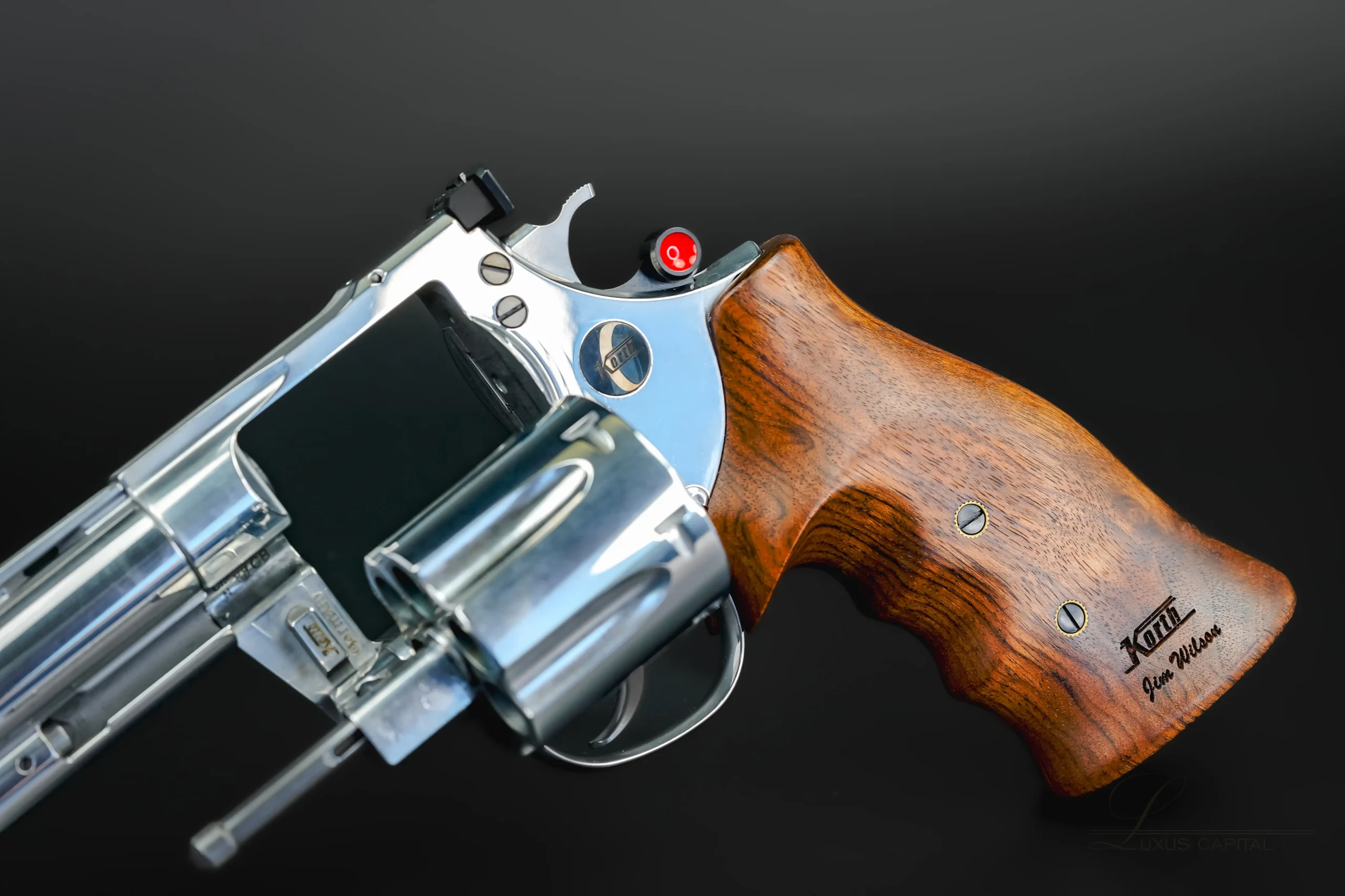The profile is defined by a full-length barrel rib and ventilated underlug, giving the revolver a balanced and distinctive look. Richly figured walnut grips add warmth and contrast to the polished steel, with ergonomic shaping, an inlaid Korth medallion, and factory grip inscription that complement the overall presentation.