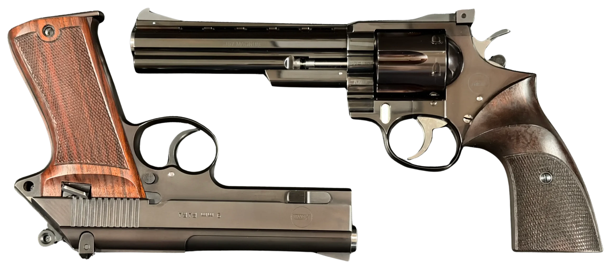 This matched pair brings together two distinct Korth designs in one coordinated set: a 9mm semi-automatic pistol and a .357 Magnum revolver. Built as a factory-matched ensemble, the pair reflects Korth’s characteristic attention to fit, finish, and visual harmony.