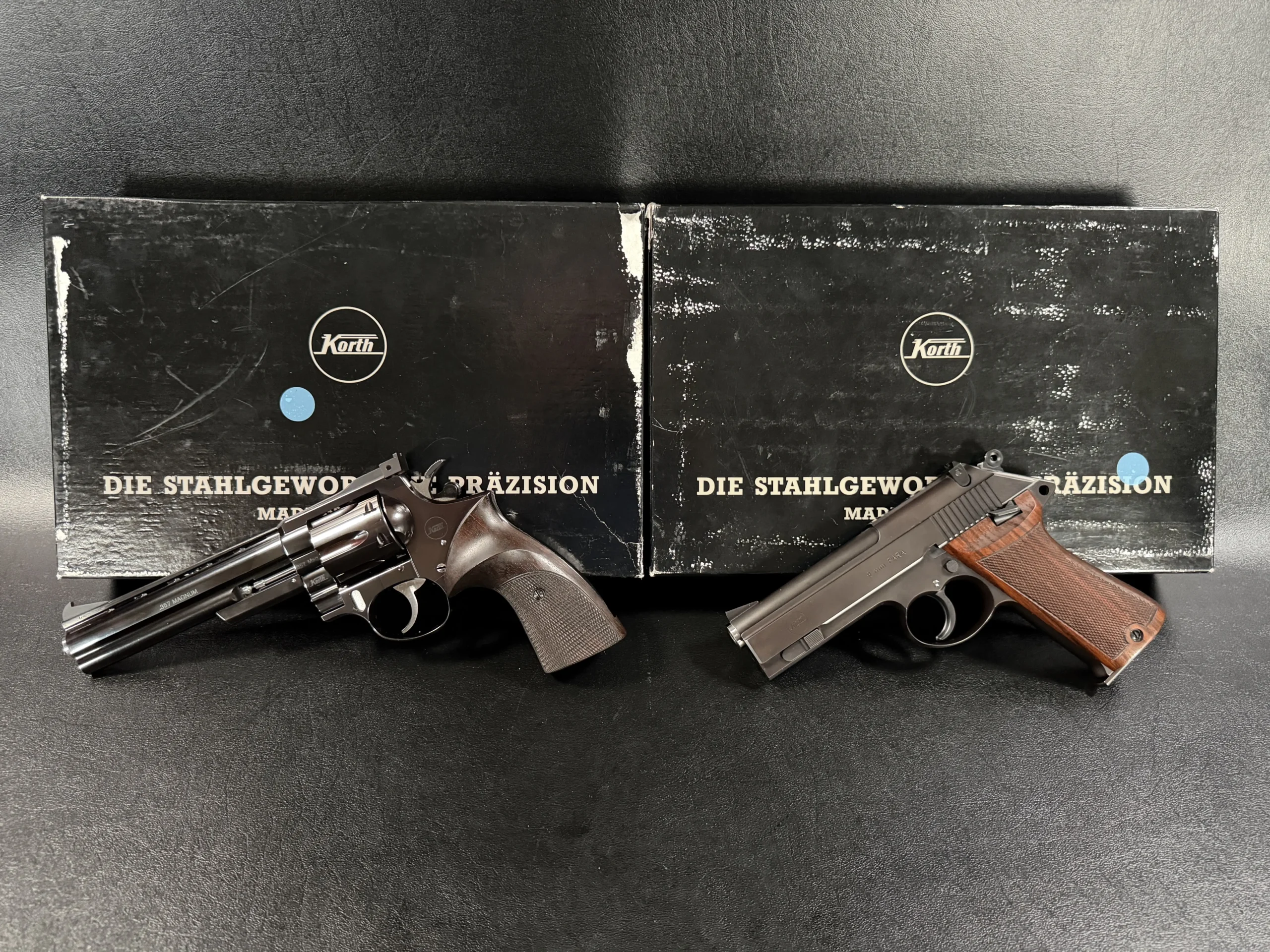 Together, the two firearms present a cohesive aesthetic, with the grips and finishes complementing one another in a way that underscores the intent behind the set. Also included are the original period Korth boxes, completing the presentation.