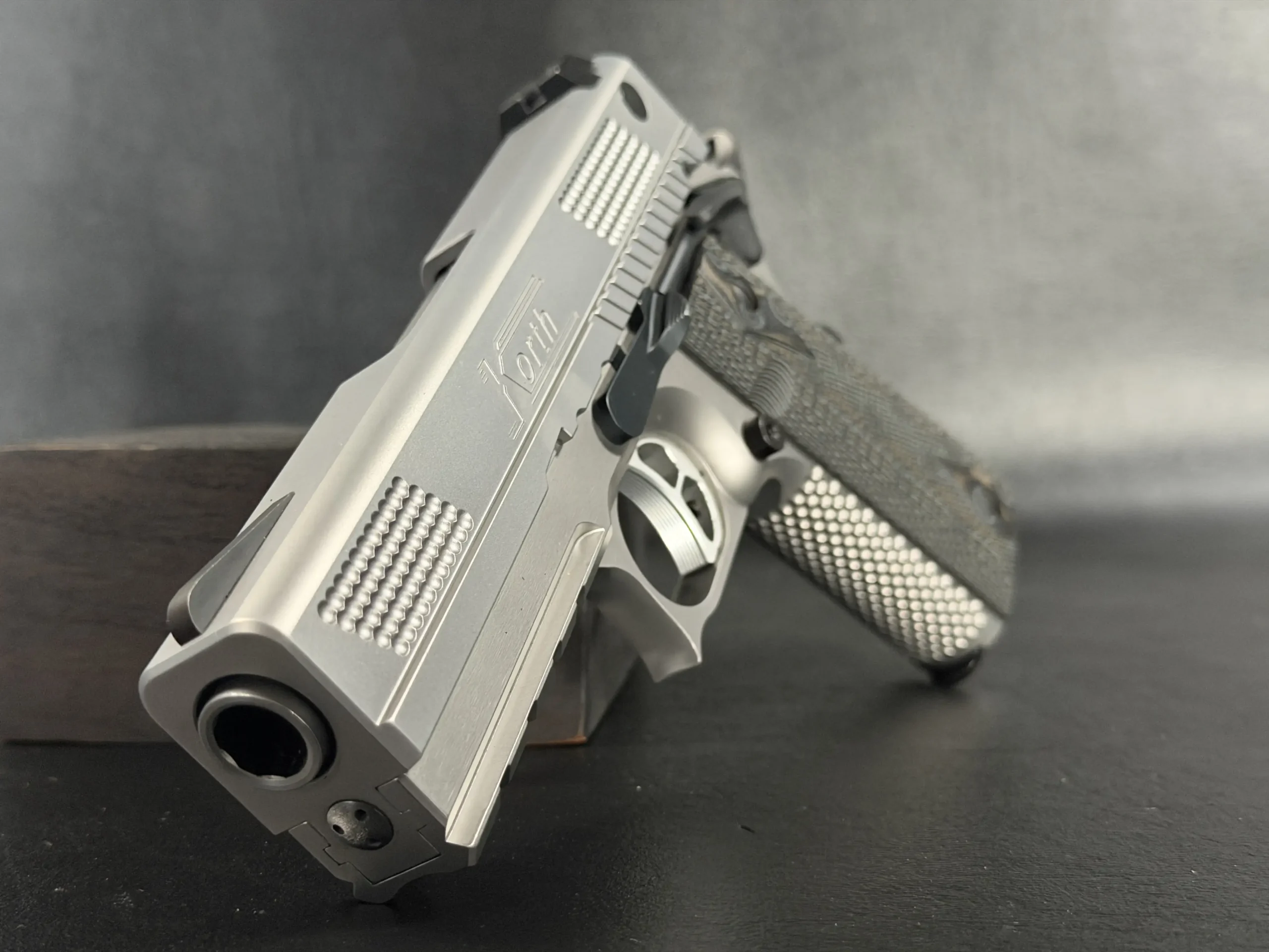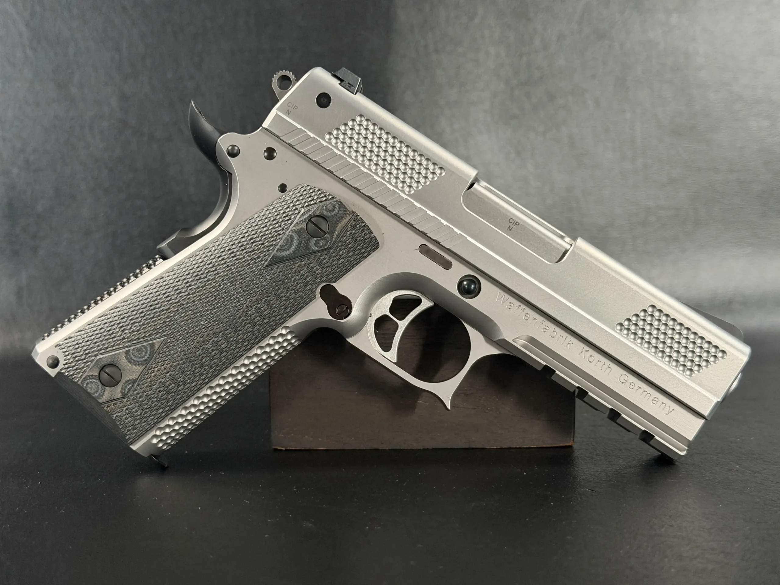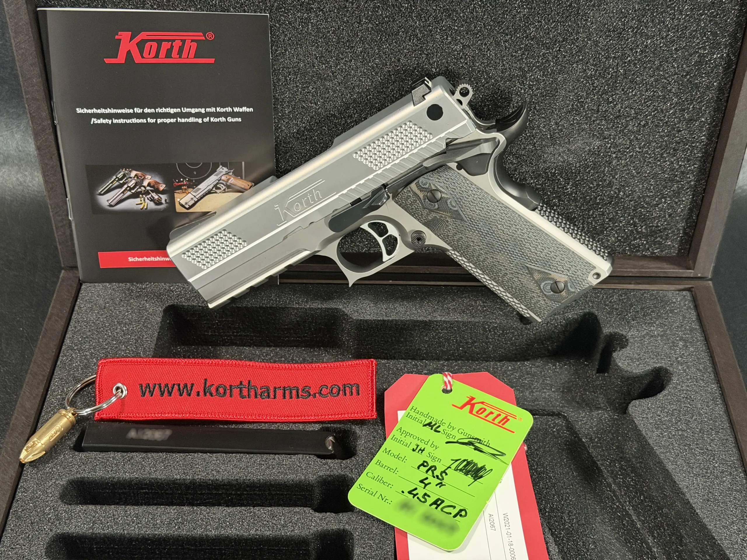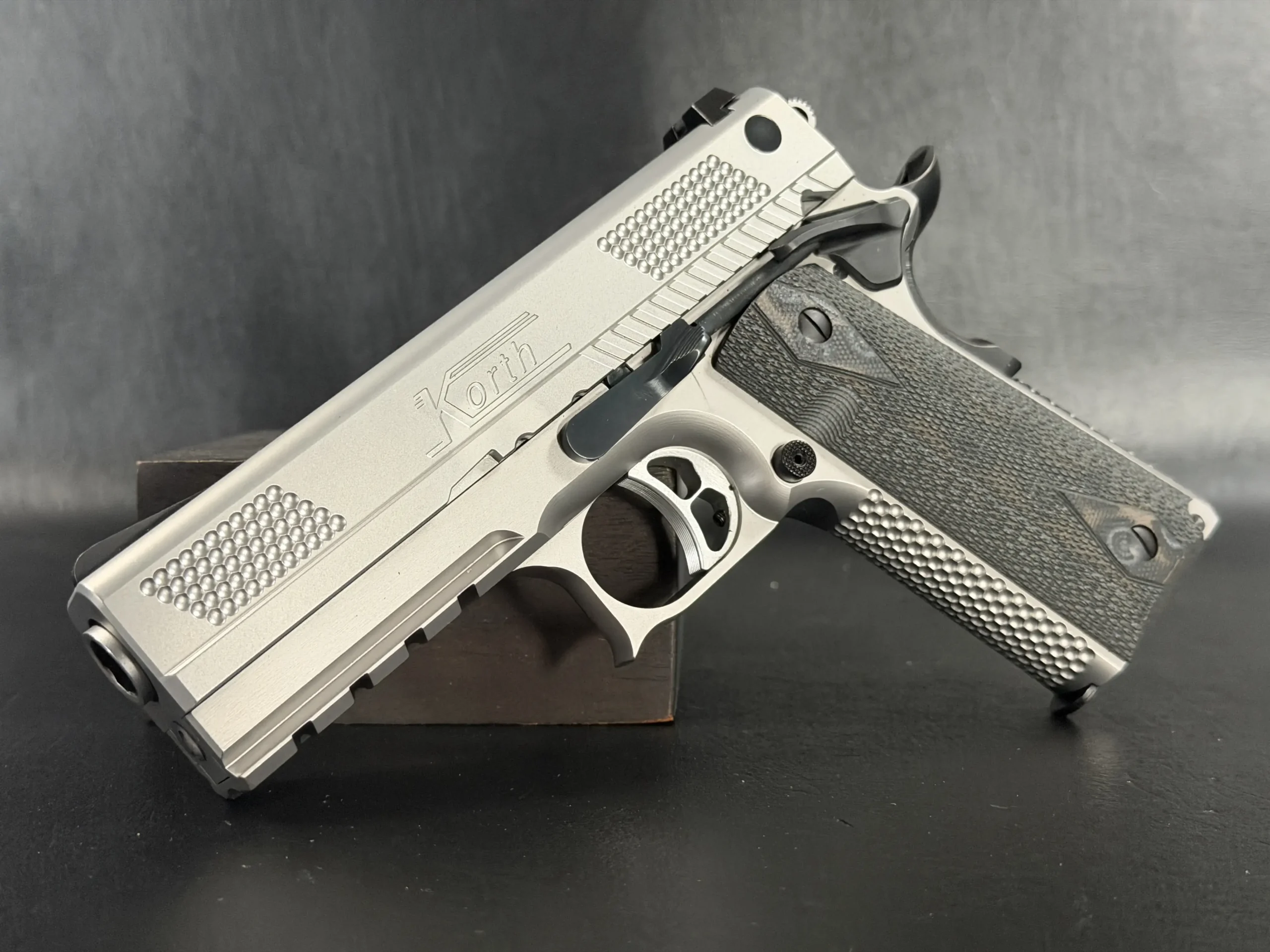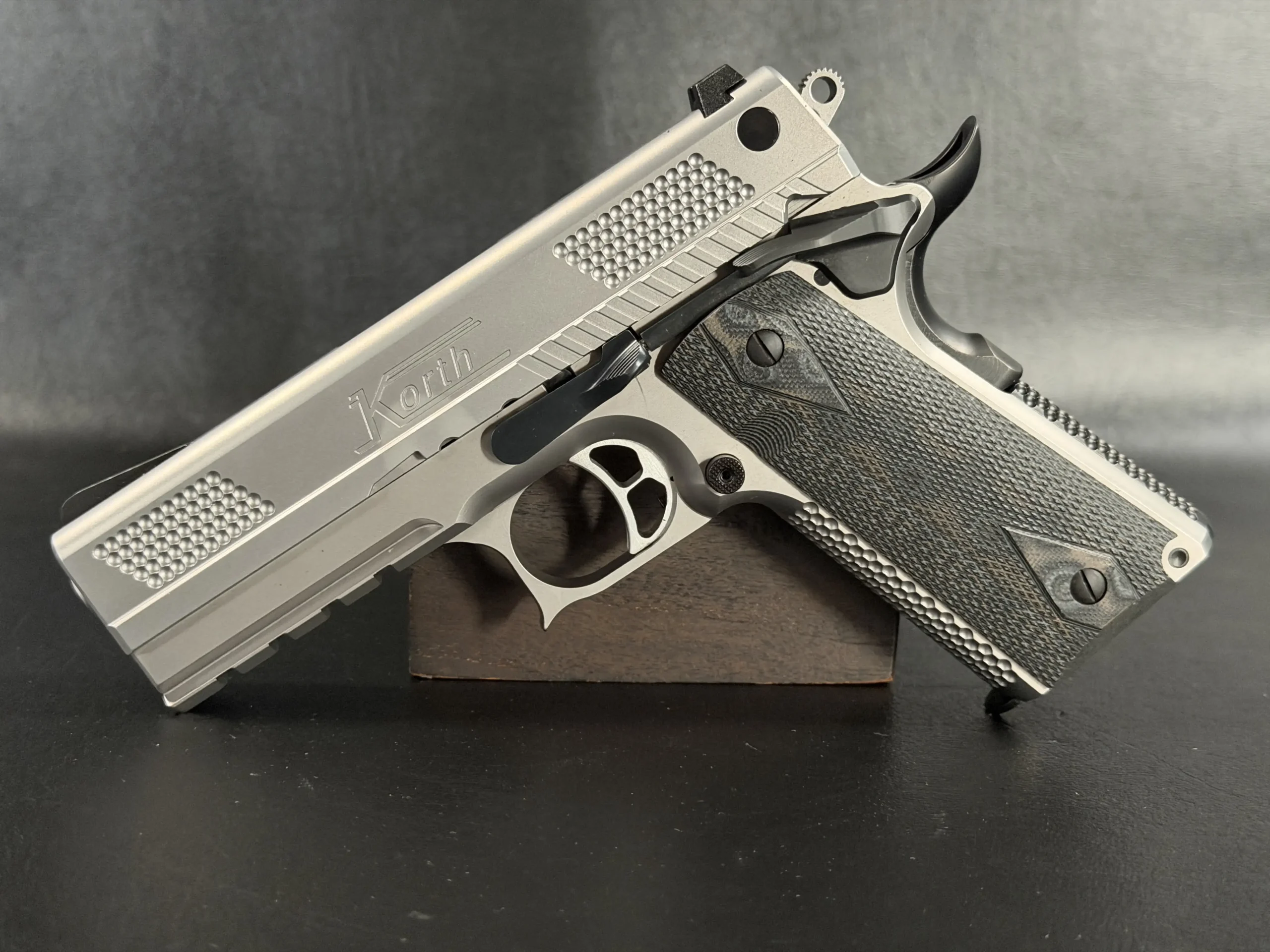 The Korth PRS-4 is a 4-inch 1911-pattern pistol chambered in .45 ACP, bringing together refined machining, thoughtful ergonomics, and a distinctly modern presentation. Its satin stainless finish gives the pistol a soft, understated sheen that complements the crisp lines and precision-focused design.