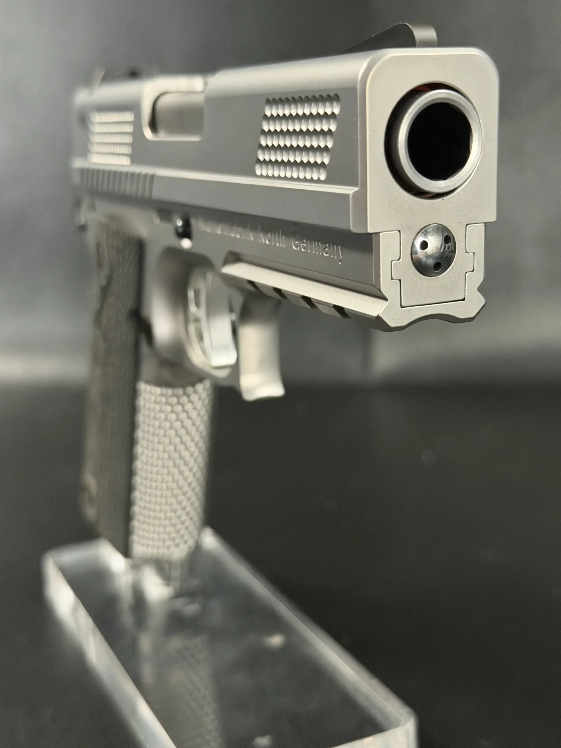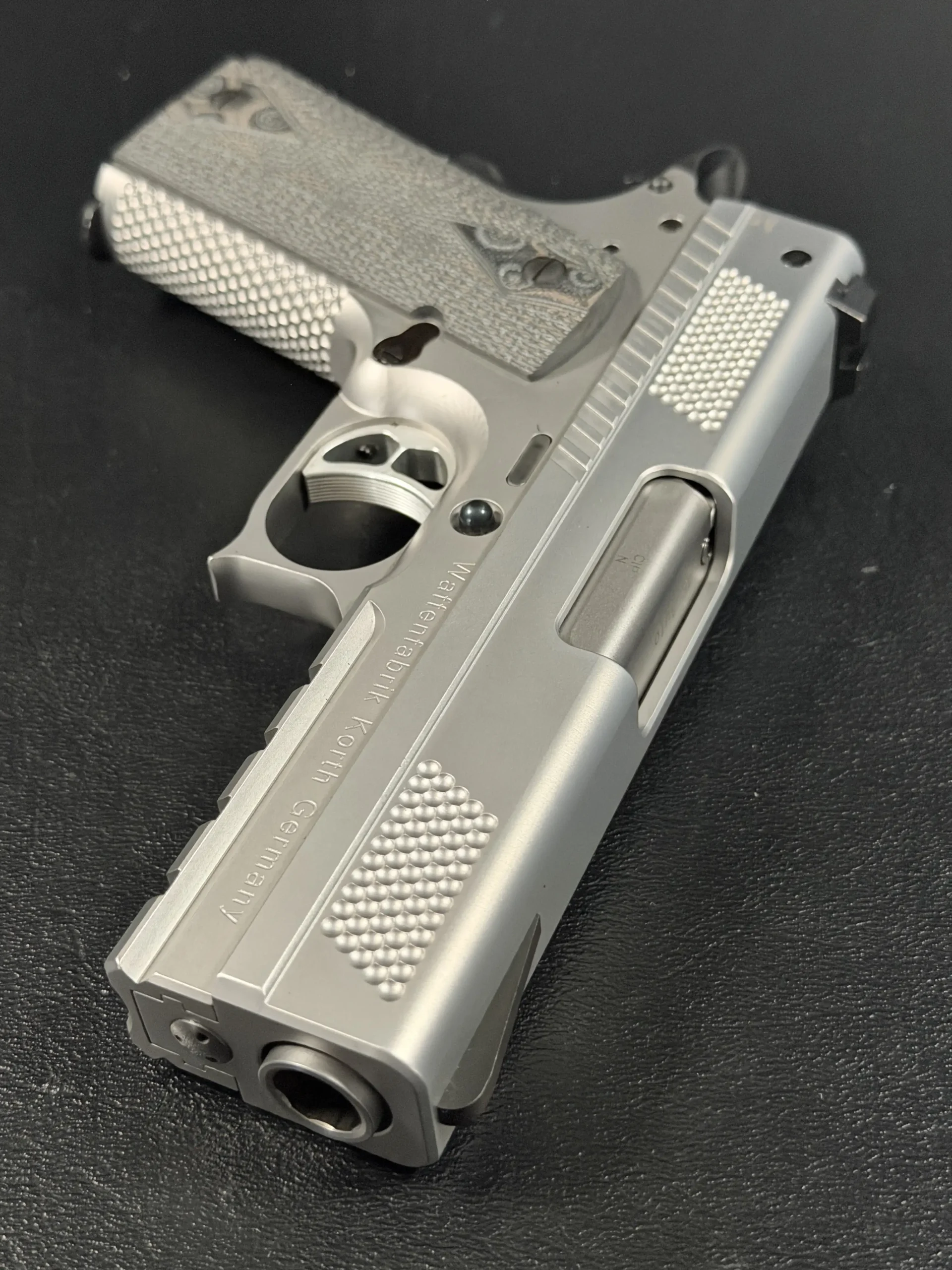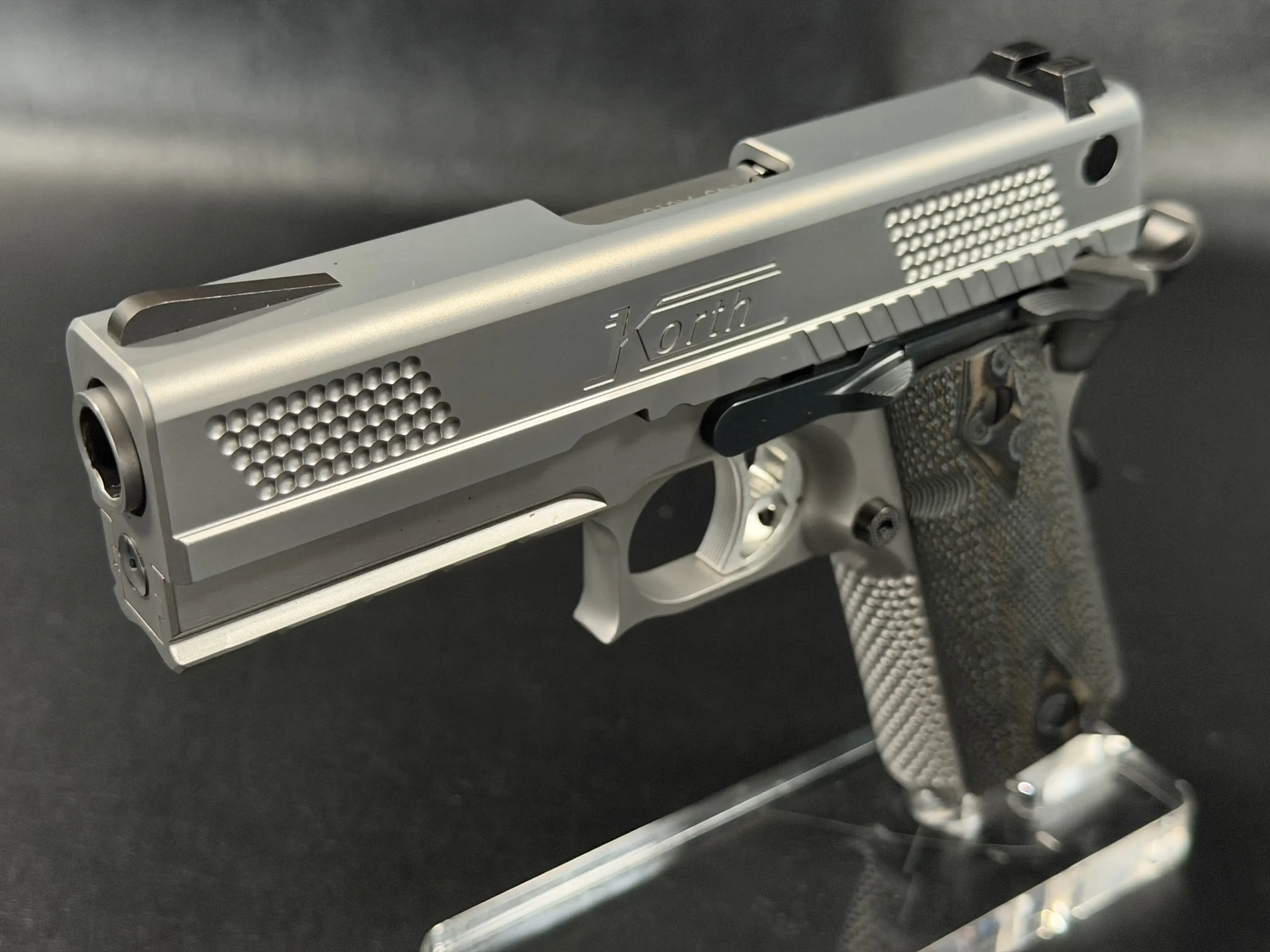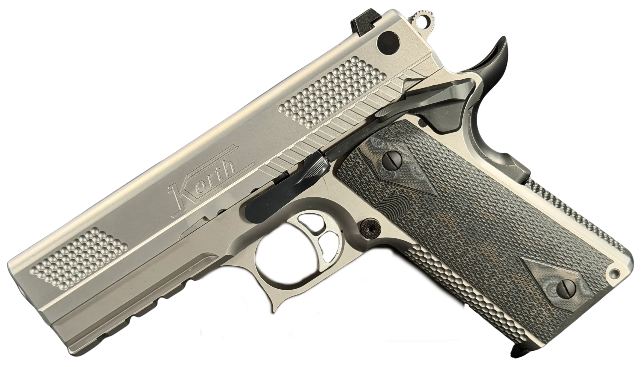 The Korth PRS-4 is a 4-inch 1911-pattern pistol chambered in .45 ACP, bringing together refined machining, thoughtful ergonomics, and a distinctly modern presentation. Its satin stainless finish gives the pistol a soft, understated sheen that complements the crisp lines and precision-focused design.