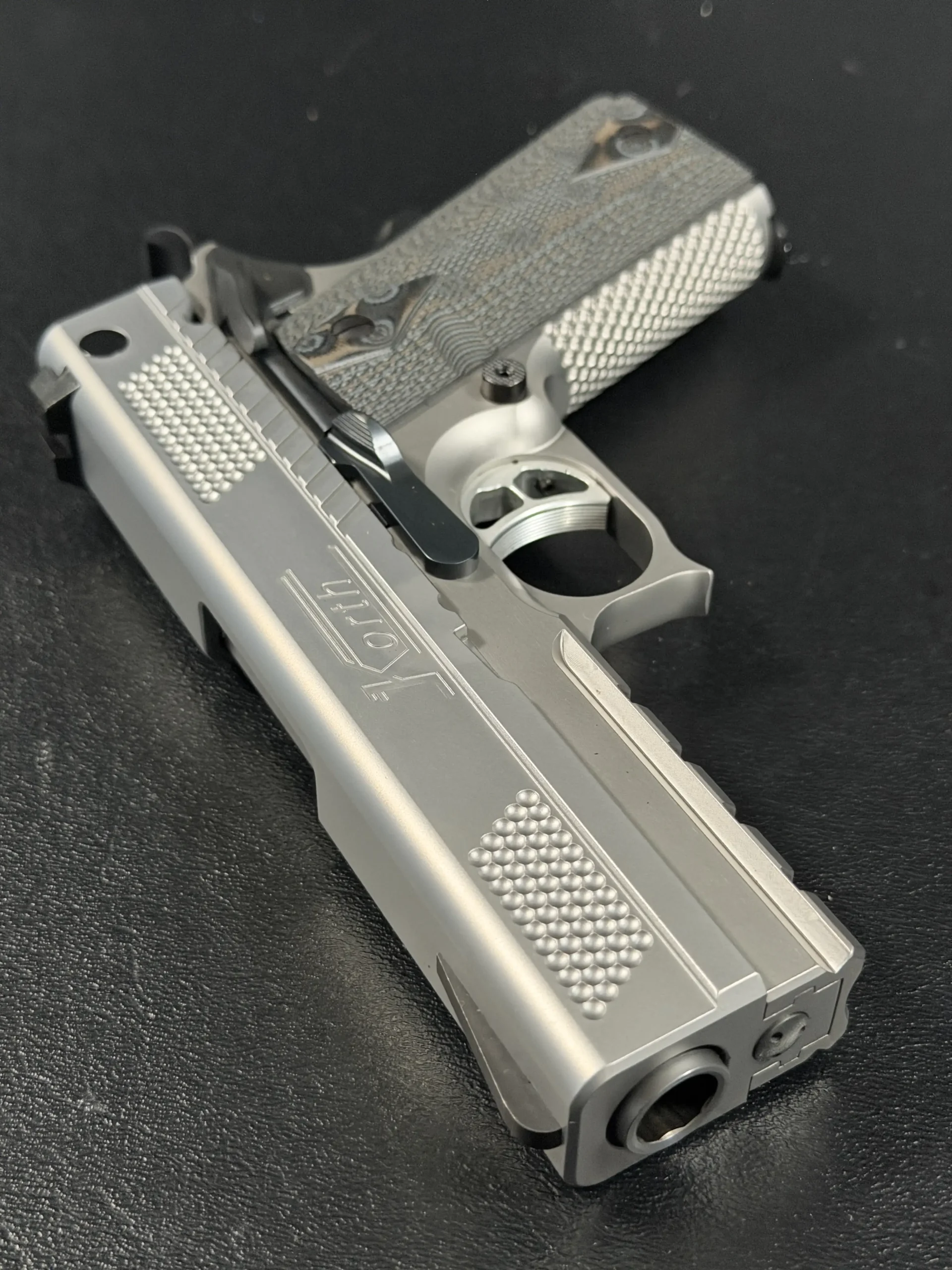 The extended beavertail, skeletonized hammer, and match trigger system underscore the pistol’s competition-oriented design. Textured grip panels are paired with a checkered frontstrap and mainspring housing to support a secure, consistent hold.