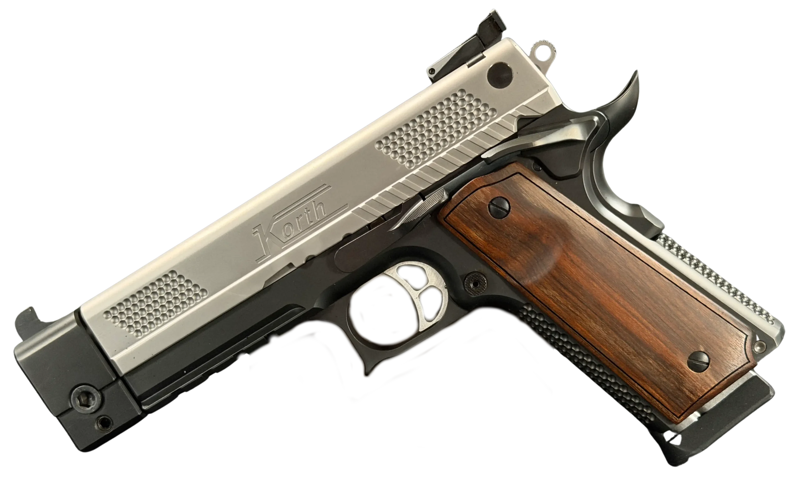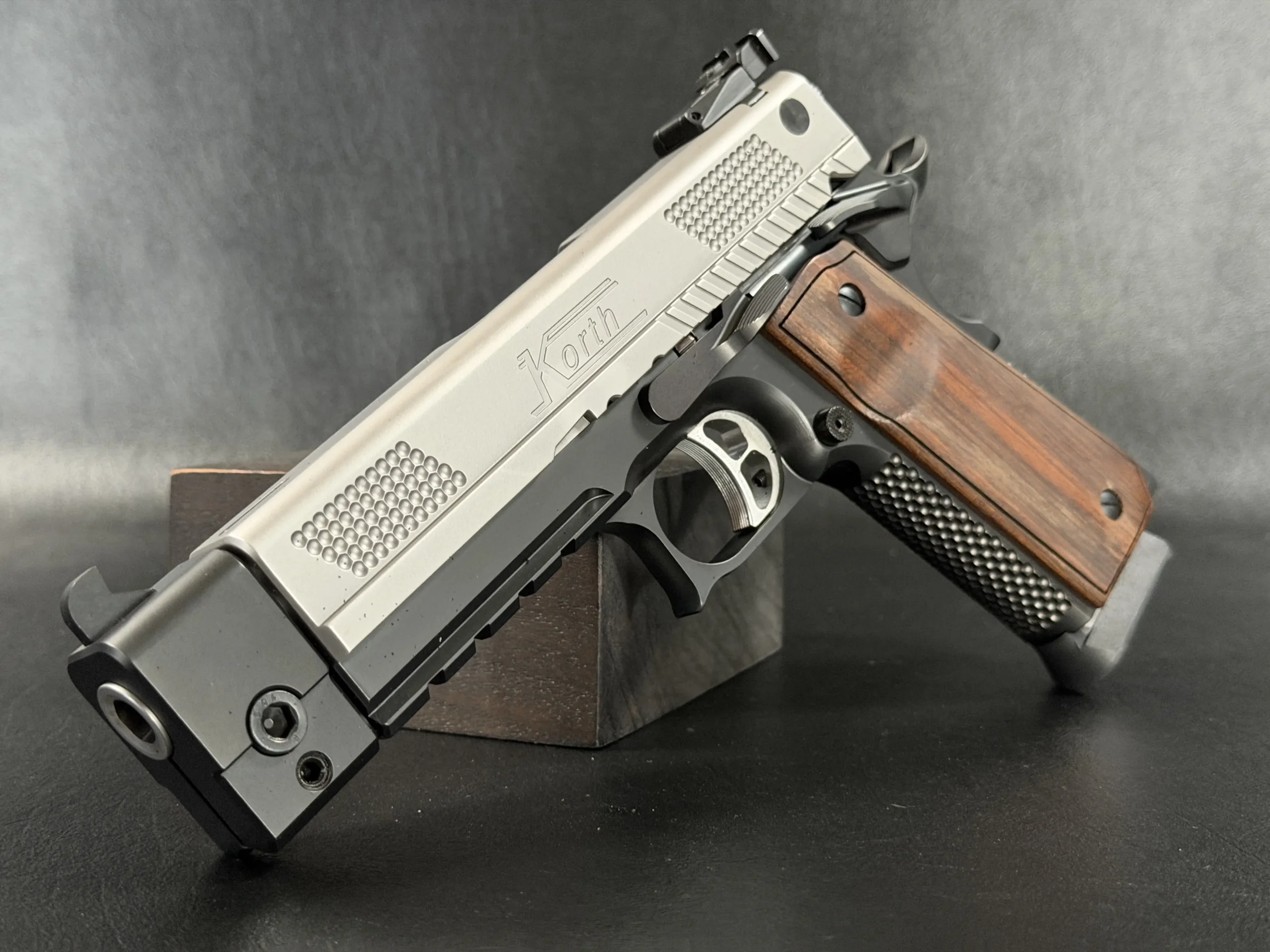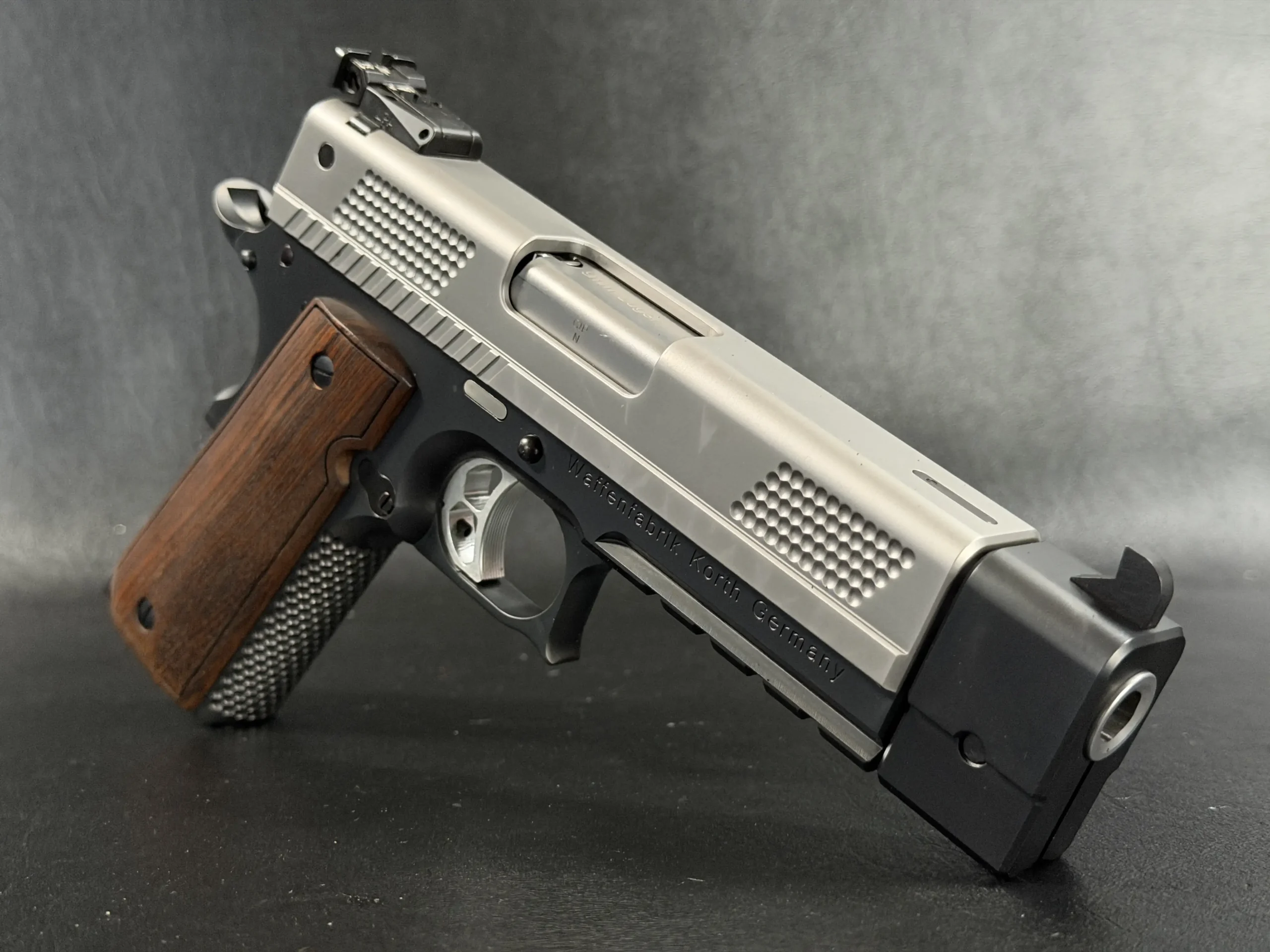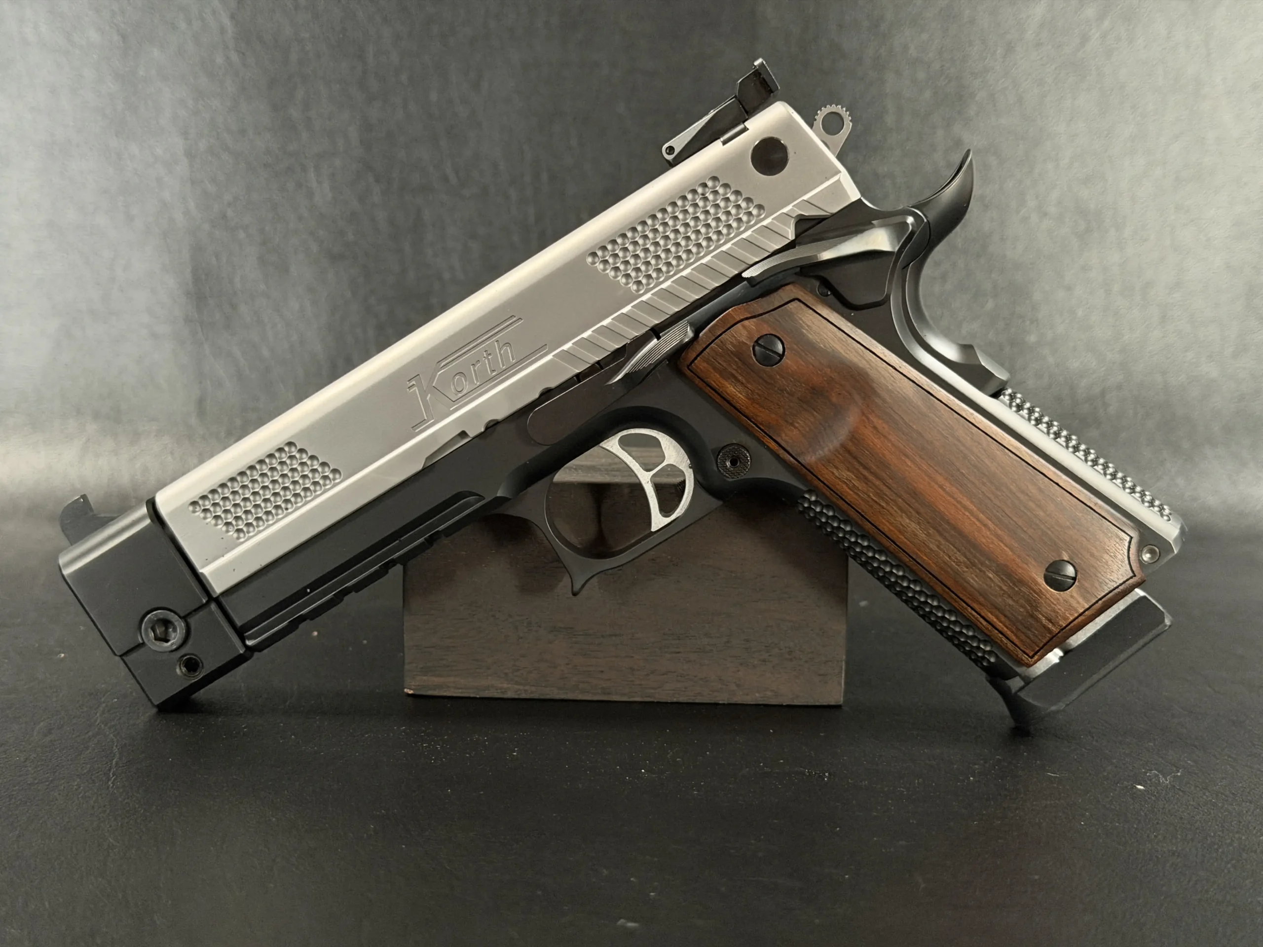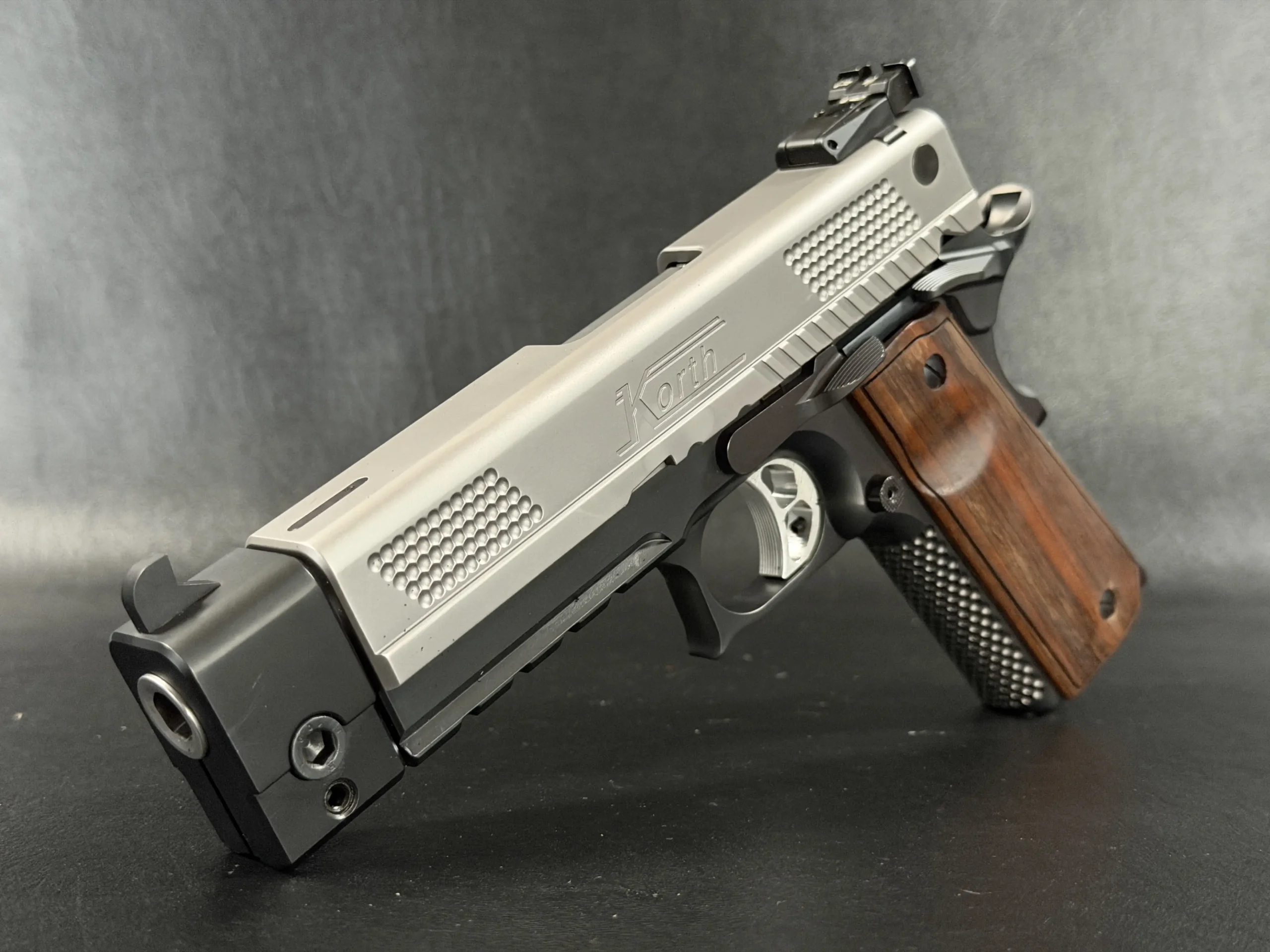 This example highlights the precise machining and refined finishing associated with Korth. A satin-finished slide contrasts with the darker frame, while the dimpled slide flats add a distinctive visual element. The overall design is clean, deliberate, and cohesive throughout.