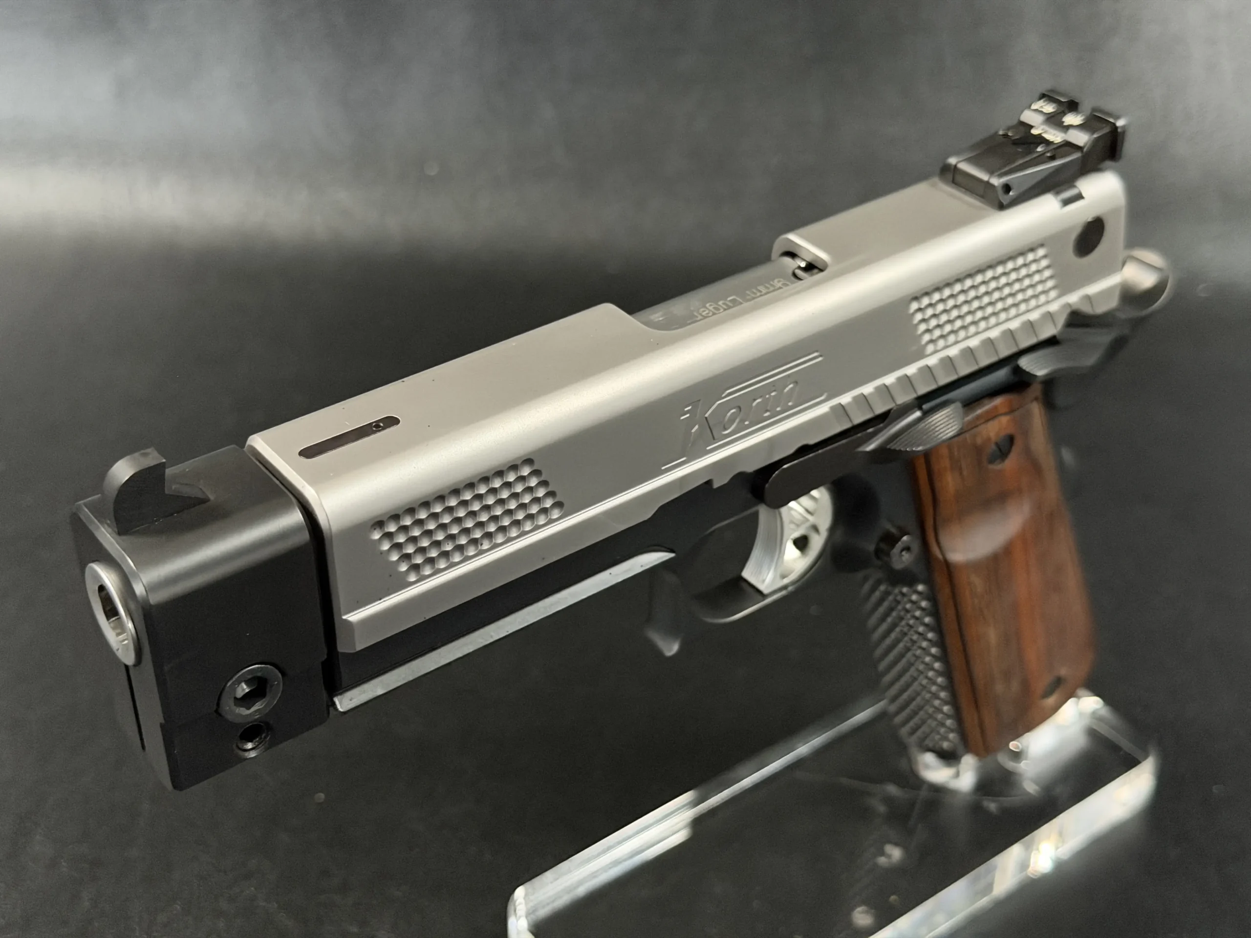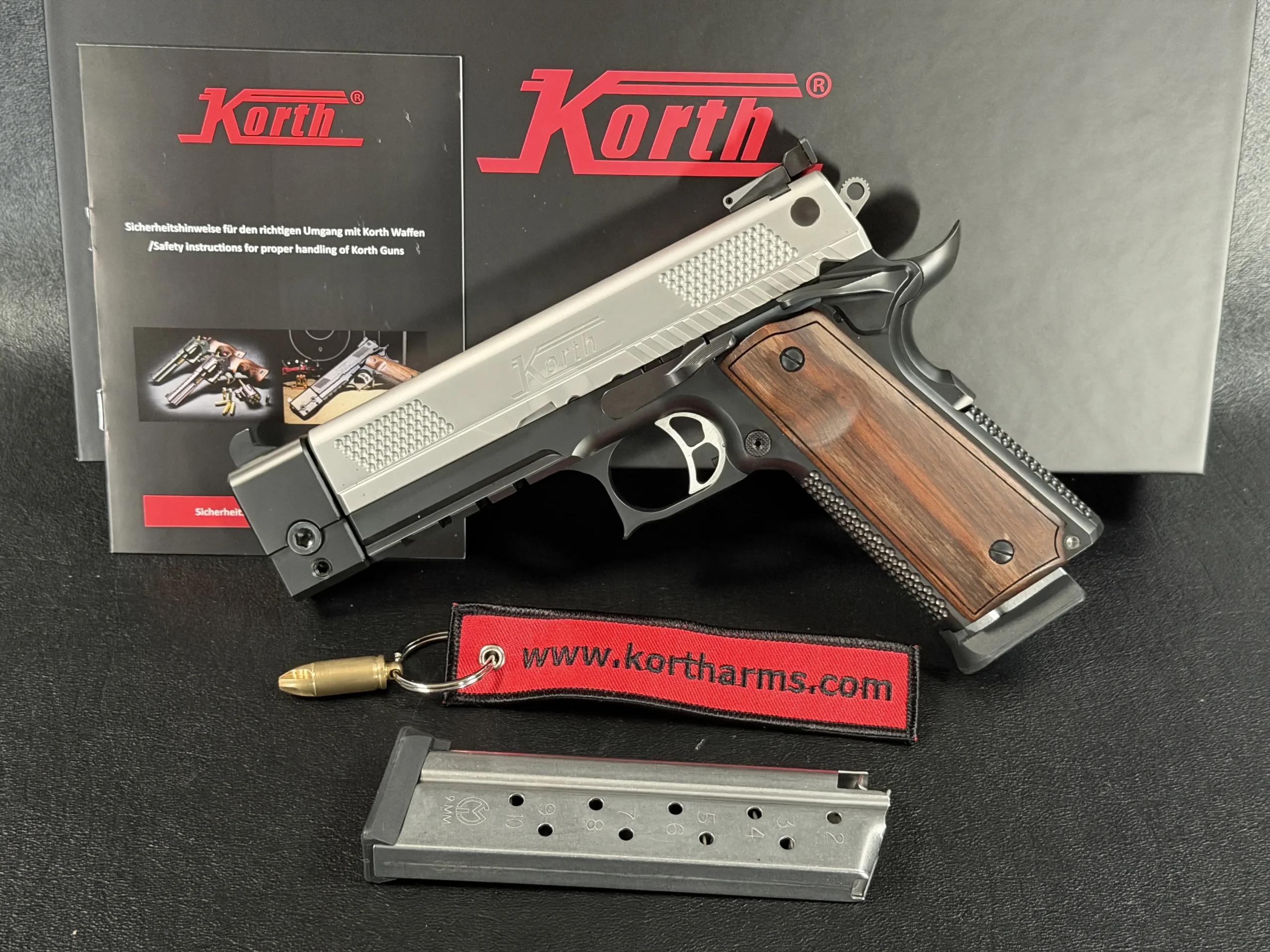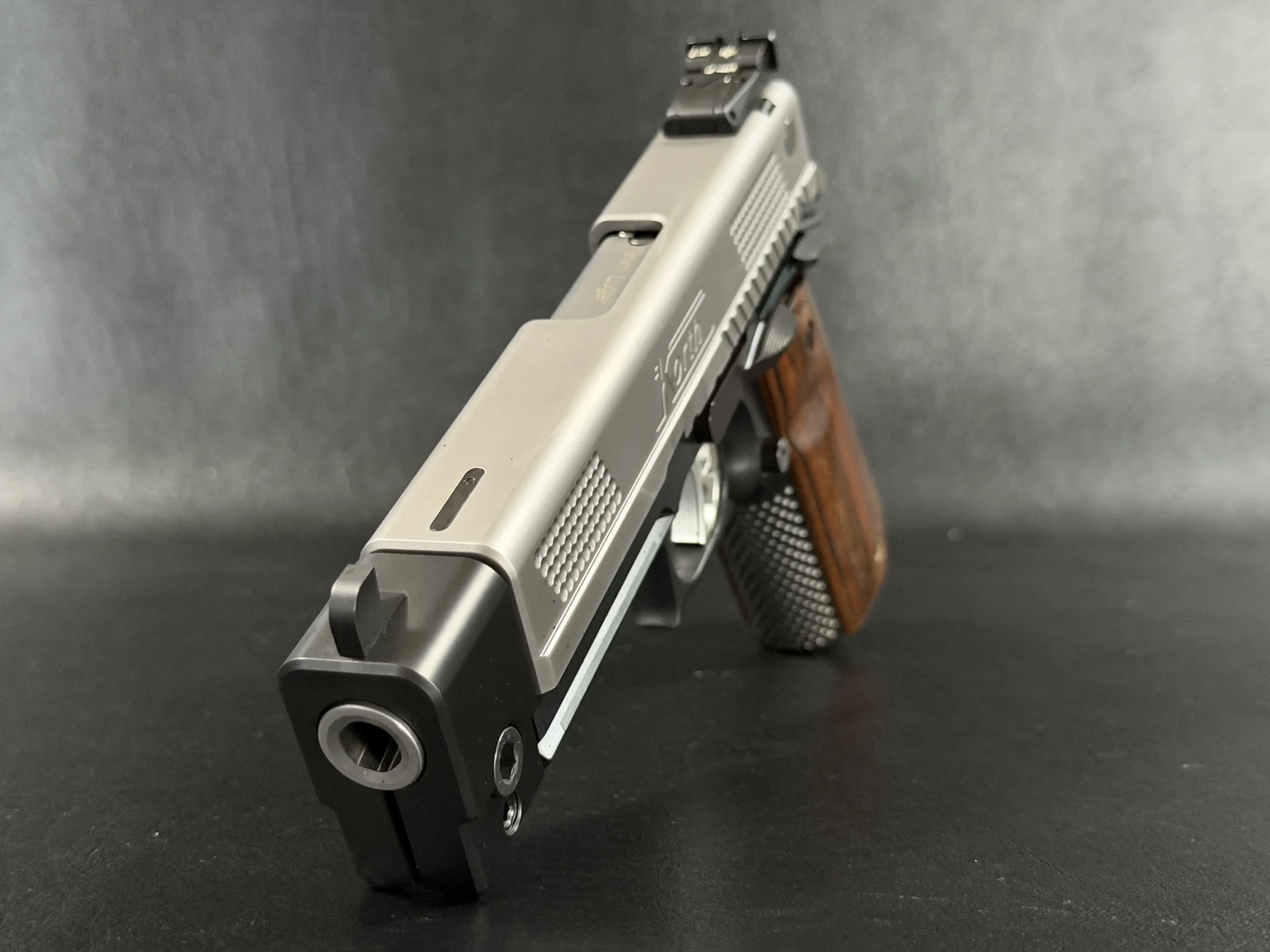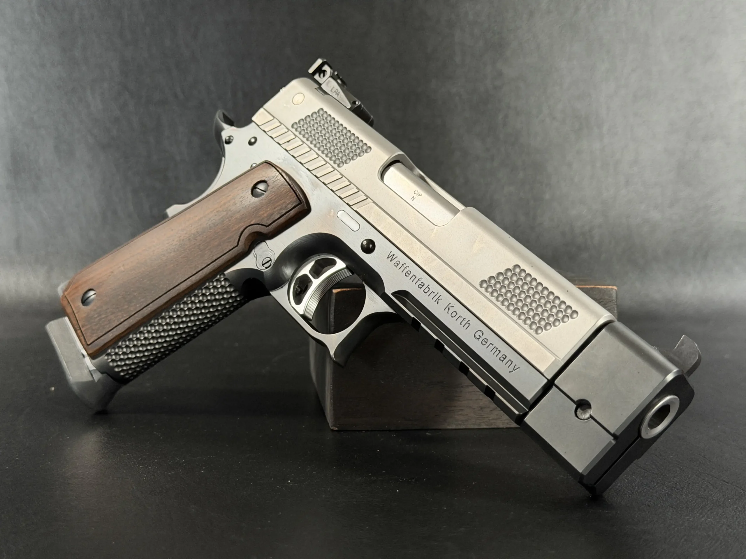 This example highlights the precise machining and refined finishing associated with Korth. A satin-finished slide contrasts with the darker frame, while the dimpled slide flats add a distinctive visual element. The overall design is clean, deliberate, and cohesive throughout.