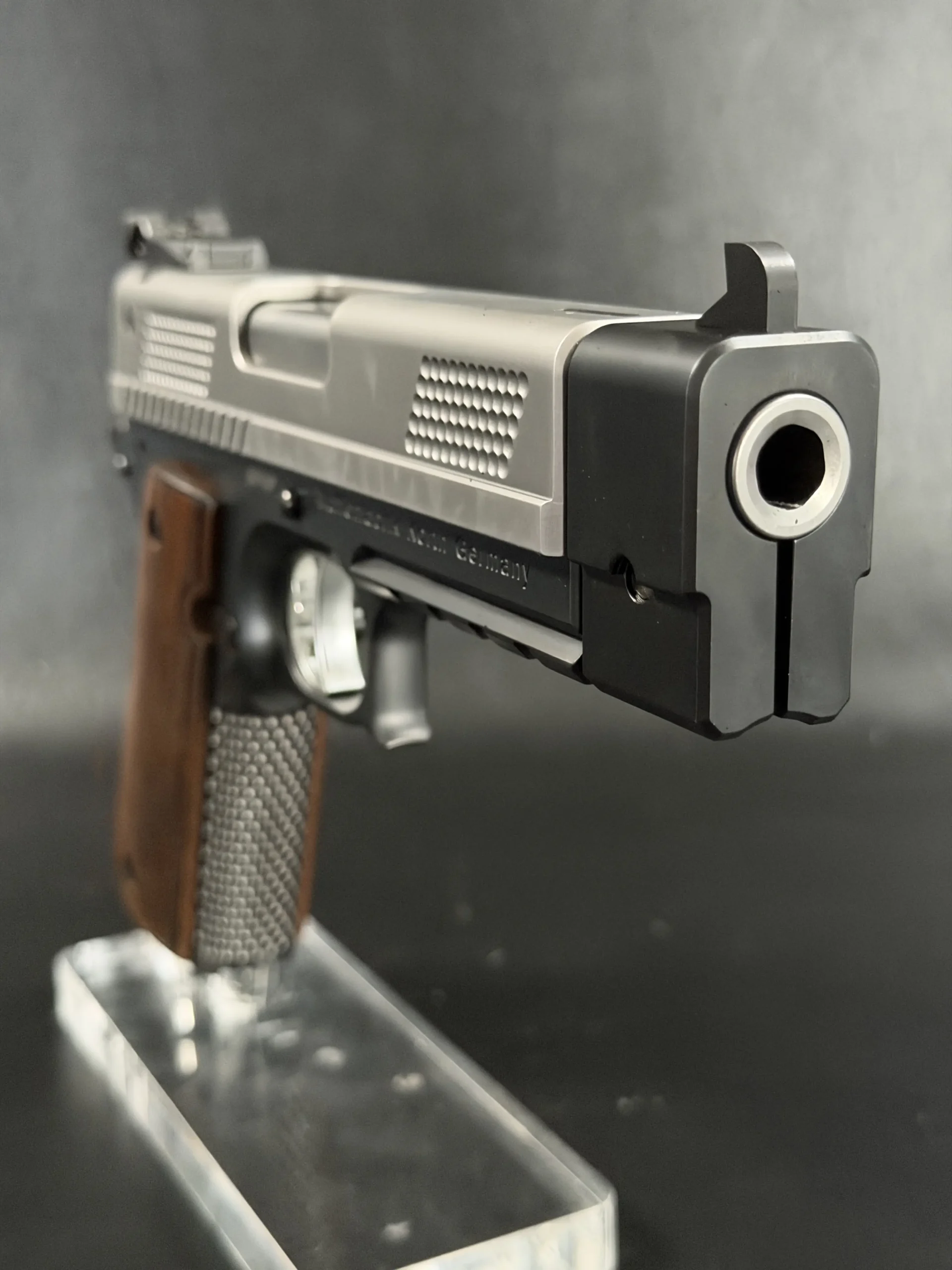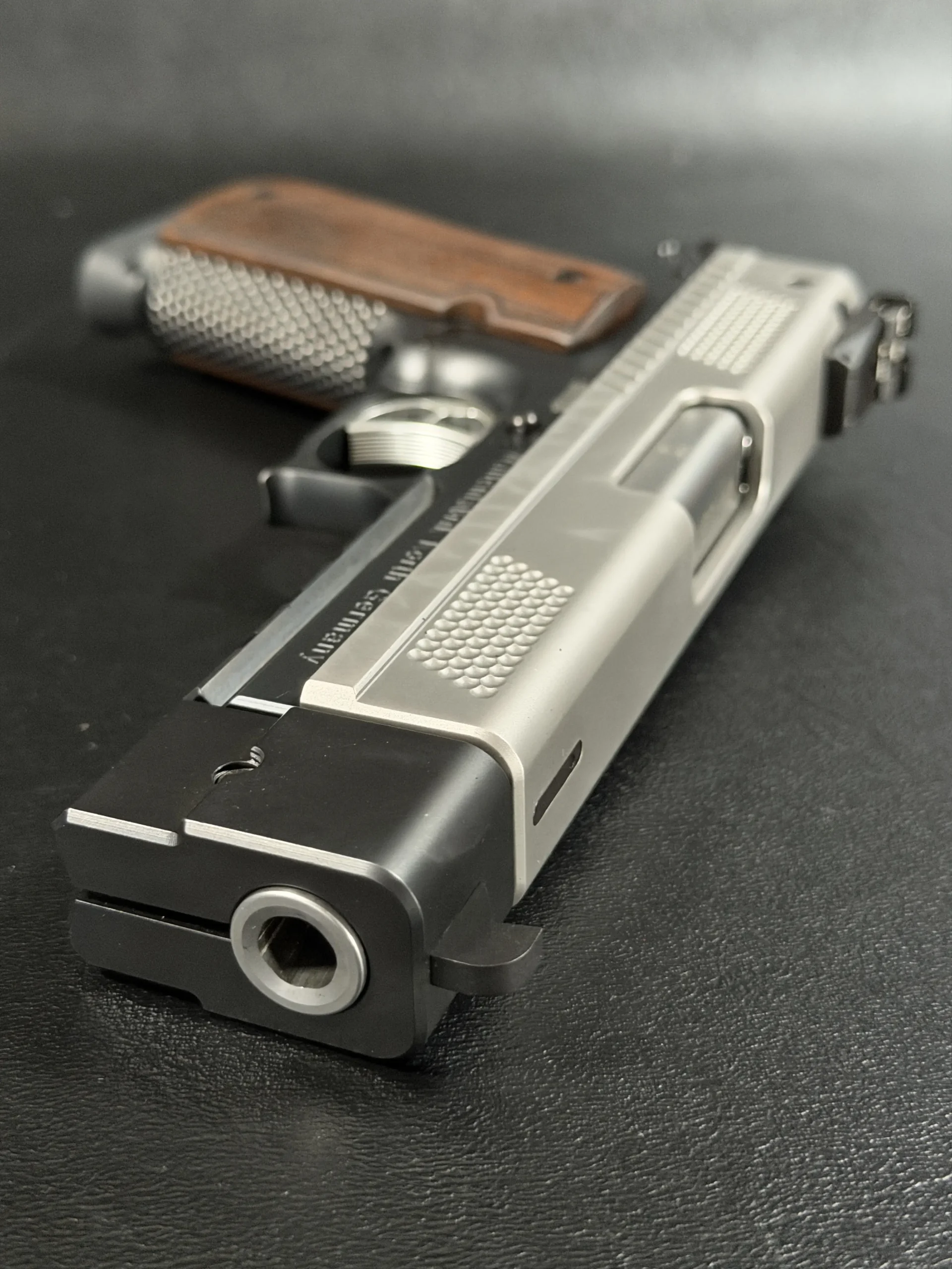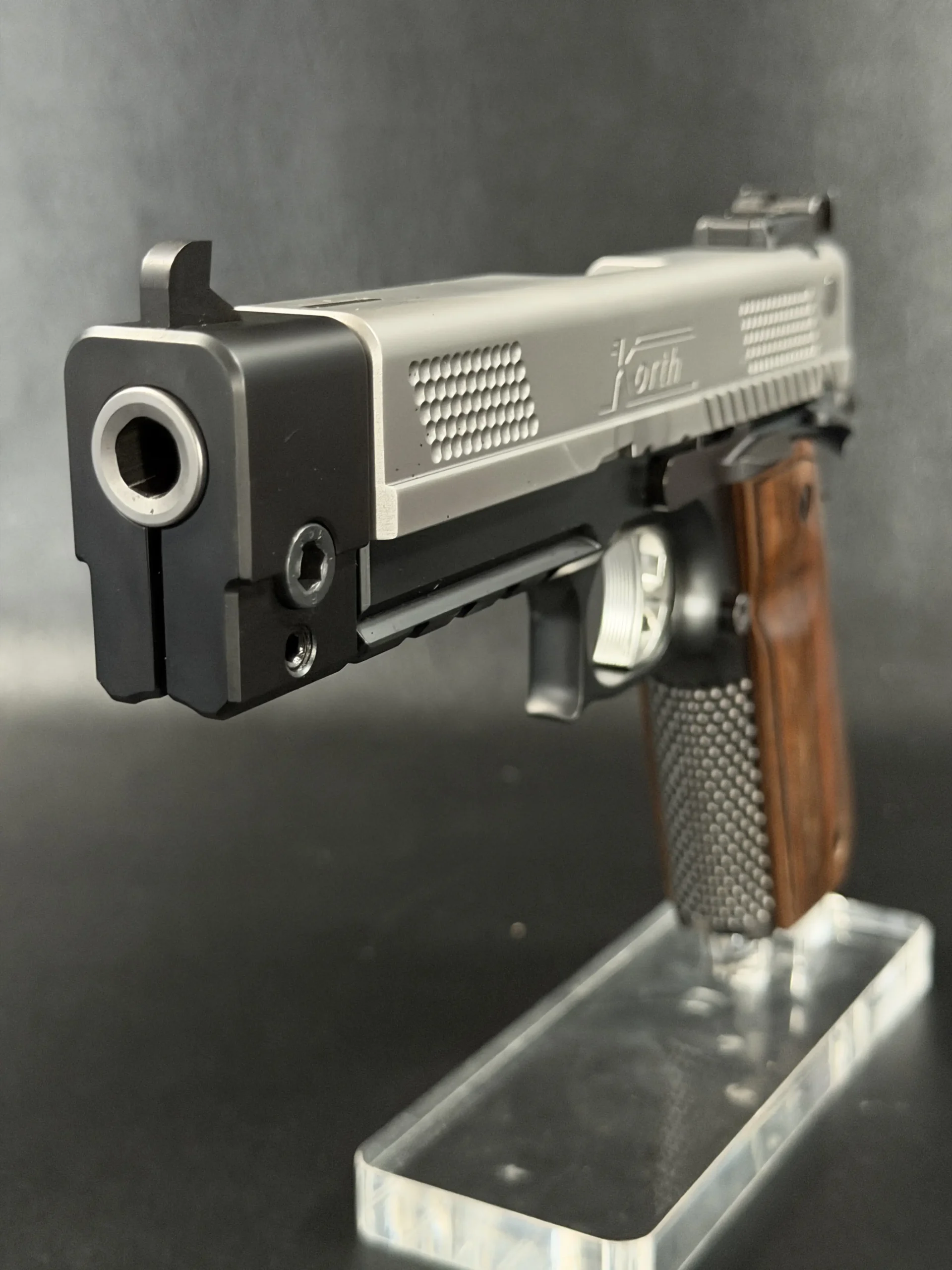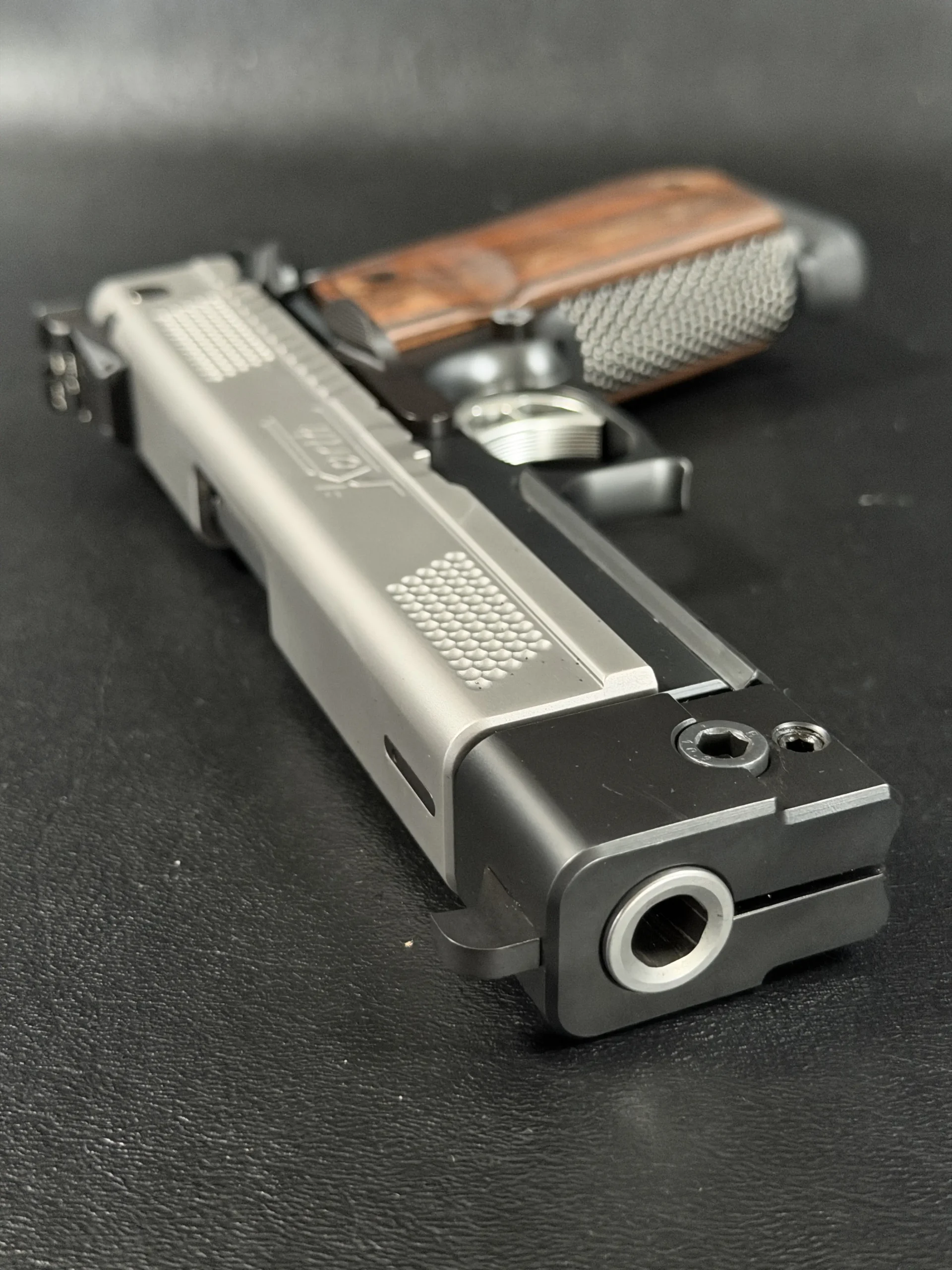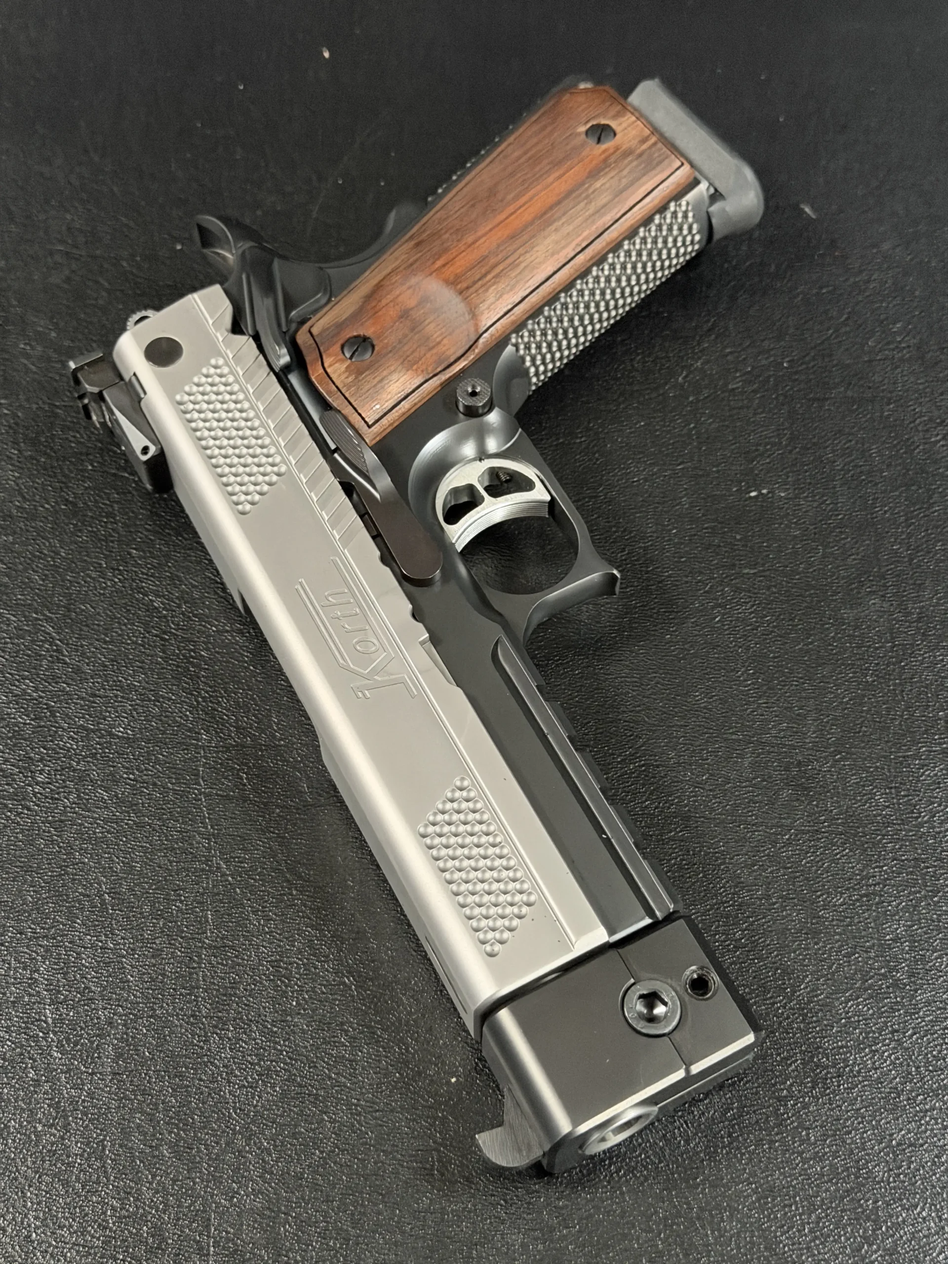 This example highlights the precise machining and refined finishing associated with Korth. A satin-finished slide contrasts with the darker frame, while the dimpled slide flats add a distinctive visual element. The overall design is clean, deliberate, and cohesive throughout.