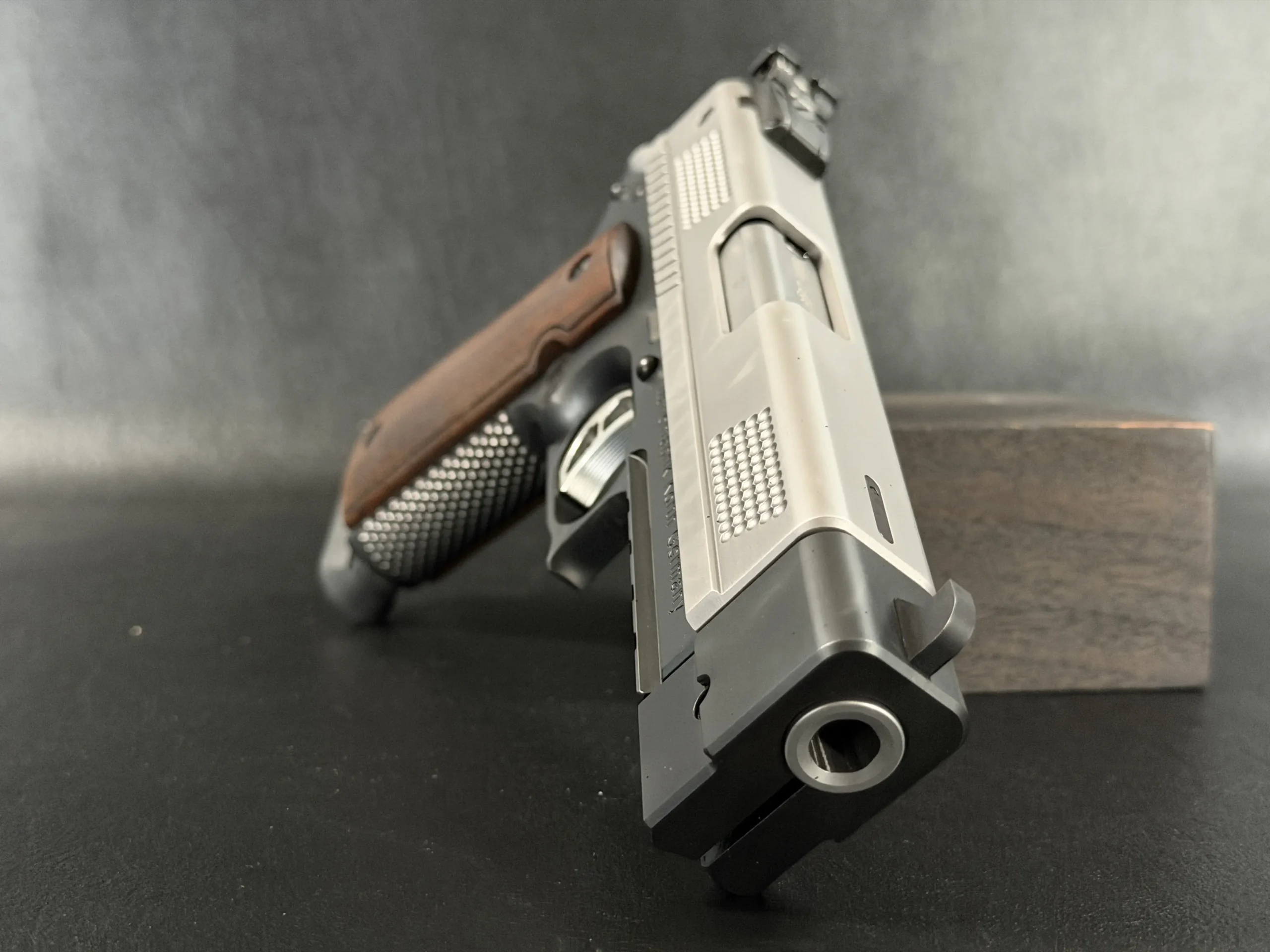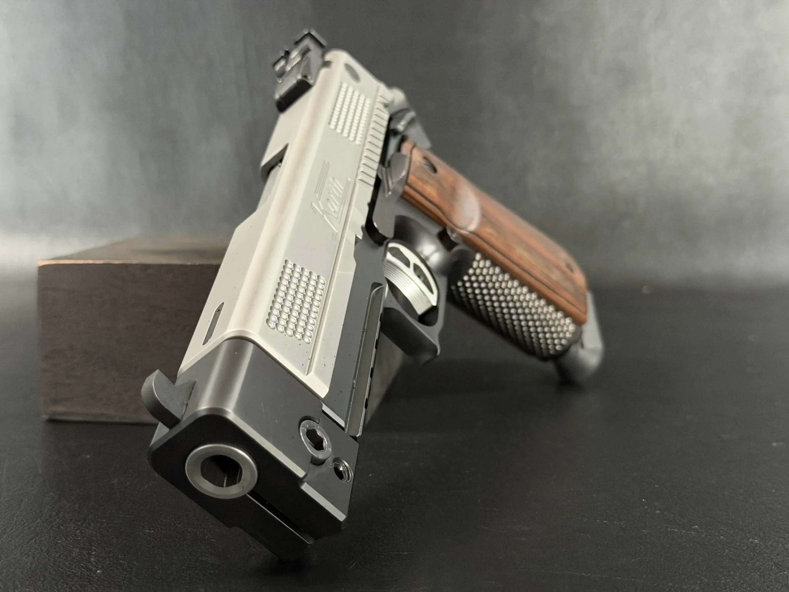 Classic PRS ergonomics include a deeply contoured frame, extended beavertail, skeletonized trigger, and finely checkered grip surfaces. Wooden grip panels add warmth and contrast to the pistol’s overall appearance.