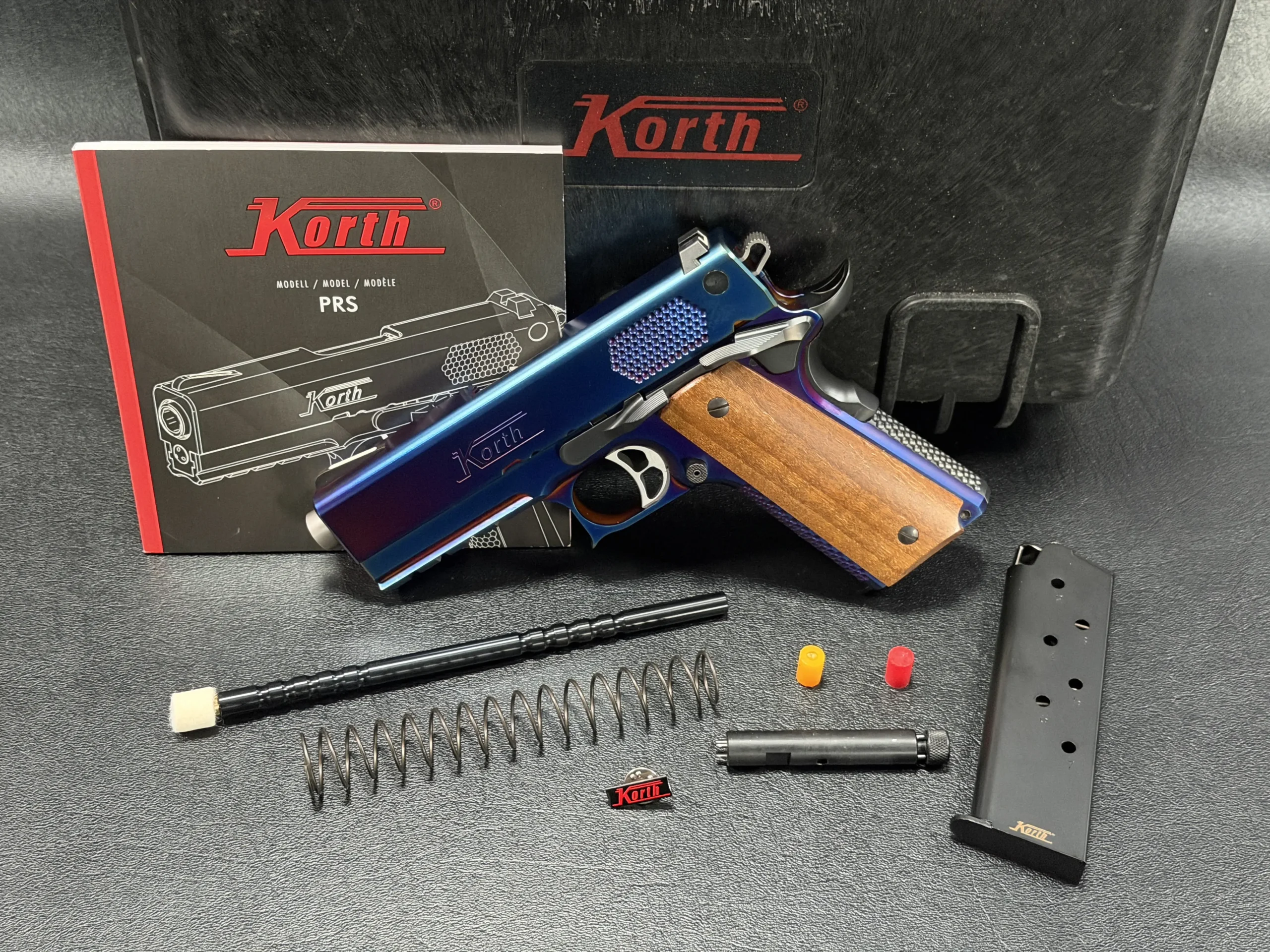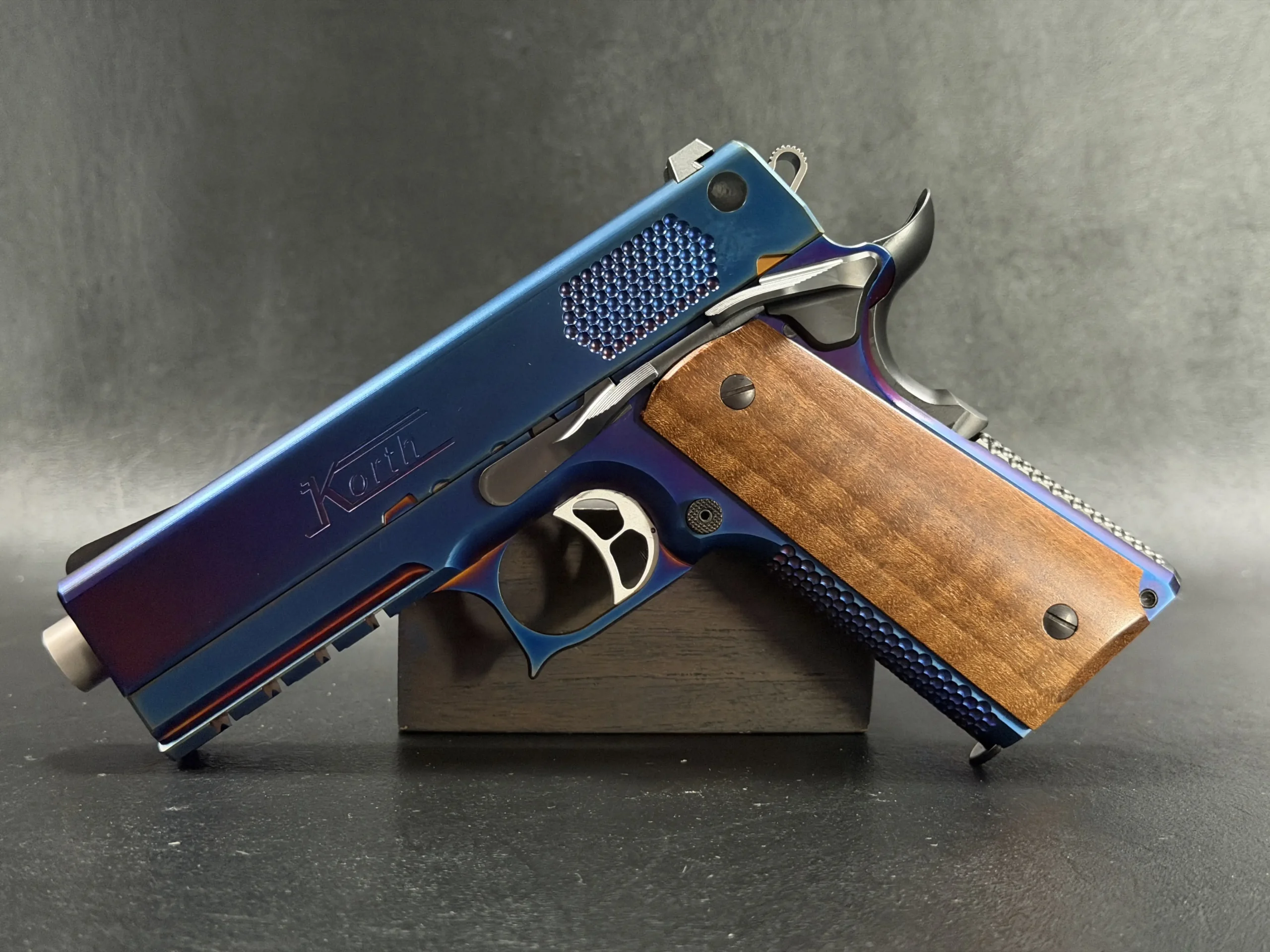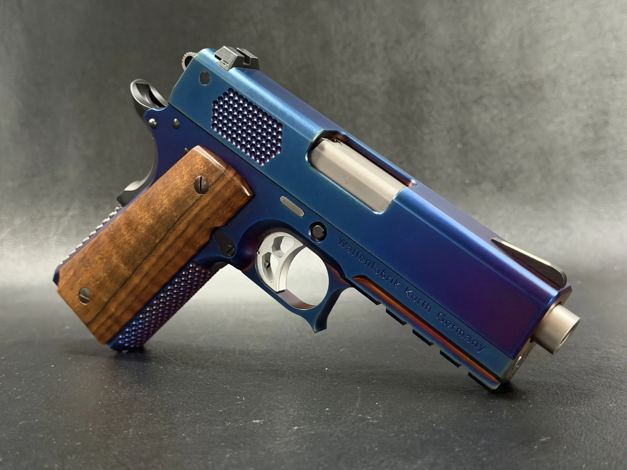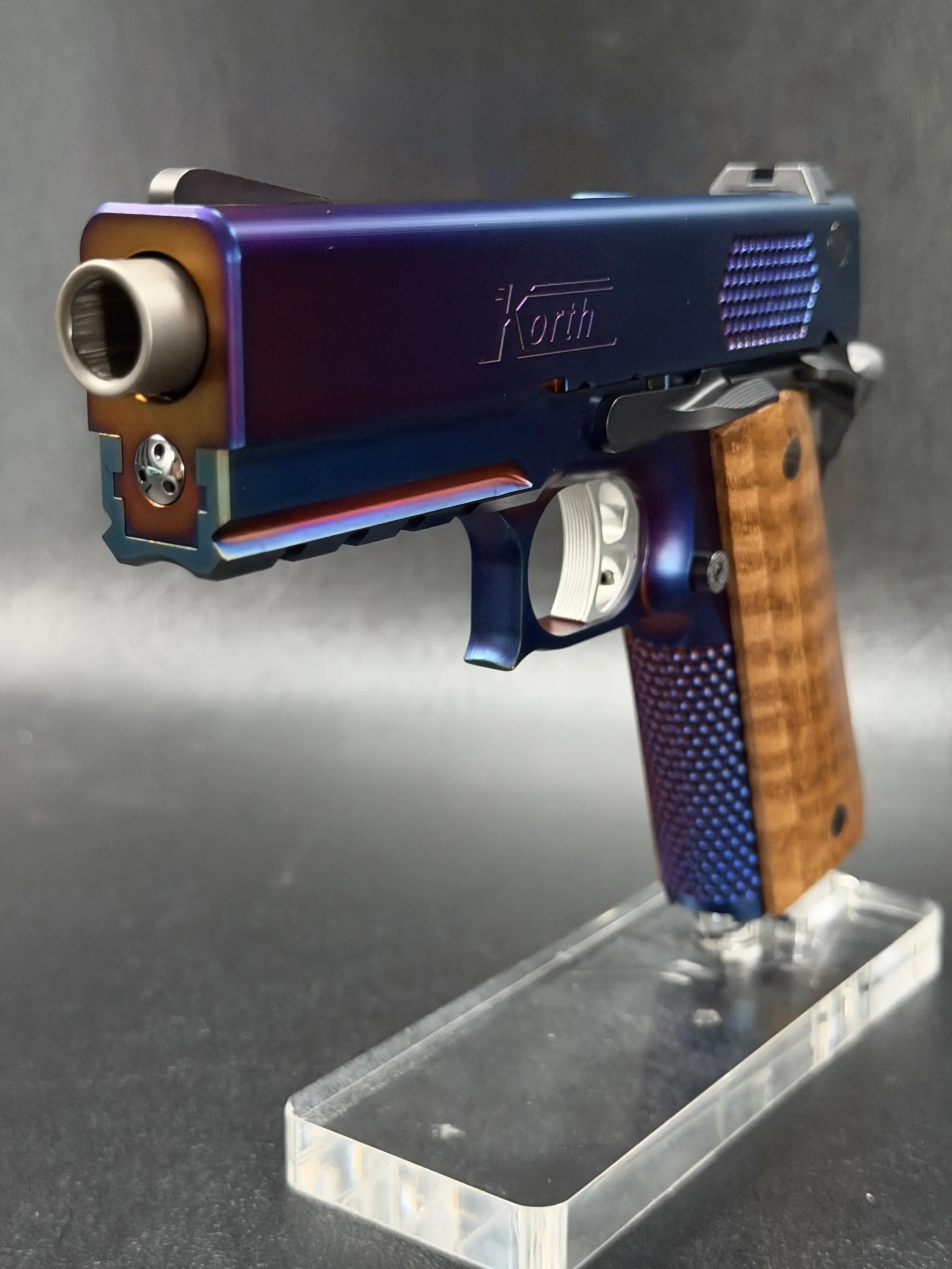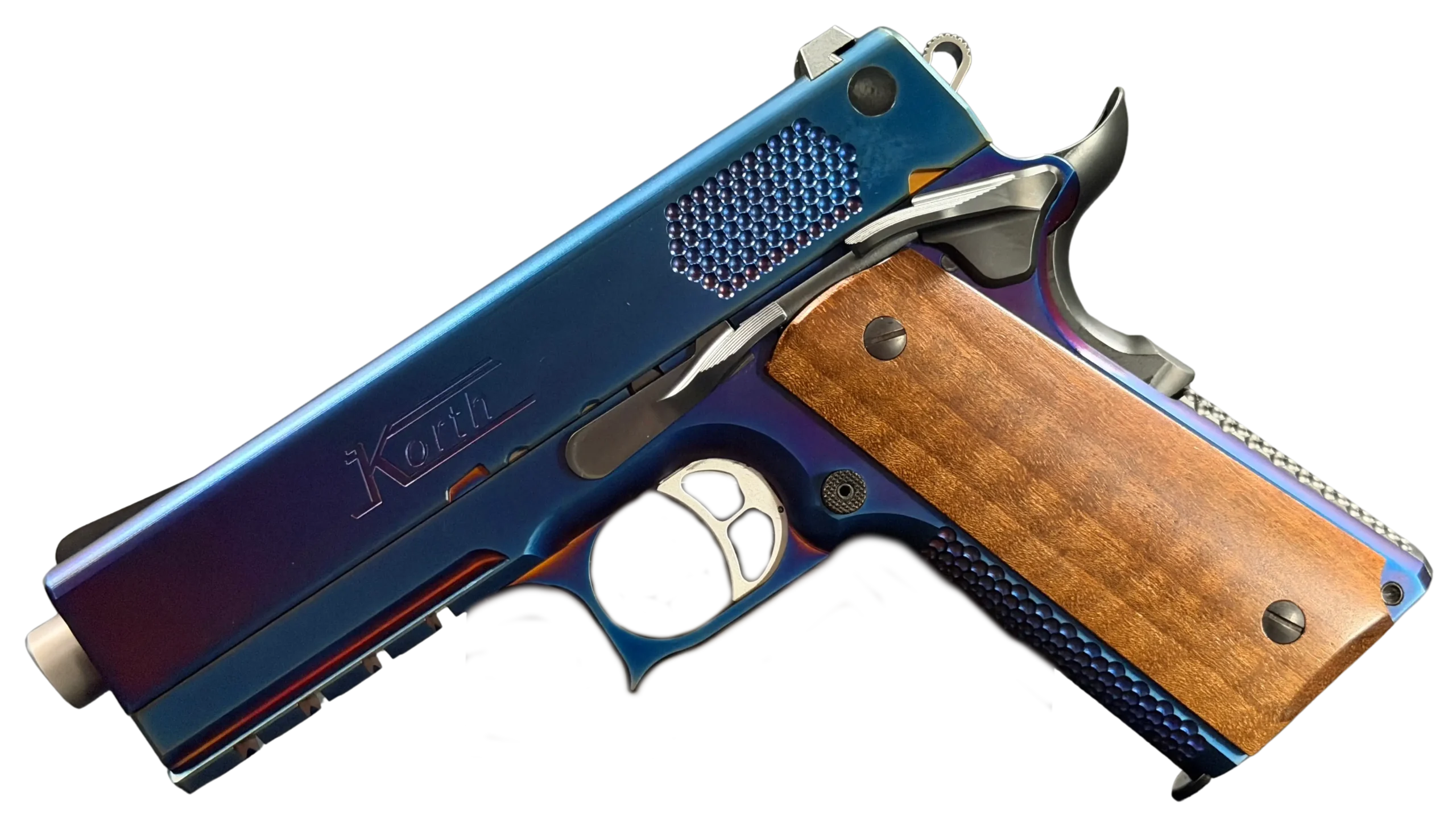 The Korth PRS Blue Plasma 4.25″ pairs the PRS platform with a distinctive multi-tone Blue Plasma finish that shifts in the light from deep blue to violet and ember tones. Richly grained wooden grips add classic contrast to the pistol’s modern presentation.