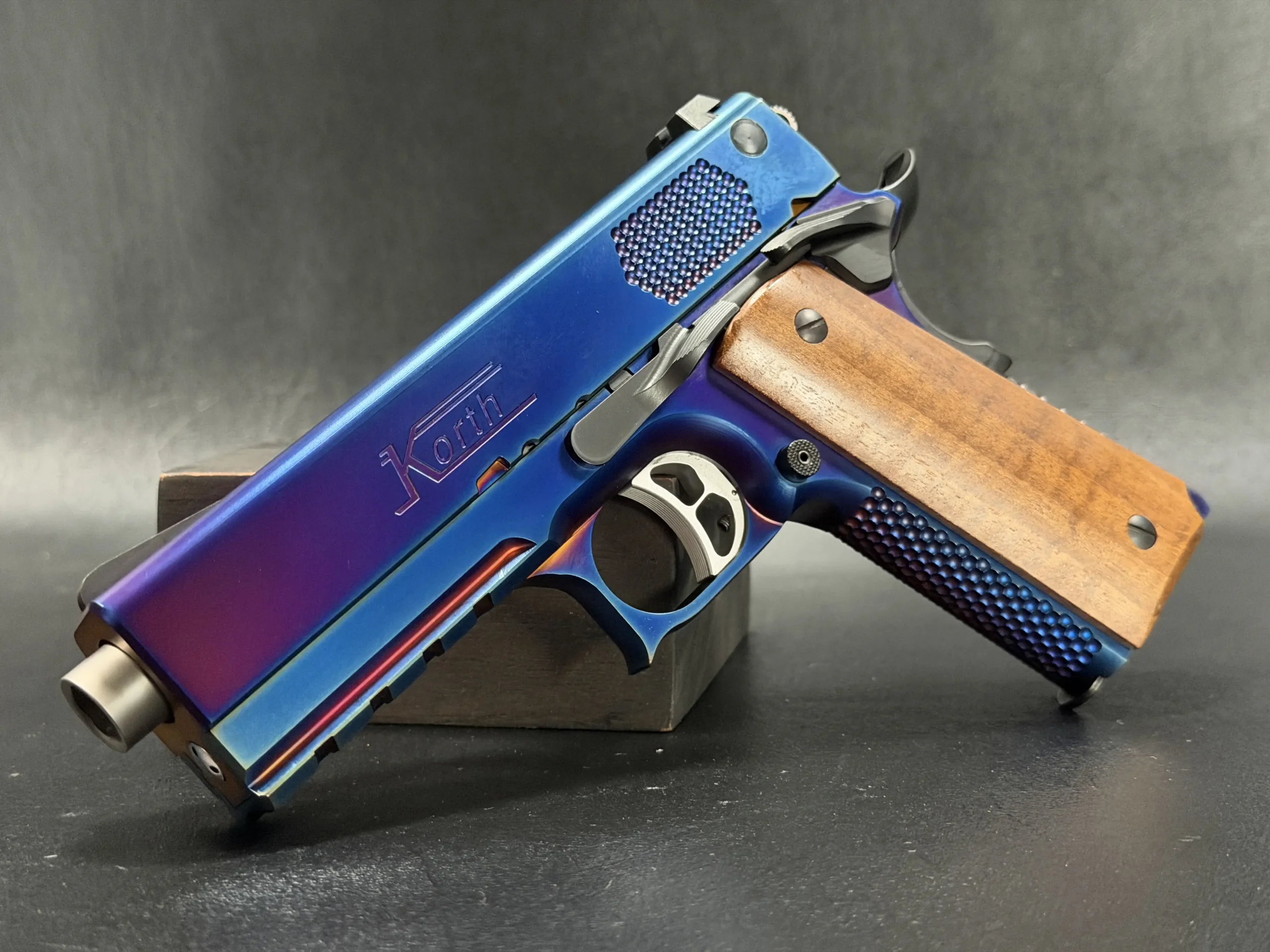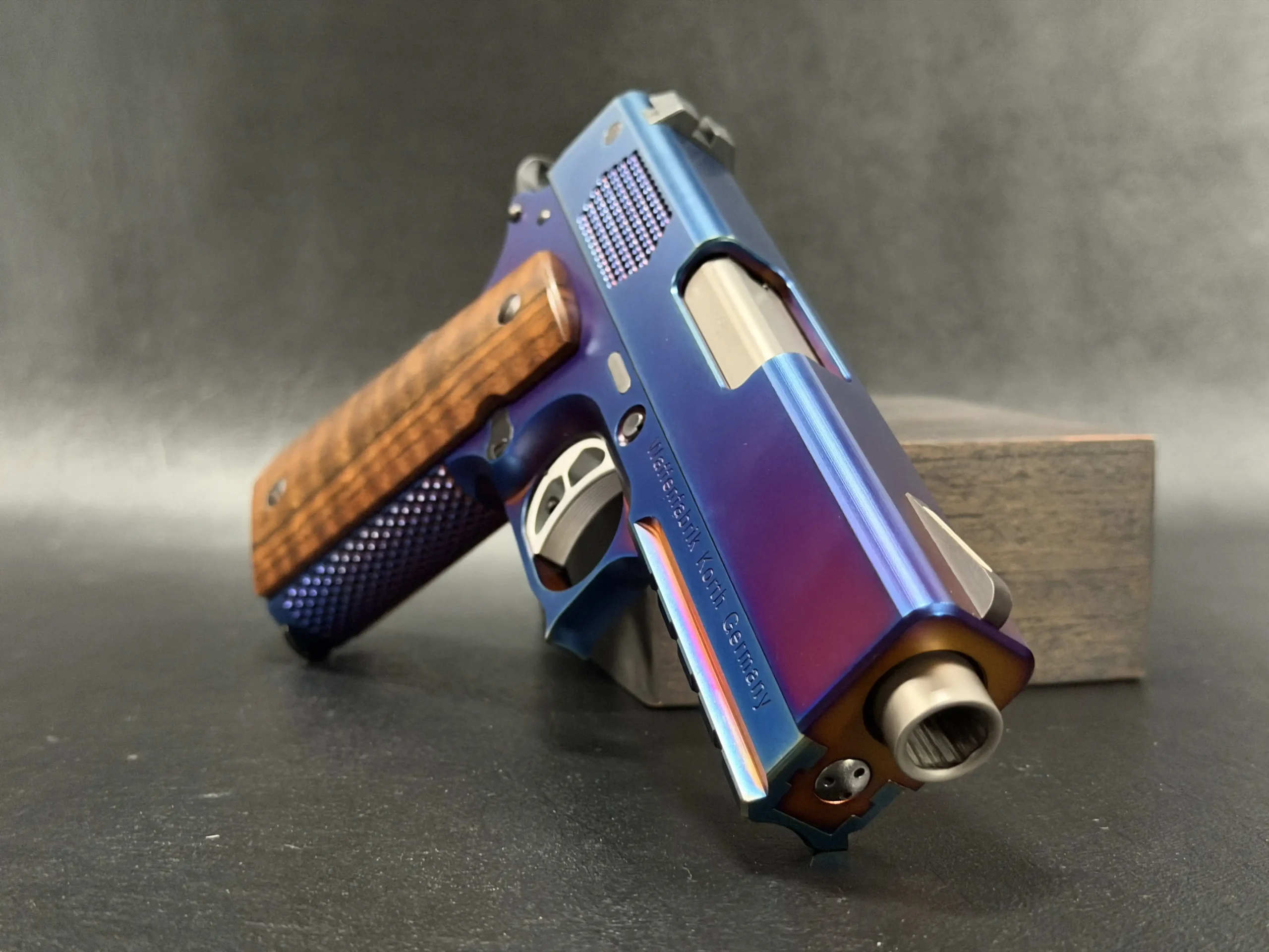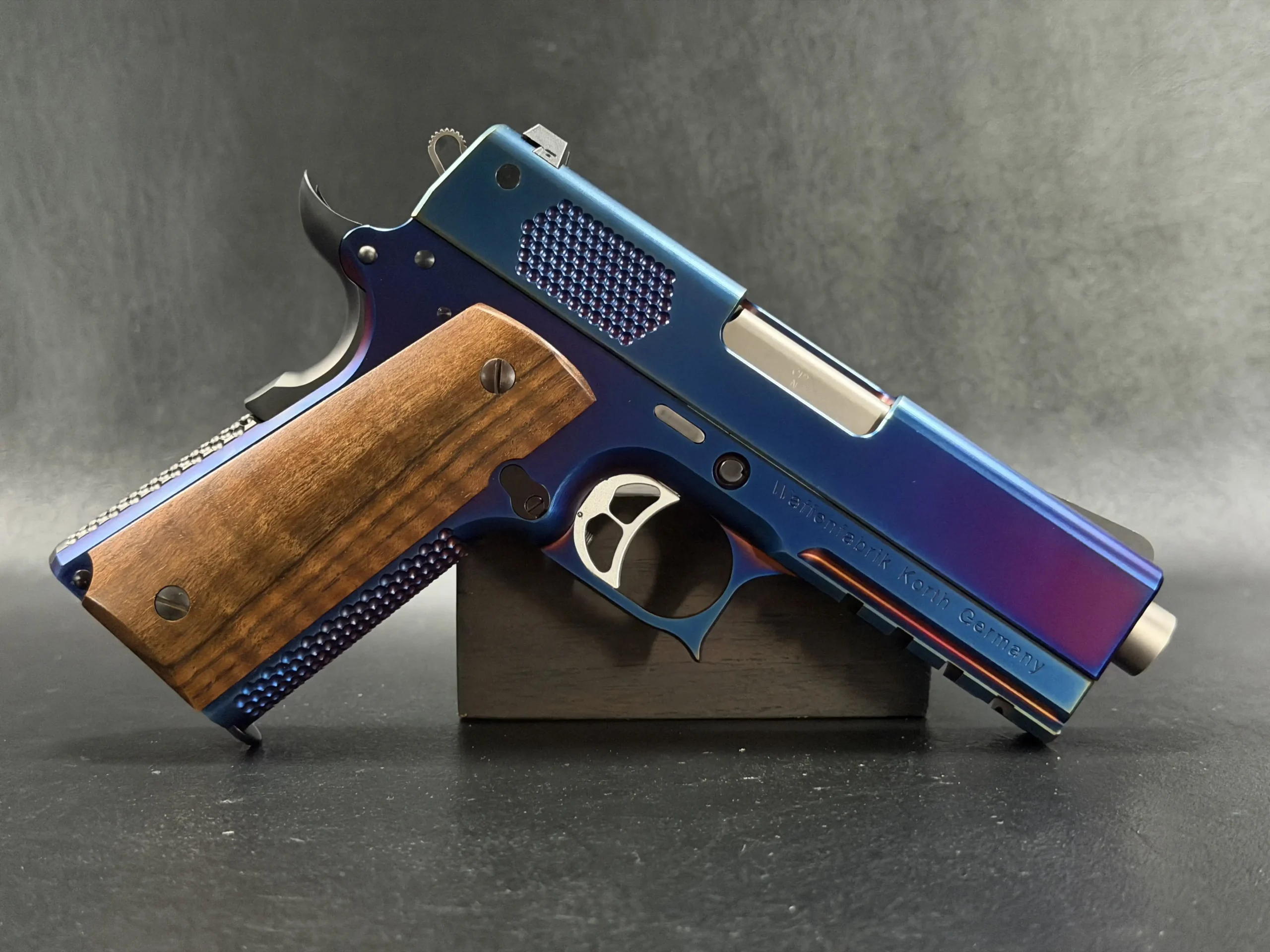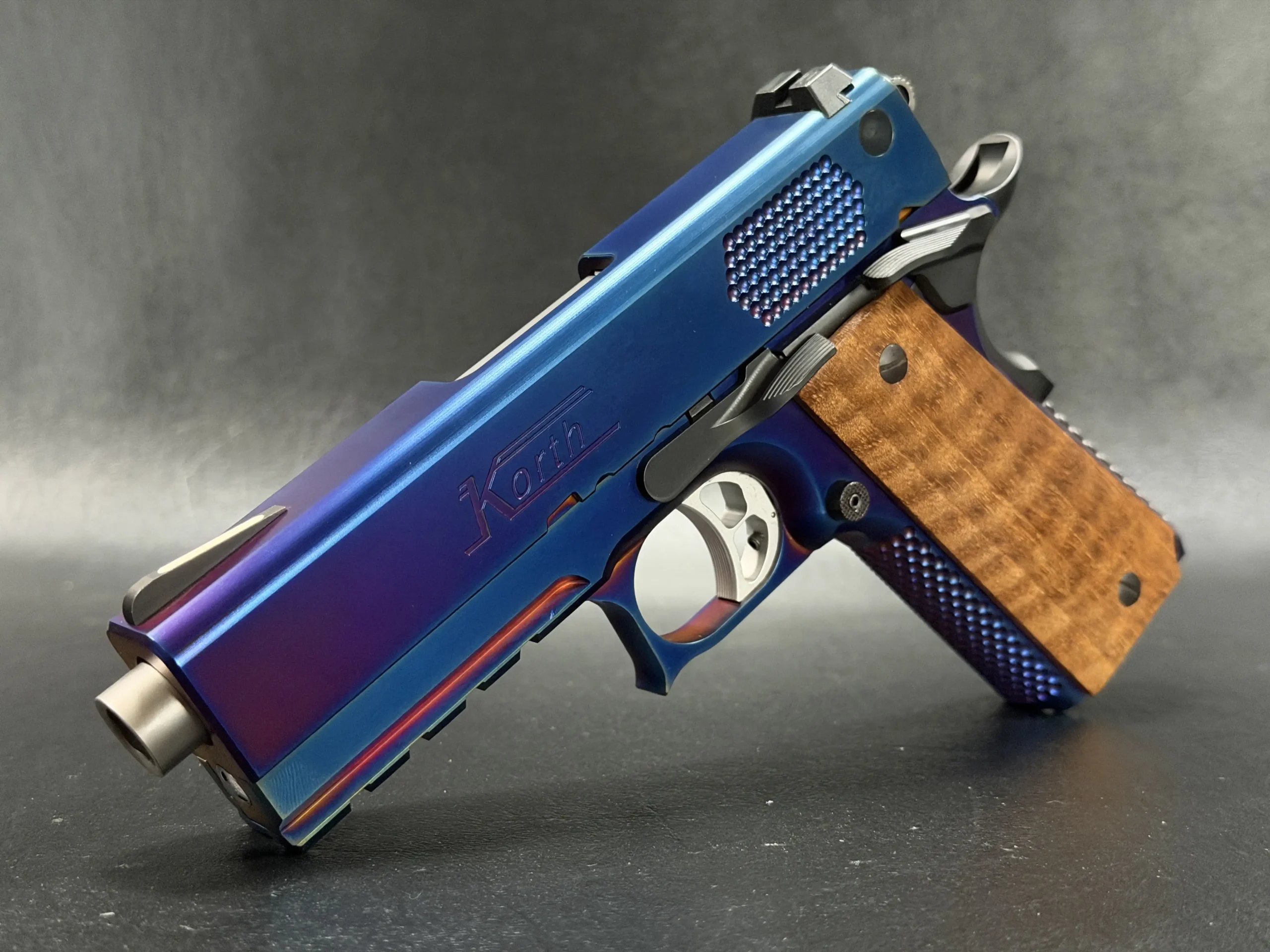 The Korth PRS Blue Plasma 4.25″ pairs the PRS platform with a distinctive multi-tone Blue Plasma finish that shifts in the light from deep blue to violet and ember tones. Richly grained wooden grips add classic contrast to the pistol’s modern presentation.