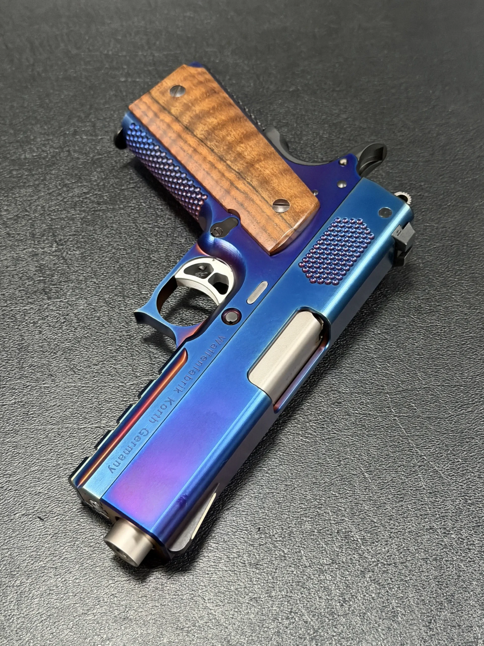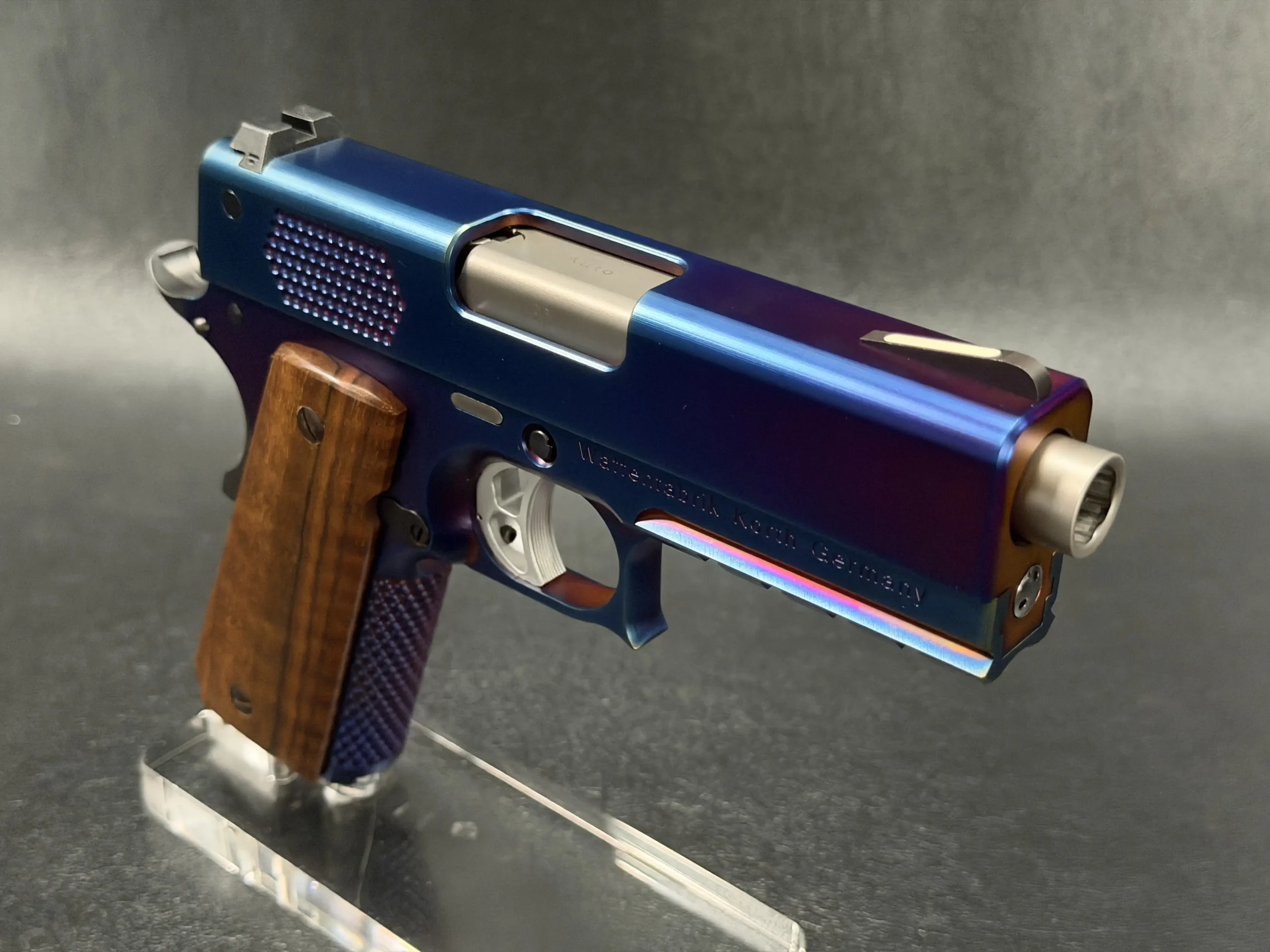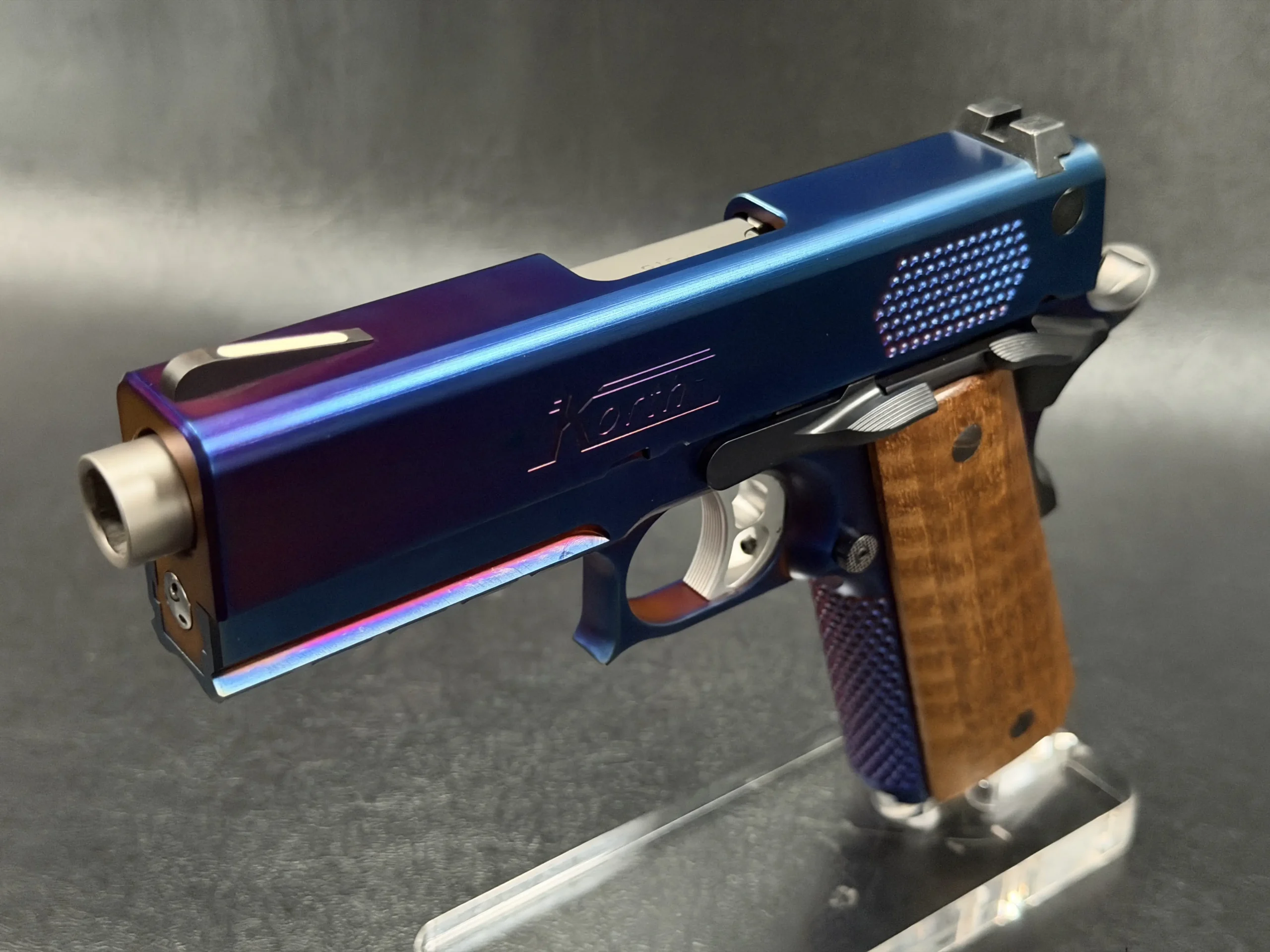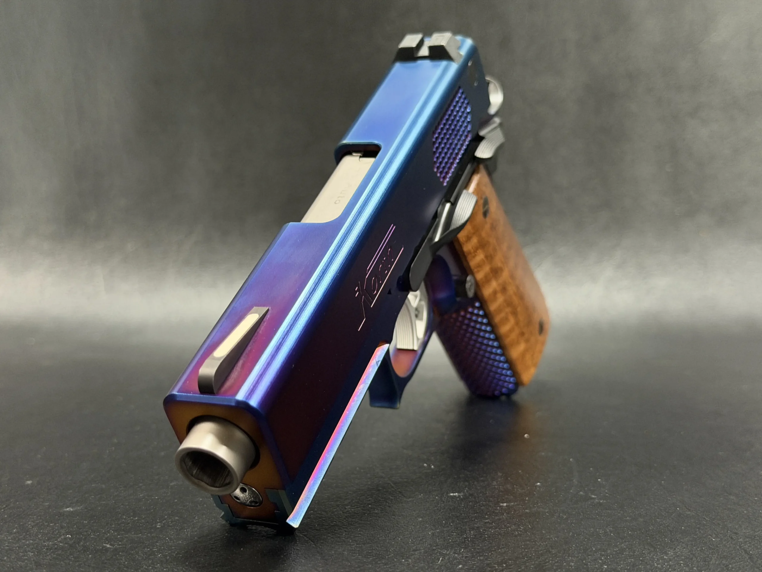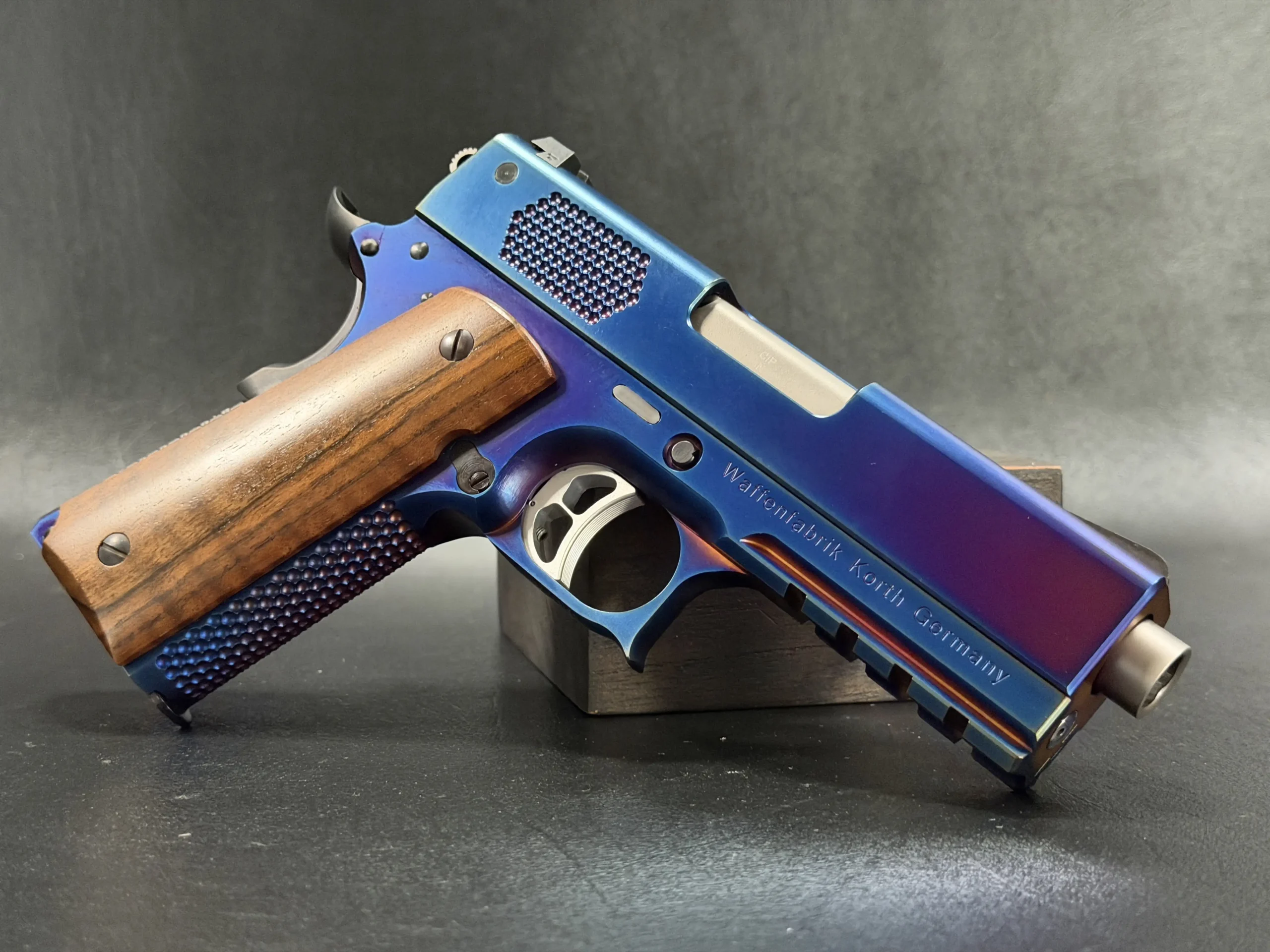 The Korth PRS Blue Plasma 4.25″ pairs the PRS platform with a distinctive multi-tone Blue Plasma finish that shifts in the light from deep blue to violet and ember tones. Richly grained wooden grips add classic contrast to the pistol’s modern presentation.