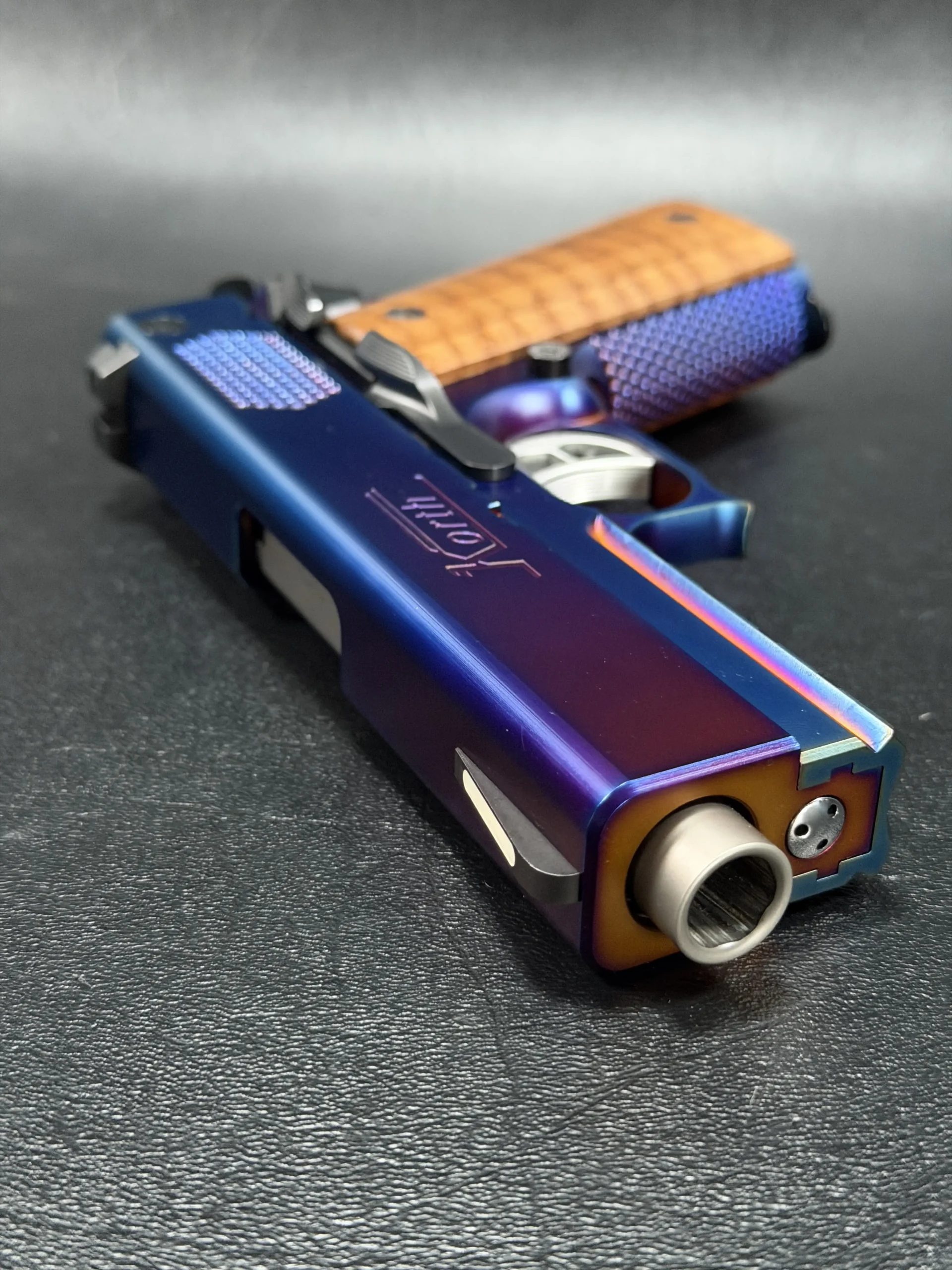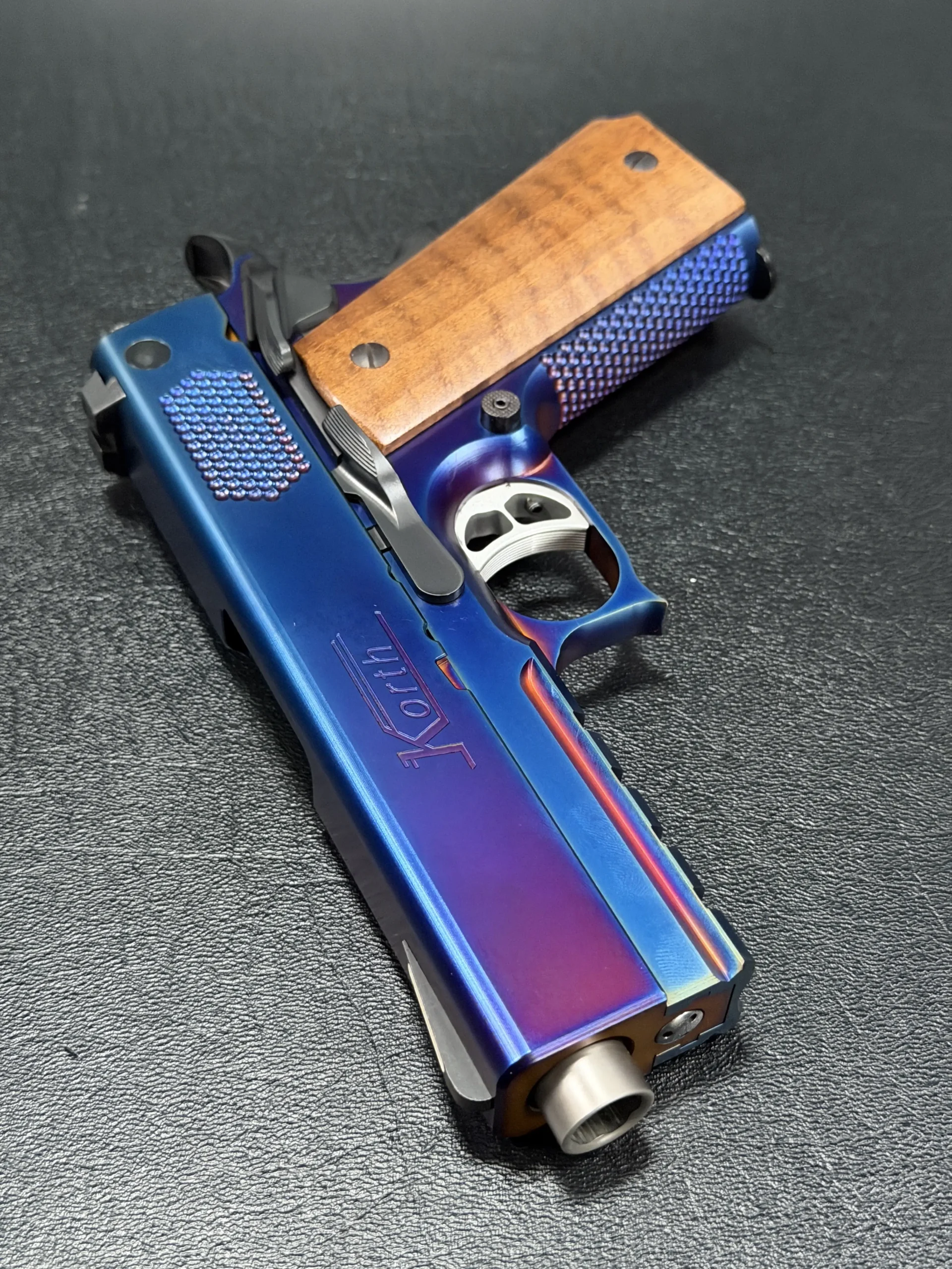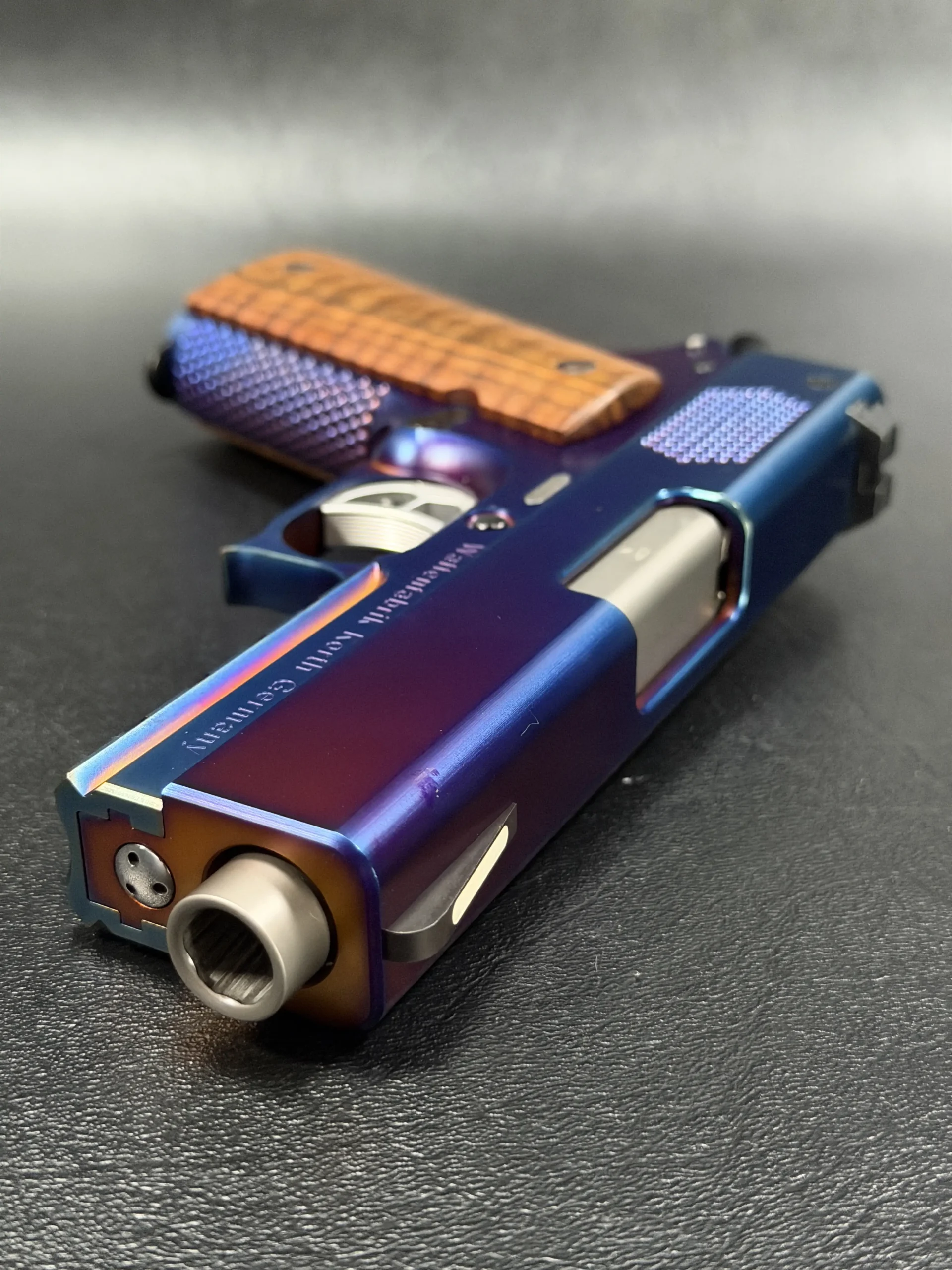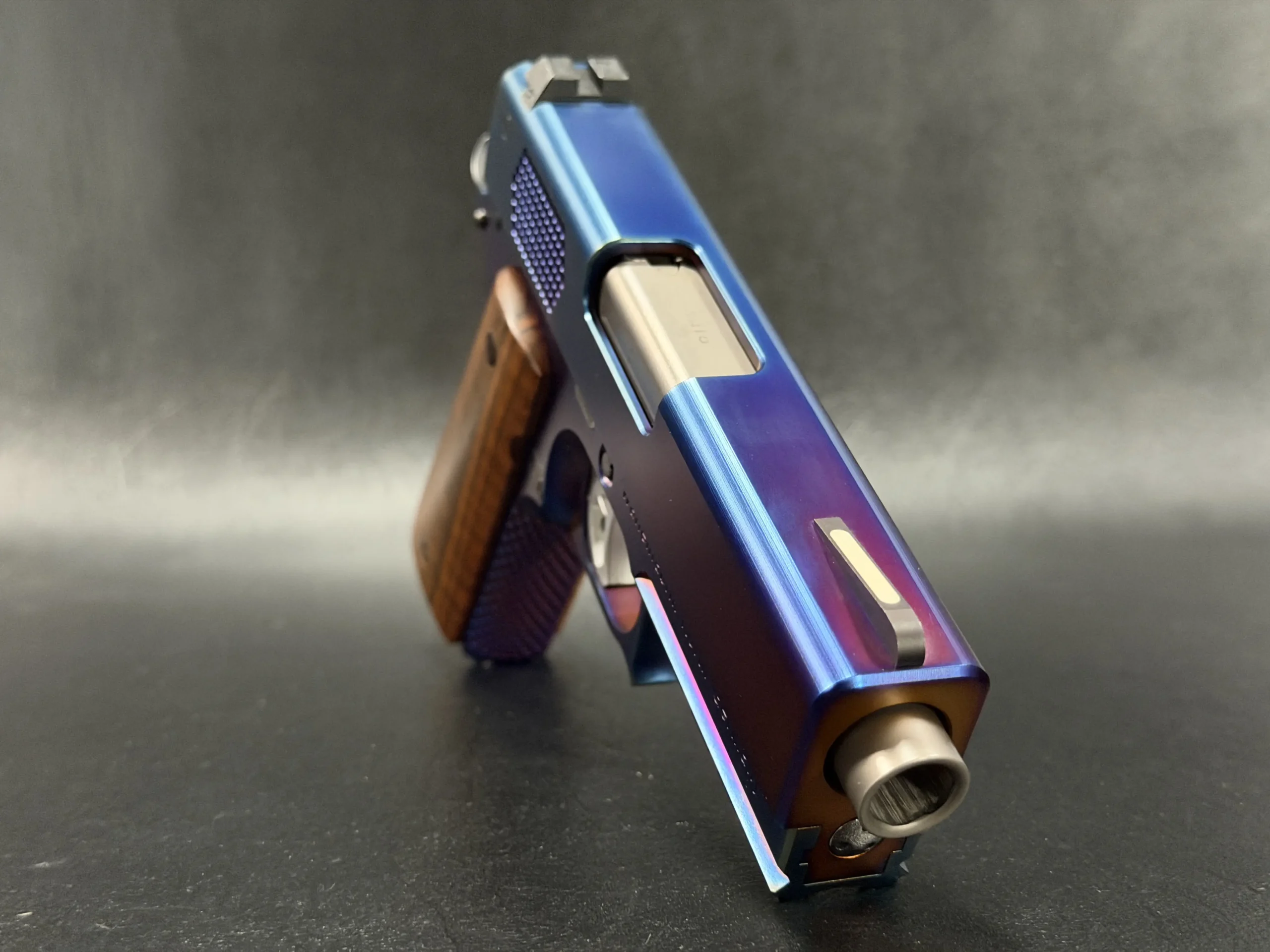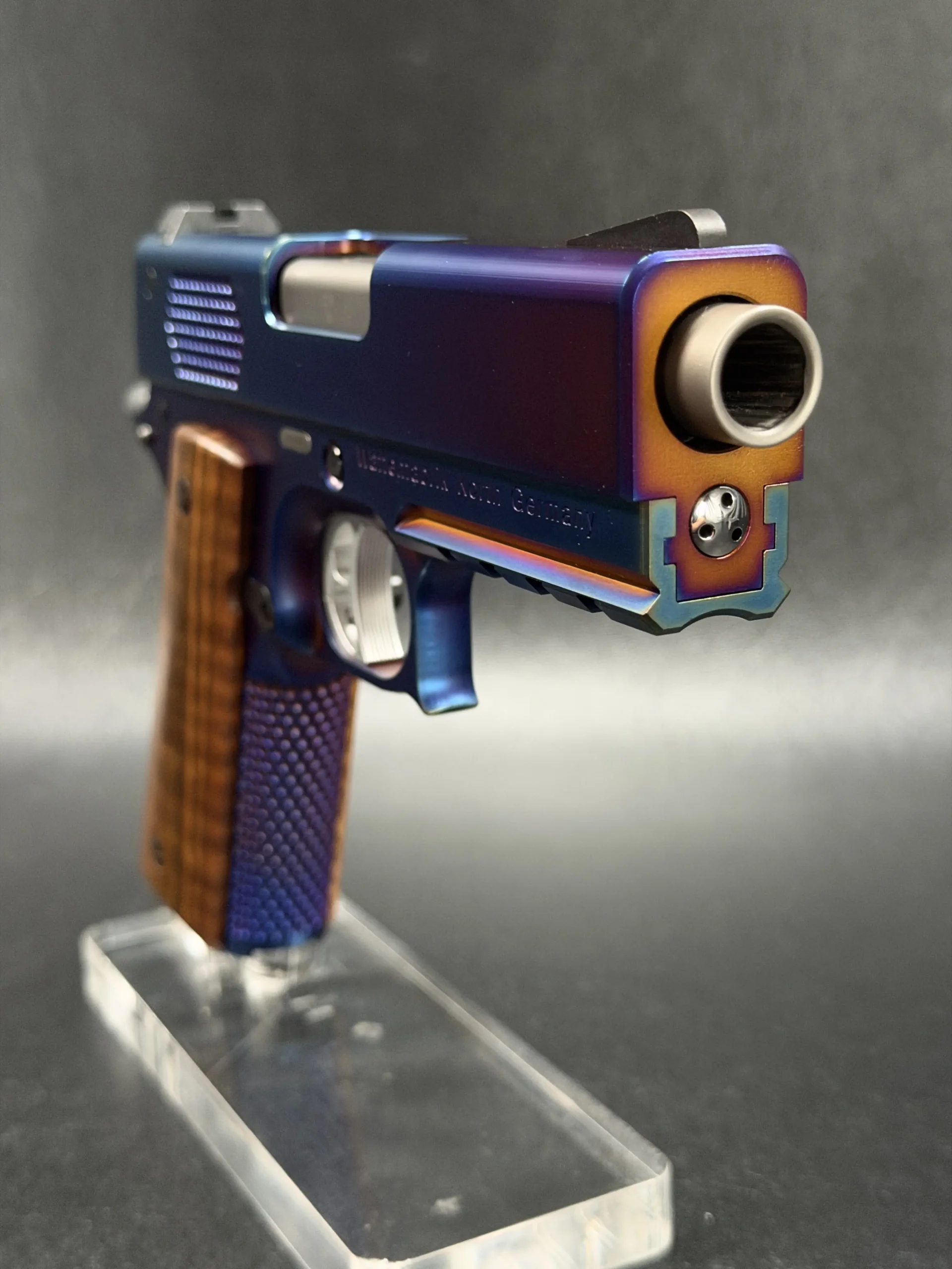 The Korth PRS Blue Plasma 4.25″ pairs the PRS platform with a distinctive multi-tone Blue Plasma finish that shifts in the light from deep blue to violet and ember tones. Richly grained wooden grips add classic contrast to the pistol’s modern presentation.