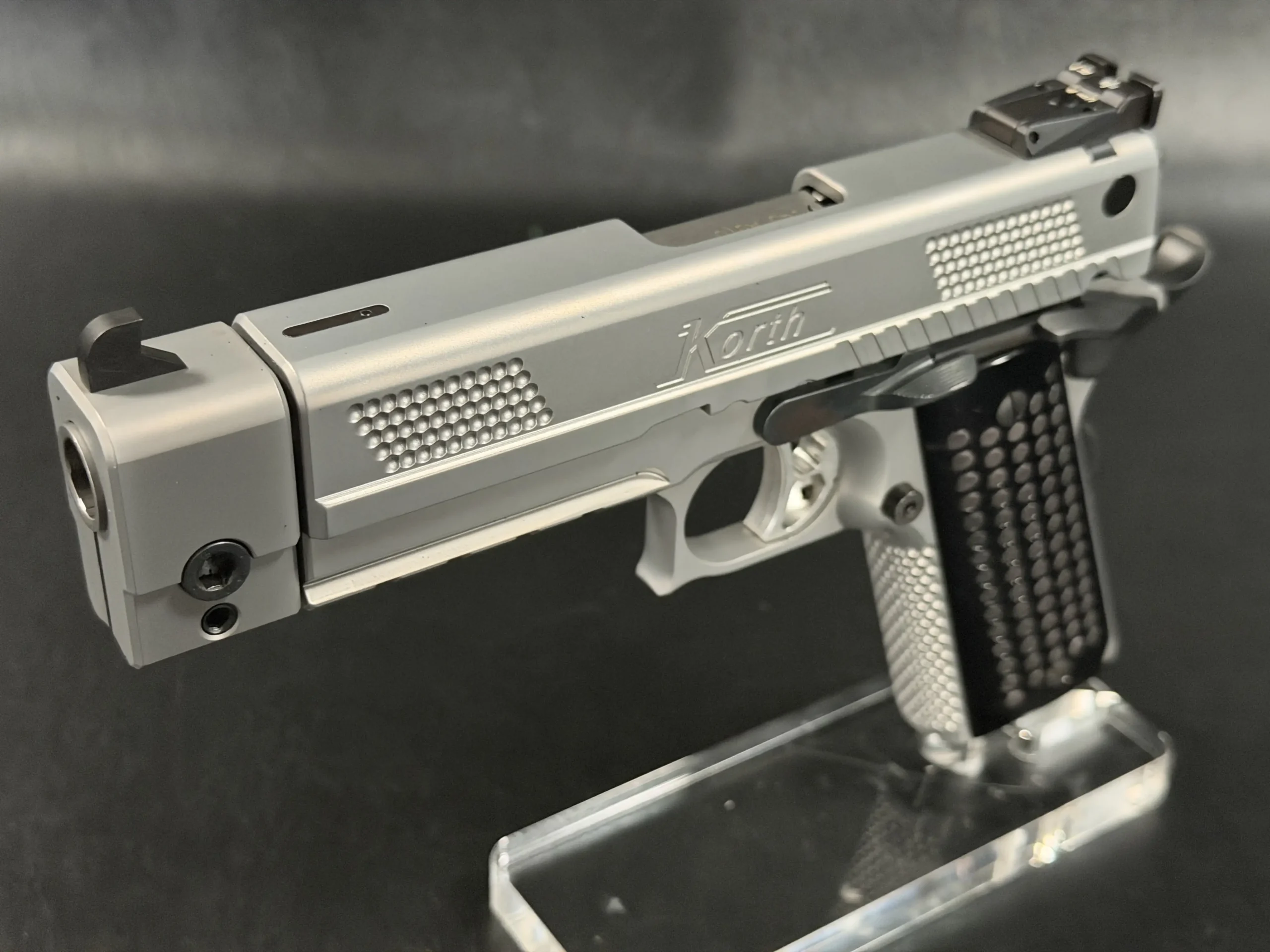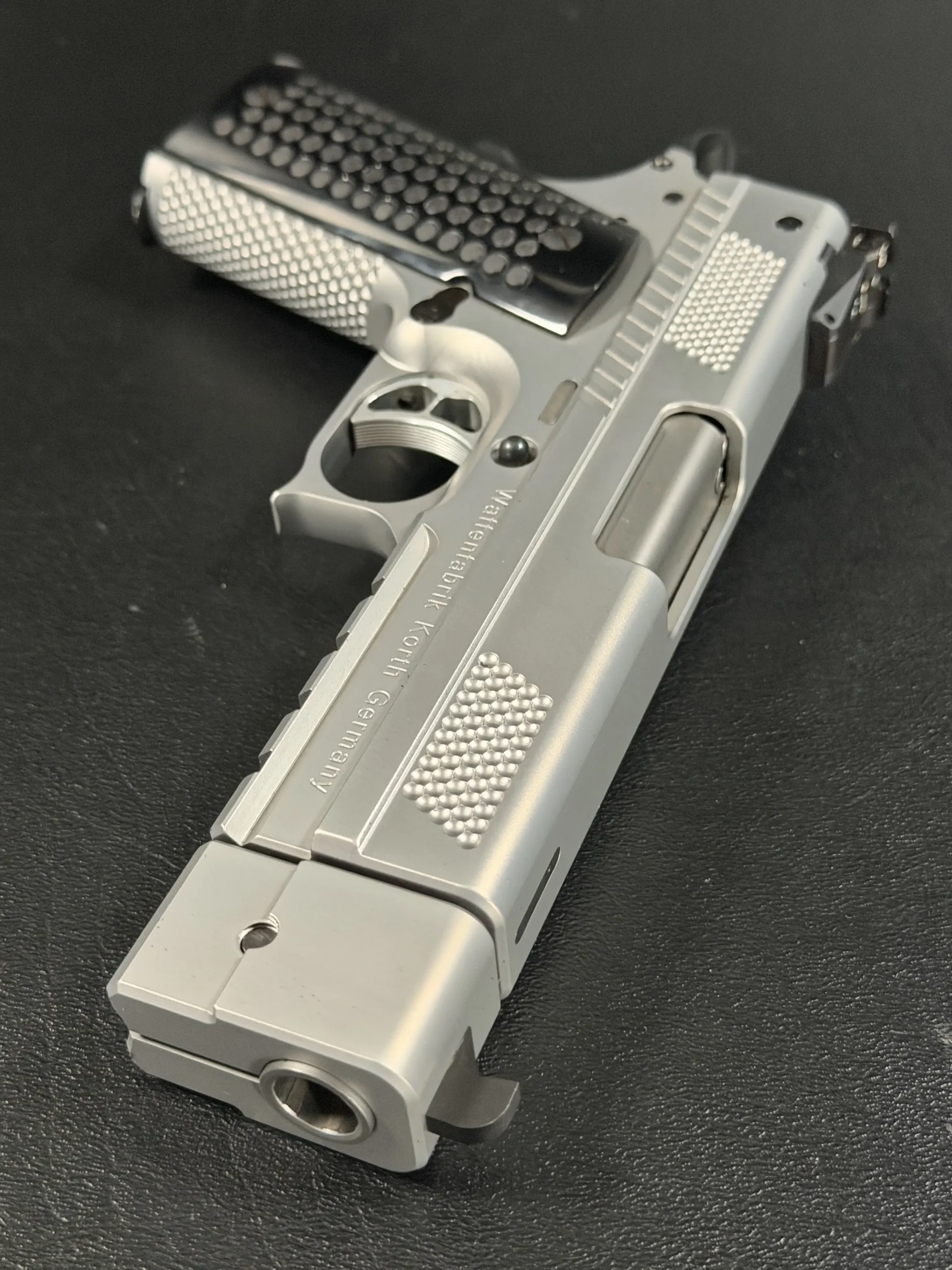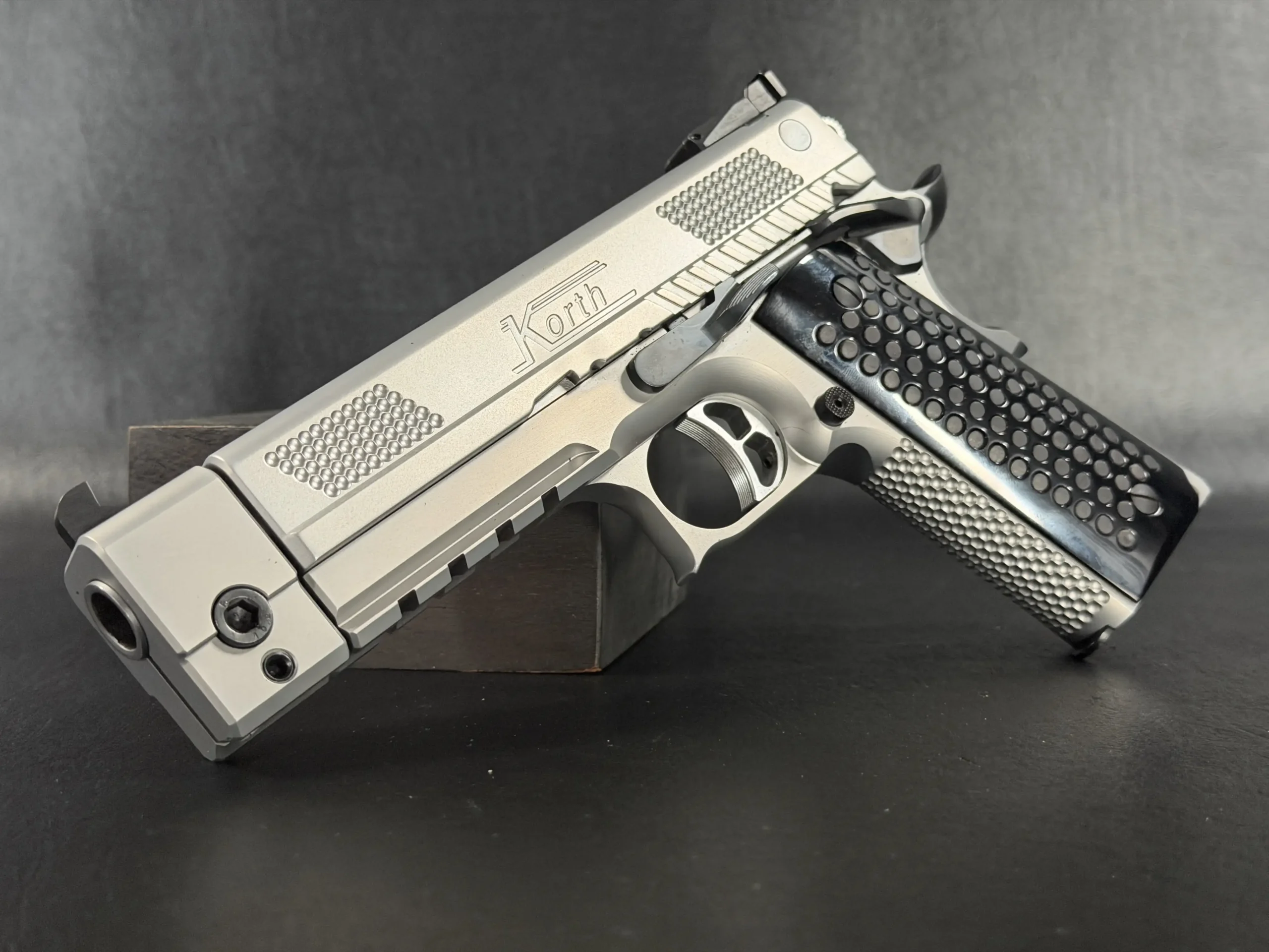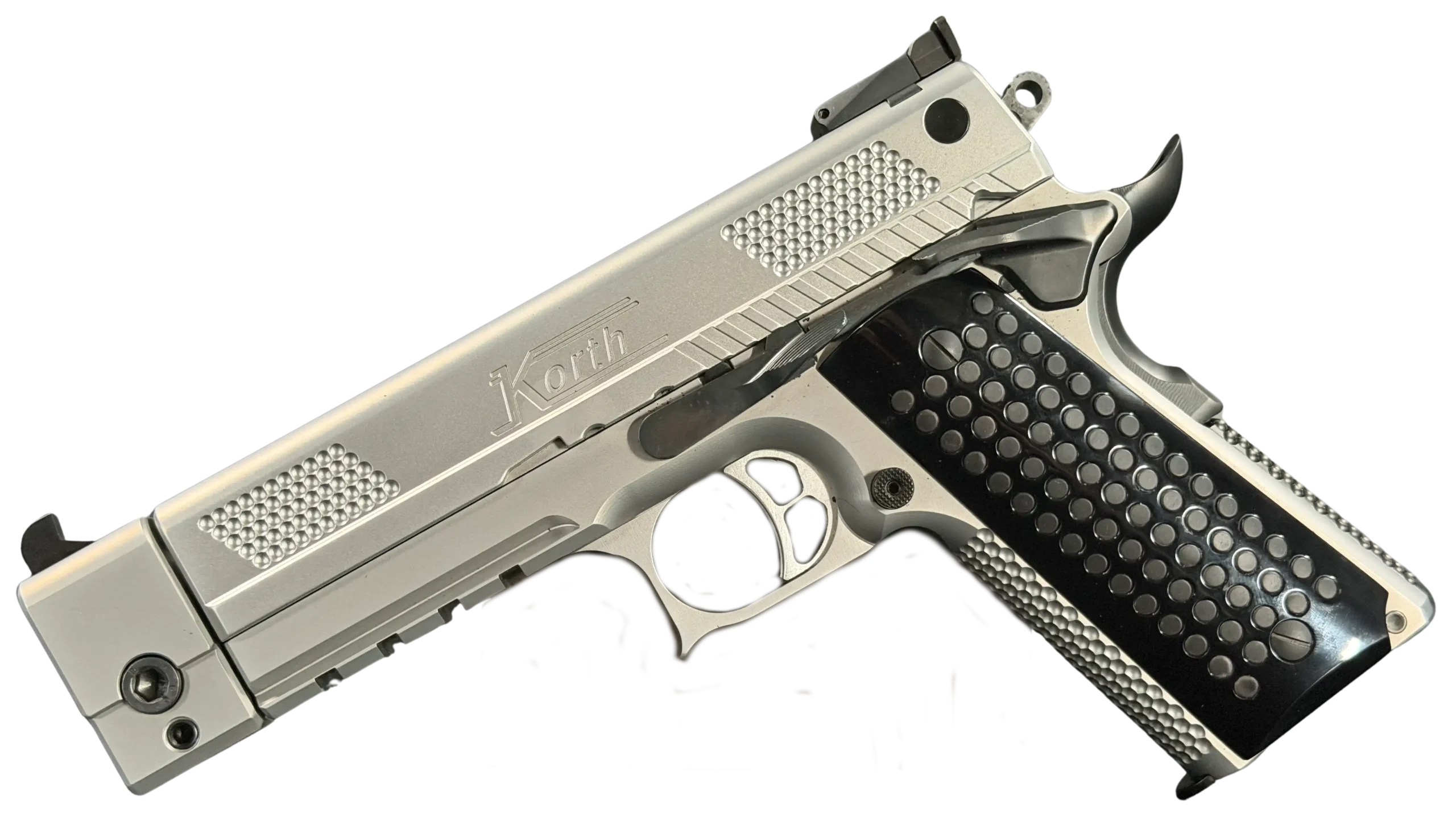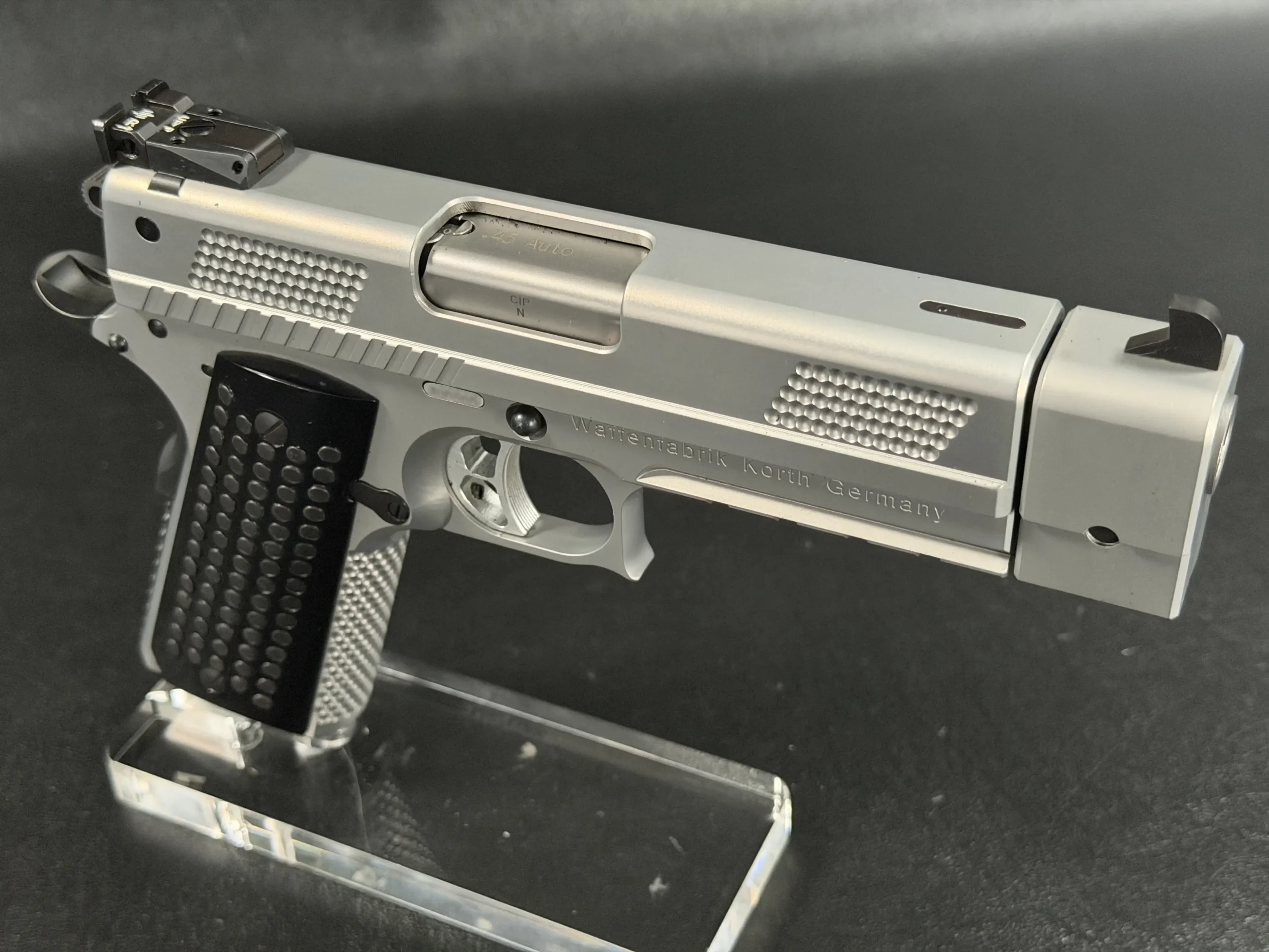The matte stainless finish gives the slide and frame a smooth, satin appearance, complemented by Korth checkering panels at the front and rear of the slide for added texture and visual contrast. Chambered in .45 ACP, this example features a match barrel and a fitted compensator, along with a heavy dust cover and integrated accessory rail that add both functionality and a commanding profile.