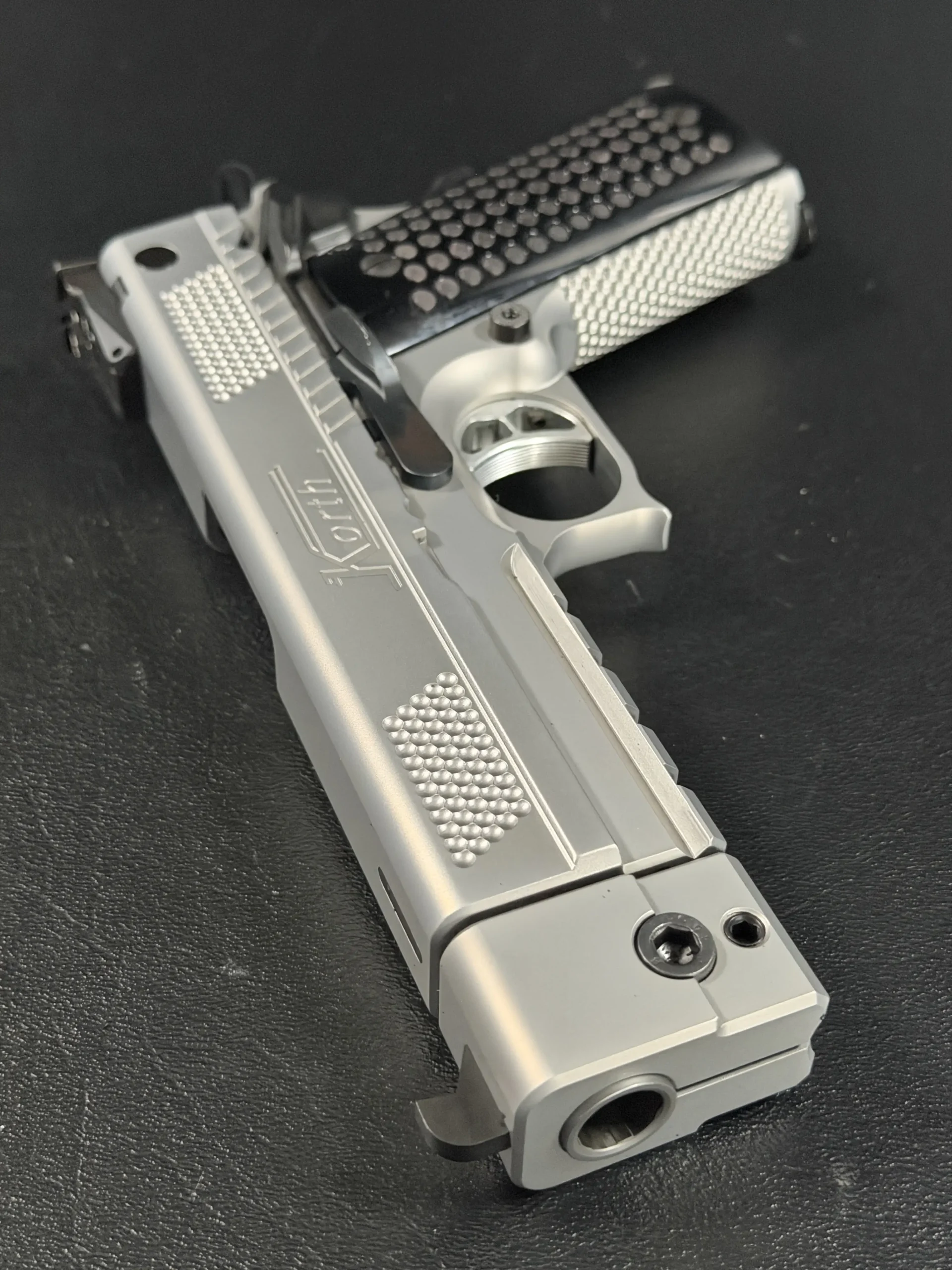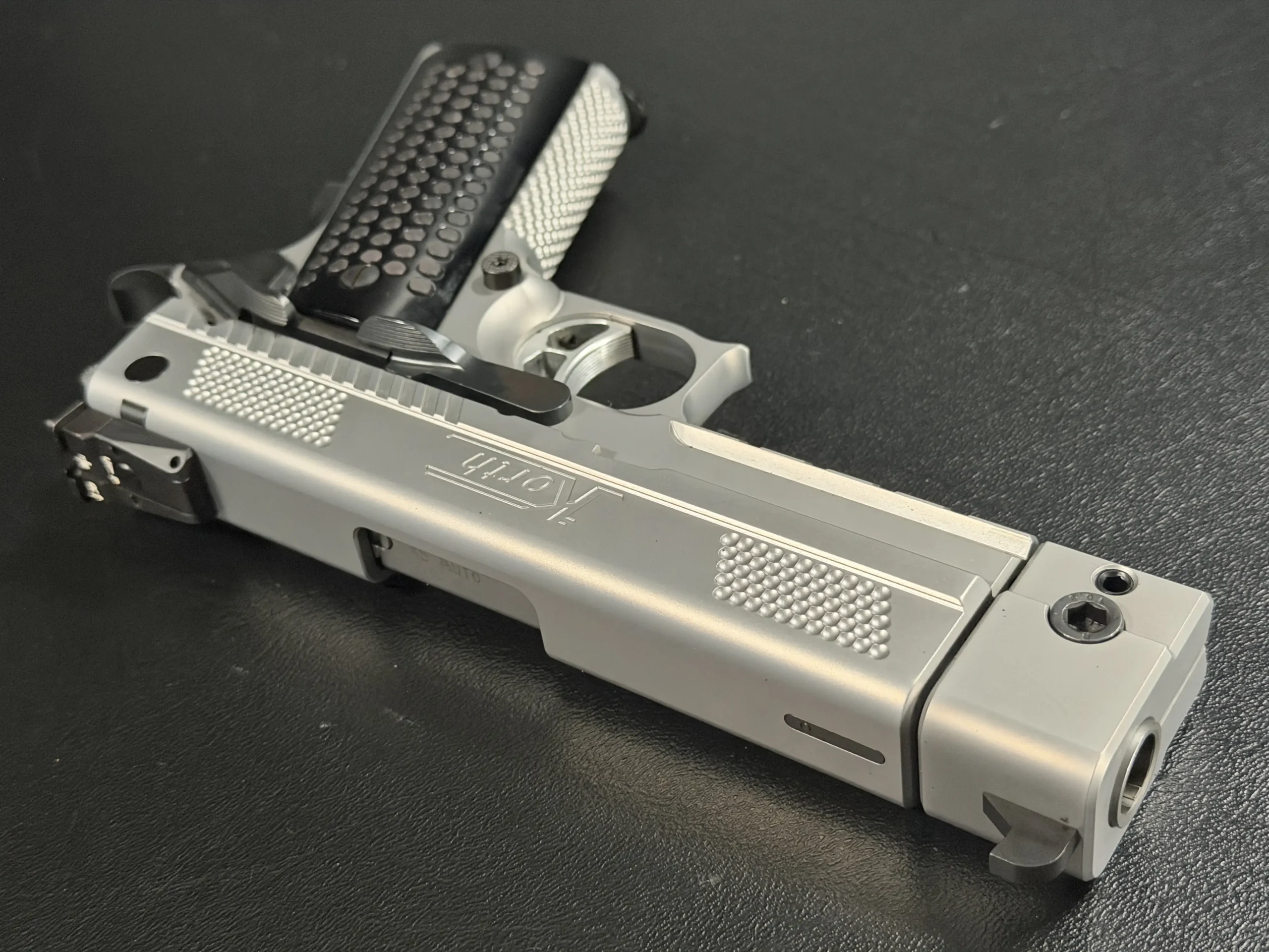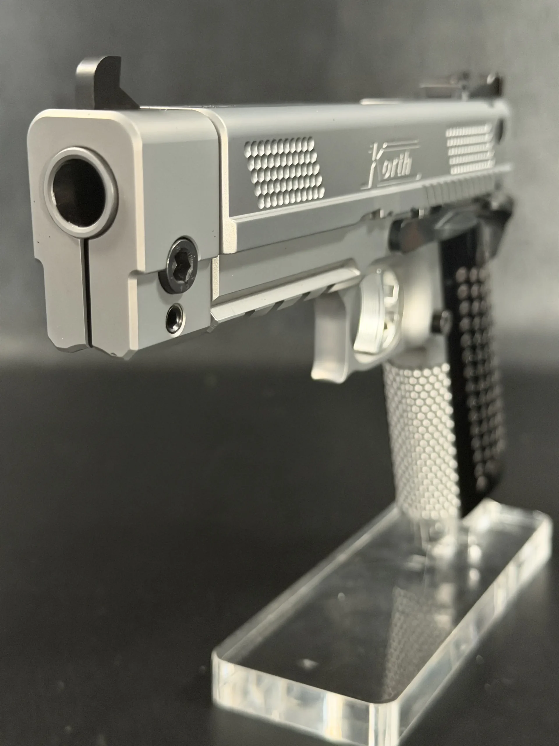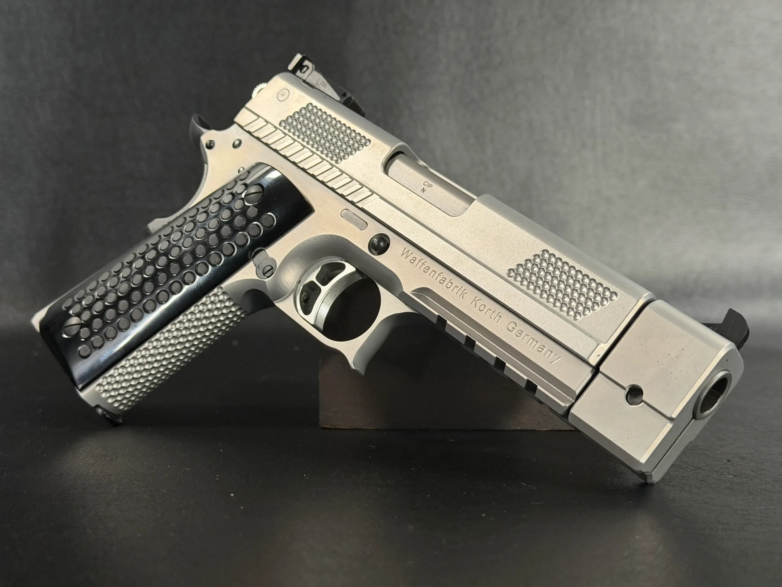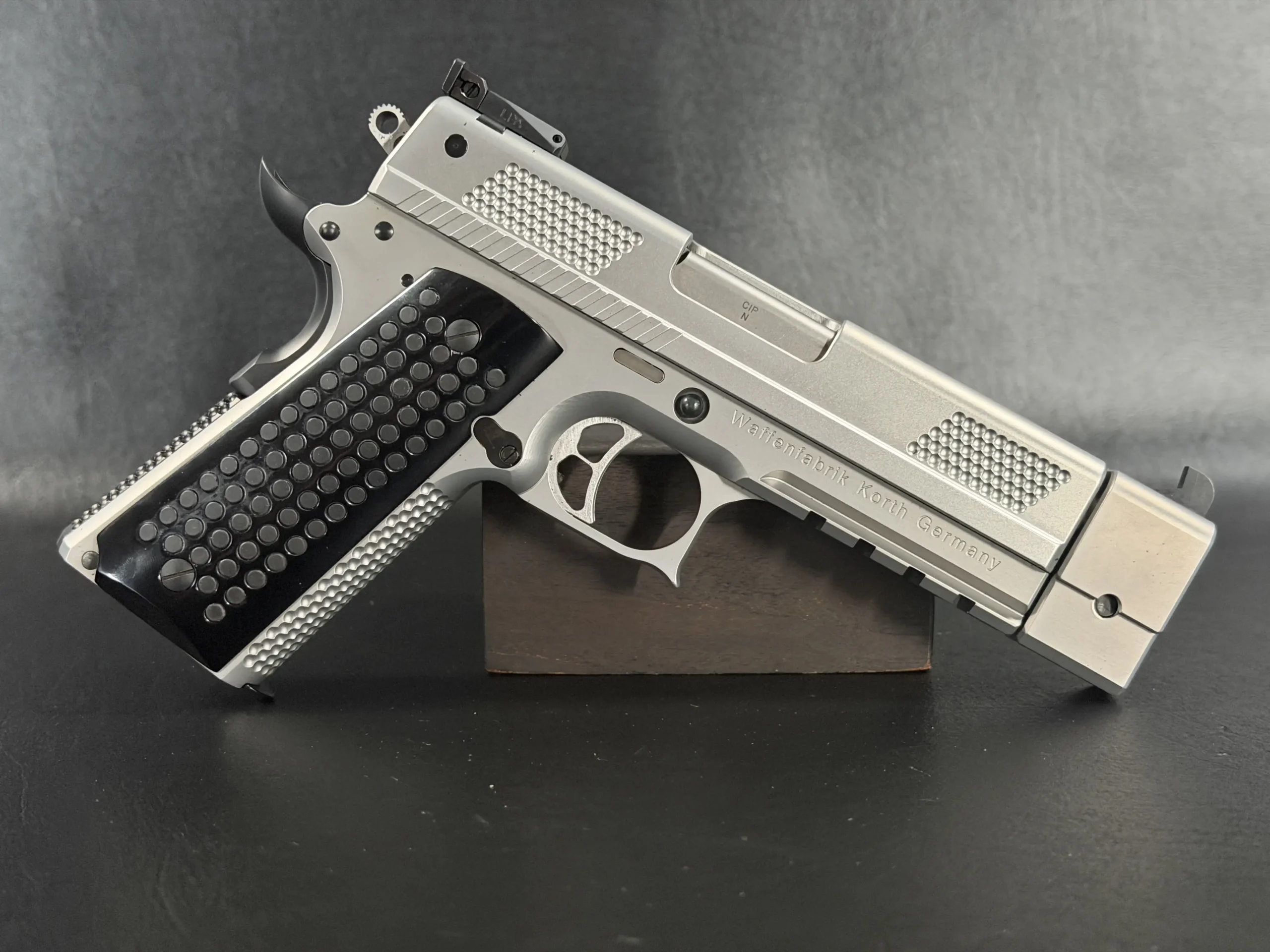 The matte stainless finish gives the slide and frame a smooth, satin appearance, complemented by Korth checkering panels at the front and rear of the slide for added texture and visual contrast. Chambered in .45 ACP, this example features a match barrel and a fitted compensator, along with a heavy dust cover and integrated accessory rail that add both functionality and a commanding profile.