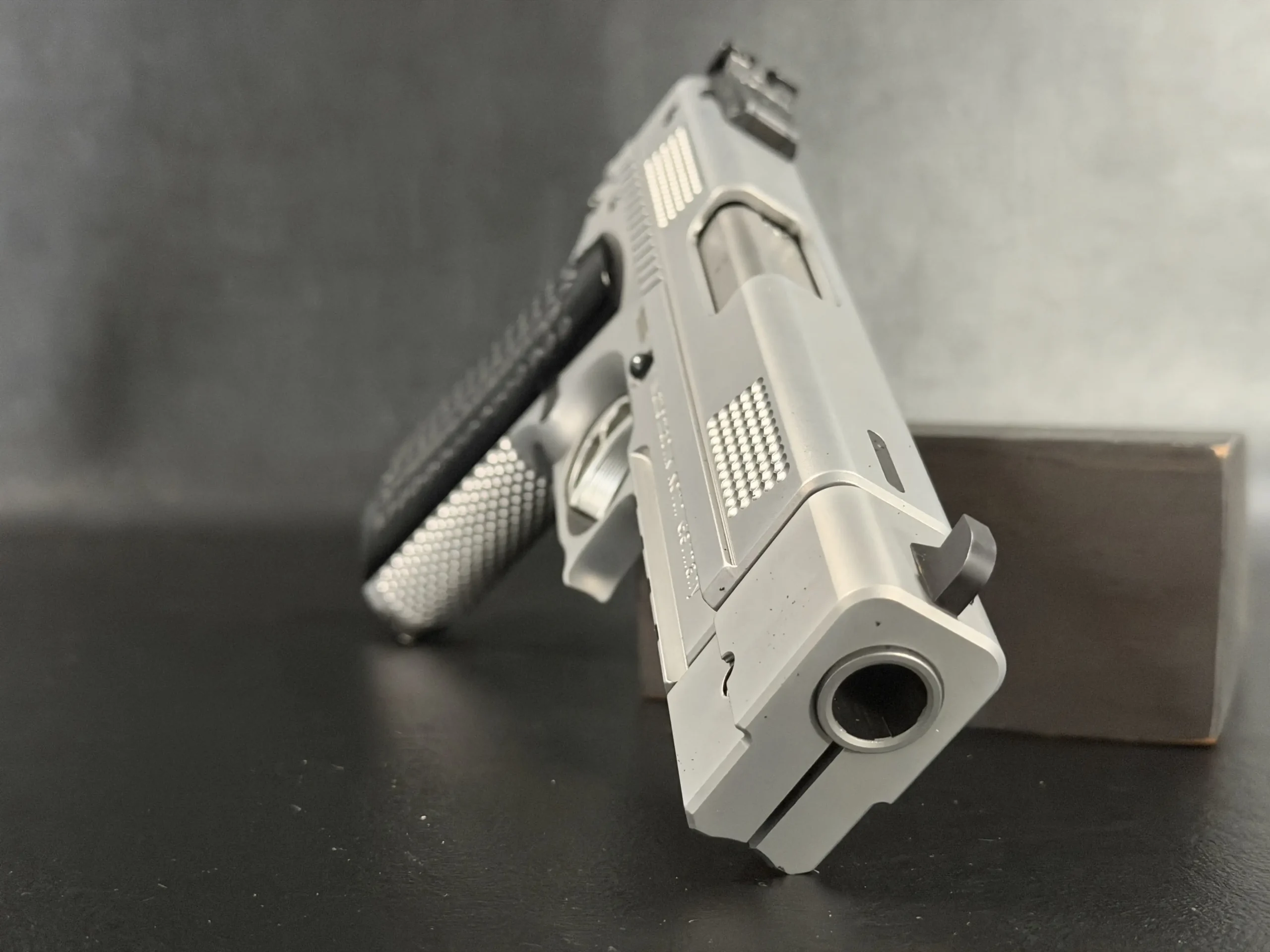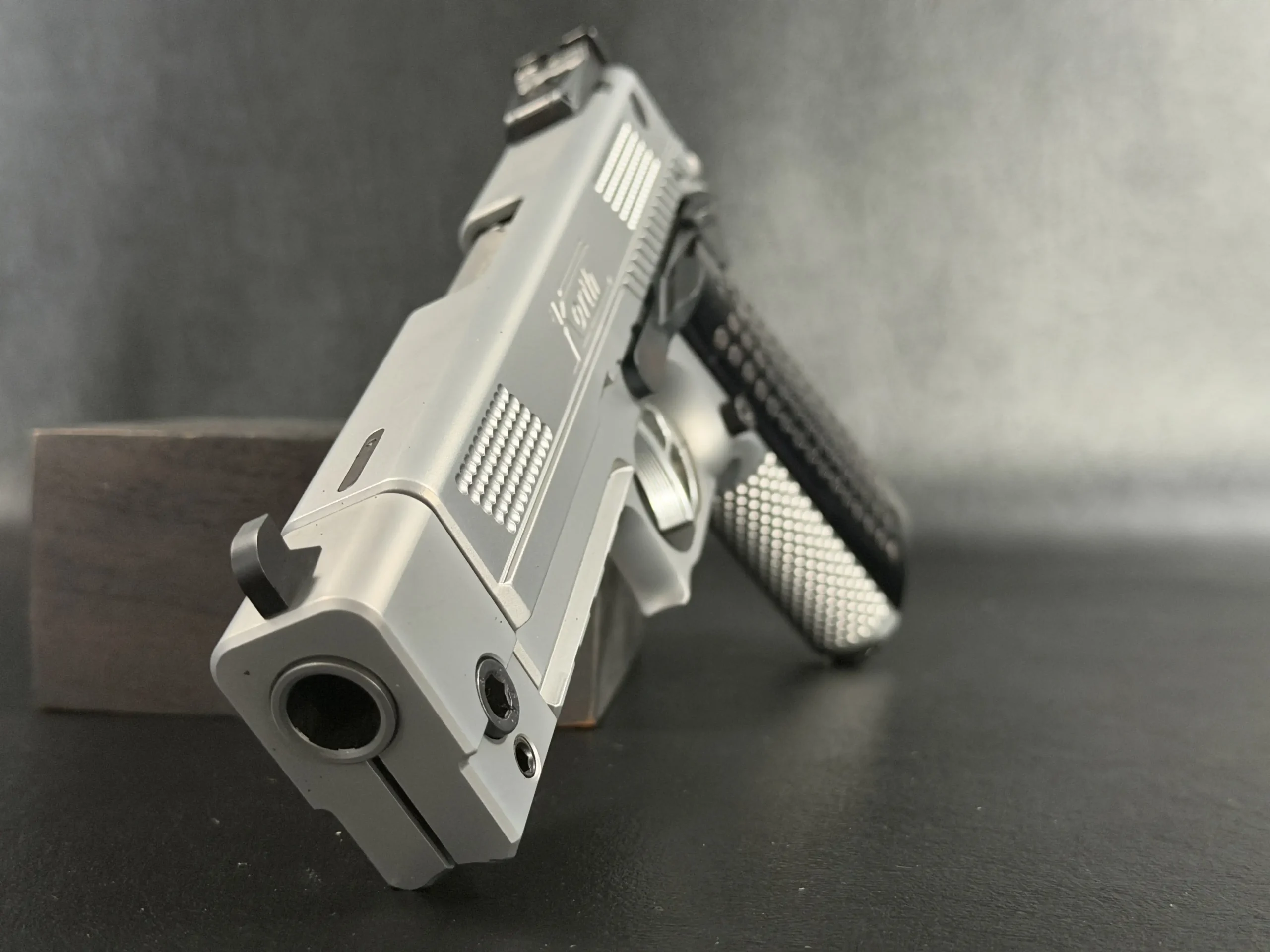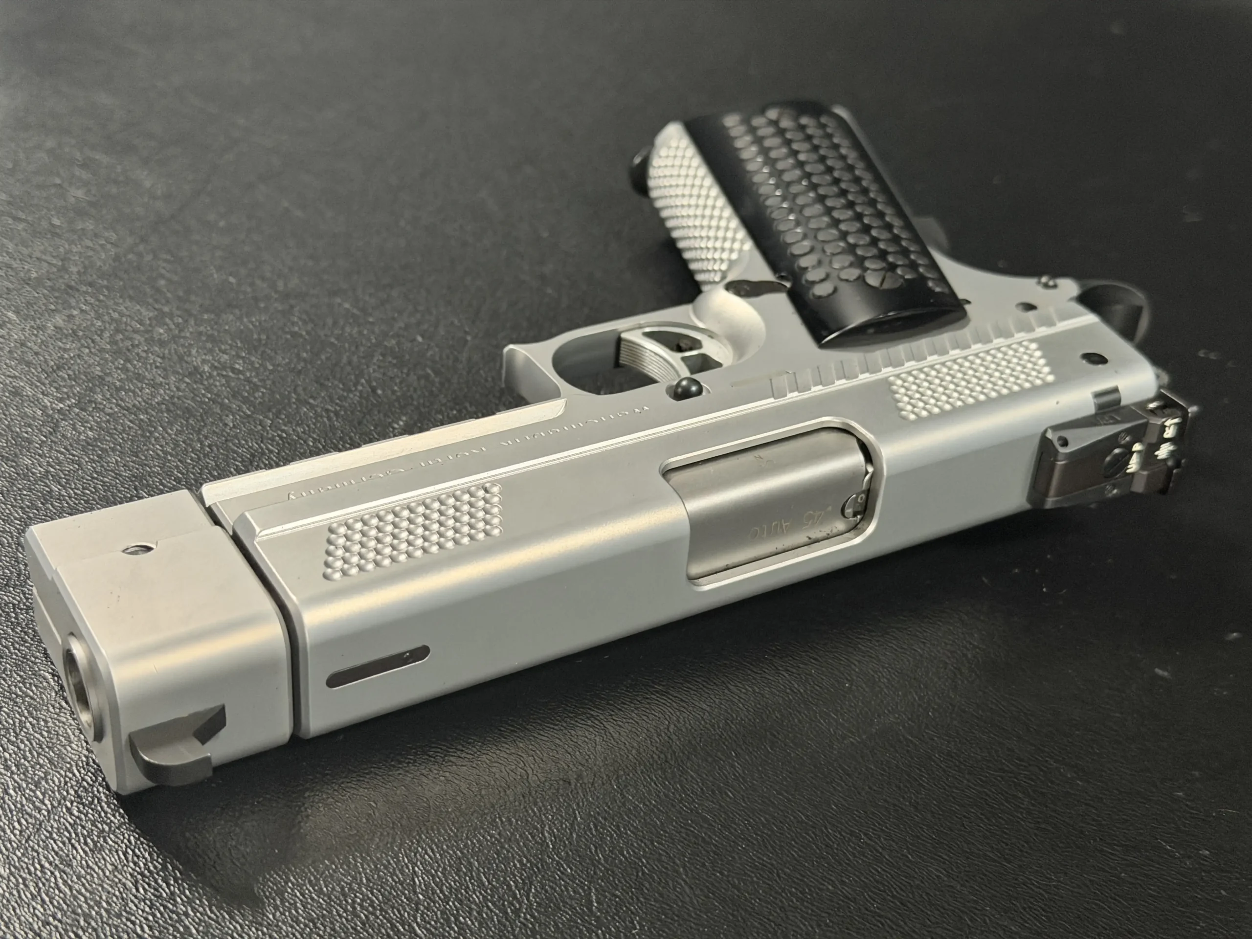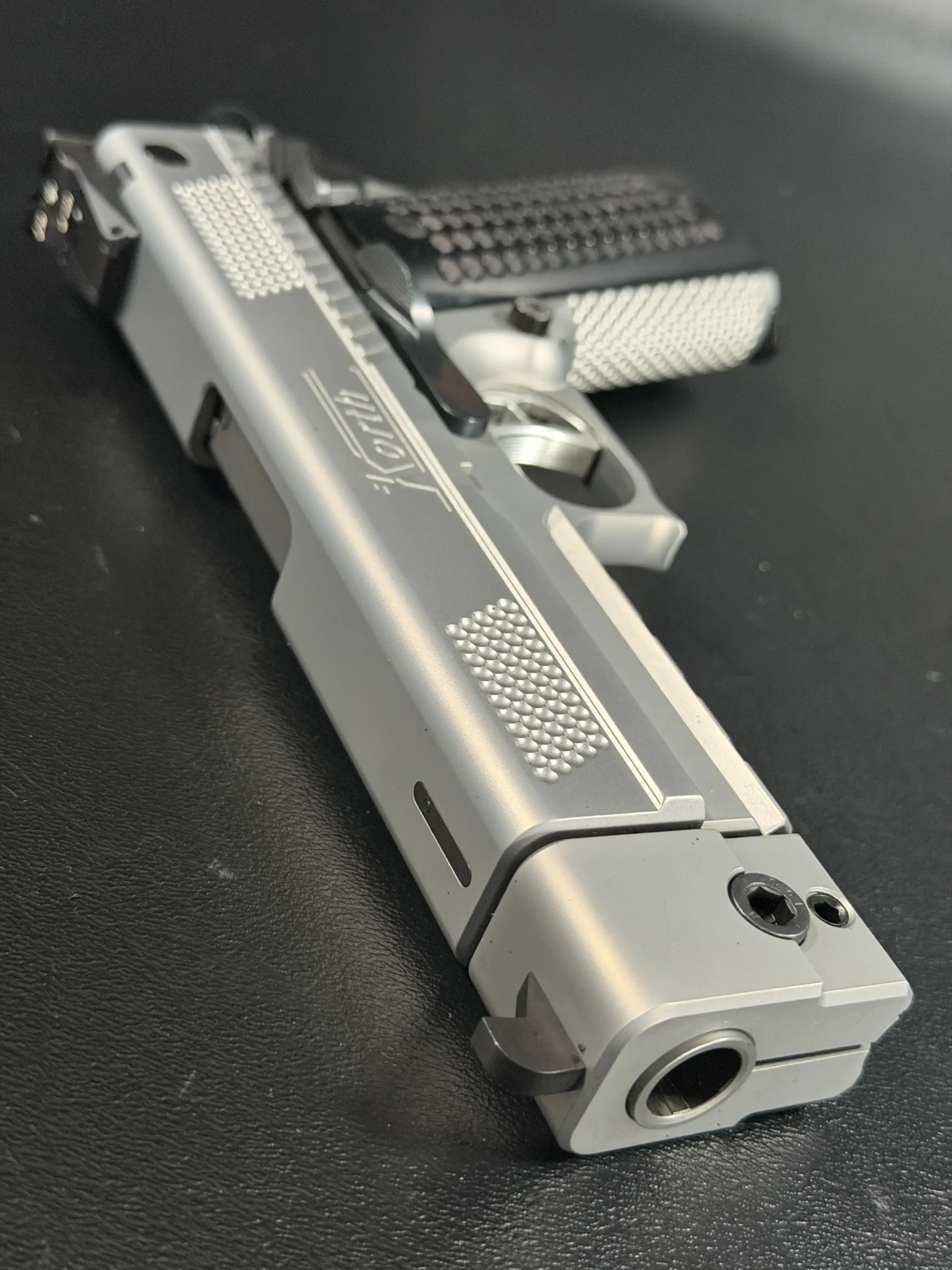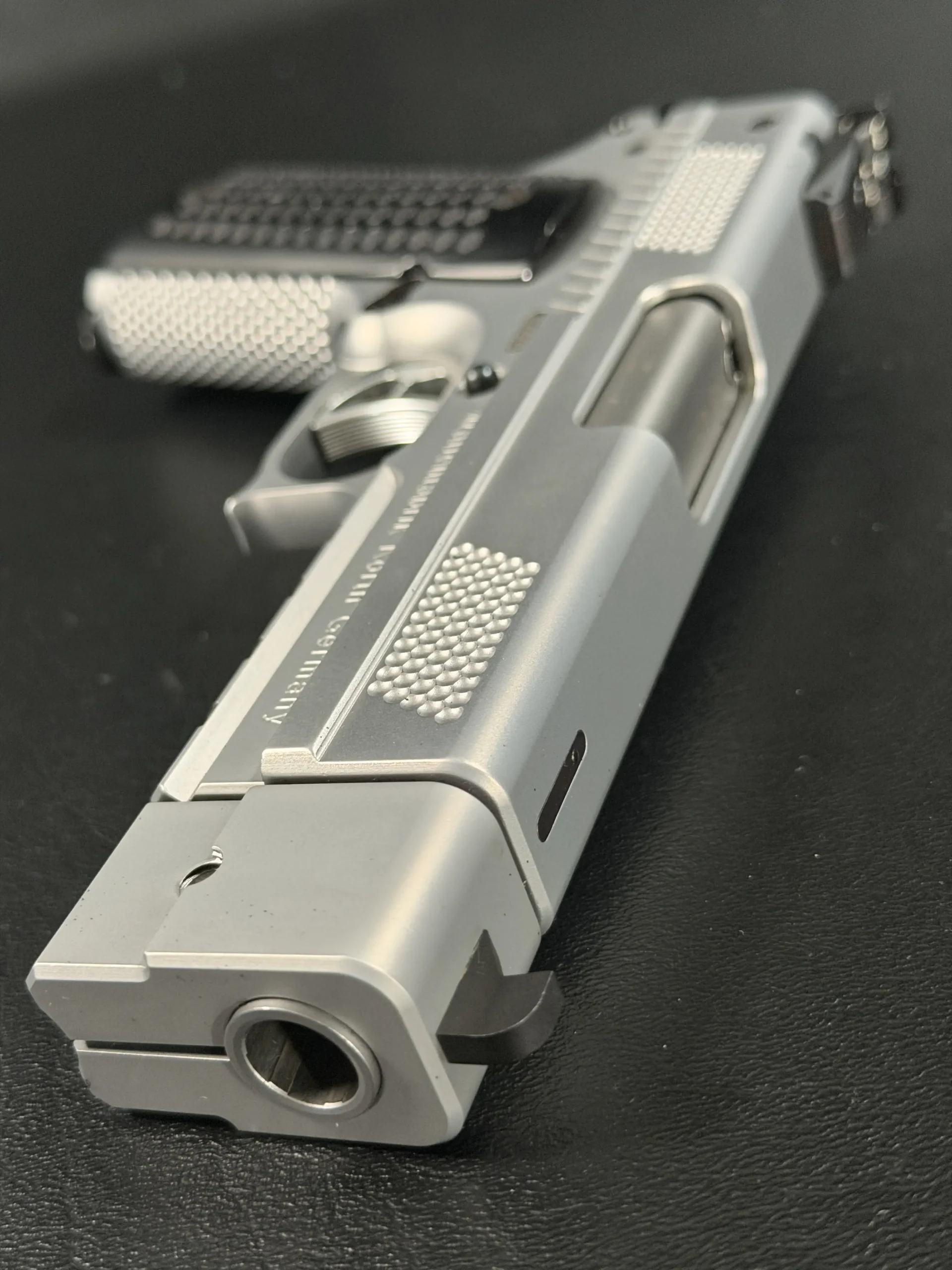 The matte stainless finish gives the slide and frame a smooth, satin appearance, complemented by Korth checkering panels at the front and rear of the slide for added texture and visual contrast. Chambered in .45 ACP, this example features a match barrel and a fitted compensator, along with a heavy dust cover and integrated accessory rail that add both functionality and a commanding profile.