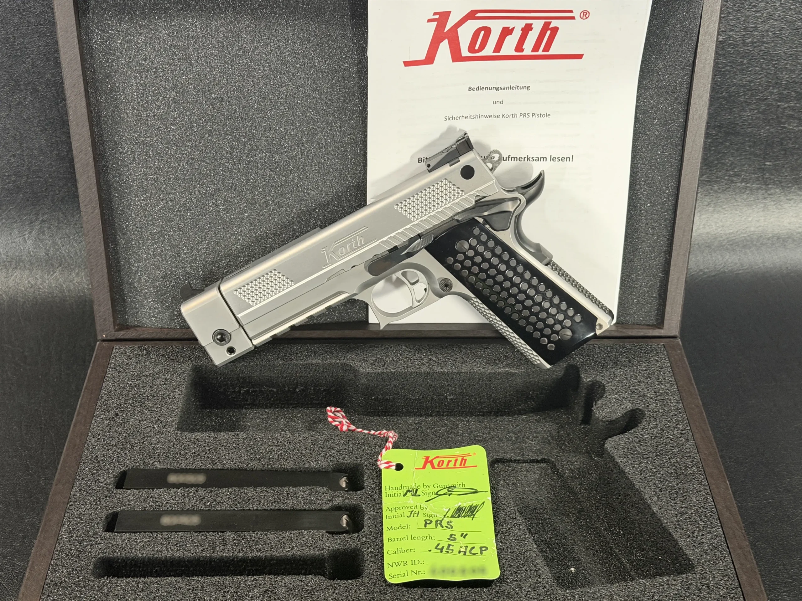 This pistol is accompanied by its factory presentation case and accessories, with documentation and included components present as part of the set. For those drawn to premium modern handguns with distinctive design and meticulous finishing, the Korth PRS Stainless 5" .45 ACP makes a strong impression.