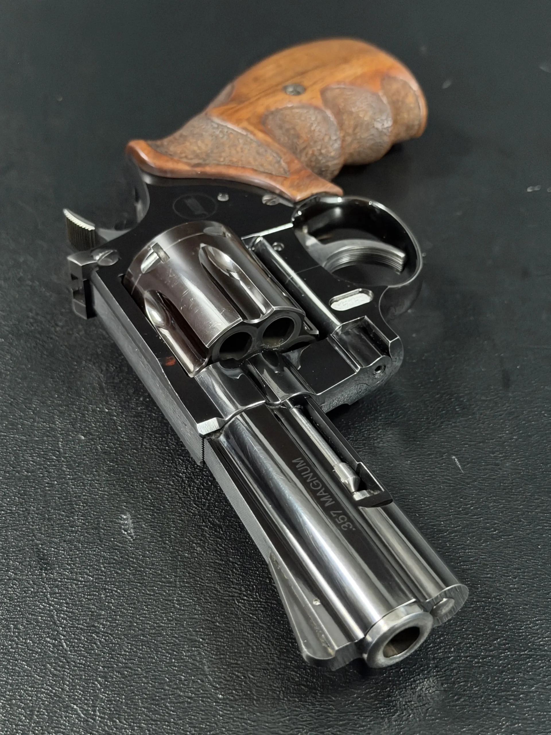 Finished in high-polish blued steel, the revolver shows the clean lines and careful machining expected of the model. The frame, barrel, and cylinder are described as matching, and it is fitted with contoured wooden combat grips that complement both its handling and overall presentation.