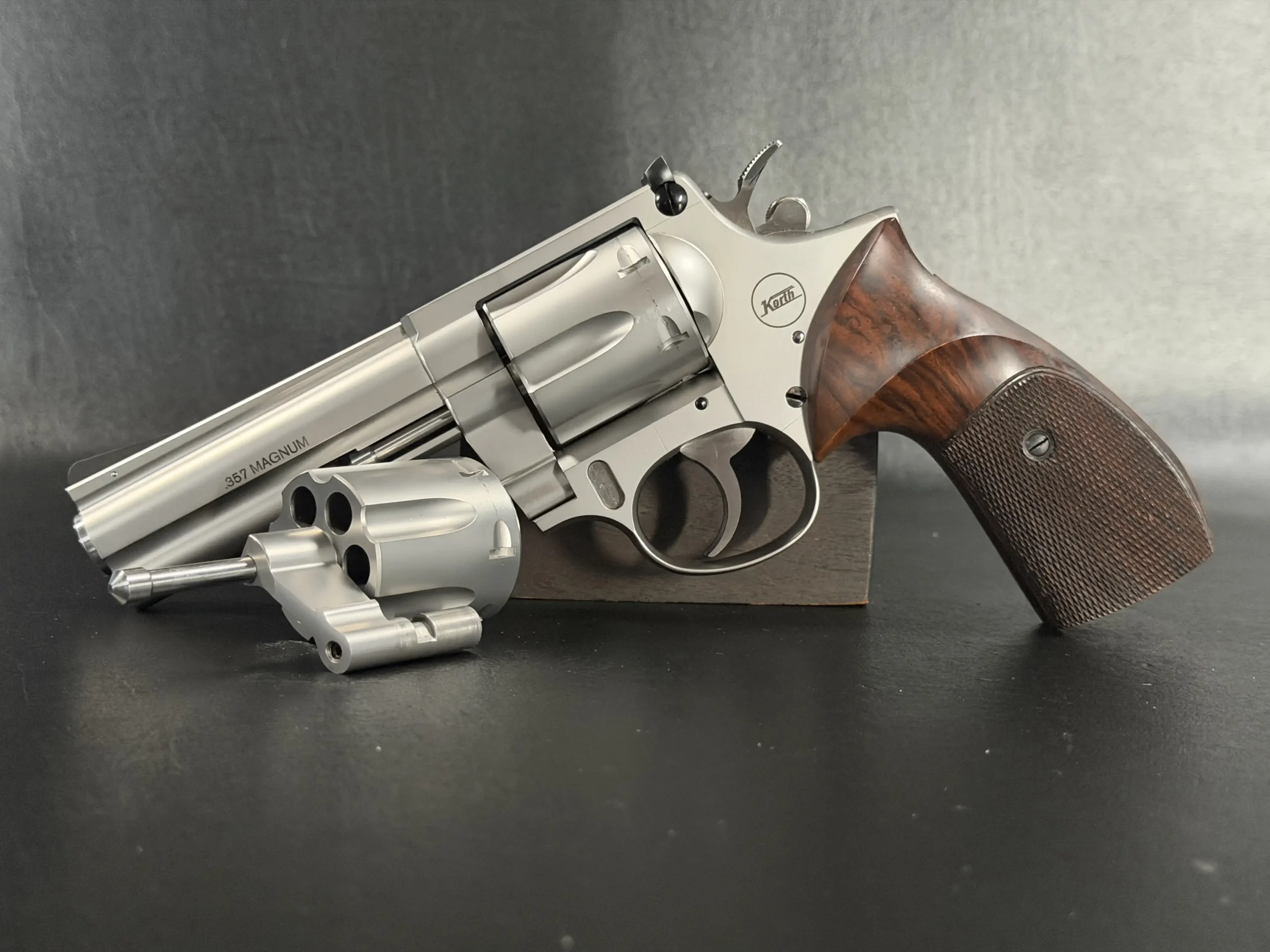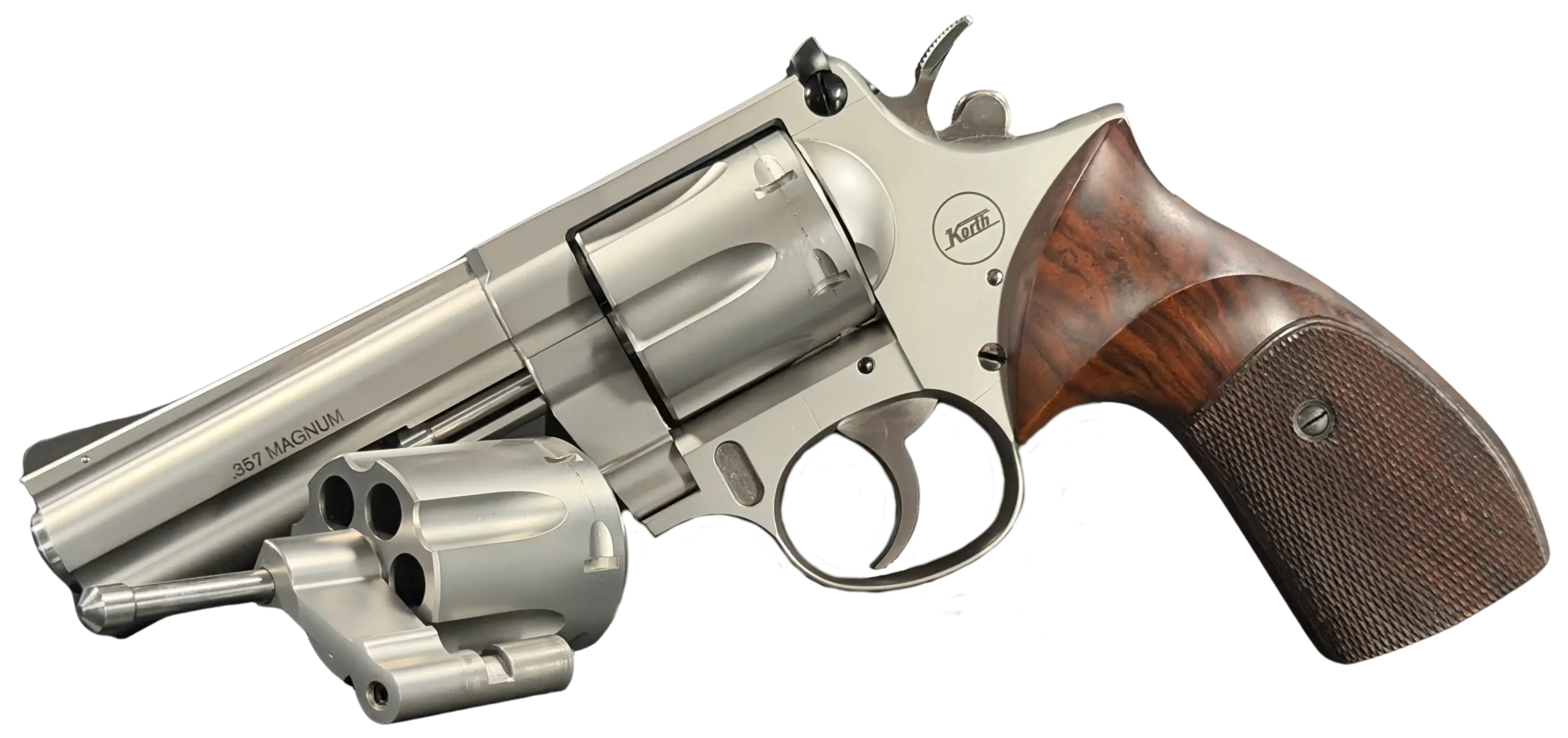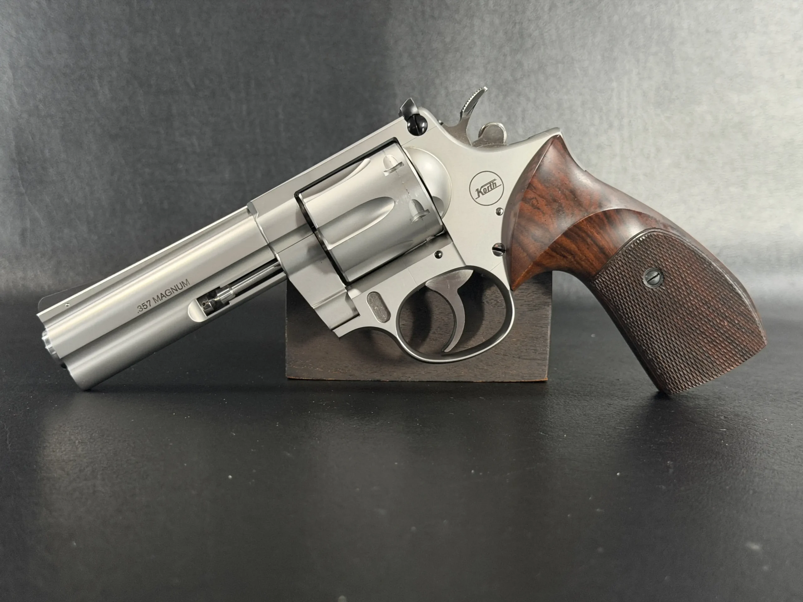 The Korth Ratzeburg Combat 4″ Stainless is a German-made revolver built in stainless steel and chambered in .357 Magnum. This example includes an additional 9mm cylinder, giving the platform a dual-caliber configuration while retaining the distinctive Combat profile.