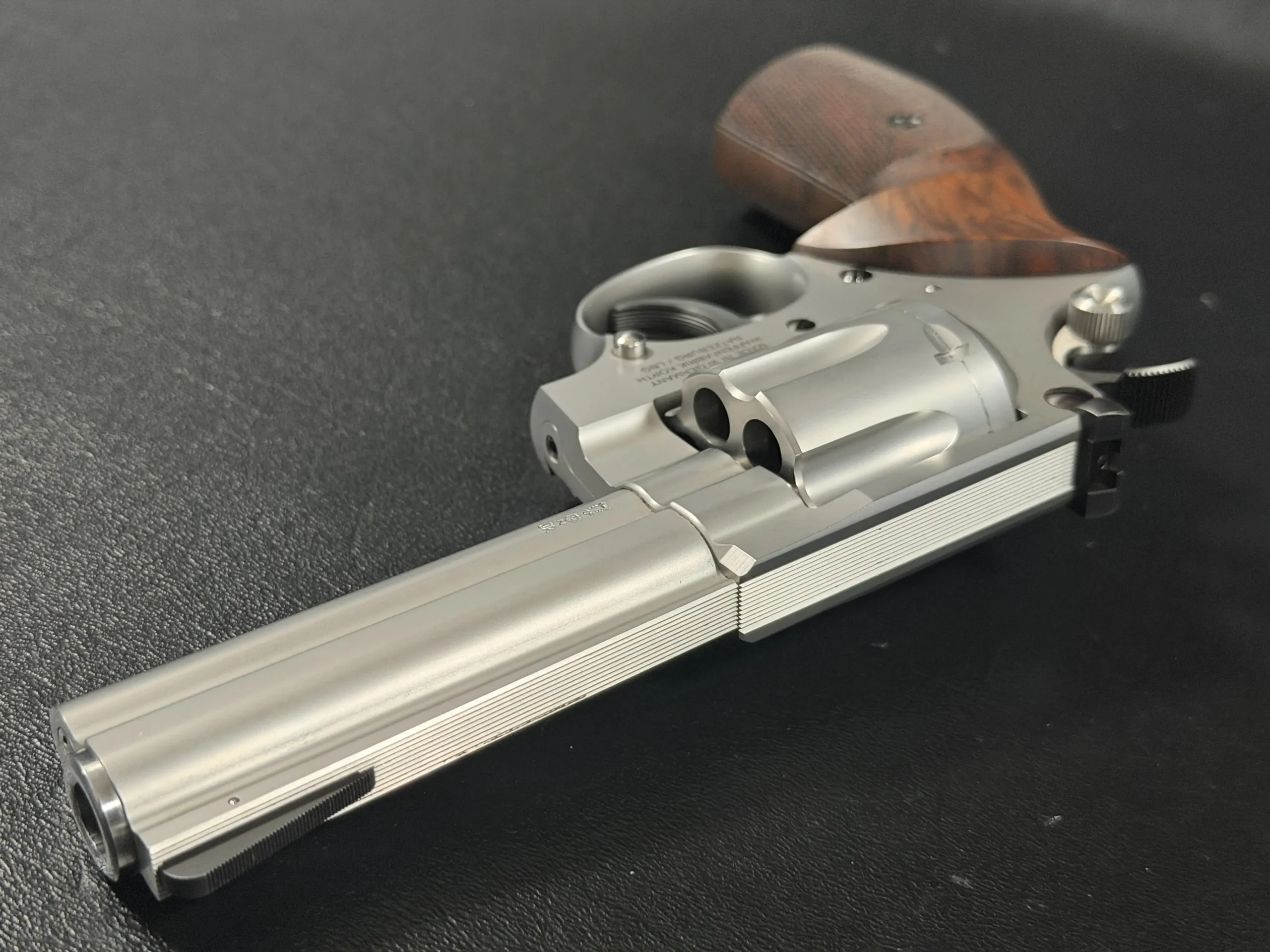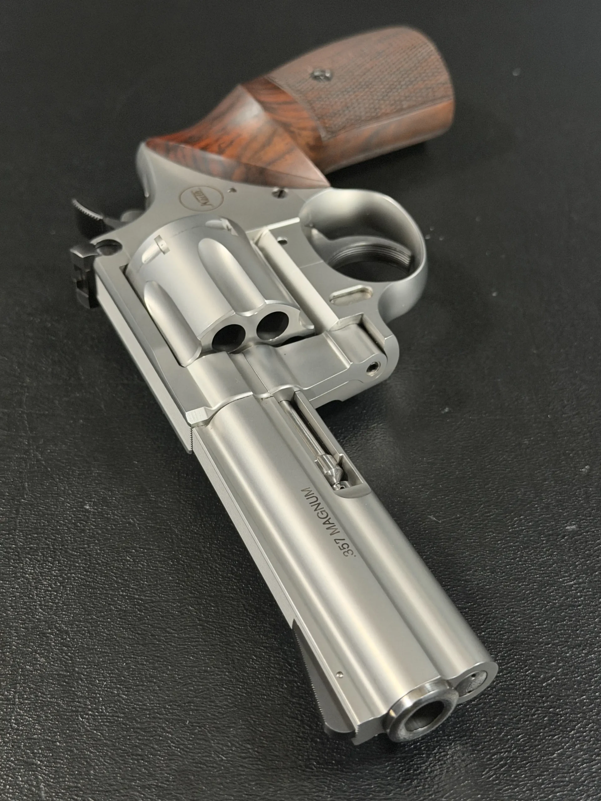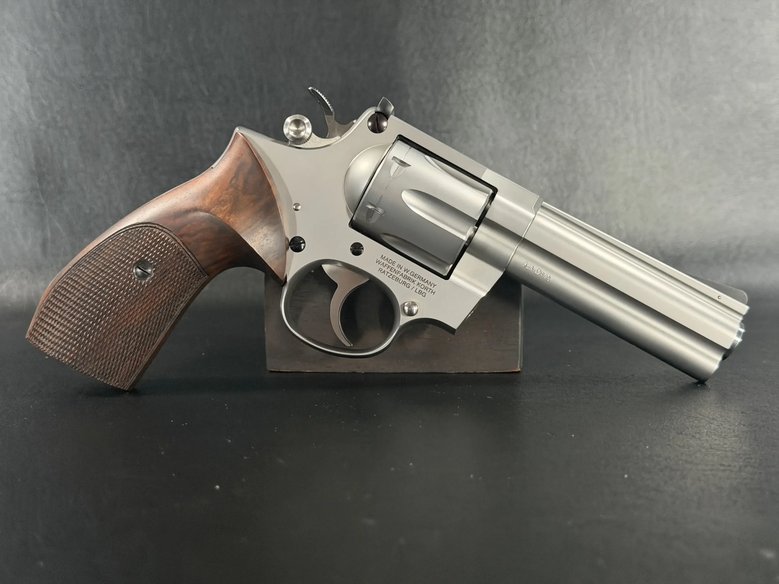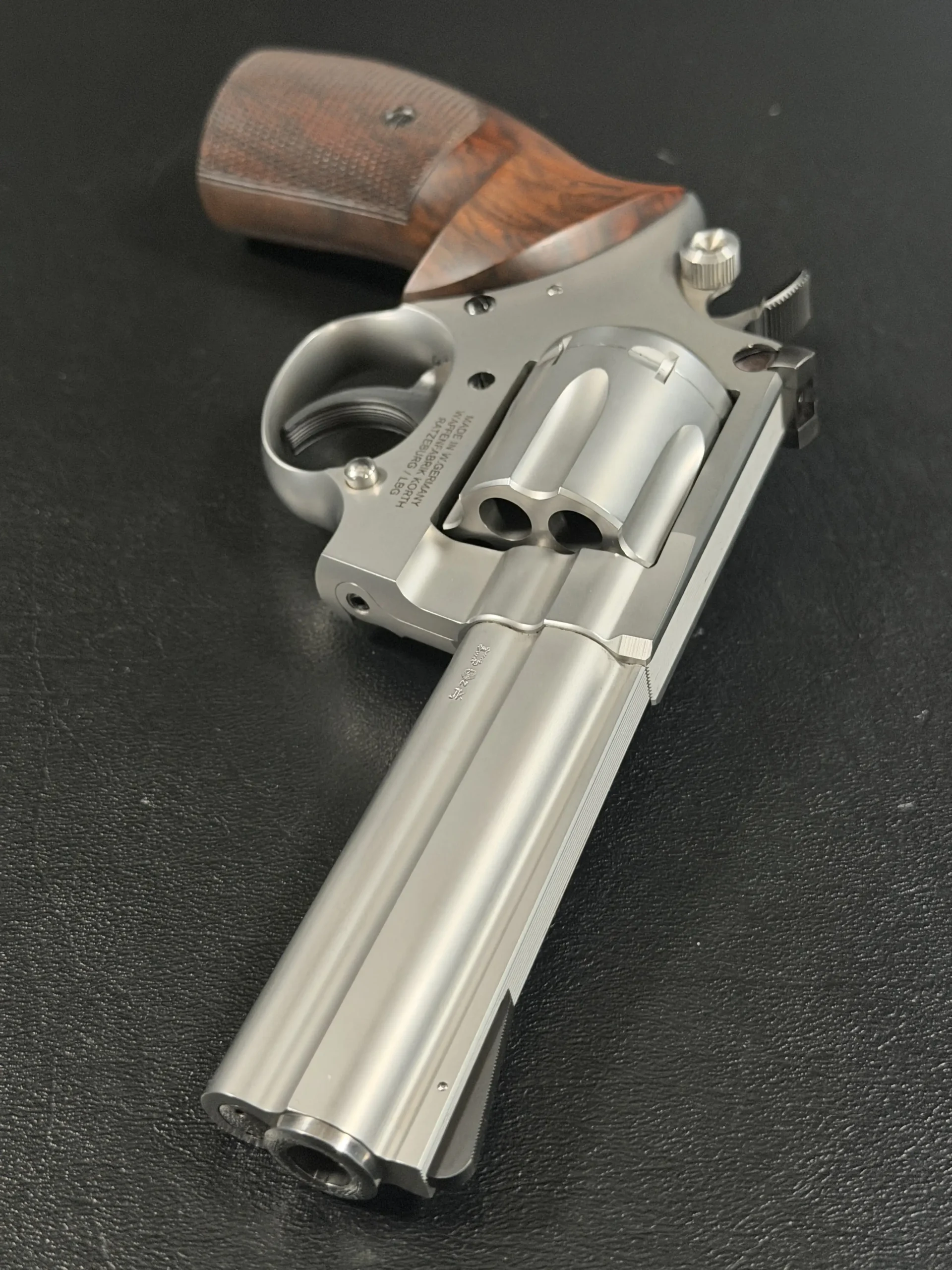 The revolver features a satin stainless finish, a 4-inch barrel with full underlug, a fluted cylinder, and a precision-cut top rib. Richly figured wood grips add warmth and contrast to the brushed steel, giving the revolver a refined, balanced presentation.