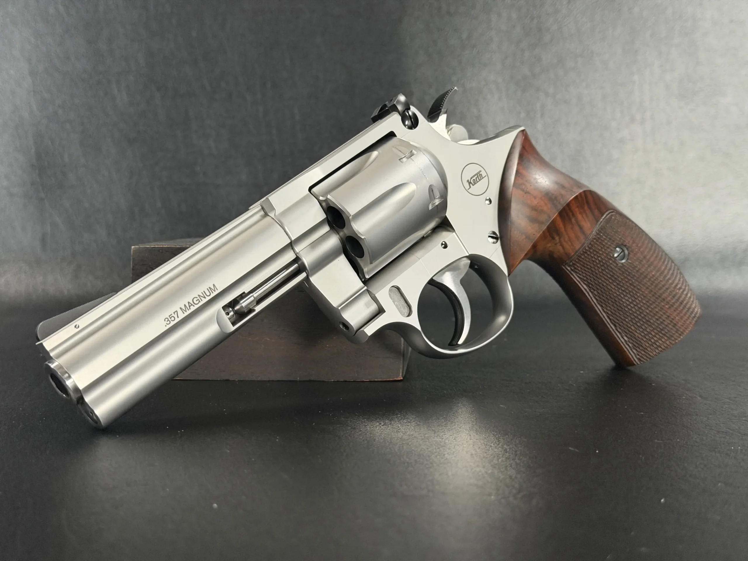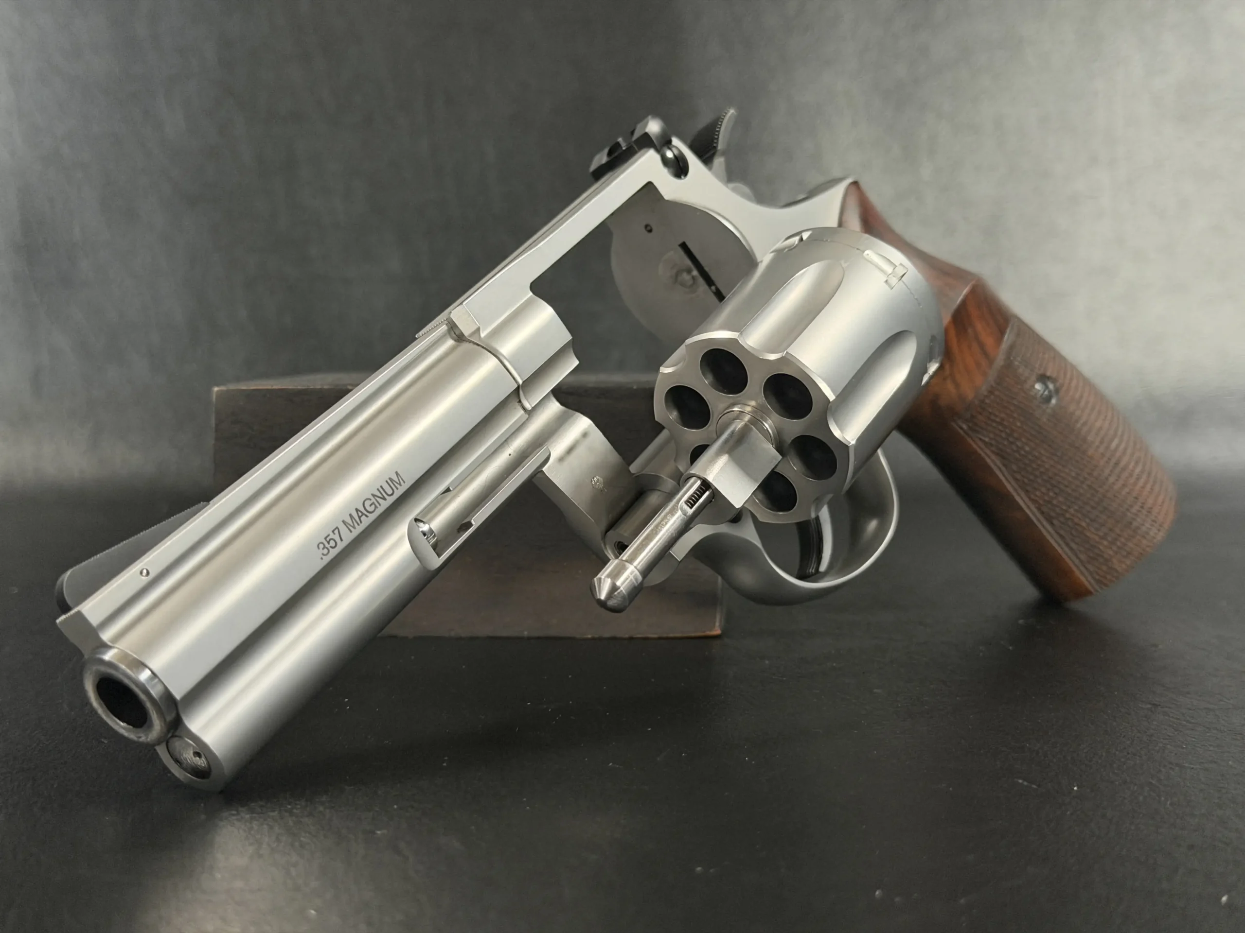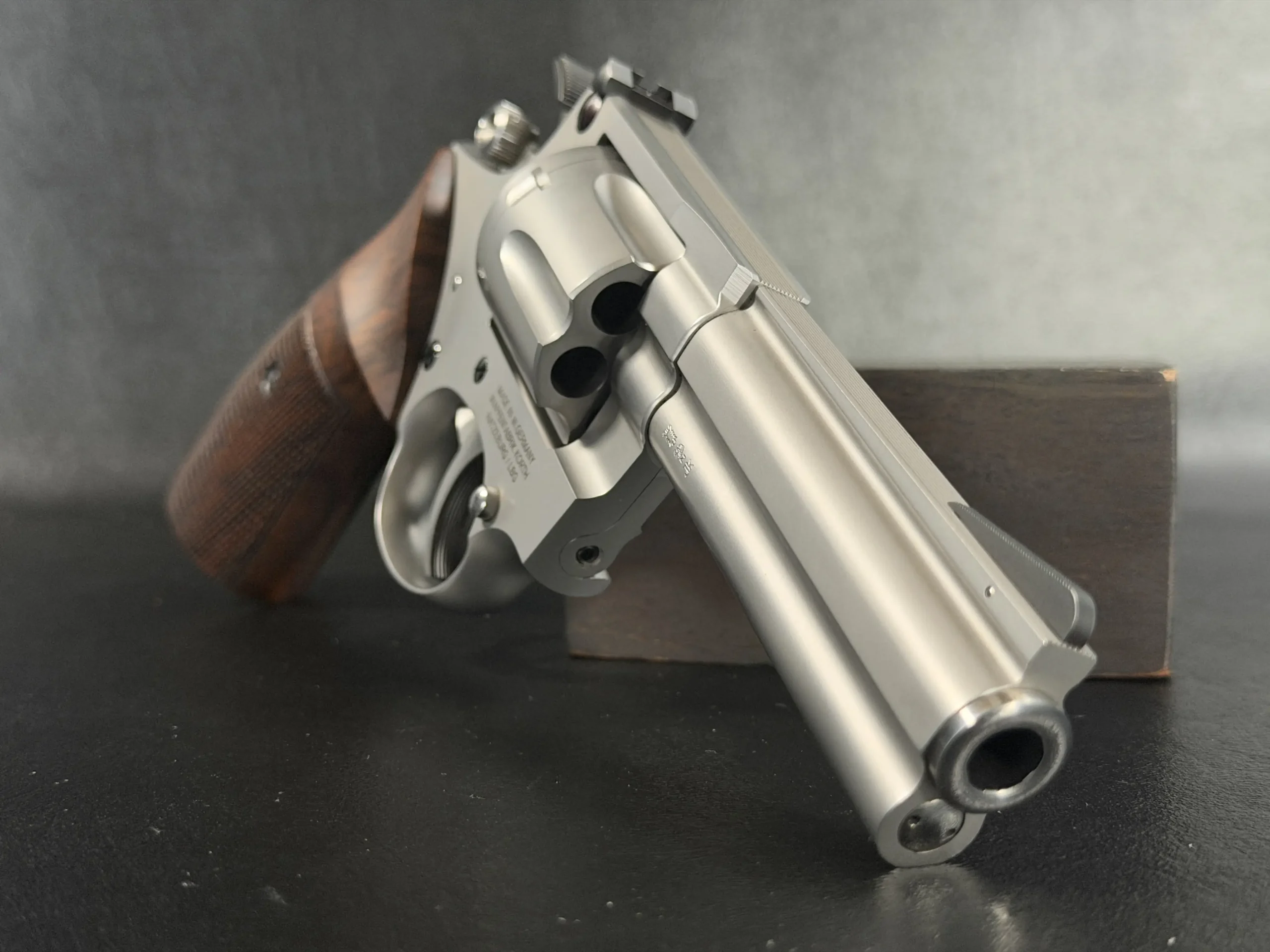 The revolver features a satin stainless finish, a 4-inch barrel with full underlug, a fluted cylinder, and a precision-cut top rib. Richly figured wood grips add warmth and contrast to the brushed steel, giving the revolver a refined, balanced presentation.