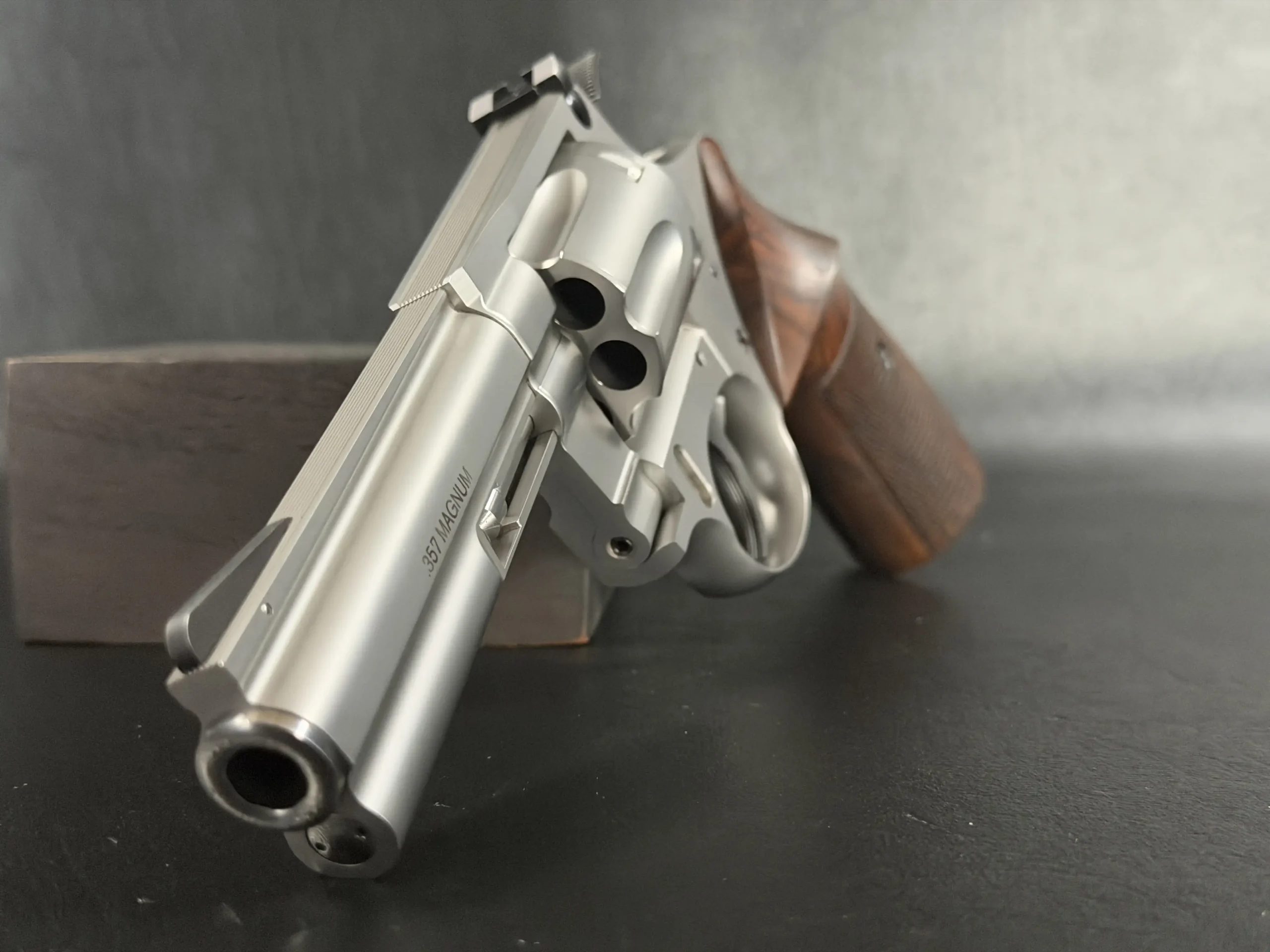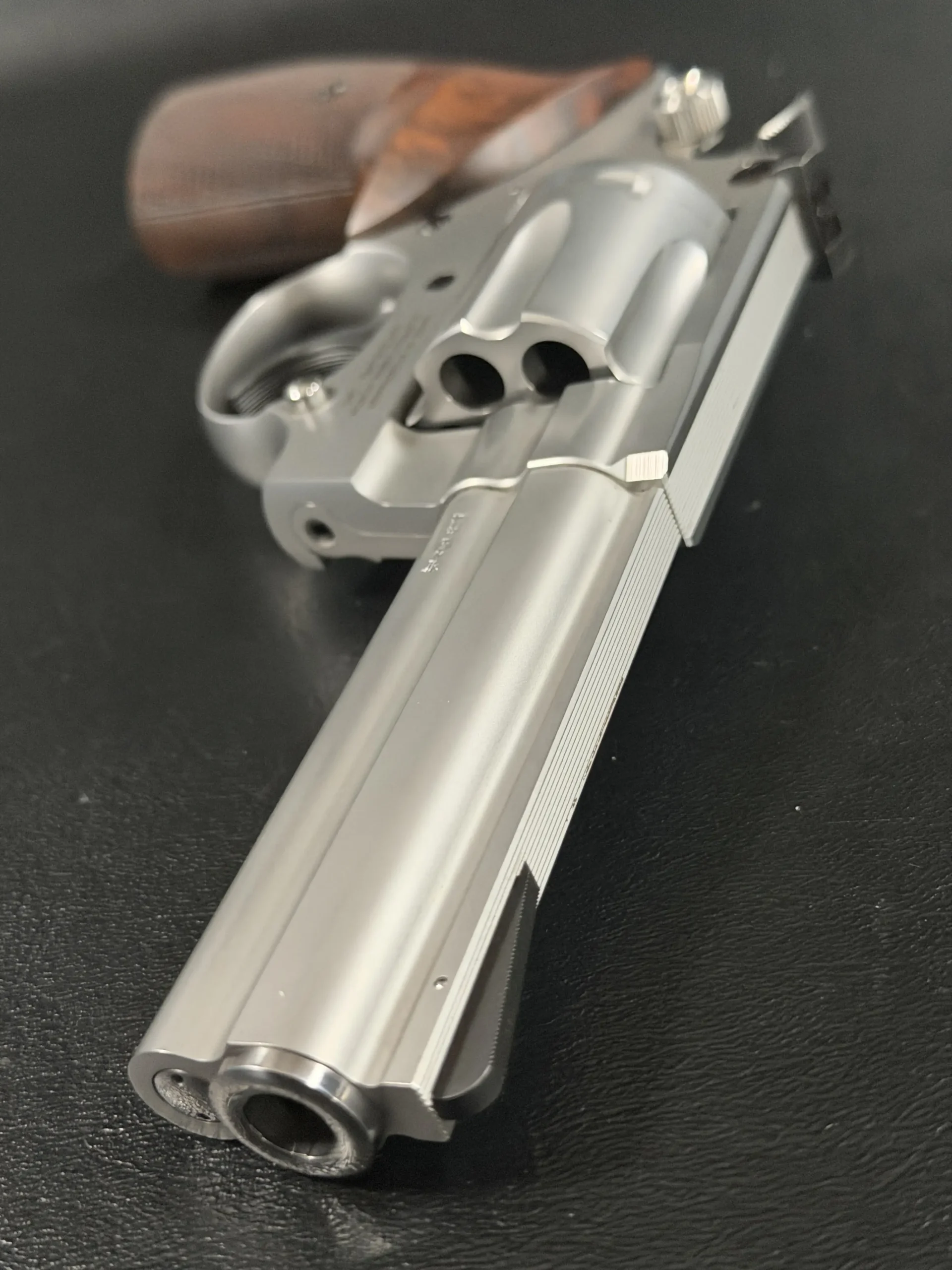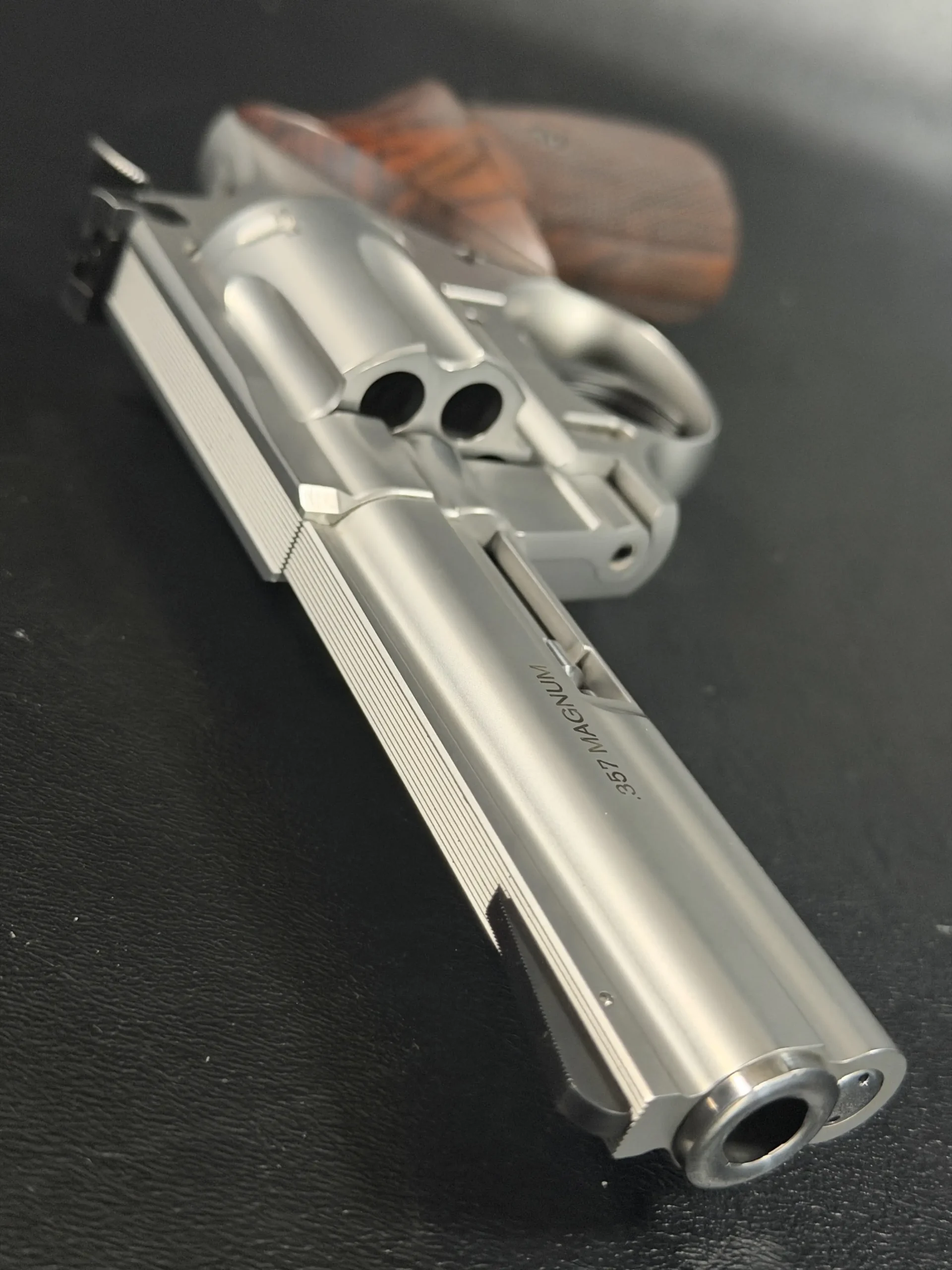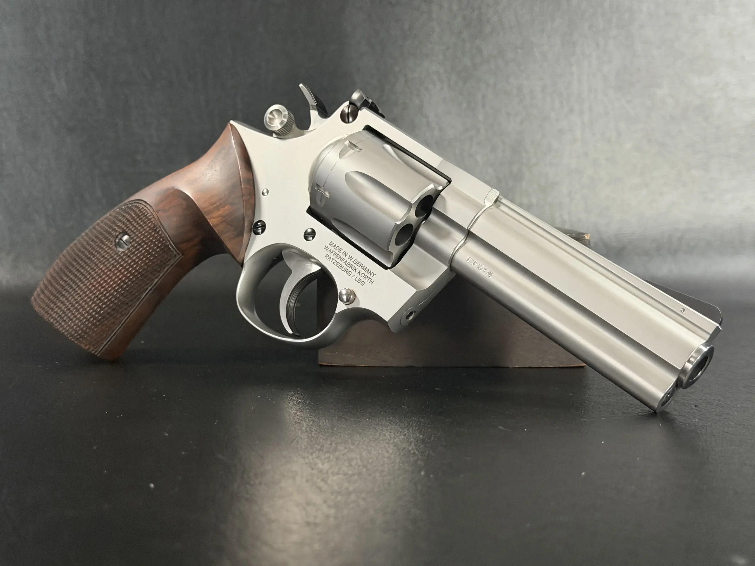 The revolver features a satin stainless finish, a 4-inch barrel with full underlug, a fluted cylinder, and a precision-cut top rib. Richly figured wood grips add warmth and contrast to the brushed steel, giving the revolver a refined, balanced presentation.