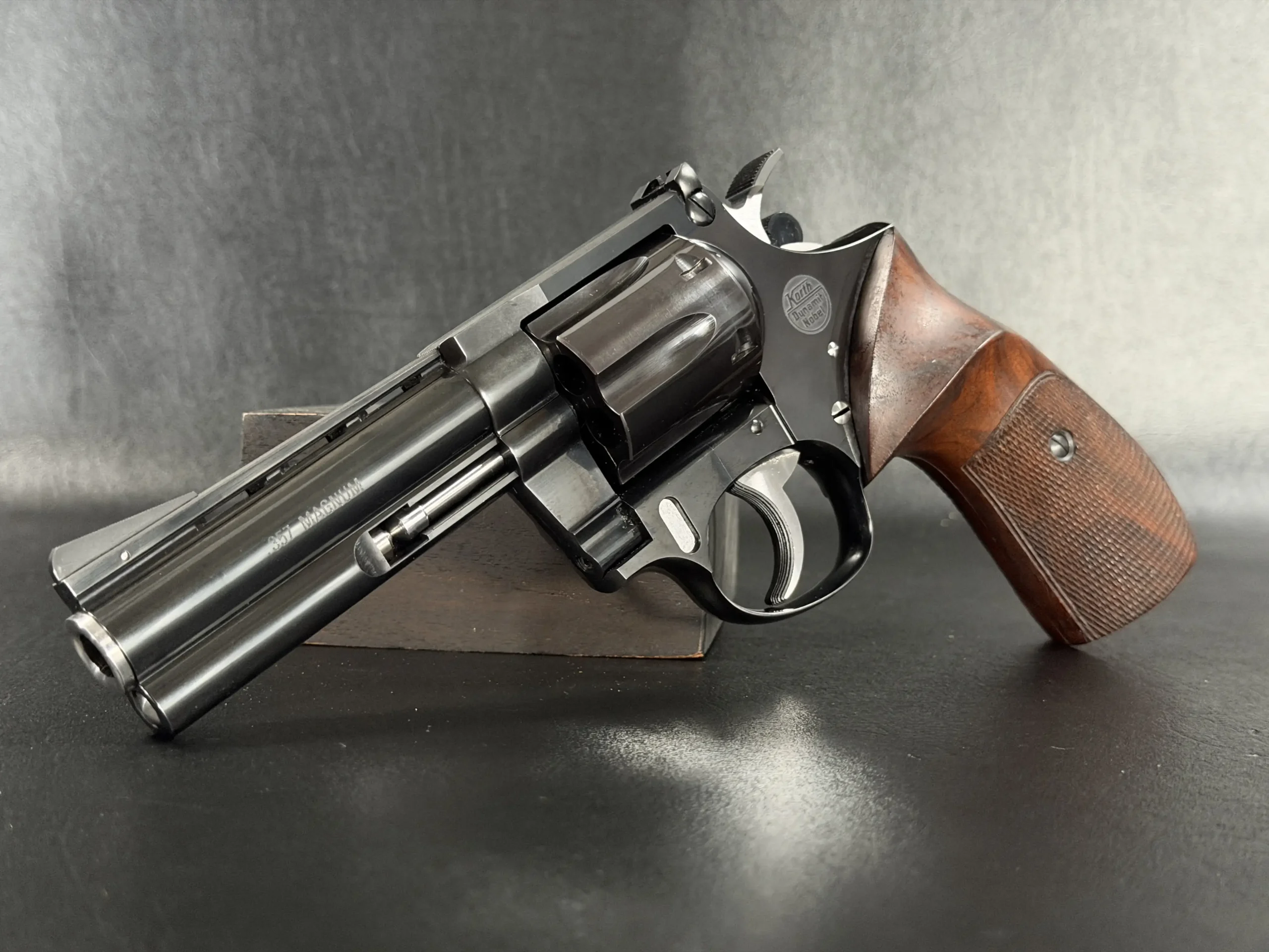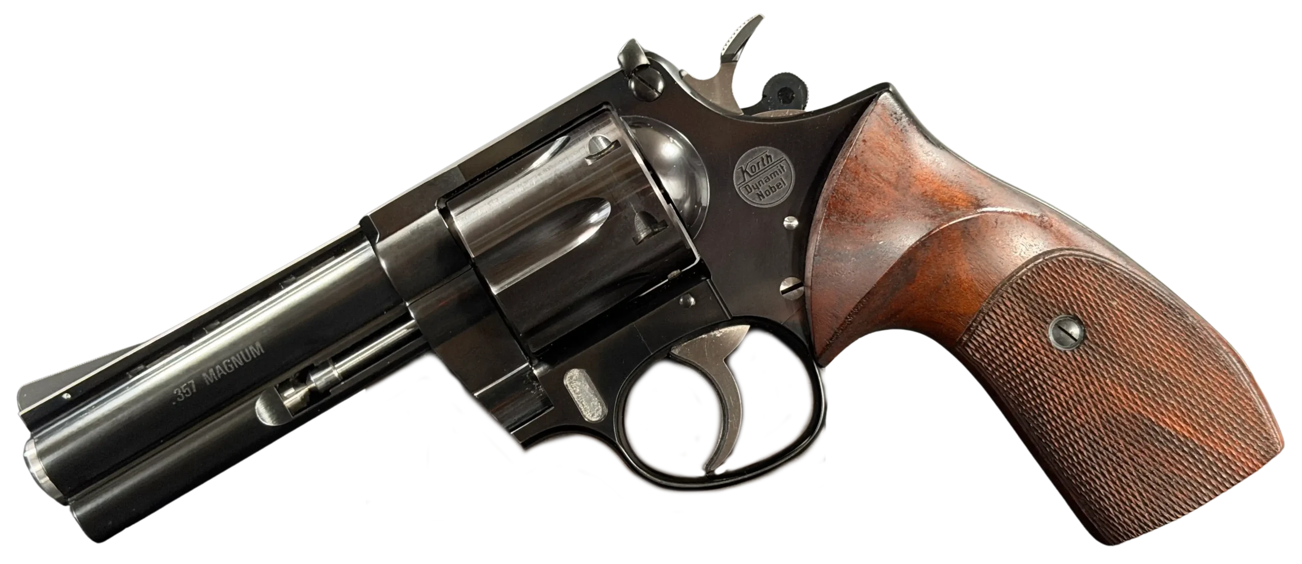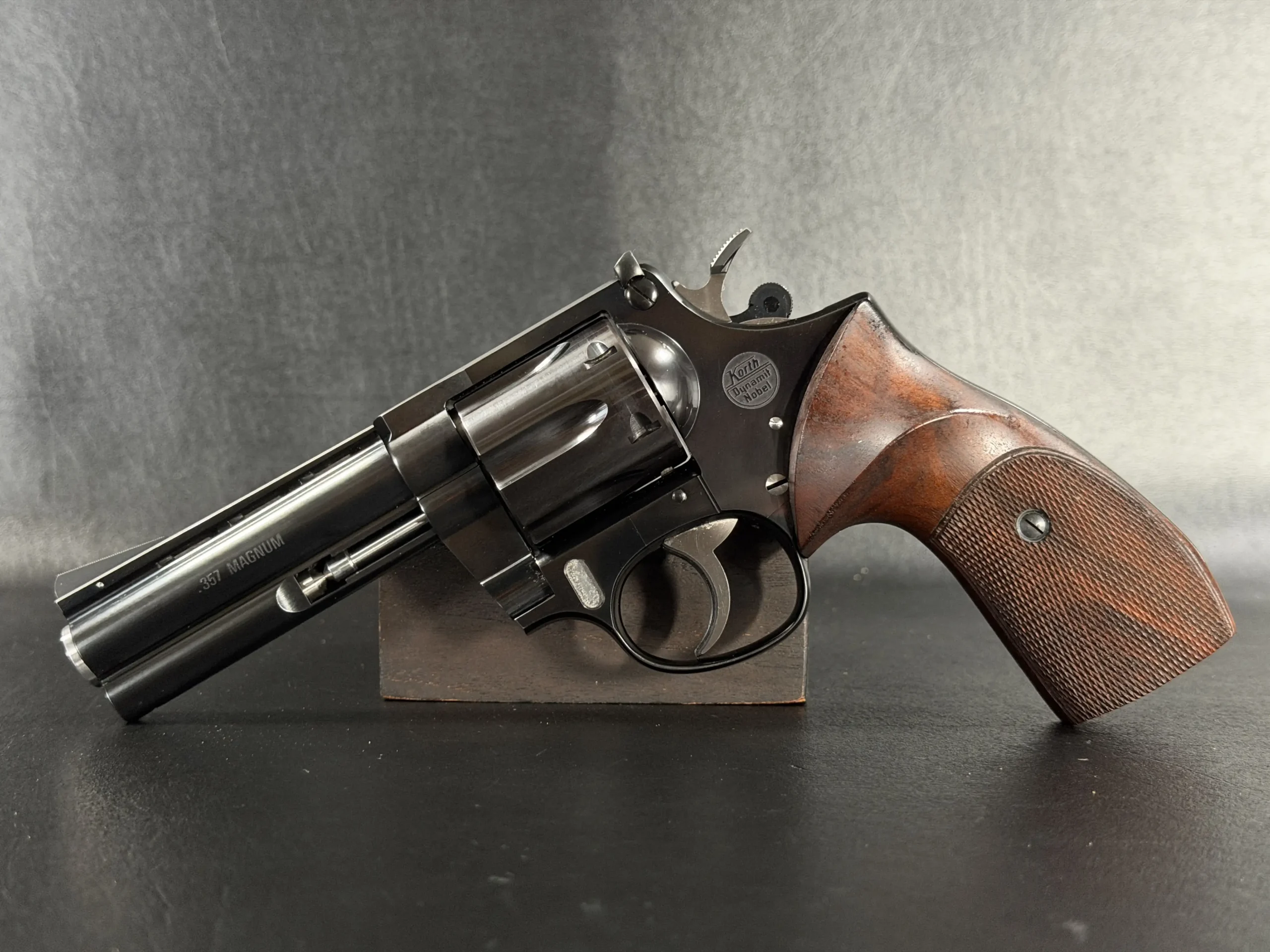 The Korth Ratzeburg Dynamit Nobel Combat is a German-made revolver chambered in .357 Magnum. This Combat configuration pairs precise machining with a purposeful design, finished in high-polish blued steel and fitted with sculpted hardwood grips.