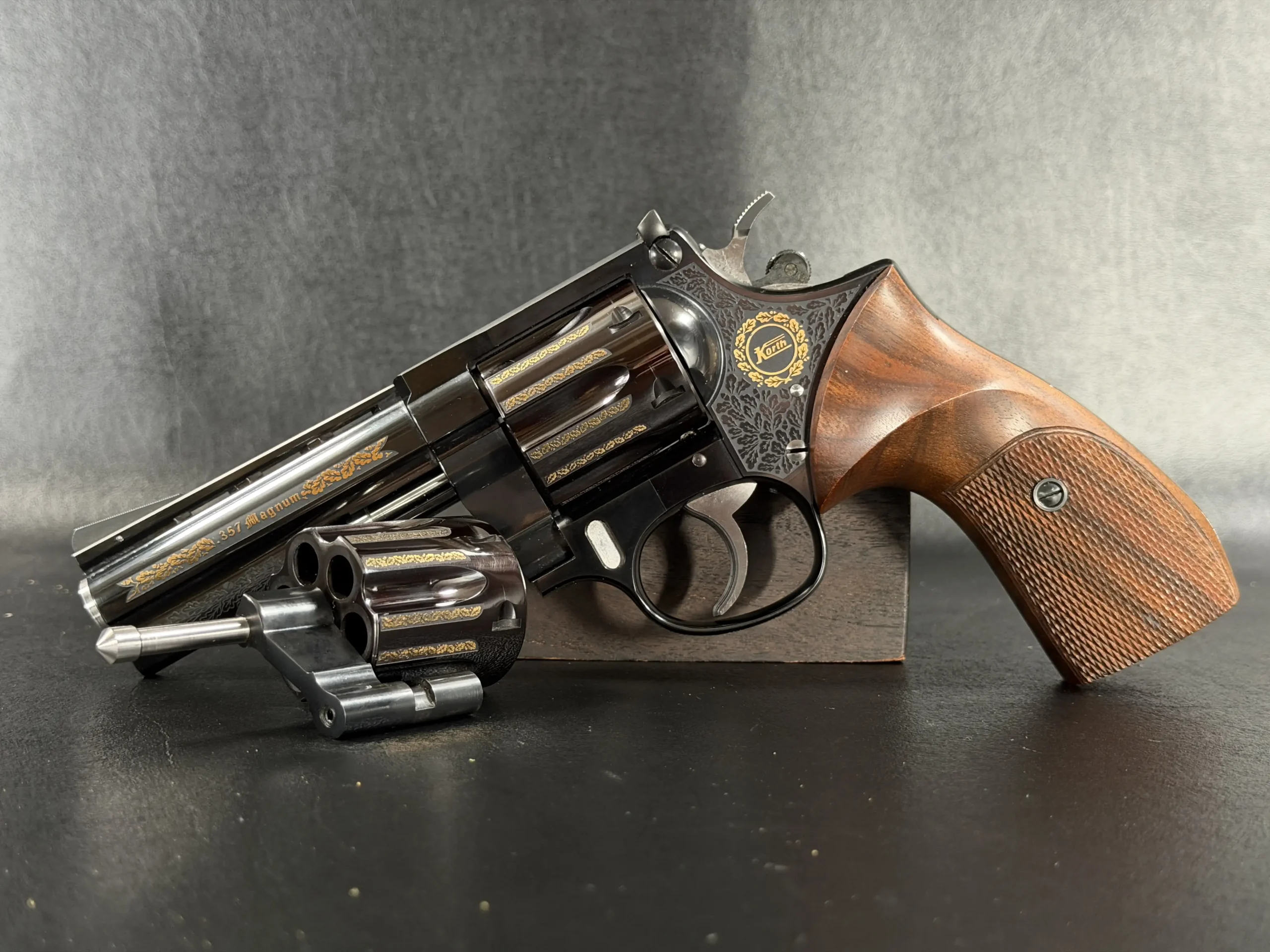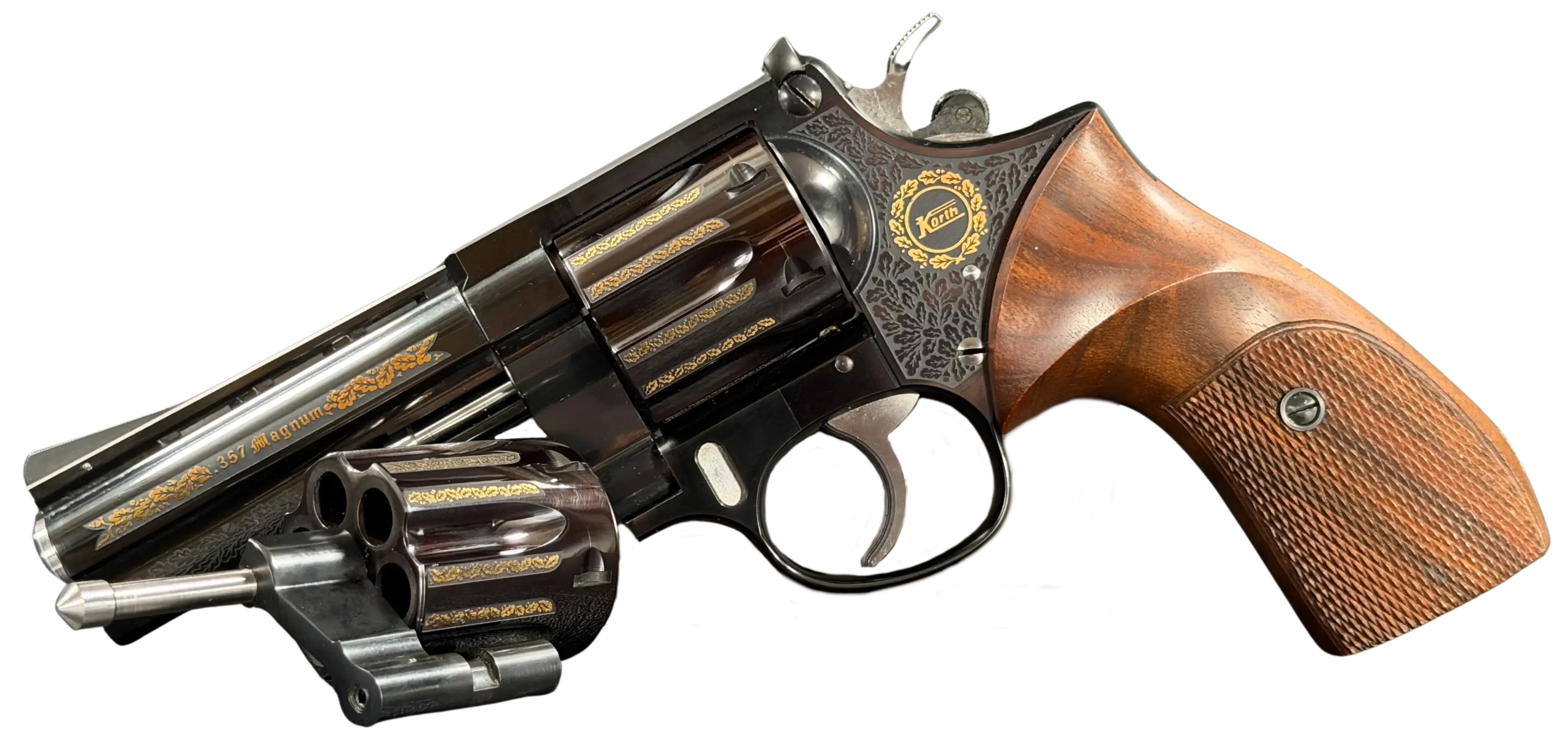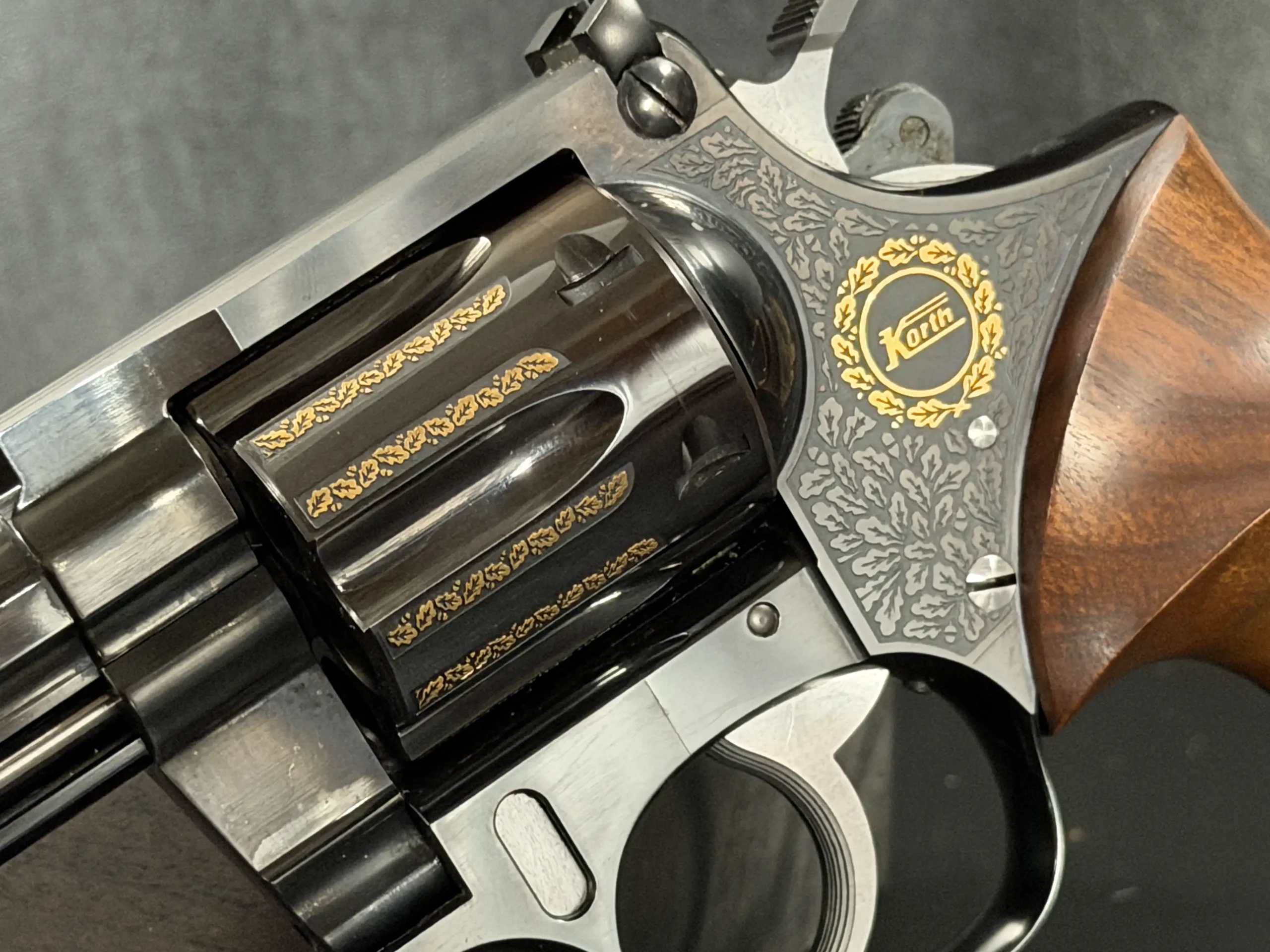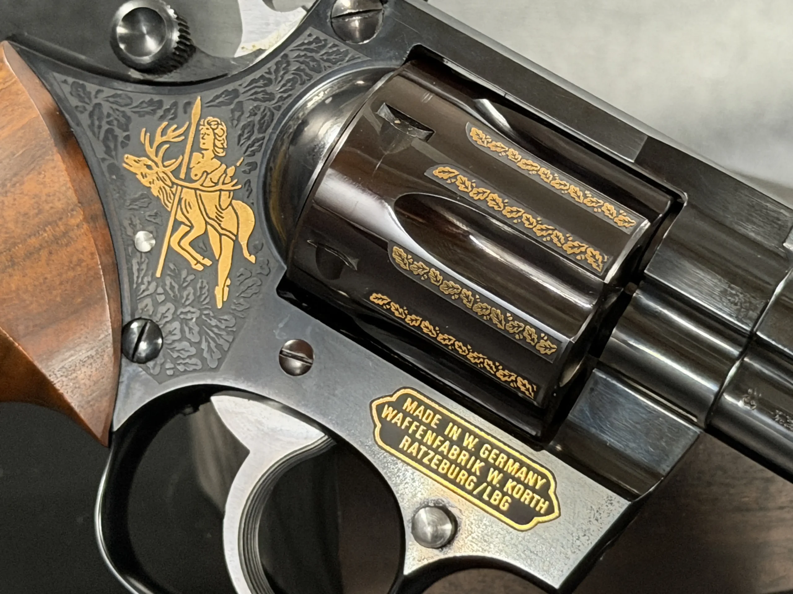 The Korth Ratzeburg Luxury 4" Exchange Cylinder revolver showcases the distinctive fit, finish, and ornamental detailing associated with Korth’s Ratzeburg, West Germany production. Built with a 4-inch barrel, this example is chambered in .357 Magnum and includes a factory 9mm exchange cylinder, offering a dual-caliber configuration within the same set.