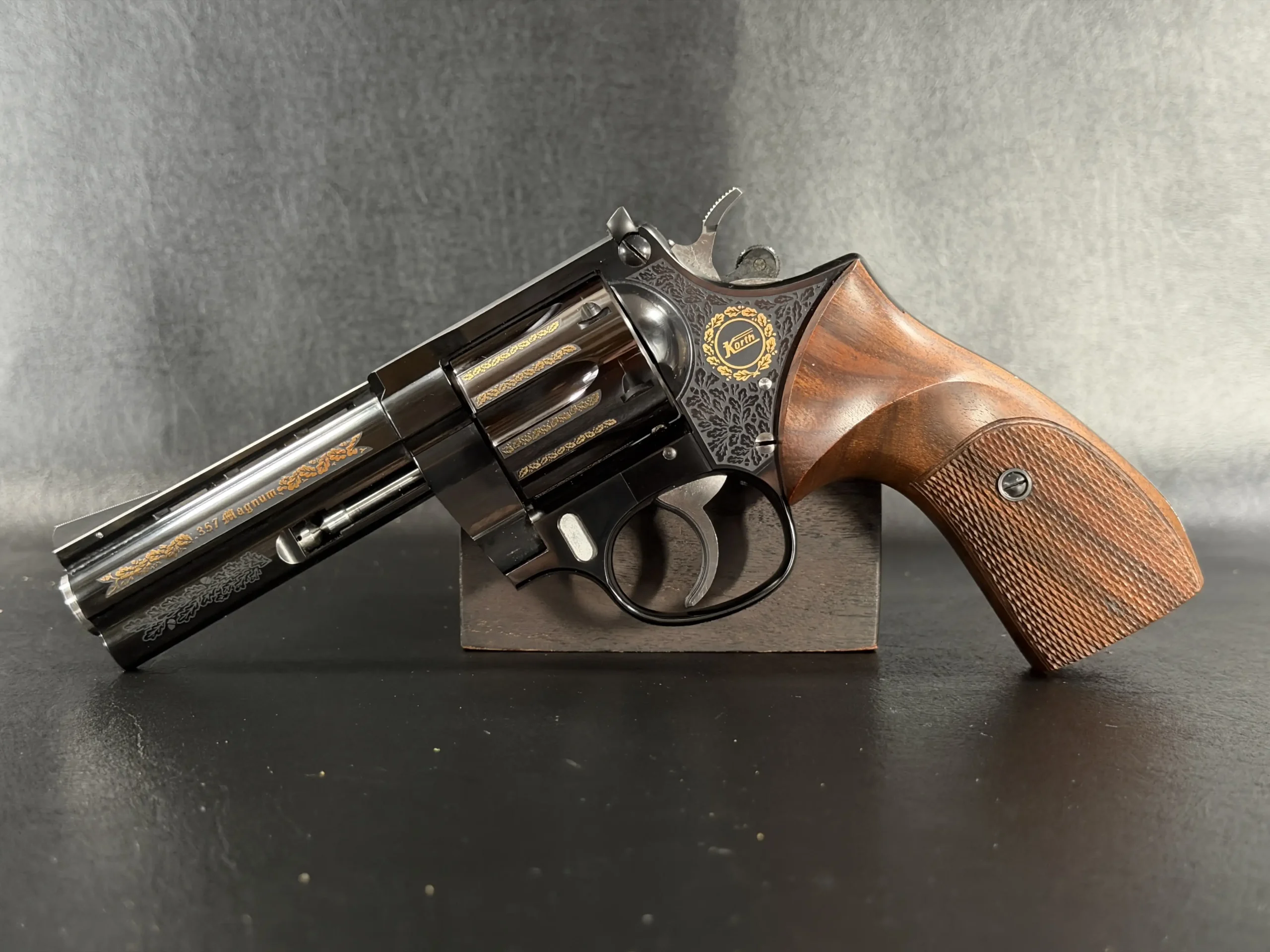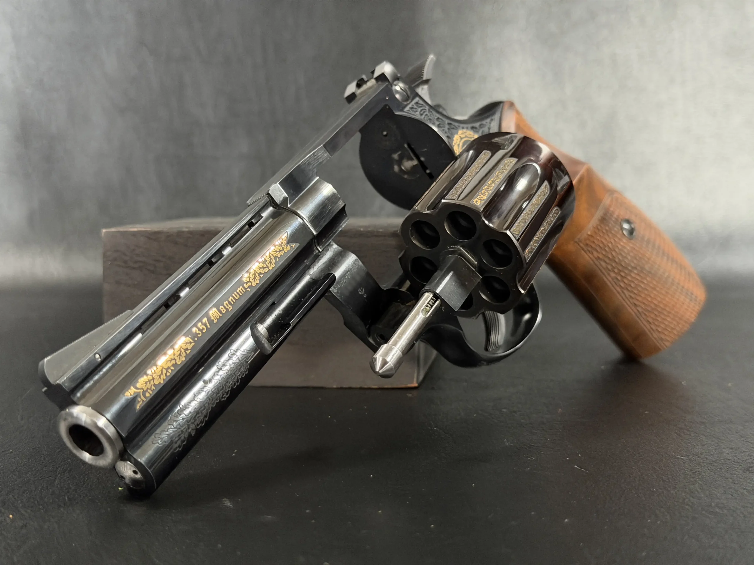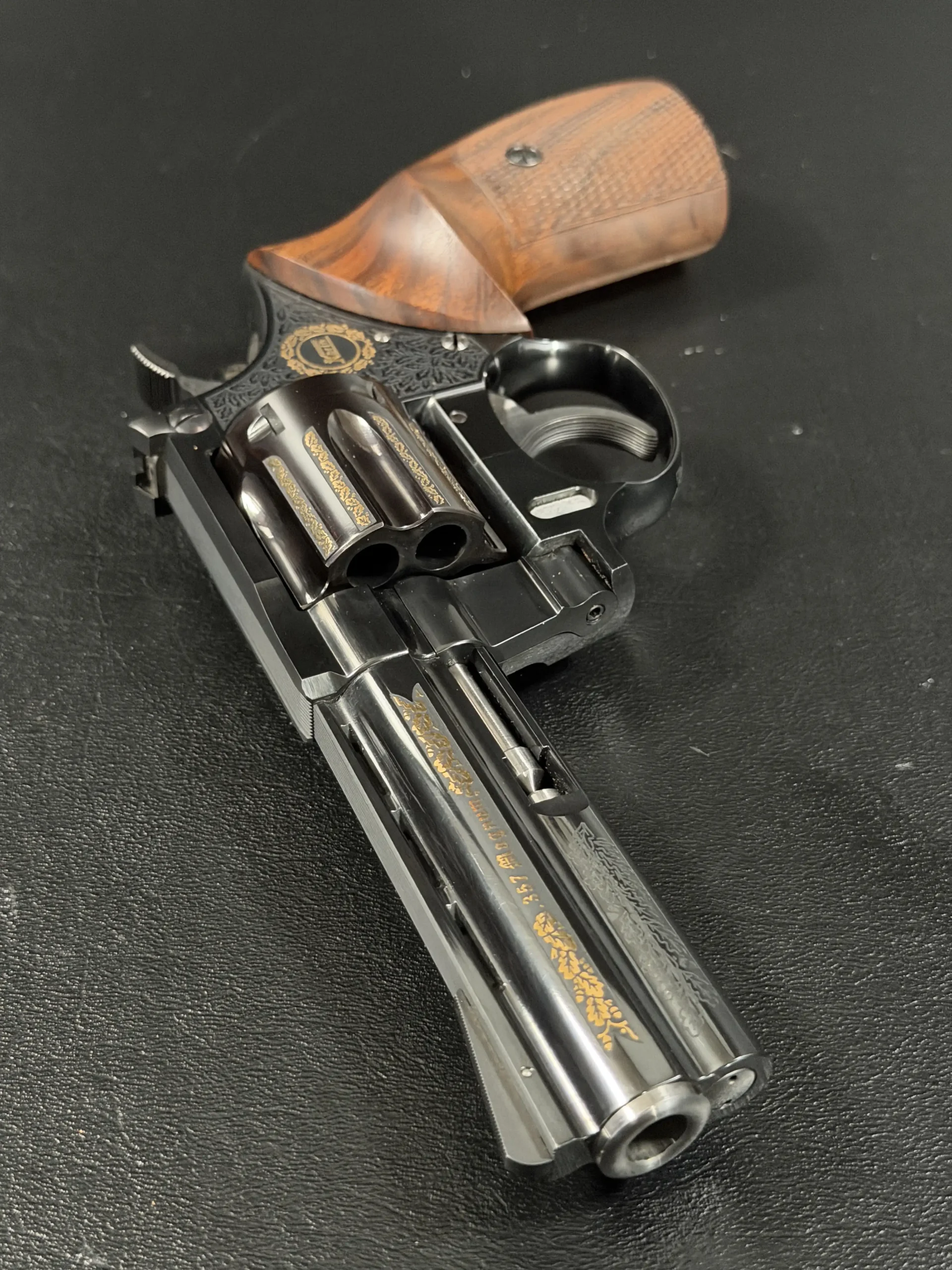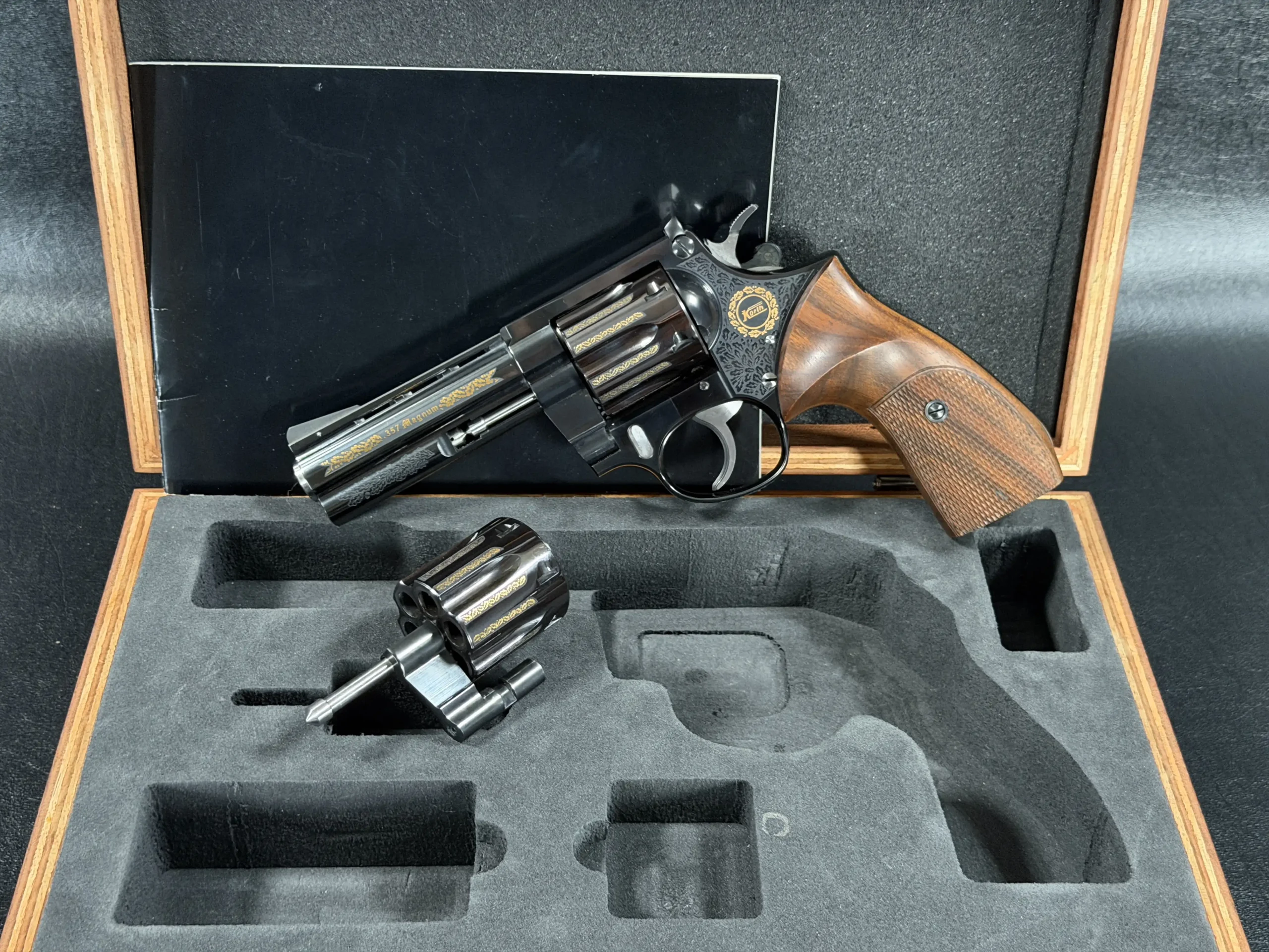 The Korth Ratzeburg Luxury 4" Exchange Cylinder revolver showcases the distinctive fit, finish, and ornamental detailing associated with Korth’s Ratzeburg, West Germany production. Built with a 4-inch barrel, this example is chambered in .357 Magnum and includes a factory 9mm exchange cylinder, offering a dual-caliber configuration within the same set.