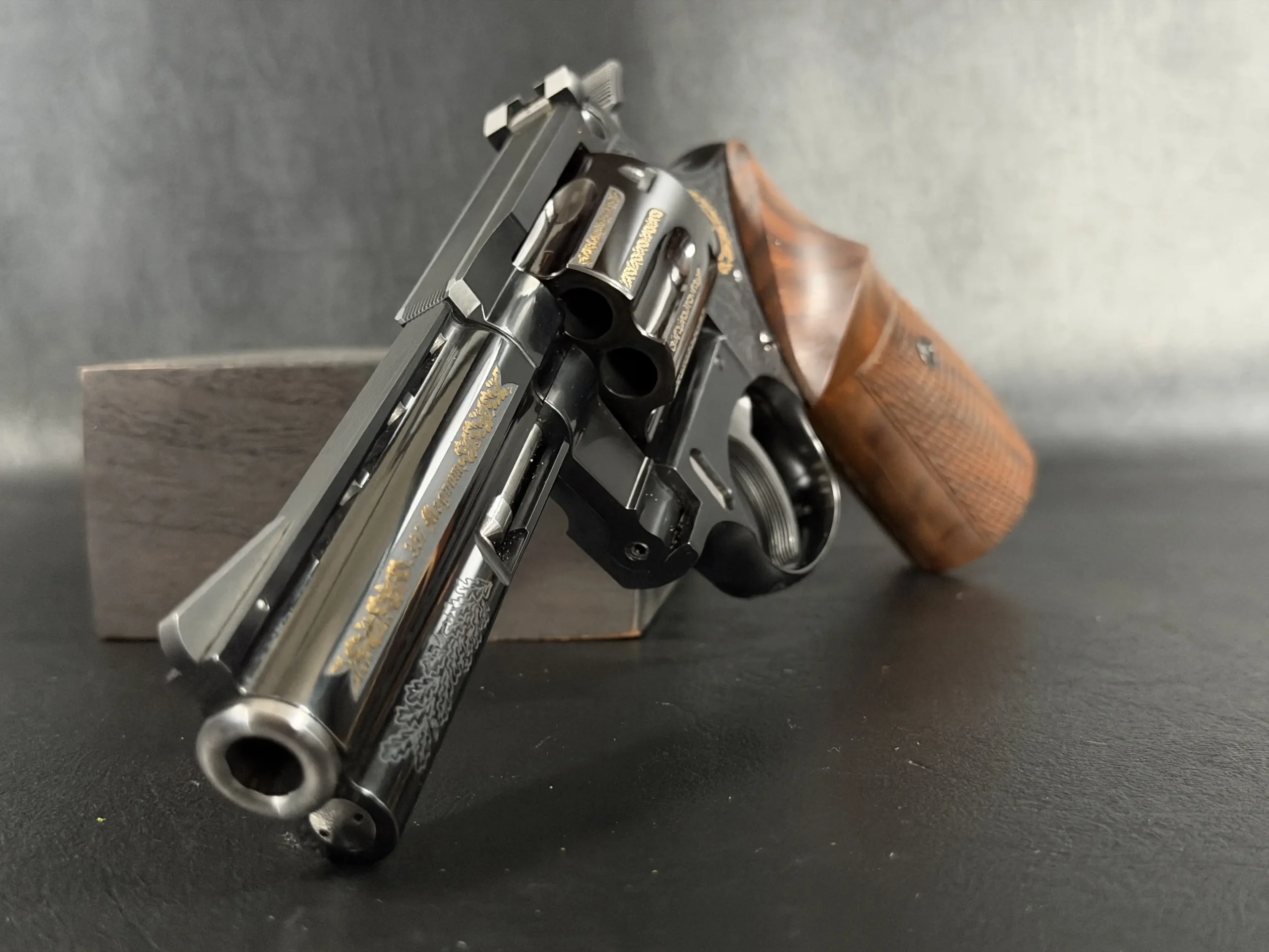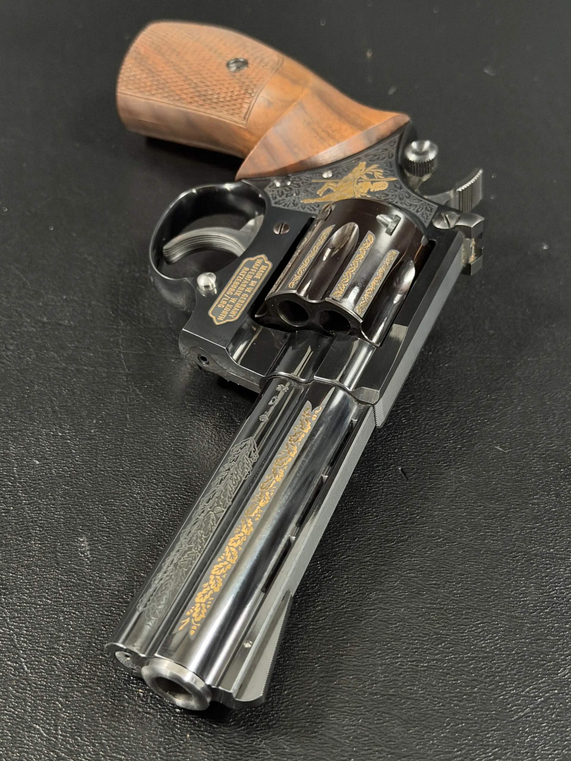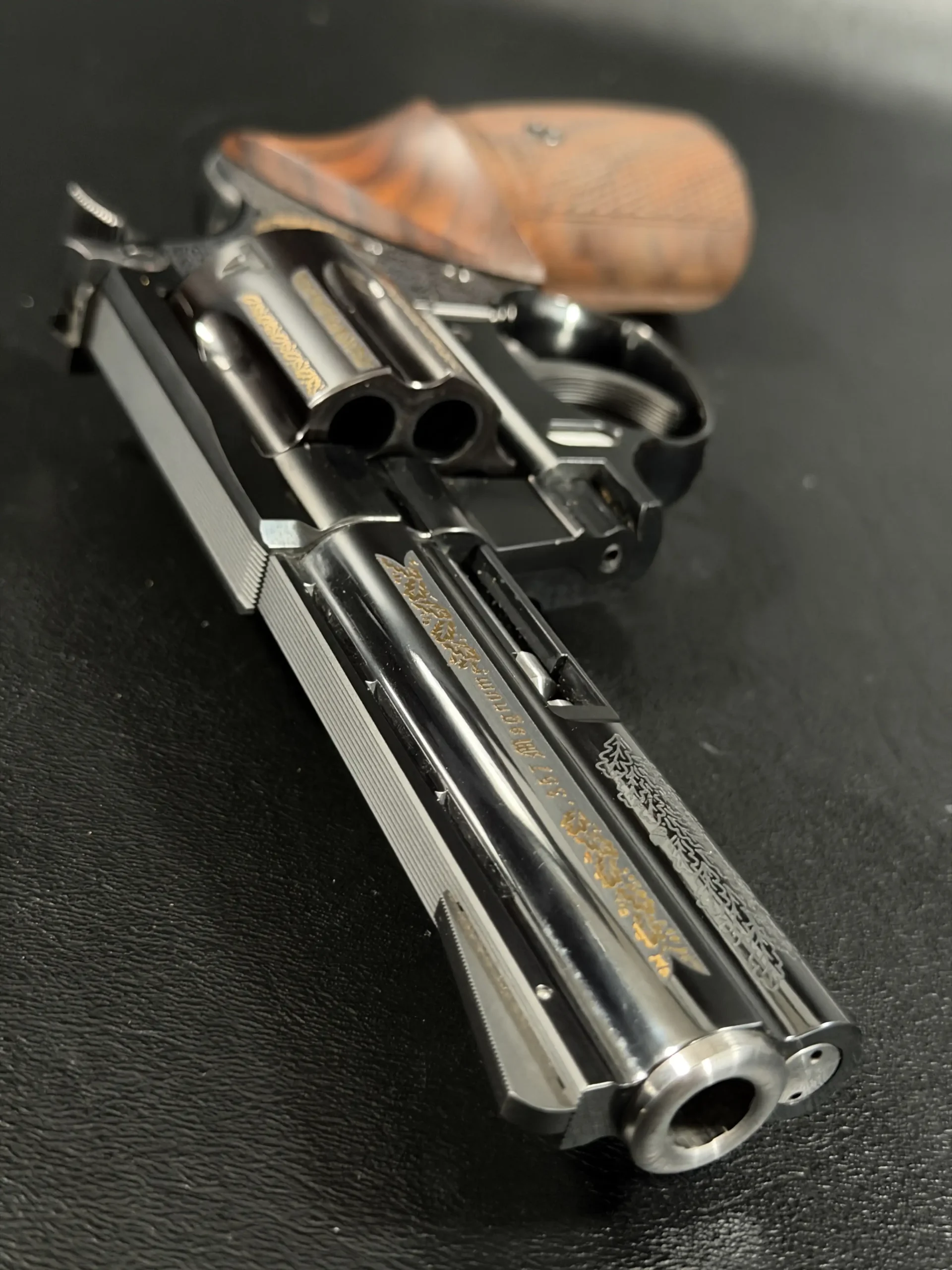 Finely checkered walnut grips complement the polished steel and gold accents, giving the revolver a warm, balanced presentation. The included 9mm exchange cylinder is finished to match the primary .357 Magnum cylinder, maintaining visual continuity across the set.