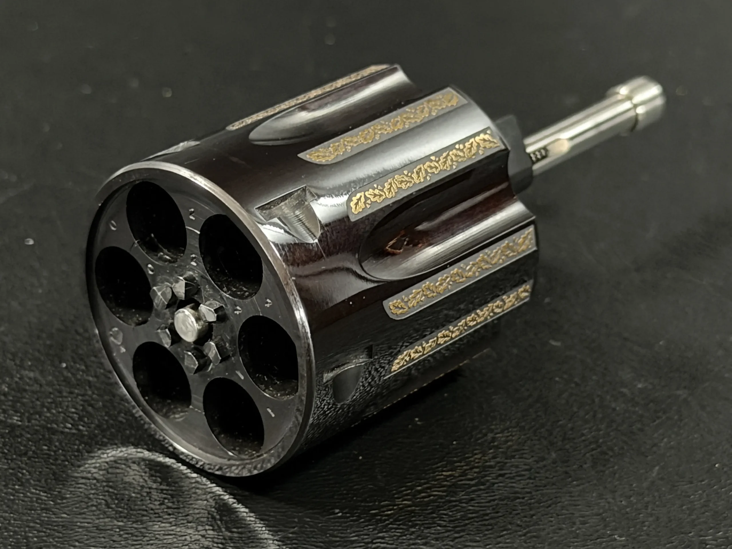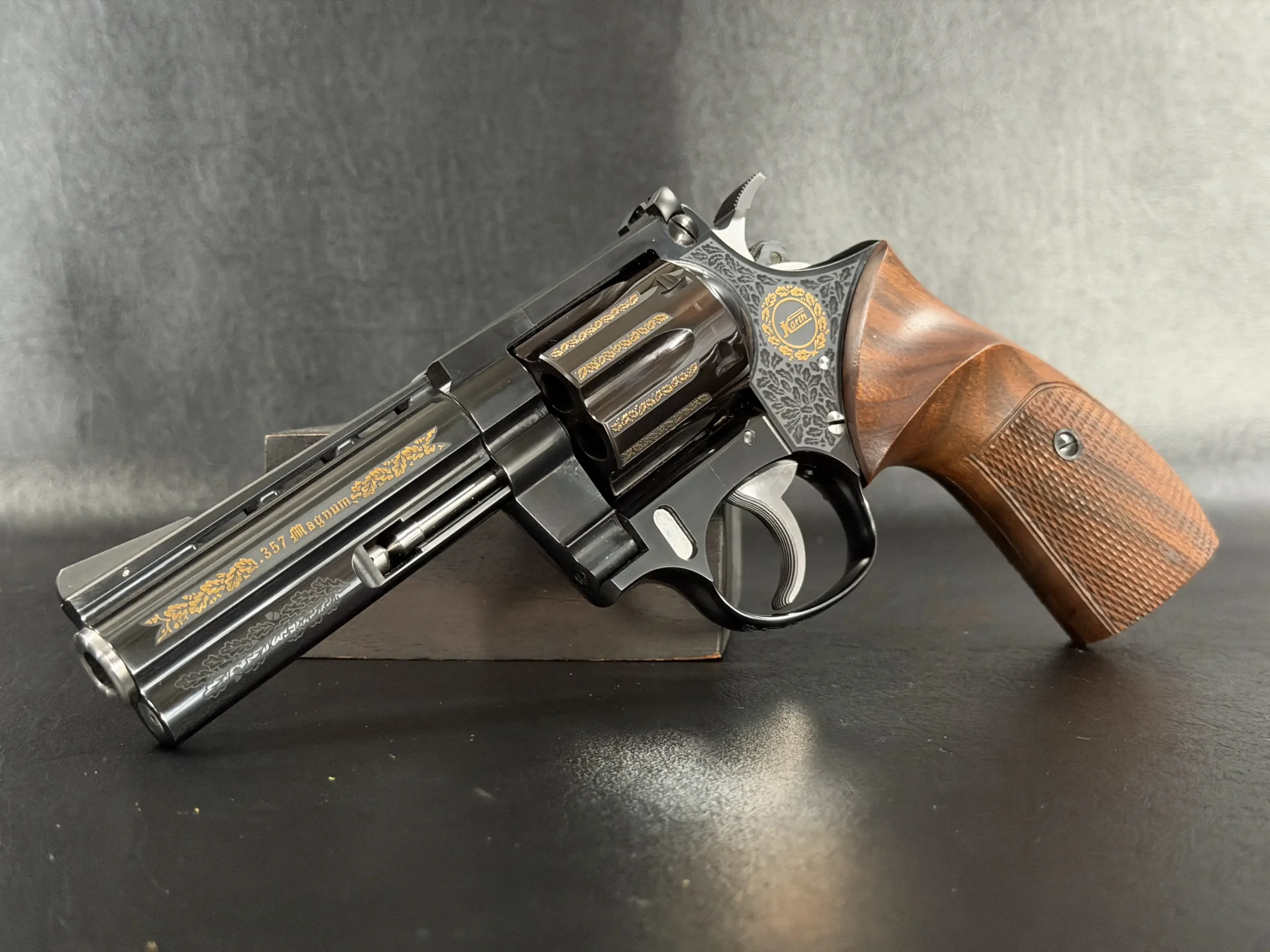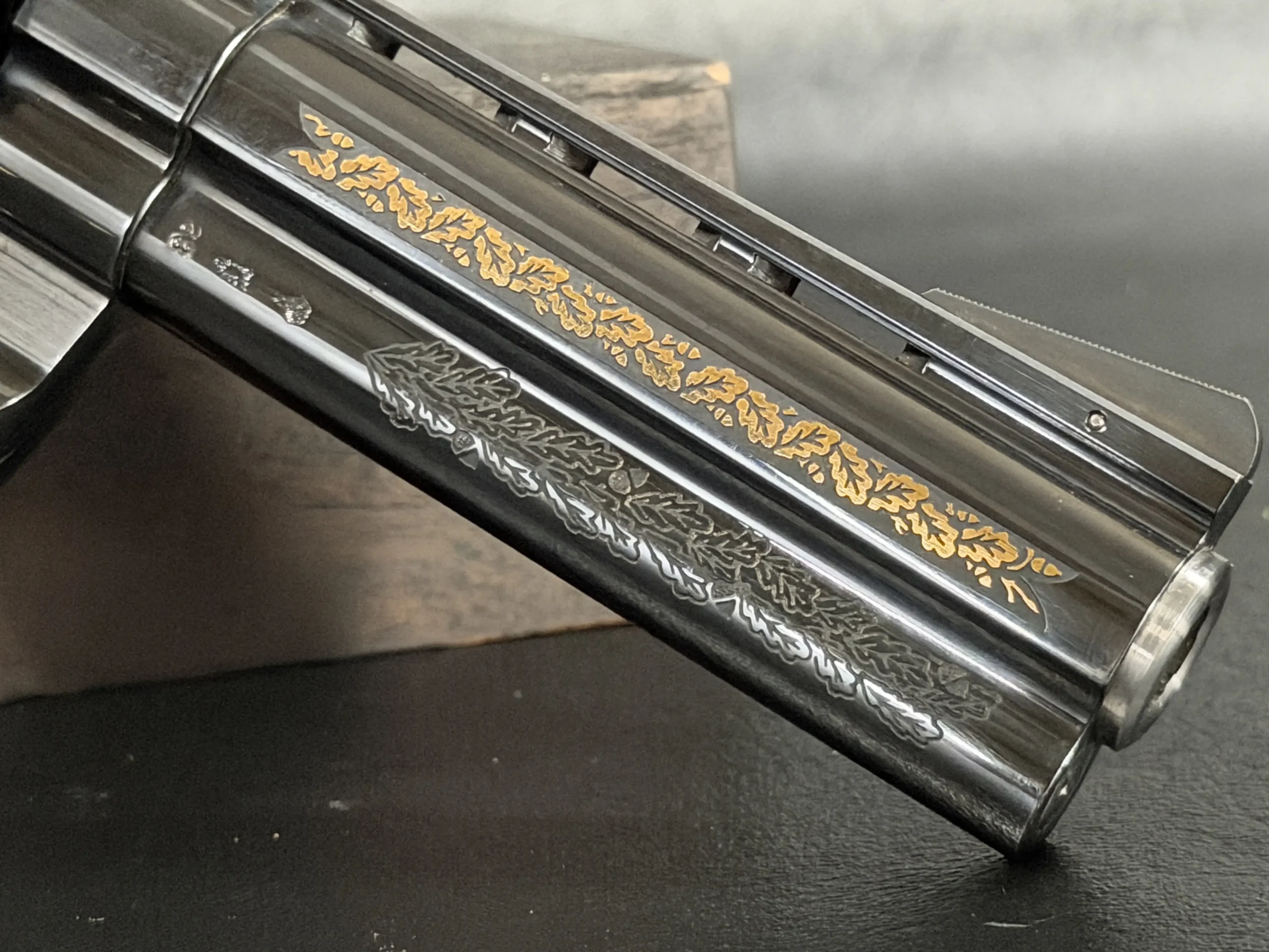 Finely checkered walnut grips complement the polished steel and gold accents, giving the revolver a warm, balanced presentation. The included 9mm exchange cylinder is finished to match the primary .357 Magnum cylinder, maintaining visual continuity across the set.