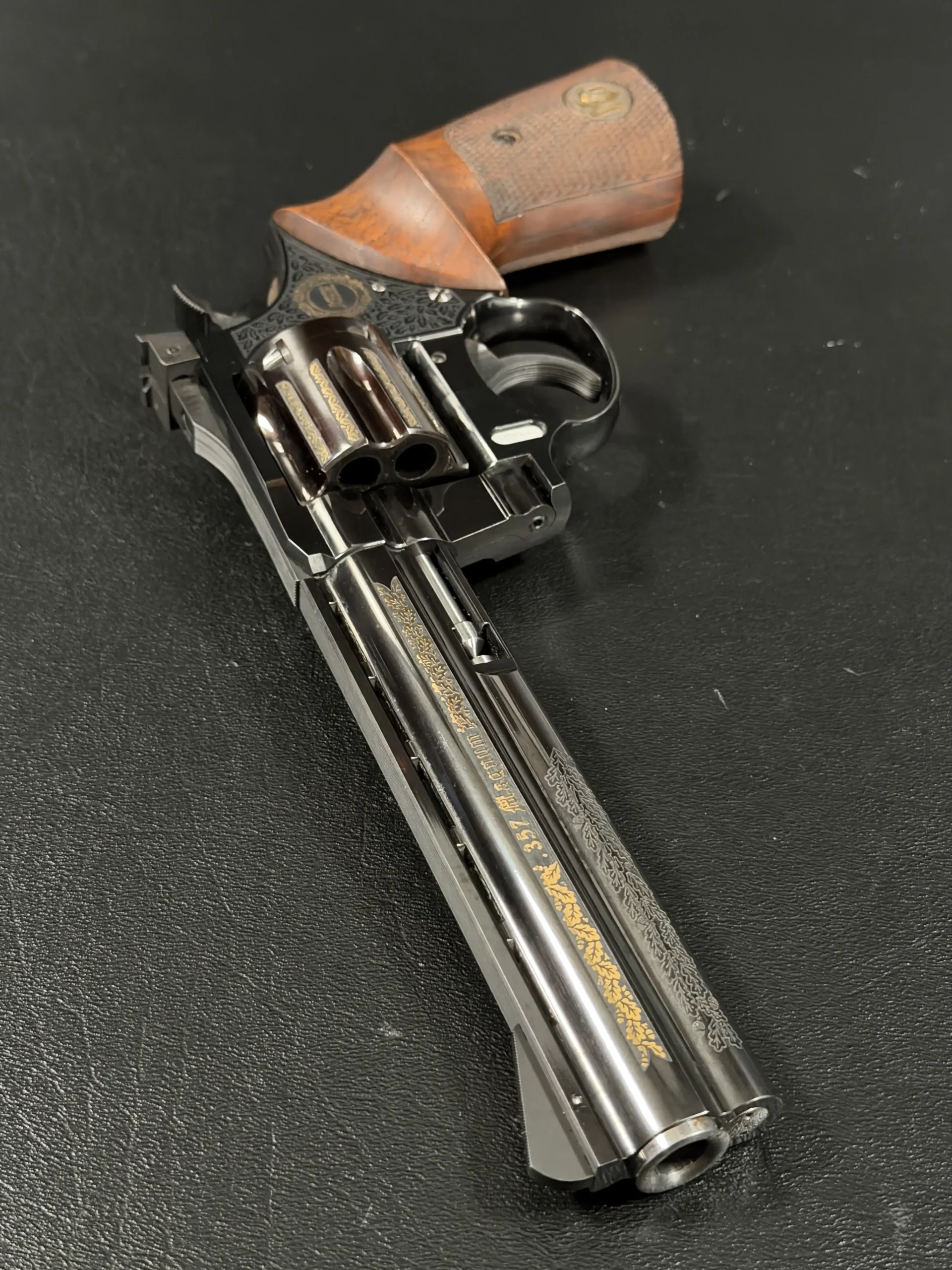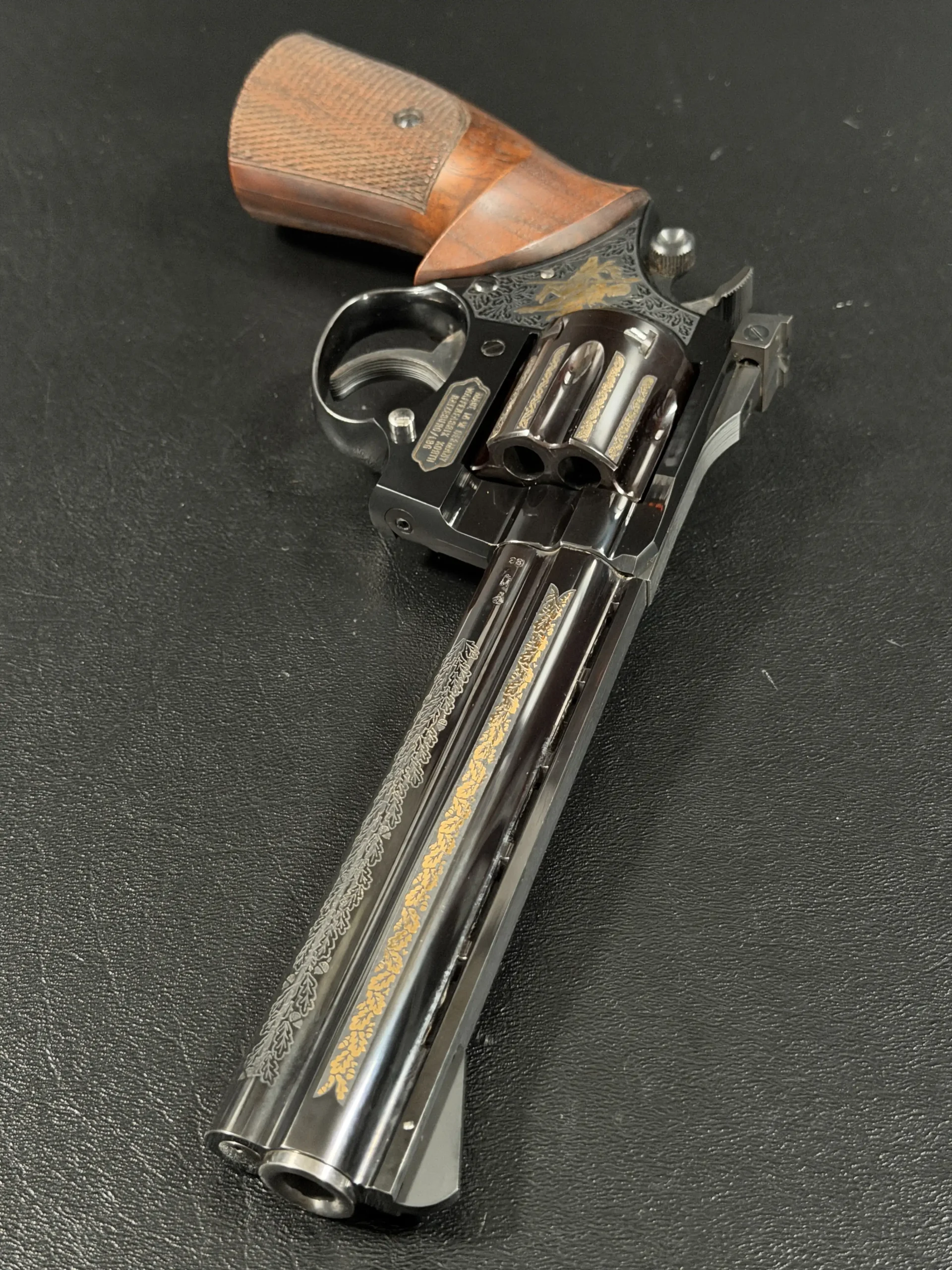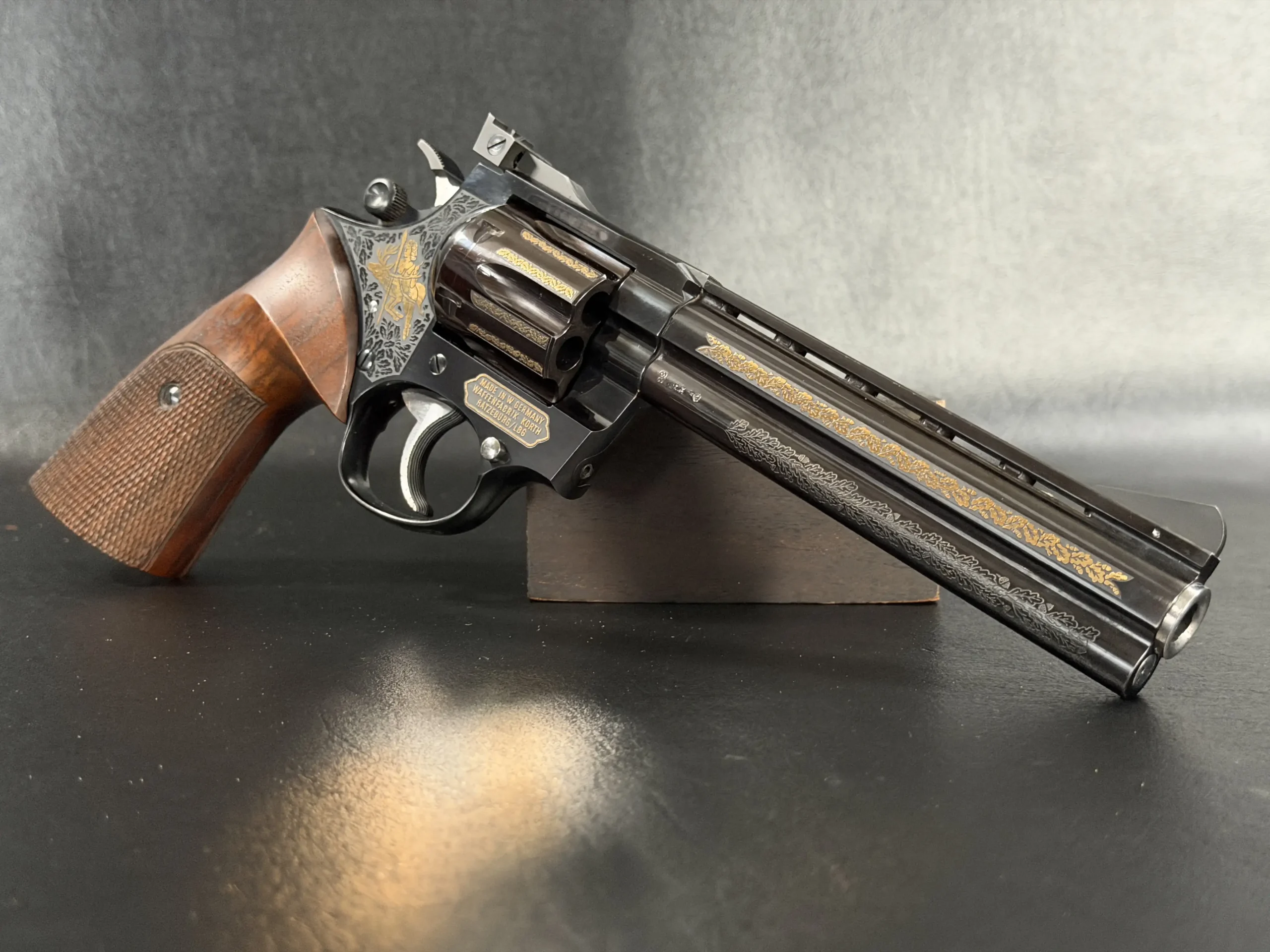 The Korth Ratzeburg Luxury is a .357 Magnum revolver with a 6-inch barrel, combining precise mechanical fit with a highly refined decorative finish. This example features a deep high-polish blue finish accented by extensive gold inlay and engraving across the barrel, cylinder, and frame.
