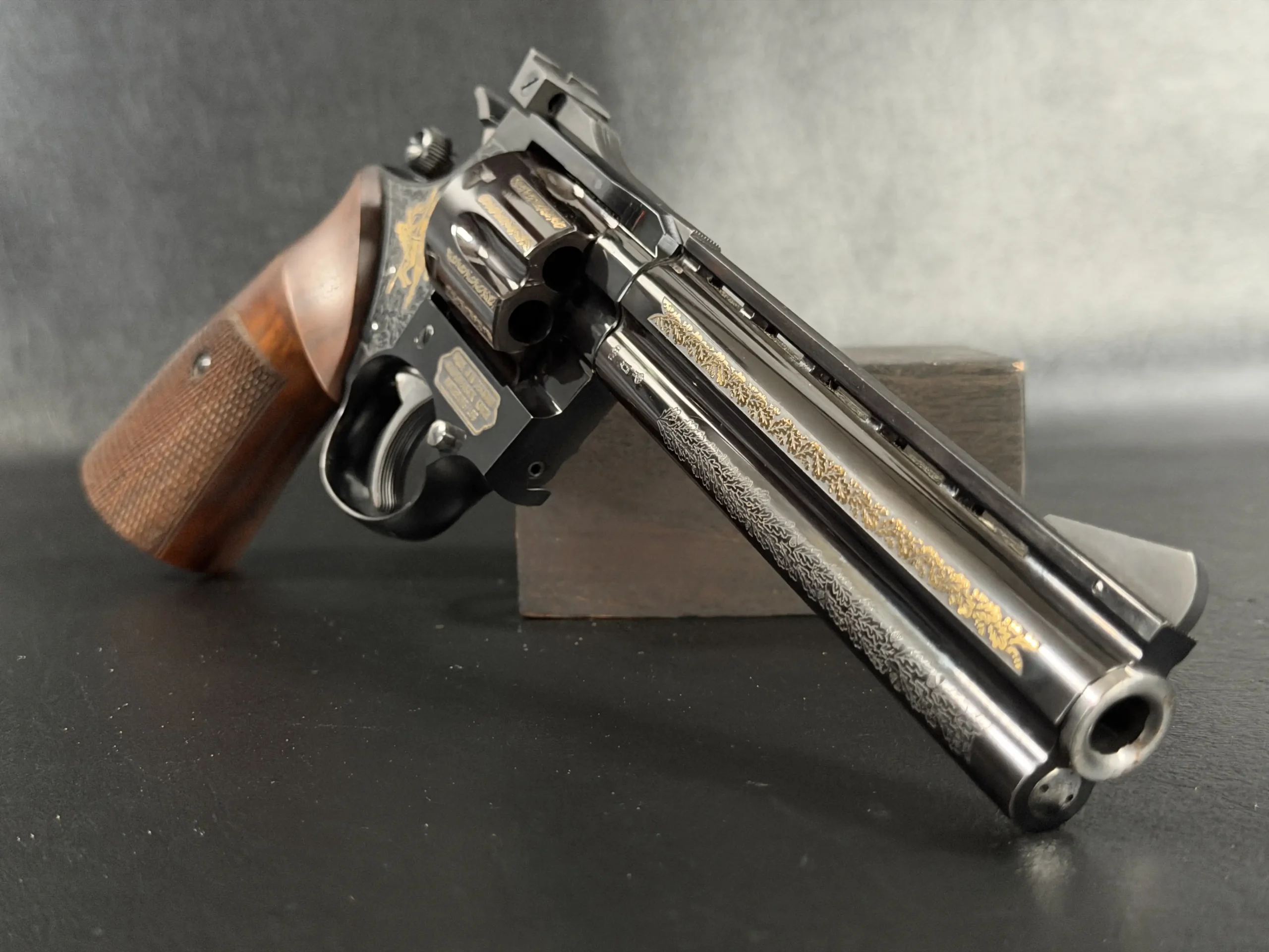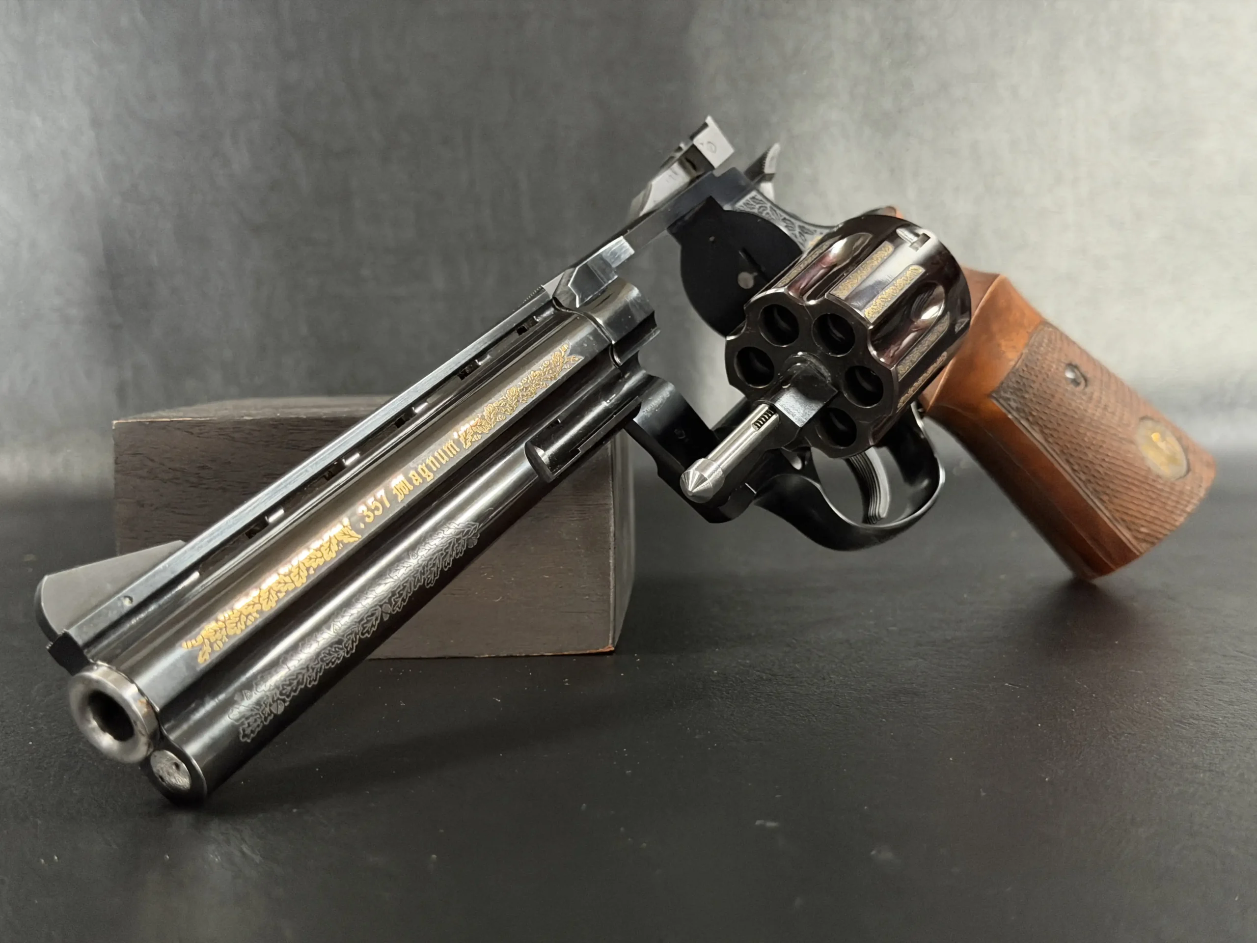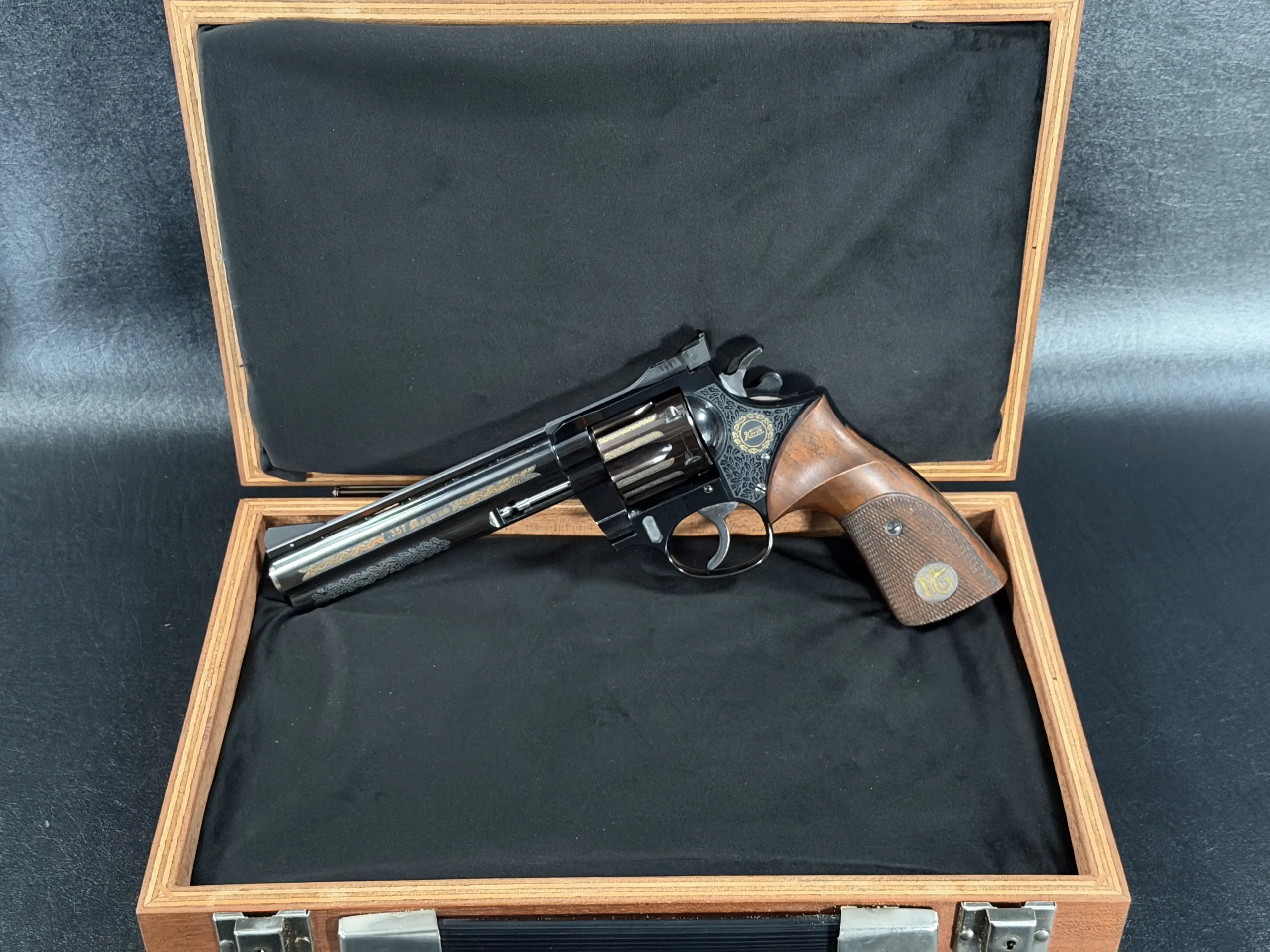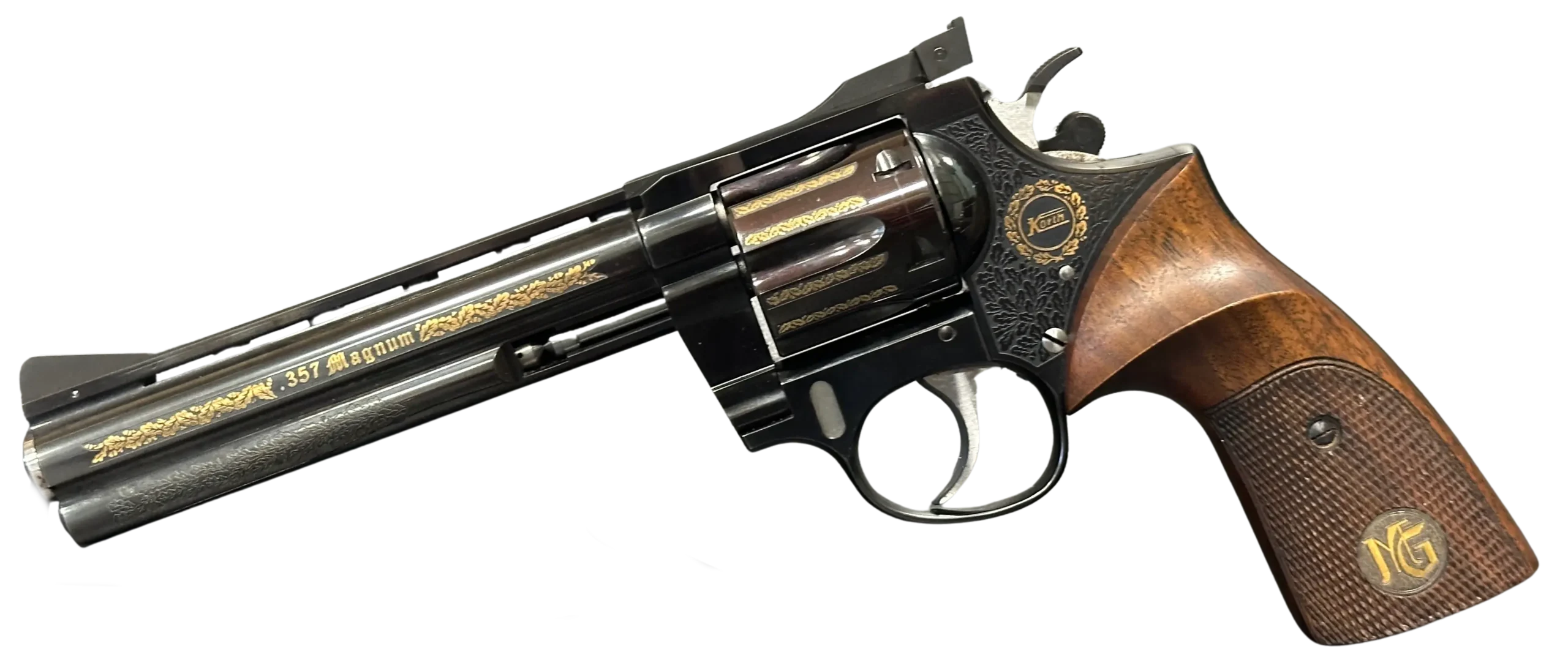 The Korth Ratzeburg Luxury is a .357 Magnum revolver with a 6-inch barrel, combining precise mechanical fit with a highly refined decorative finish. This example features a deep high-polish blue finish accented by extensive gold inlay and engraving across the barrel, cylinder, and frame.