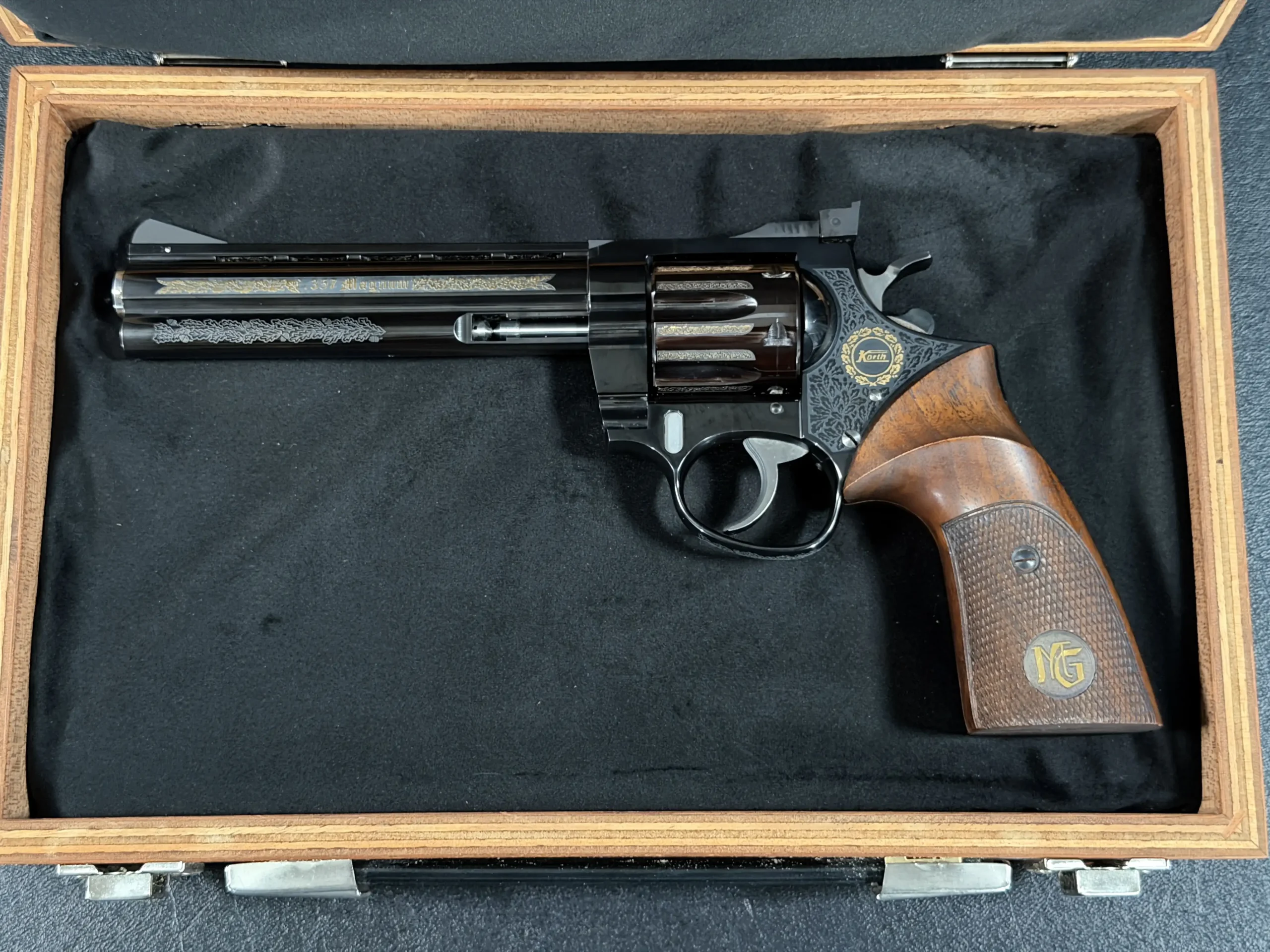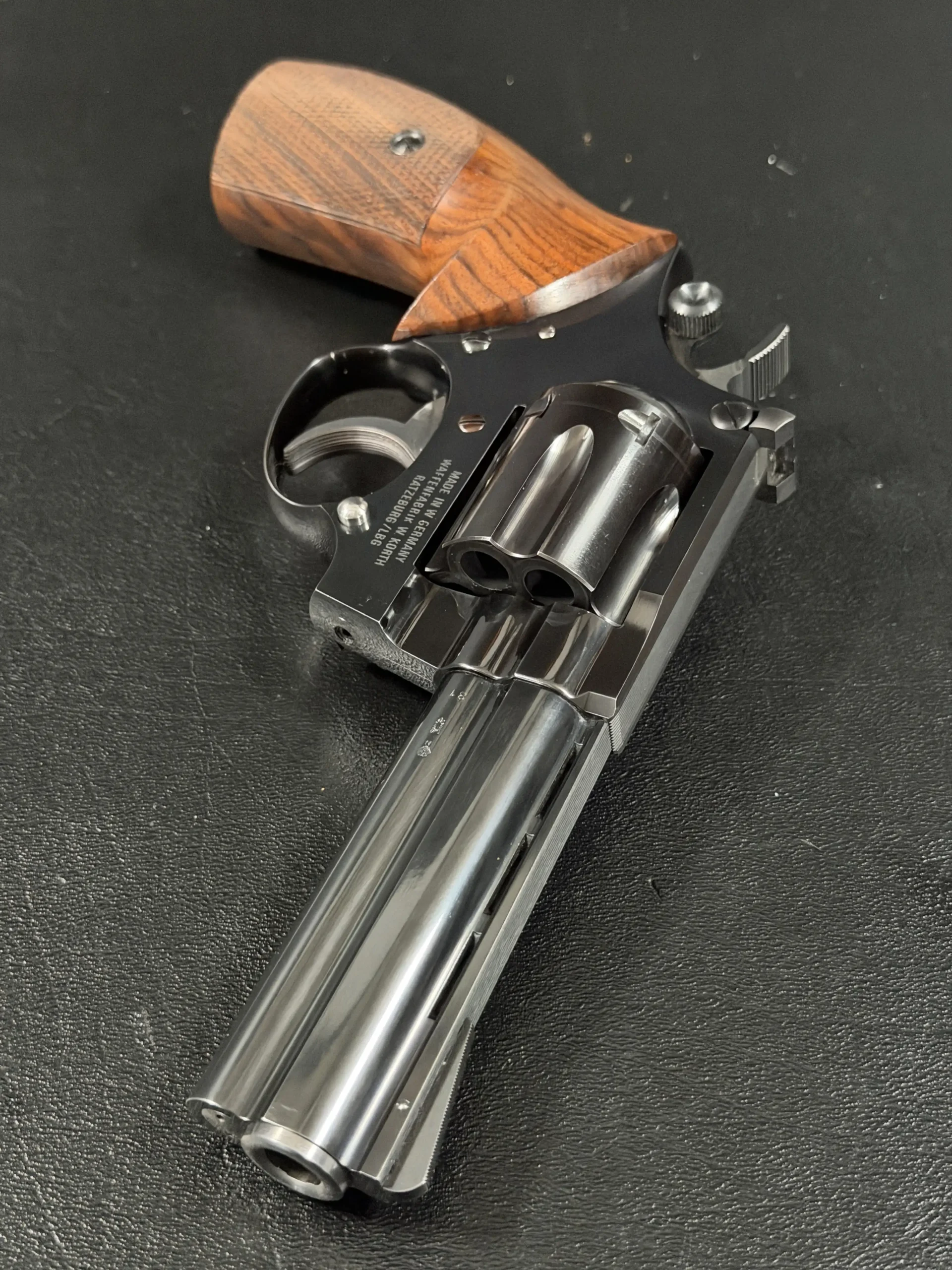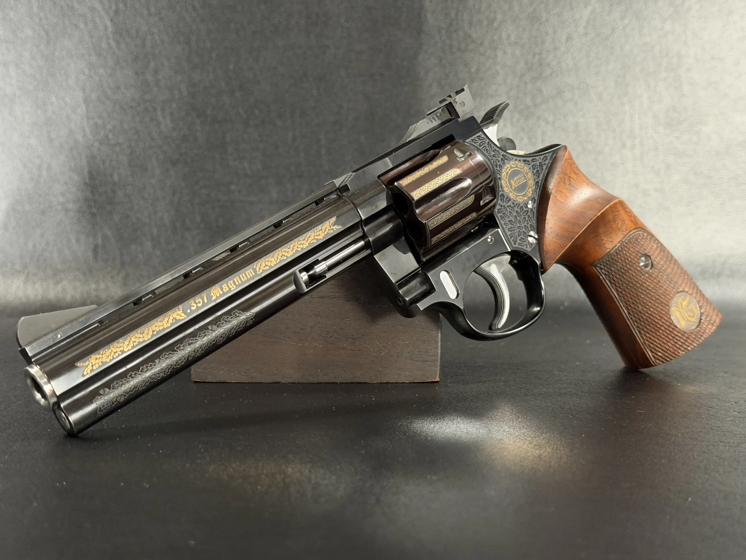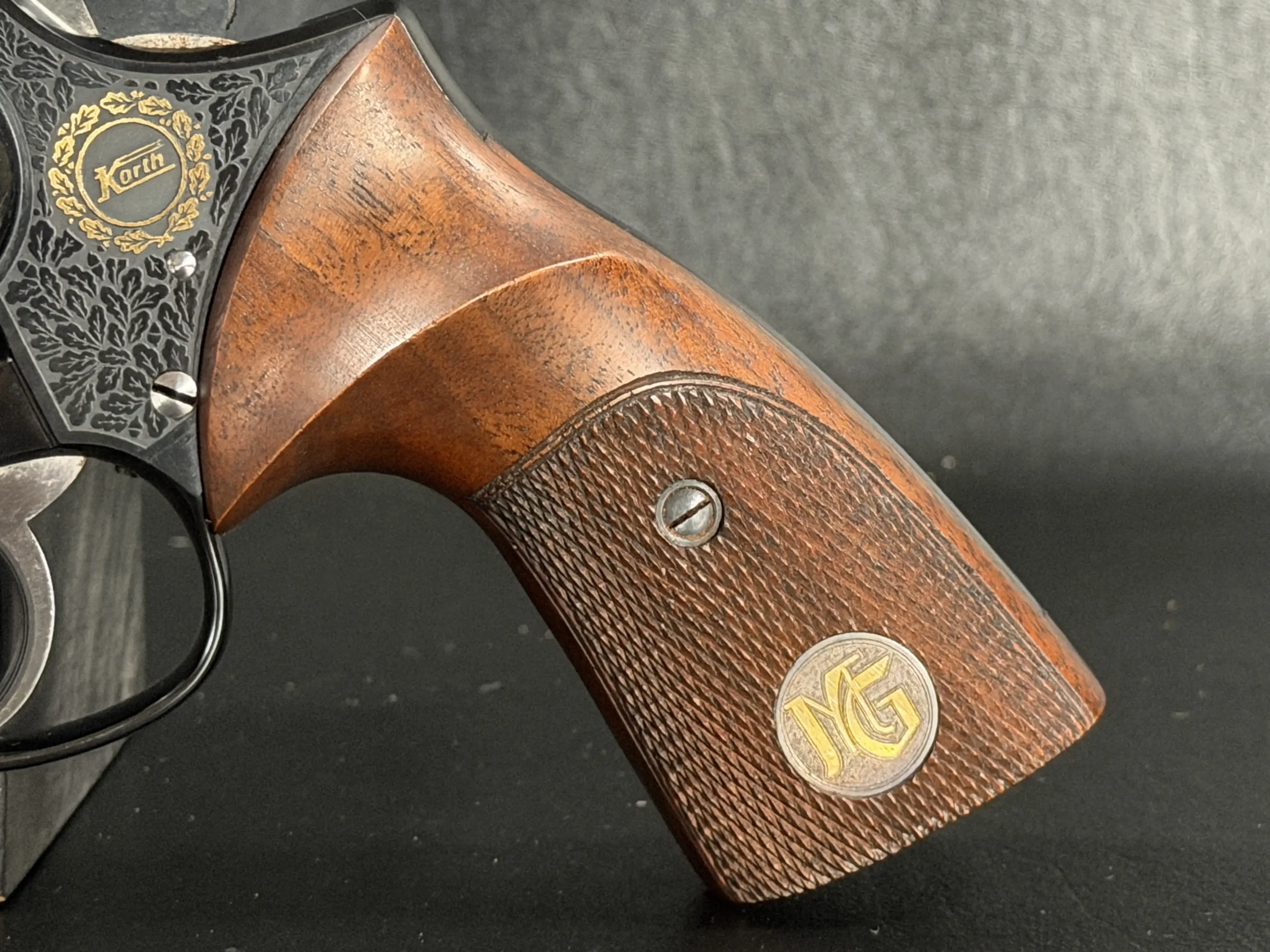 The cylinder, barrel, and frame are correctly matched, reflecting the careful hand-fitting associated with Korth’s Ratzeburg production. It is fitted with checkered wooden target grips, contoured for comfort and inset with a gold Korth monogram medallion.