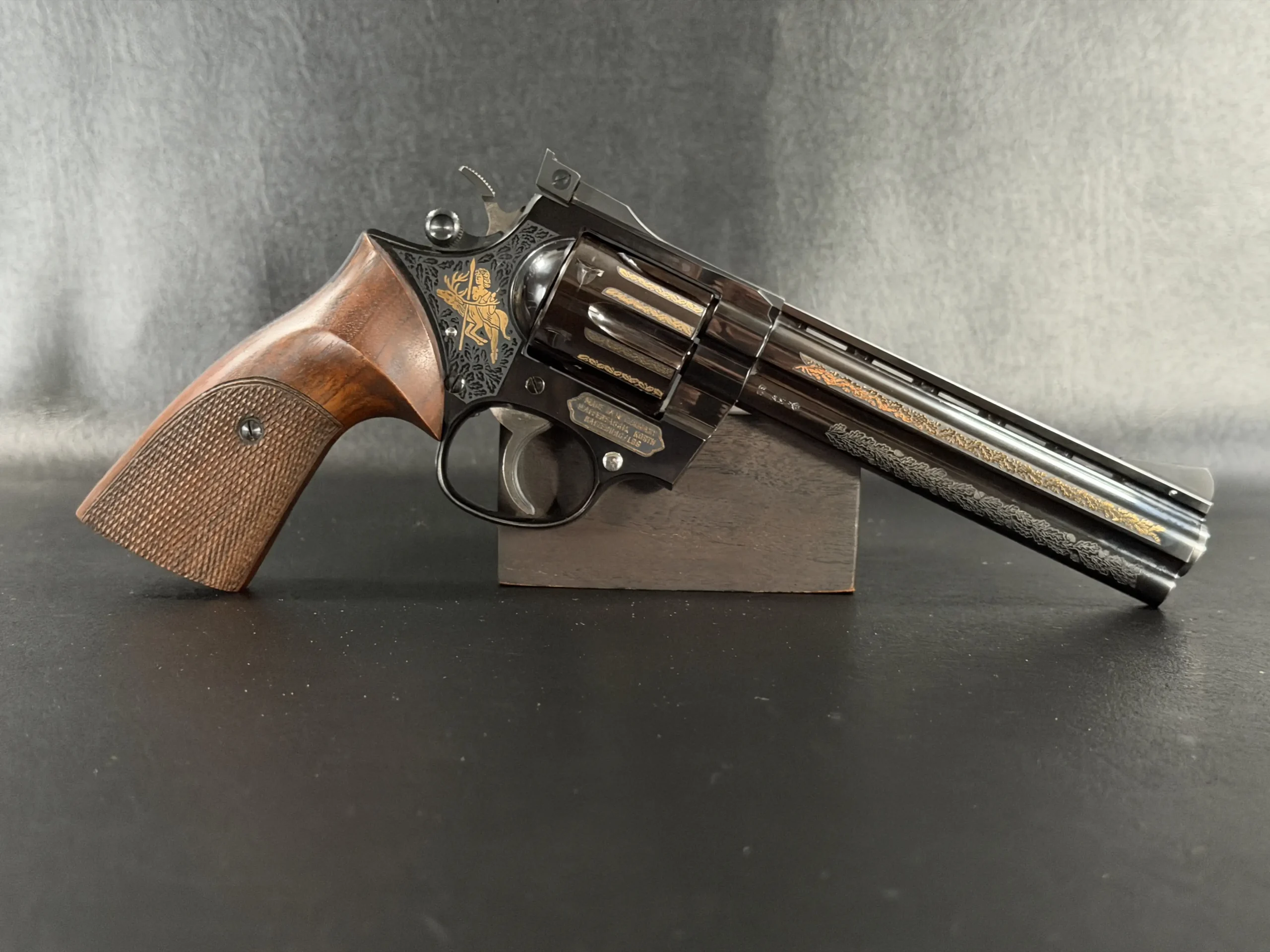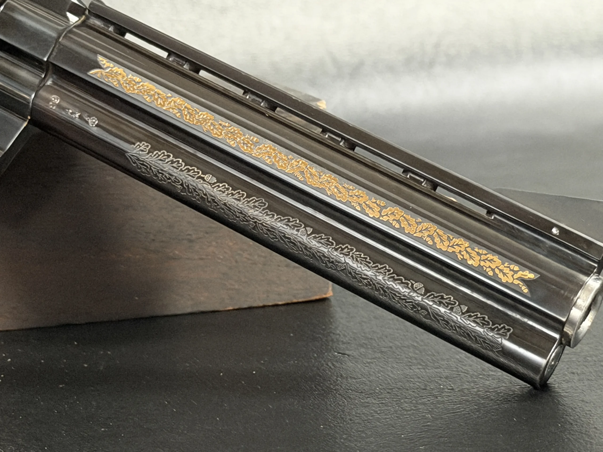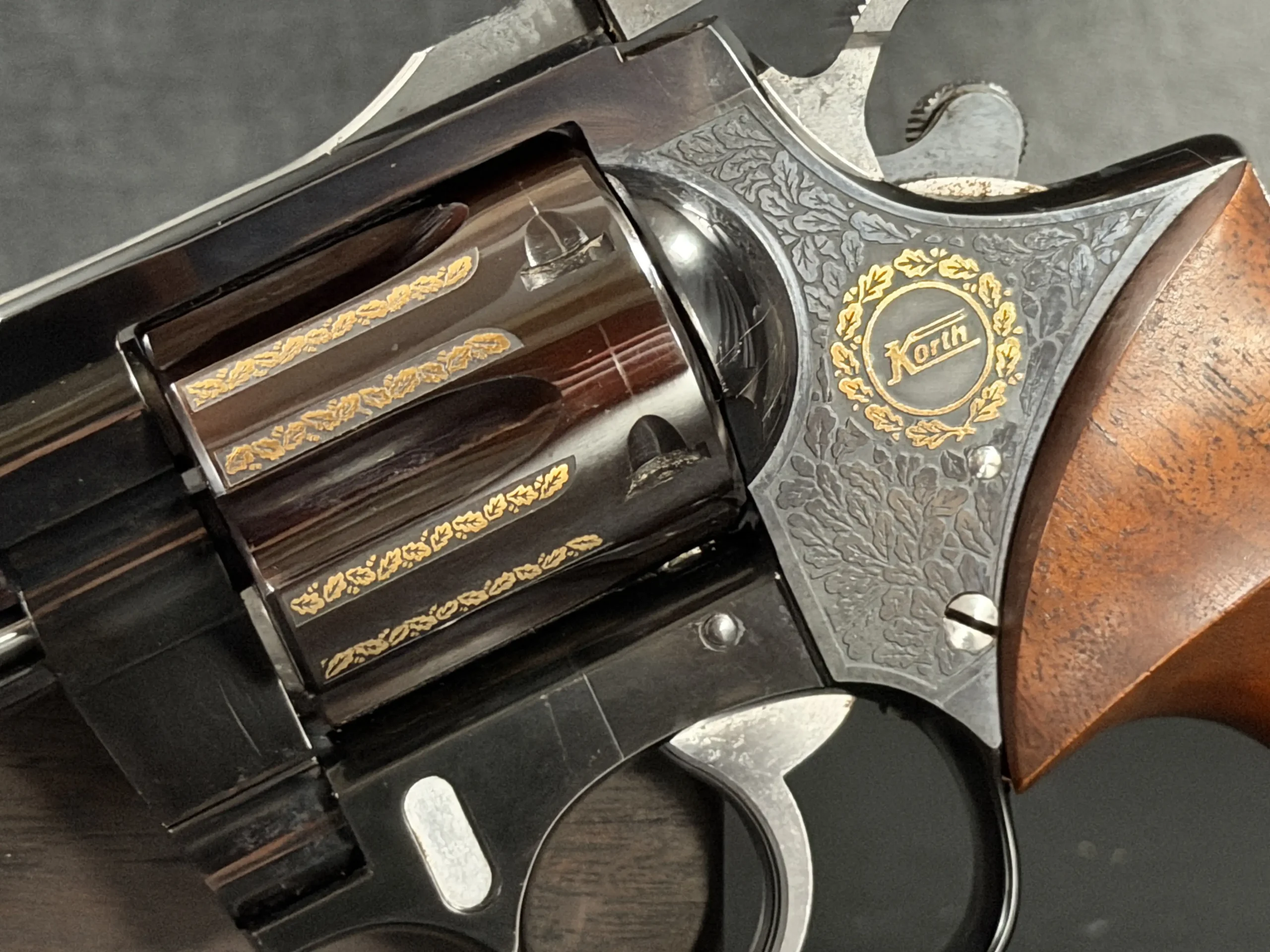 Oak-leaf engraving motifs and gilded details are applied with a measured, deliberate look that complements the revolver’s overall profile. The frame includes finely executed engraving panels with the Korth medallion, while the opposite side displays a gold-engraved hunting motif that adds a distinctly European visual character.