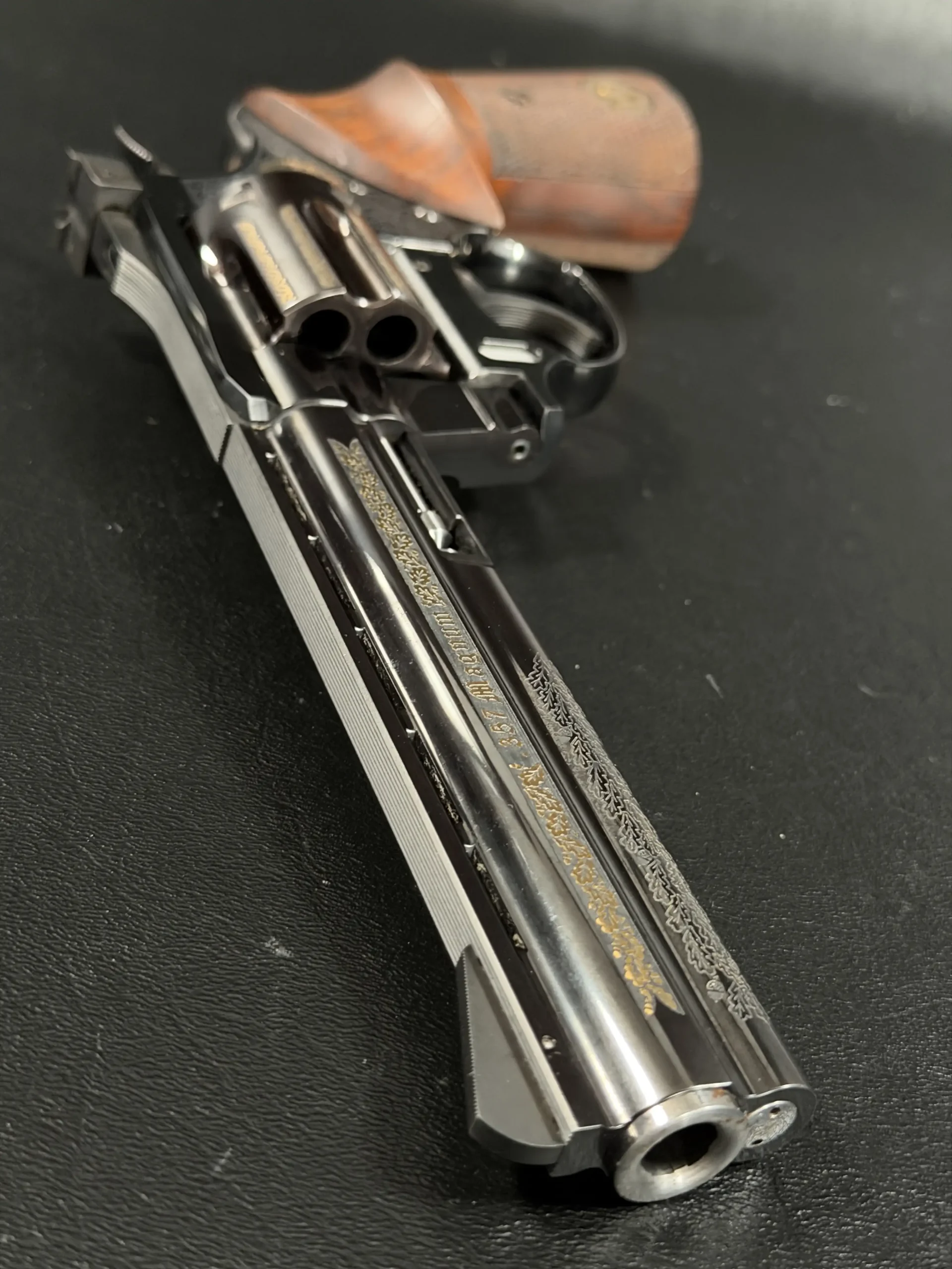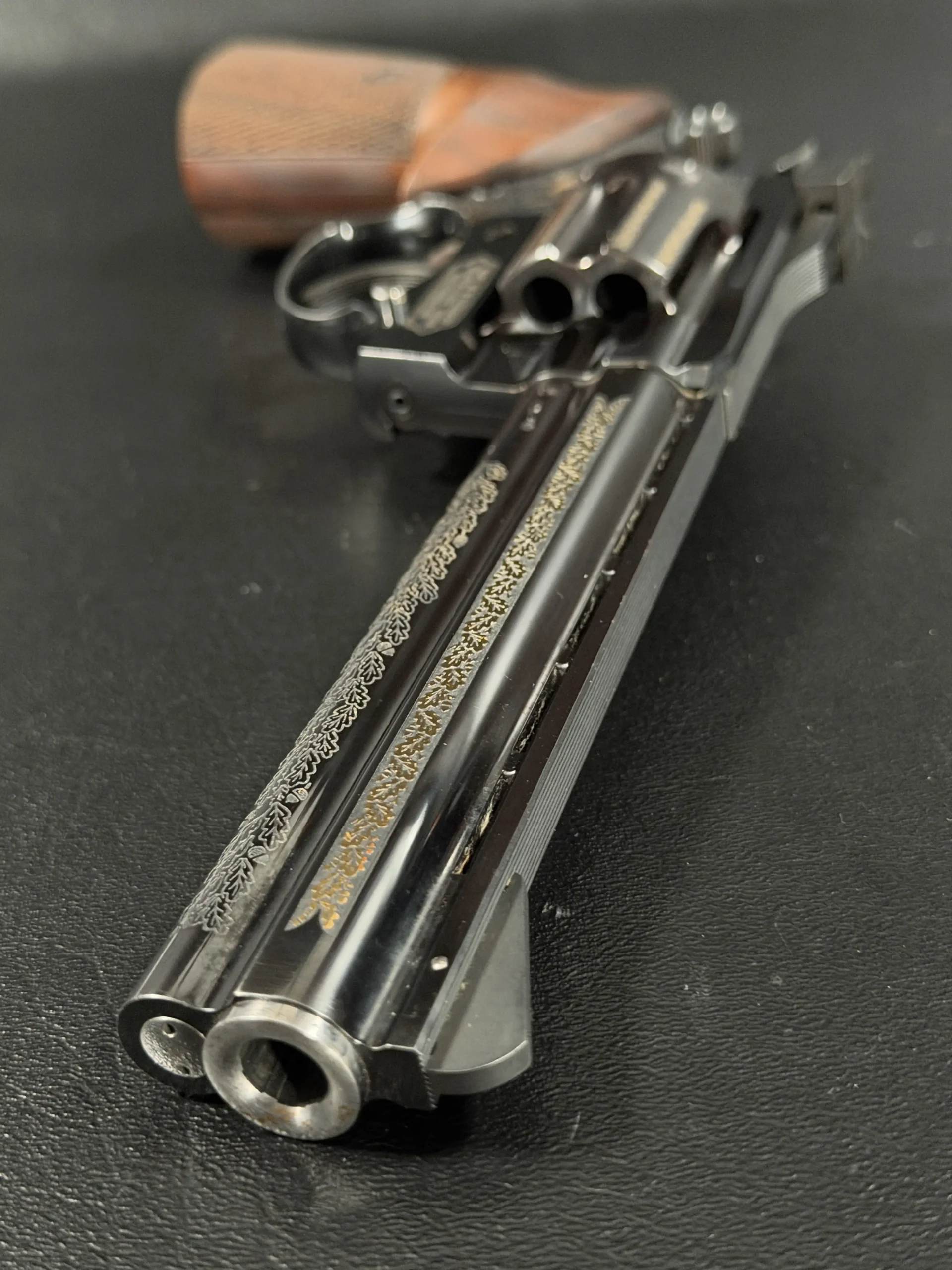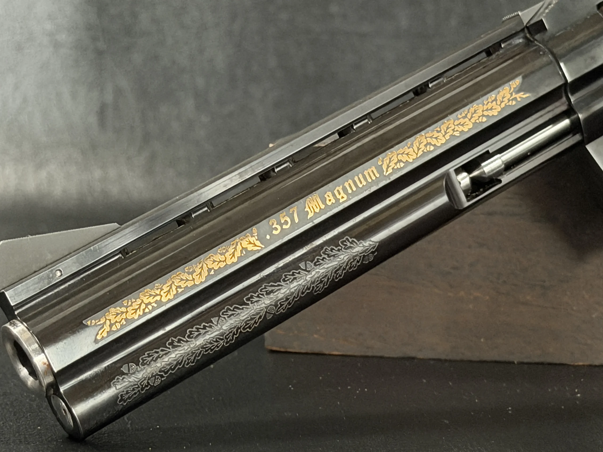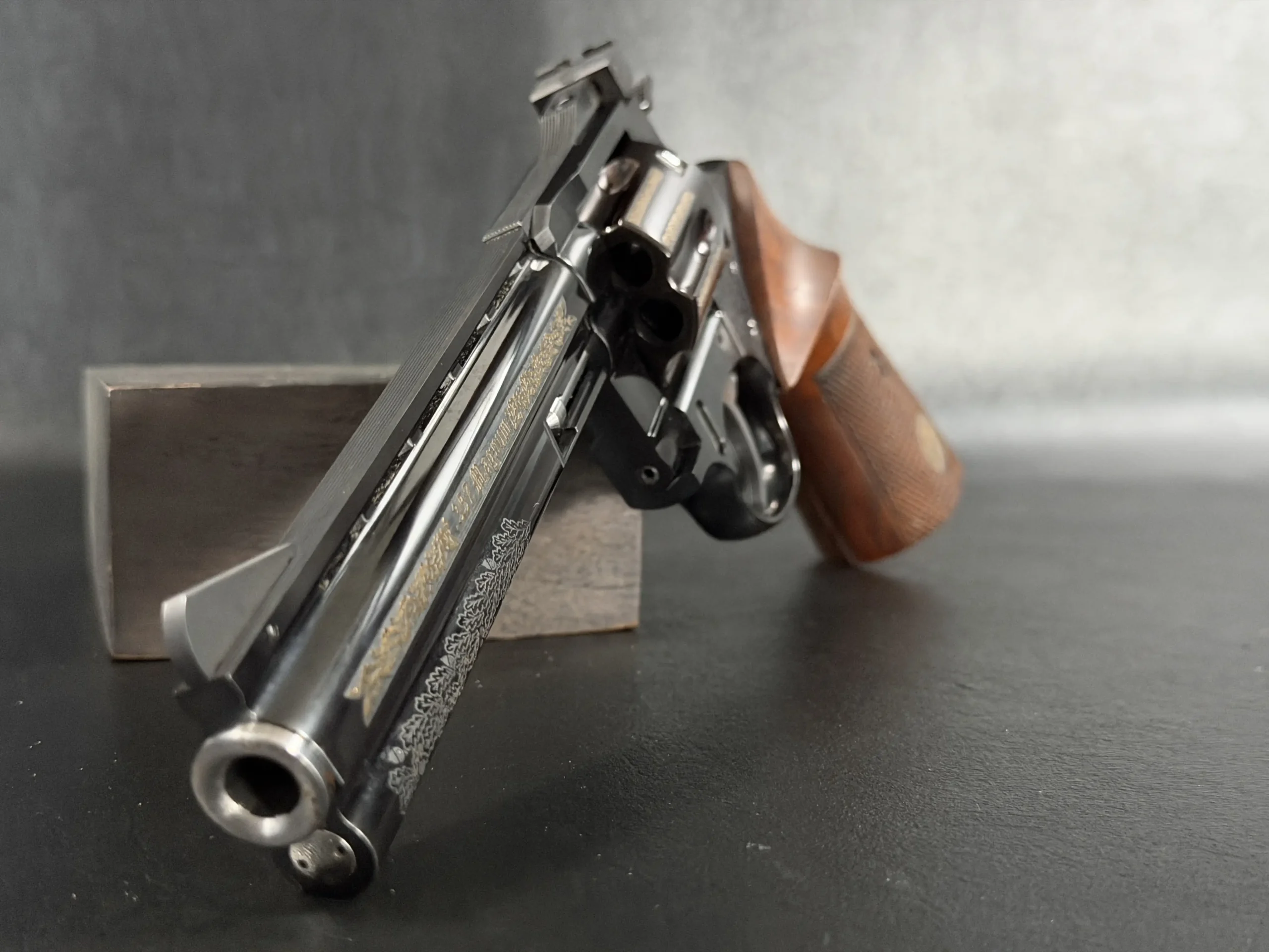Oak-leaf engraving motifs and gilded details are applied with a measured, deliberate look that complements the revolver’s overall profile. The frame includes finely executed engraving panels with the Korth medallion, while the opposite side displays a gold-engraved hunting motif that adds a distinctly European visual character.
