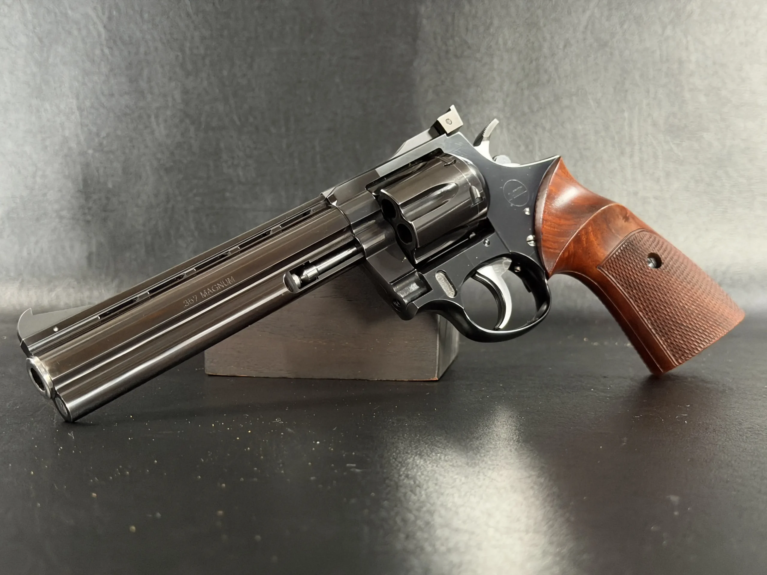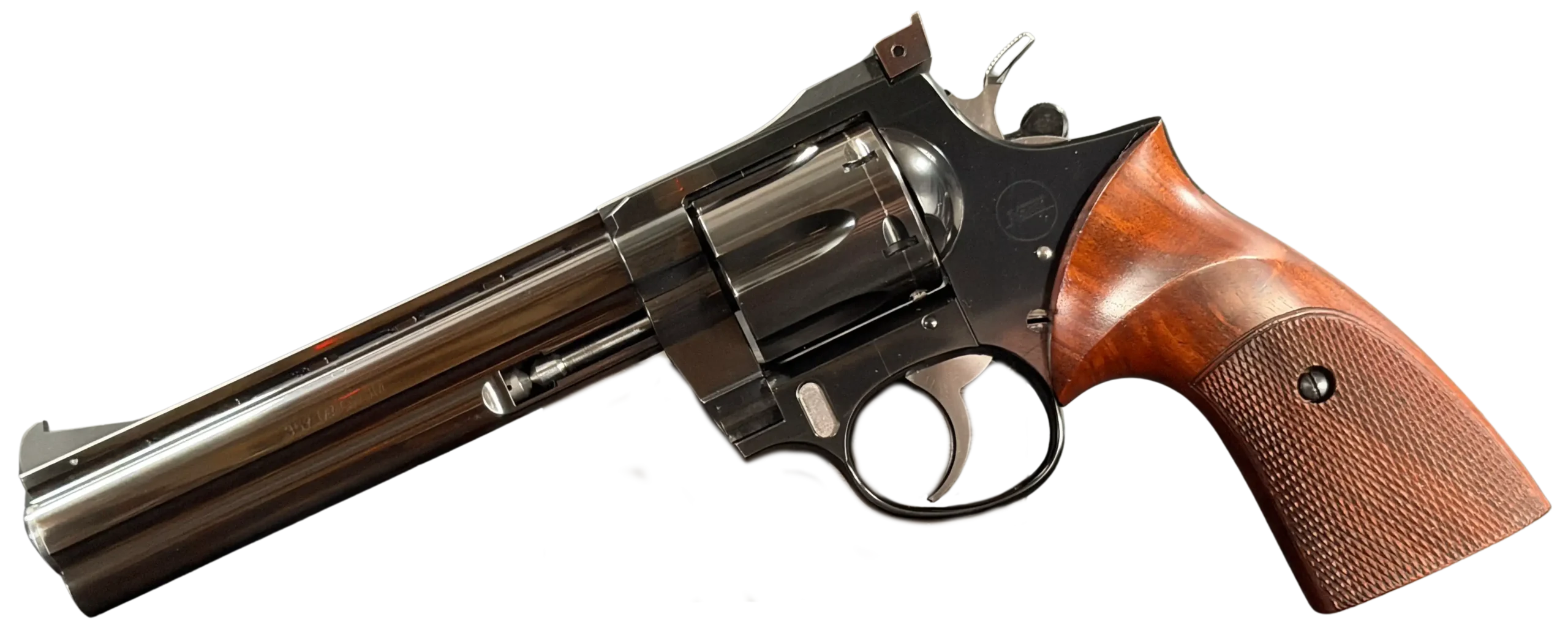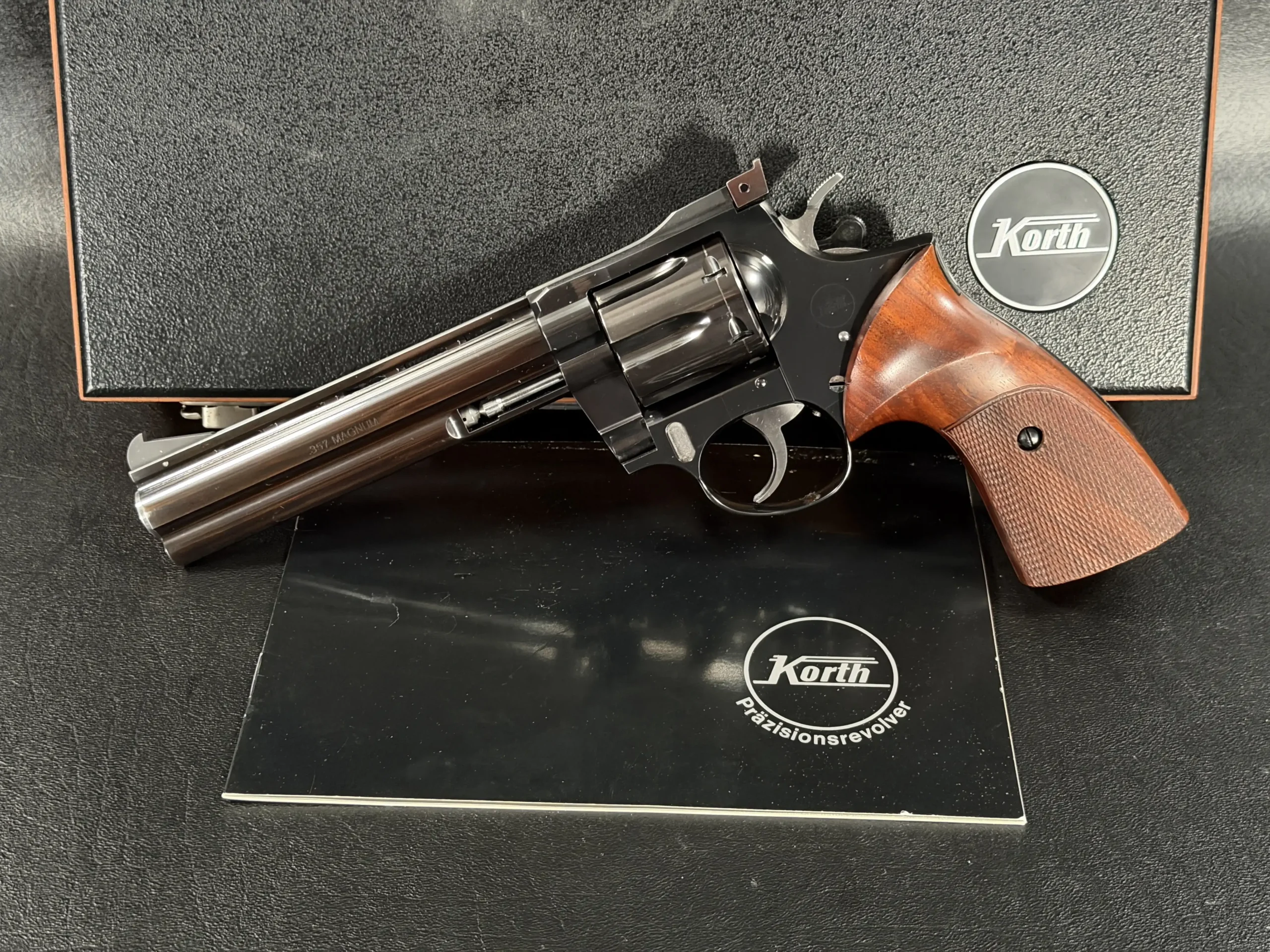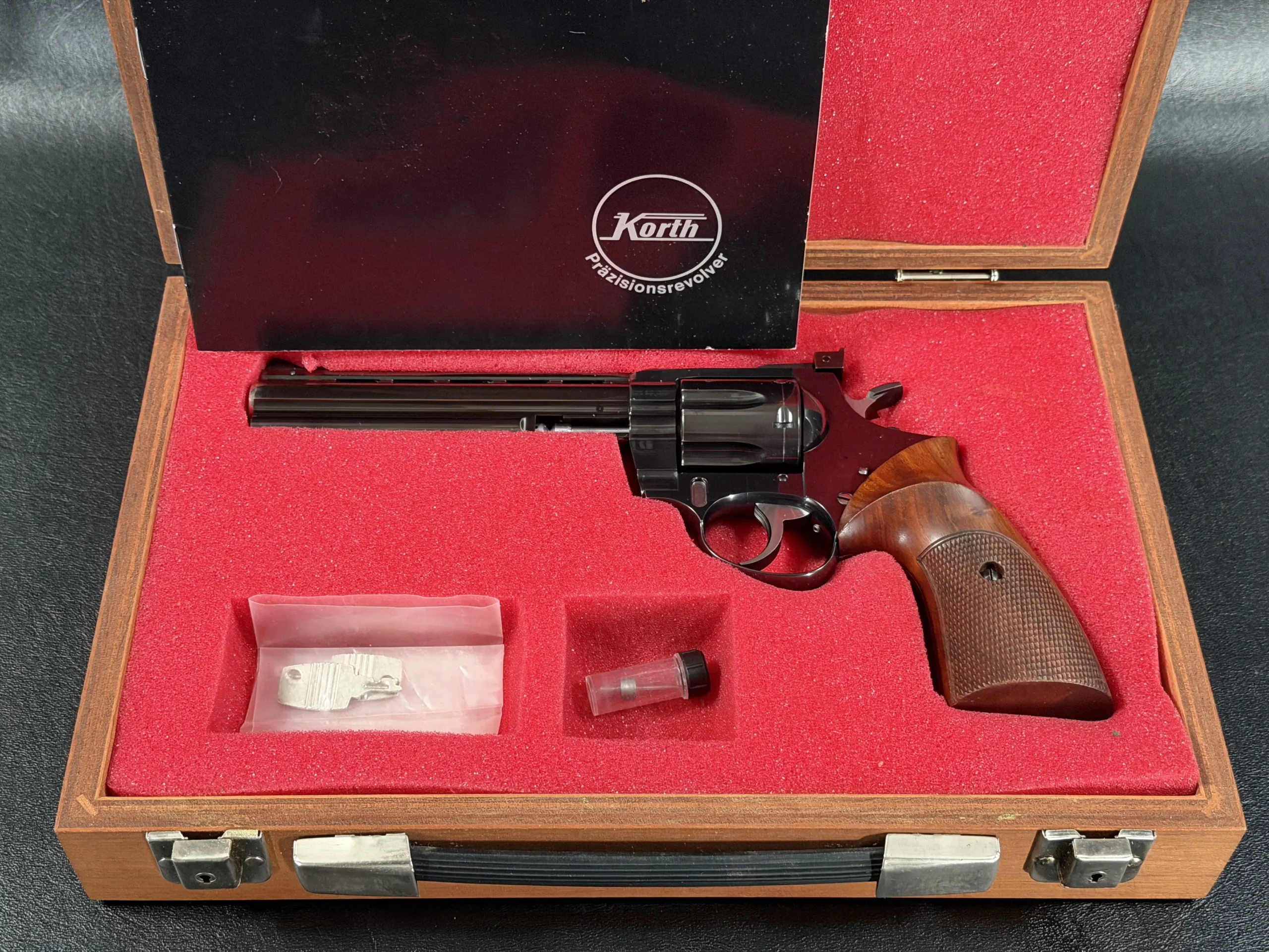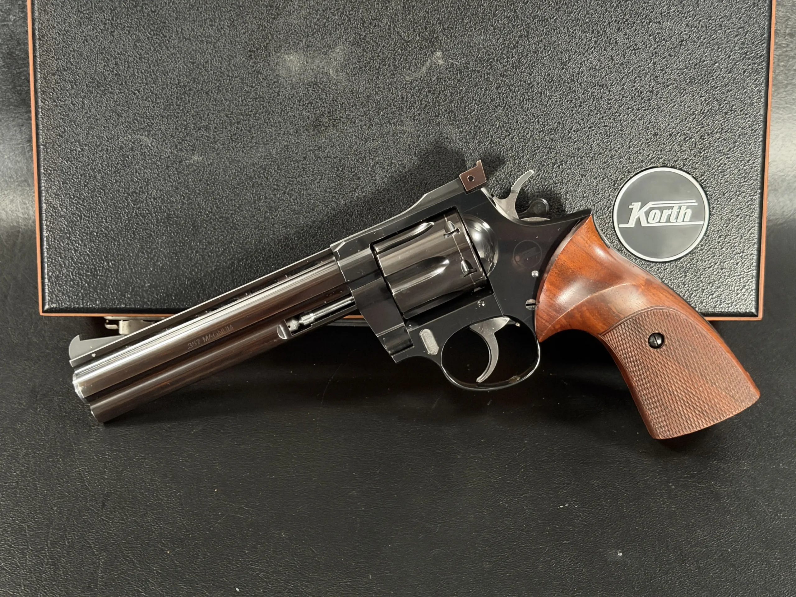 The Korth Ratzeburg Sport is a 6-inch revolver chambered in .357 Magnum, combining refined workmanship with a target-oriented configuration. This example features a 6-inch barrel with a ventilated rib, giving it an extended sight radius and balanced handling for range use or display.